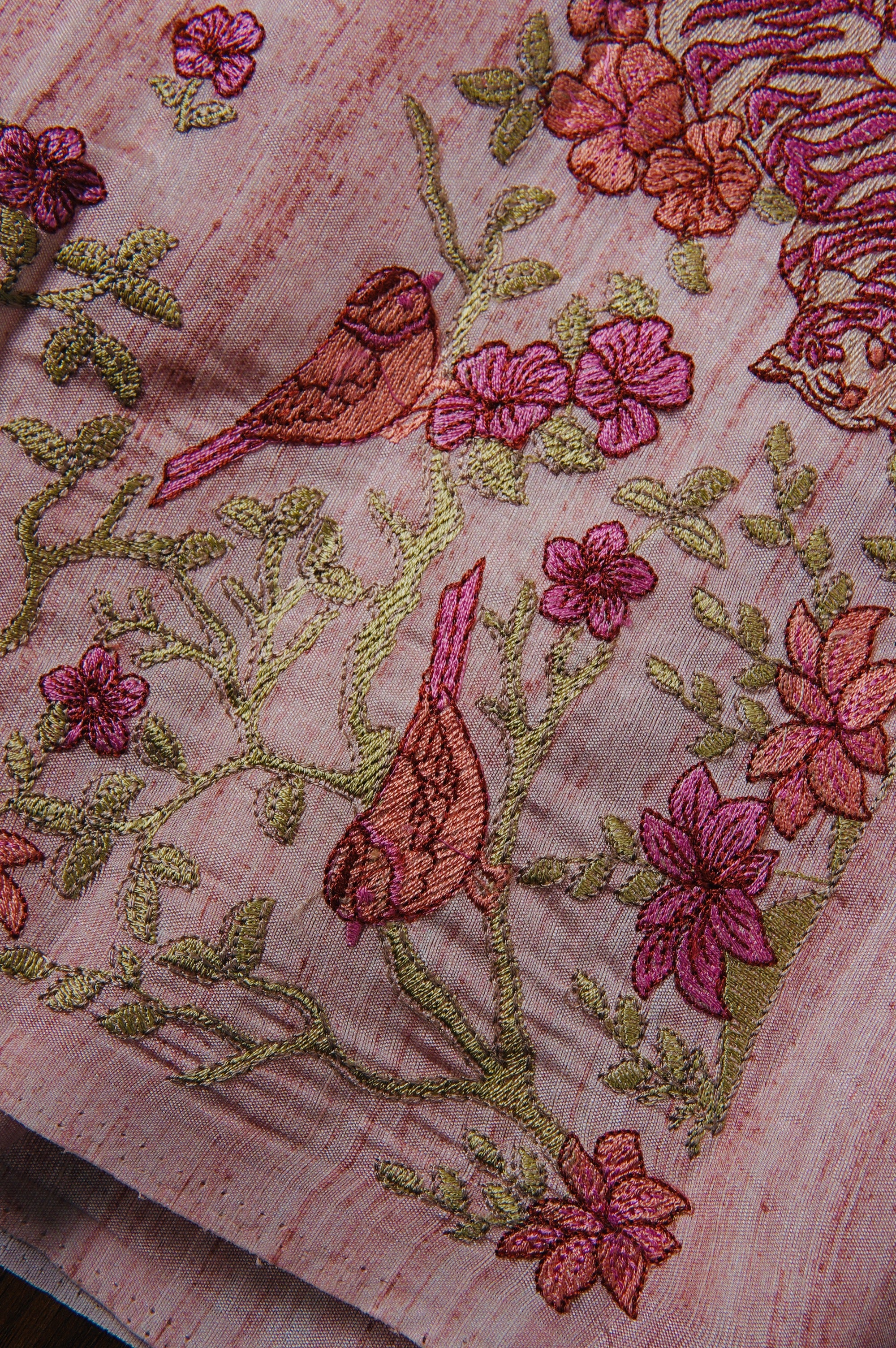 Cream pink semi tussar saree with small flower motifs with leaves woven in pink and green and bird motifs woven in pink throughout the body, extending as the pallu. The border has green trees with pink florals, birds and tiger motifs, extending towards the border of the pallu. The saree has a plain cream pink blouse.