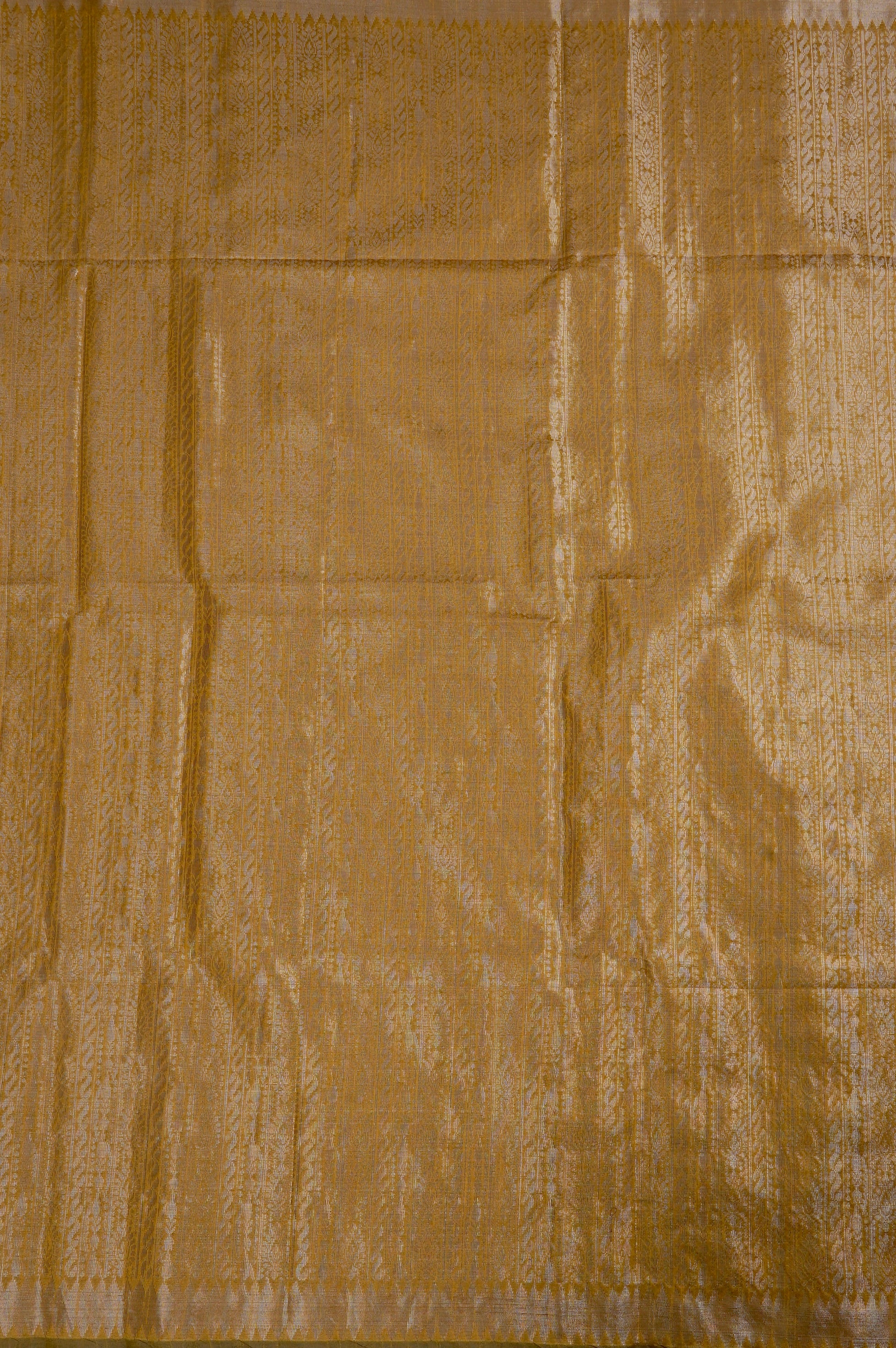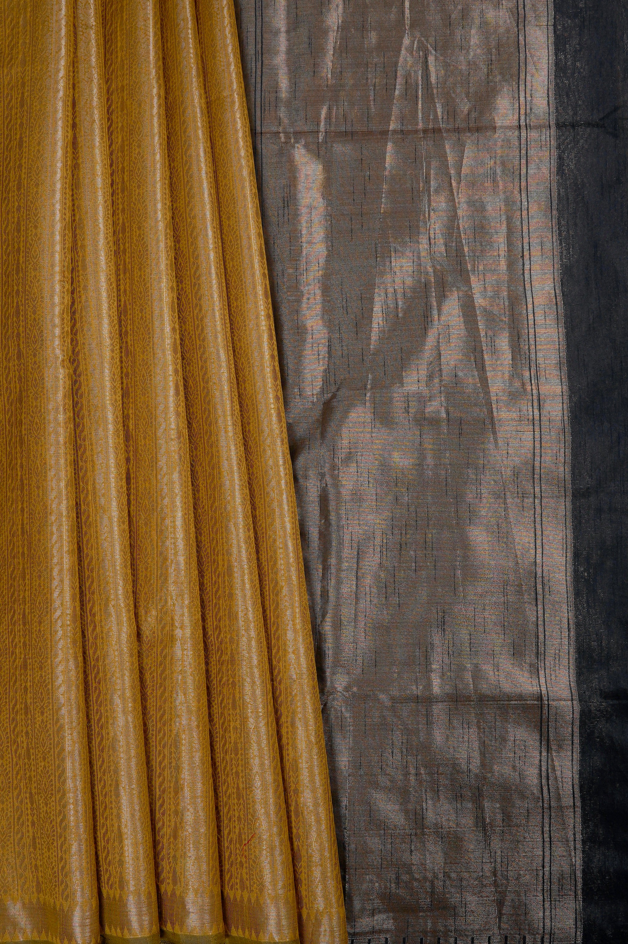 A regal gold body, woven intricately with linear bands of motifs with florals, waves, dots and curves in gold zari. Having a very subtle gold band as its border, it transitions into a silver pallu, with black temple rek patterns as its borer.