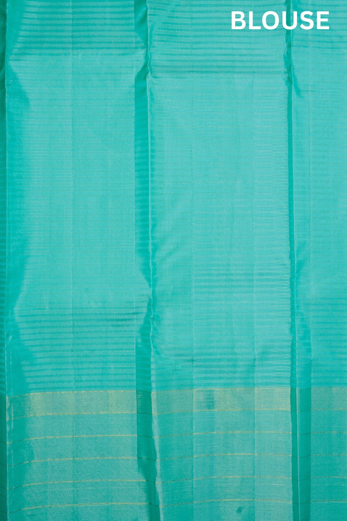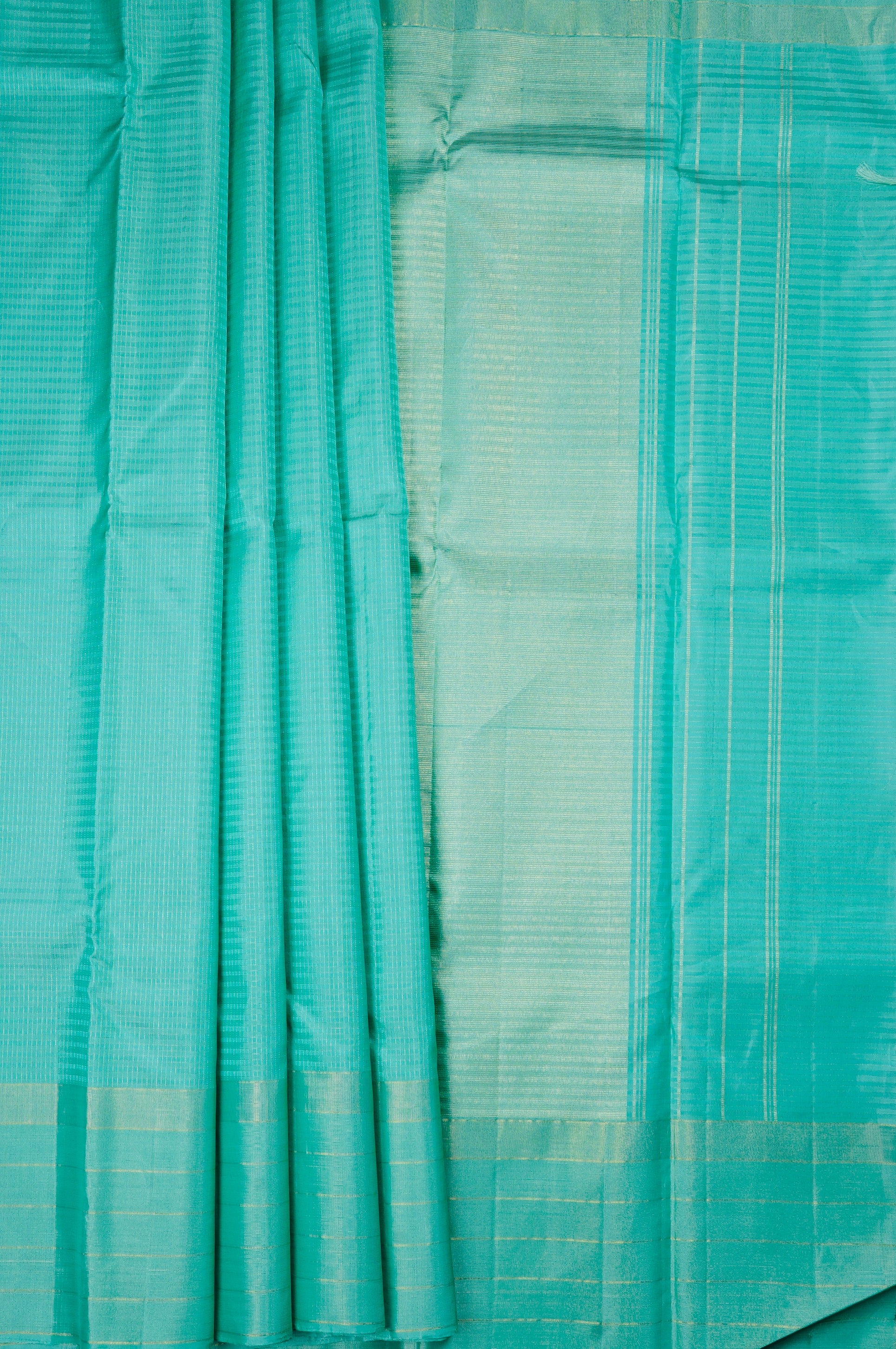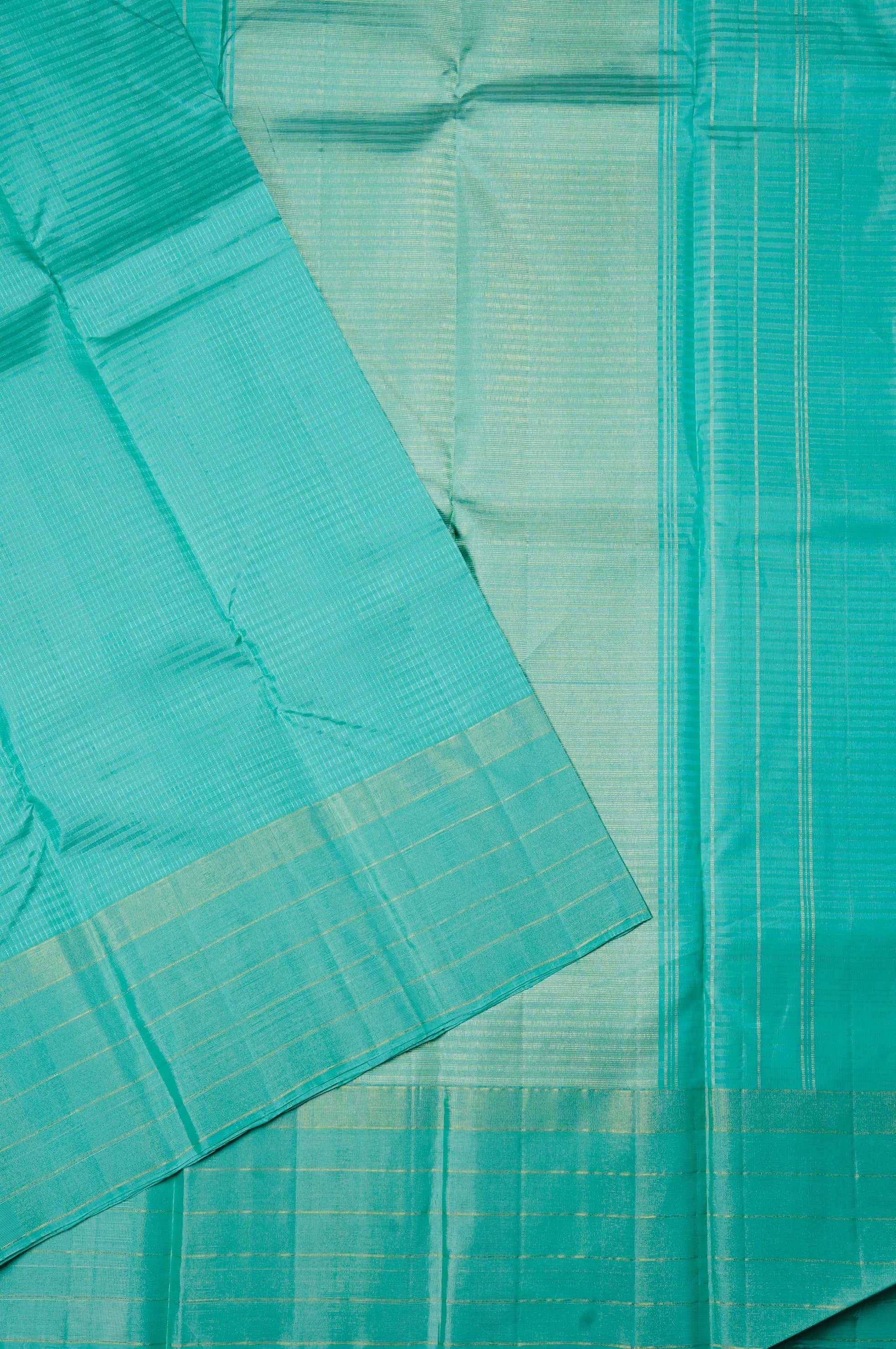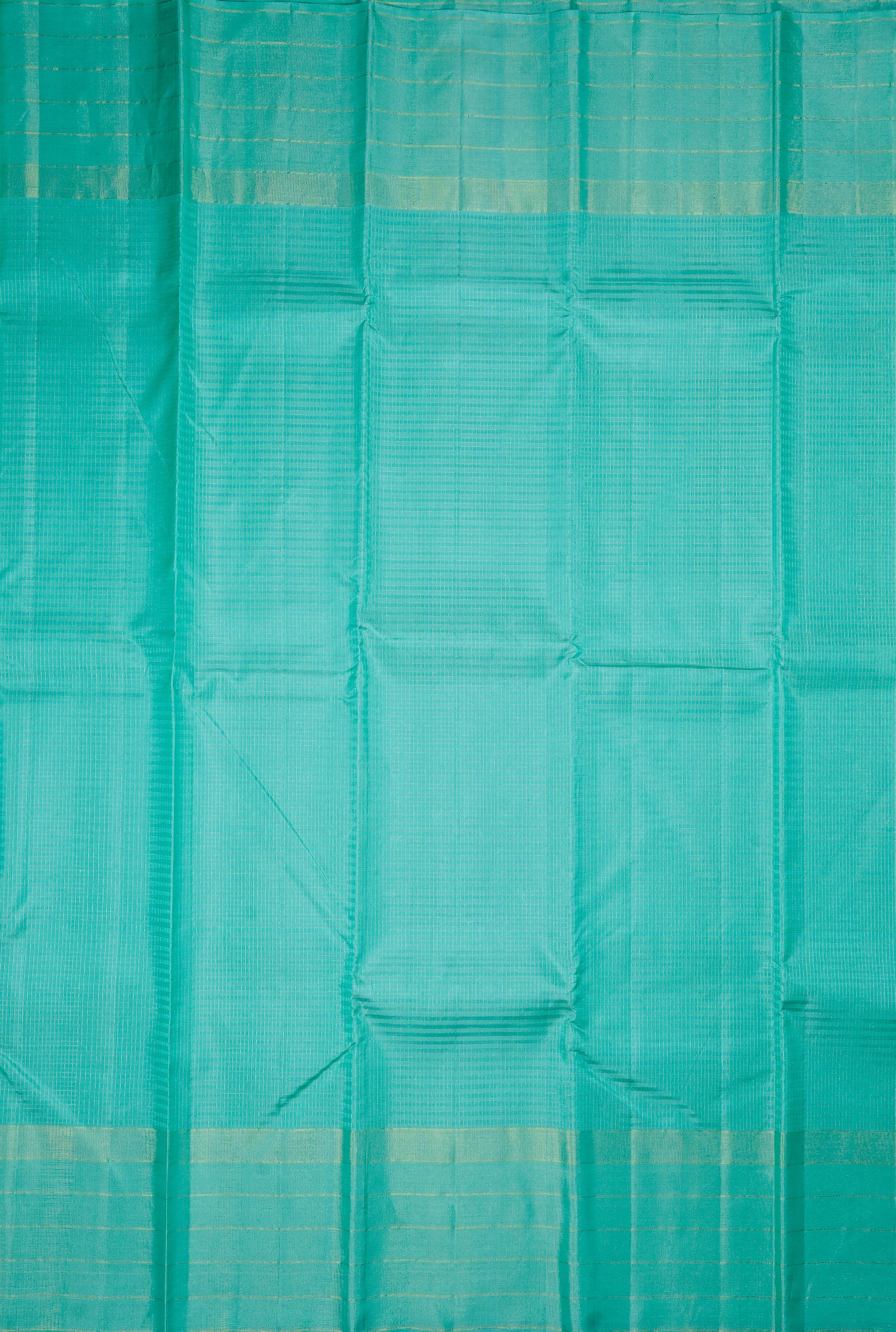 Jade mountain kanchipuram silk saree with very intricate and small checks created by zari and a subtle horizontal stripes effect created by darker threads. The border is of the same color, starting with a band of gold zari followed by smaller horizontal stripes woven in gold zari. The pallu has a wide vertical area of gold zari followed by smaller lines woven in gold zari. The saree has a monochromic blouse identical to the body and the same border.