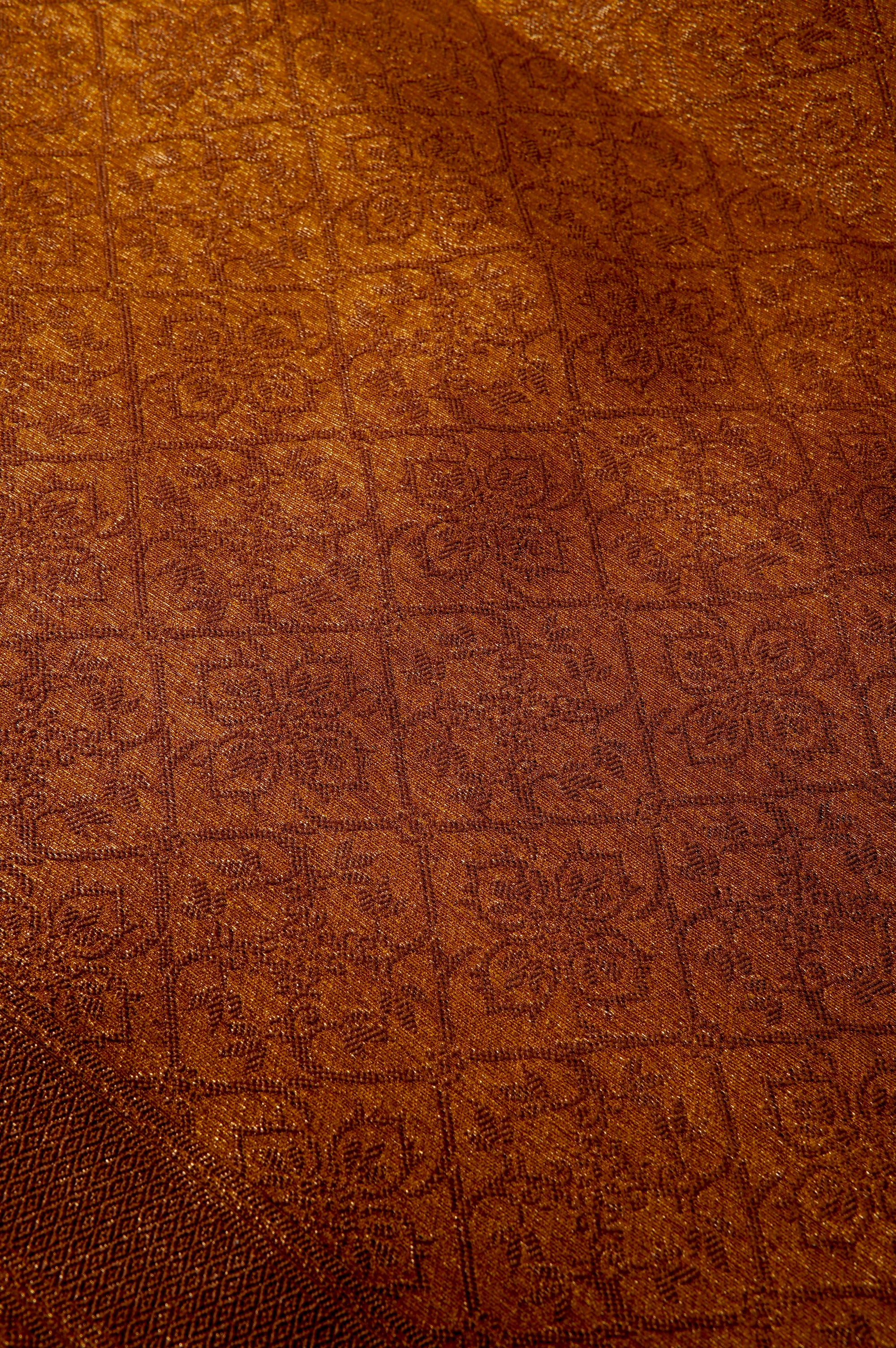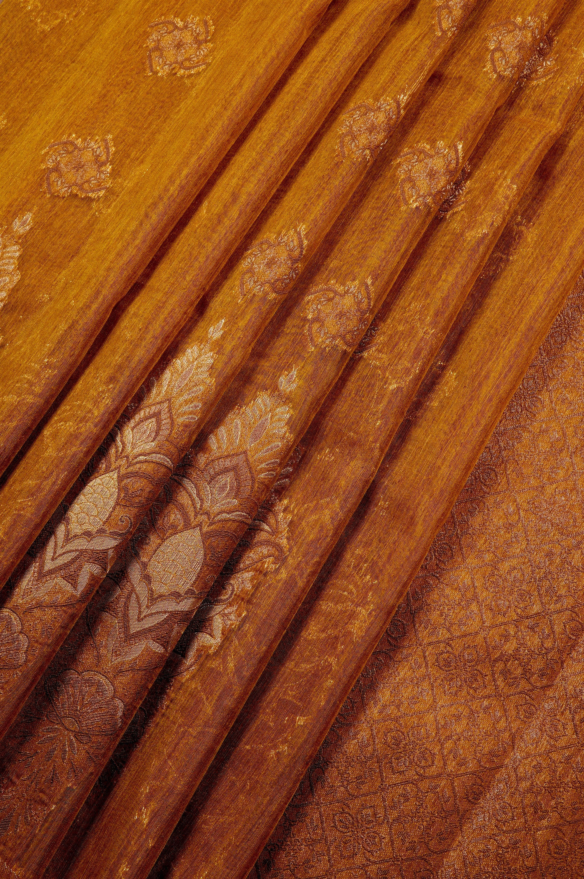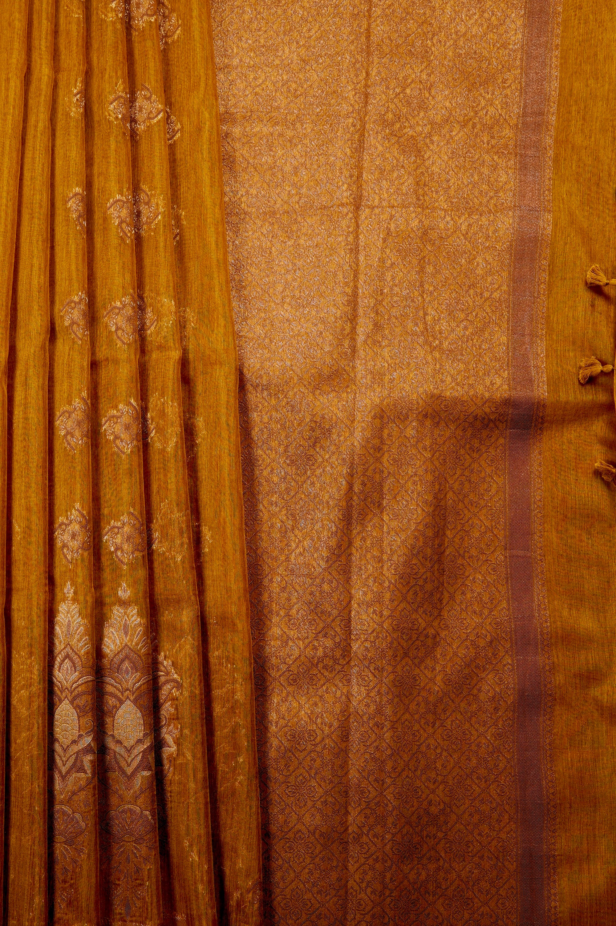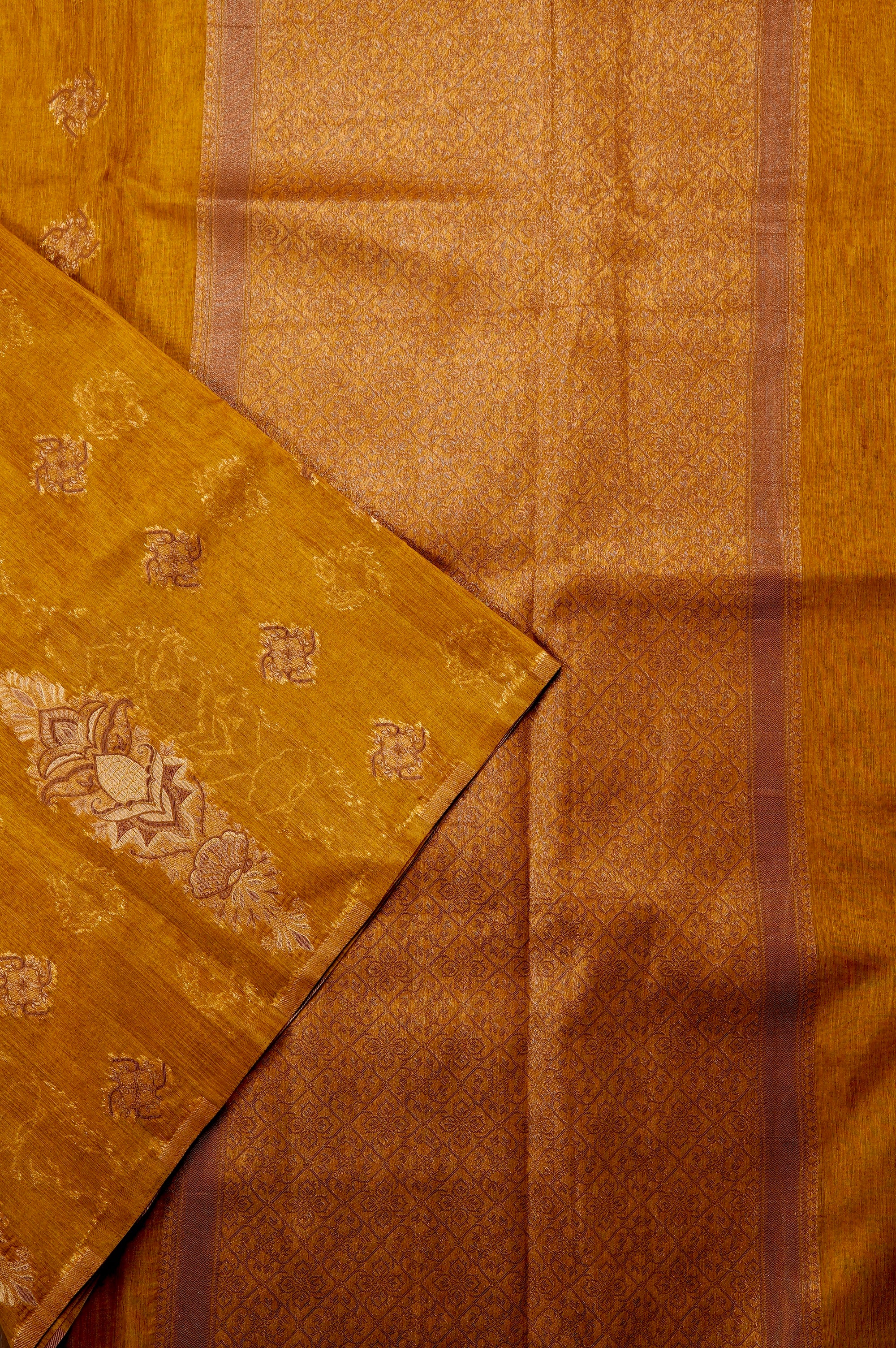 Radiate warmth with this stunning ochre semi-linen saree, offering a beautifully textured, breathable drape that is perfect for any season. The rich, earthy canvas is elegantly elevated by delicate, geometric gold zari buttas scattered across the body, which gracefully transition into majestic, larger floral-inspired zari motifs near the lower hem. Complementing the vibrant body is a beautifully detailed pallu, featuring a dense, intricate diamond lattice pattern woven in lustrous zari and framed by subtle vertical borders.