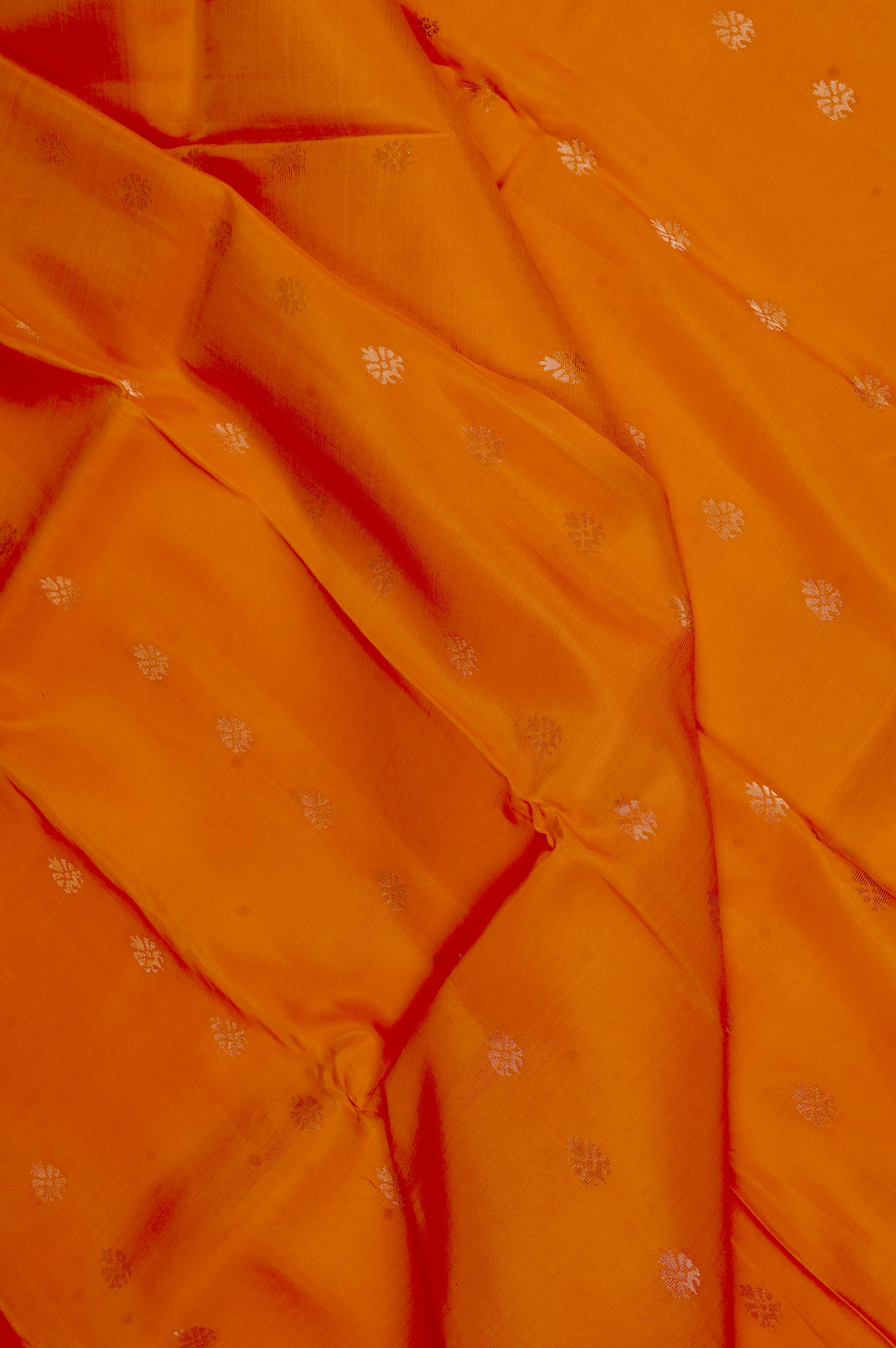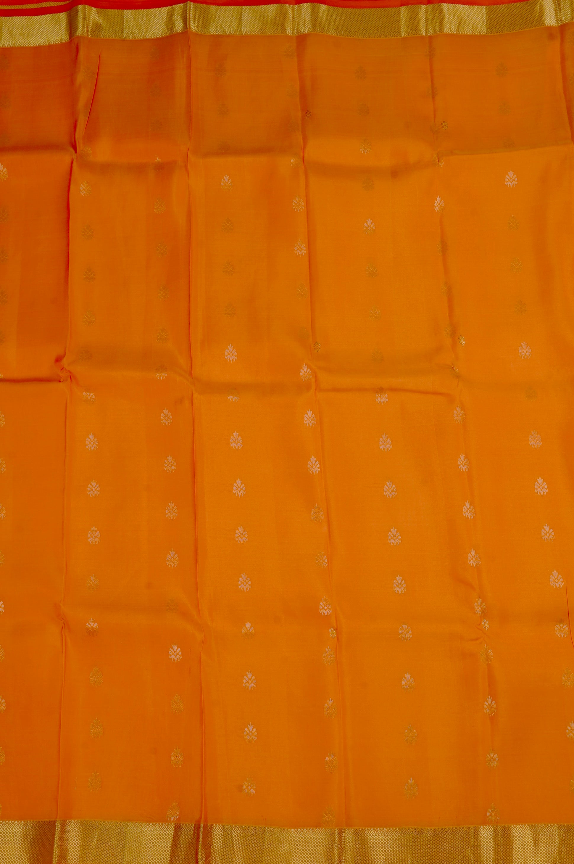 A sunset coded silk mix saree with an orange body, holding a series of small petal like motifs woven in gold zari, with a plain gold zari border. The pallu has a red base filled with dense floral patterns, holding stylised mango bhuttas, ending with a band if abstract stripes on the negative spaces woven in light gold zari. The saree has a red blouse with the same border.