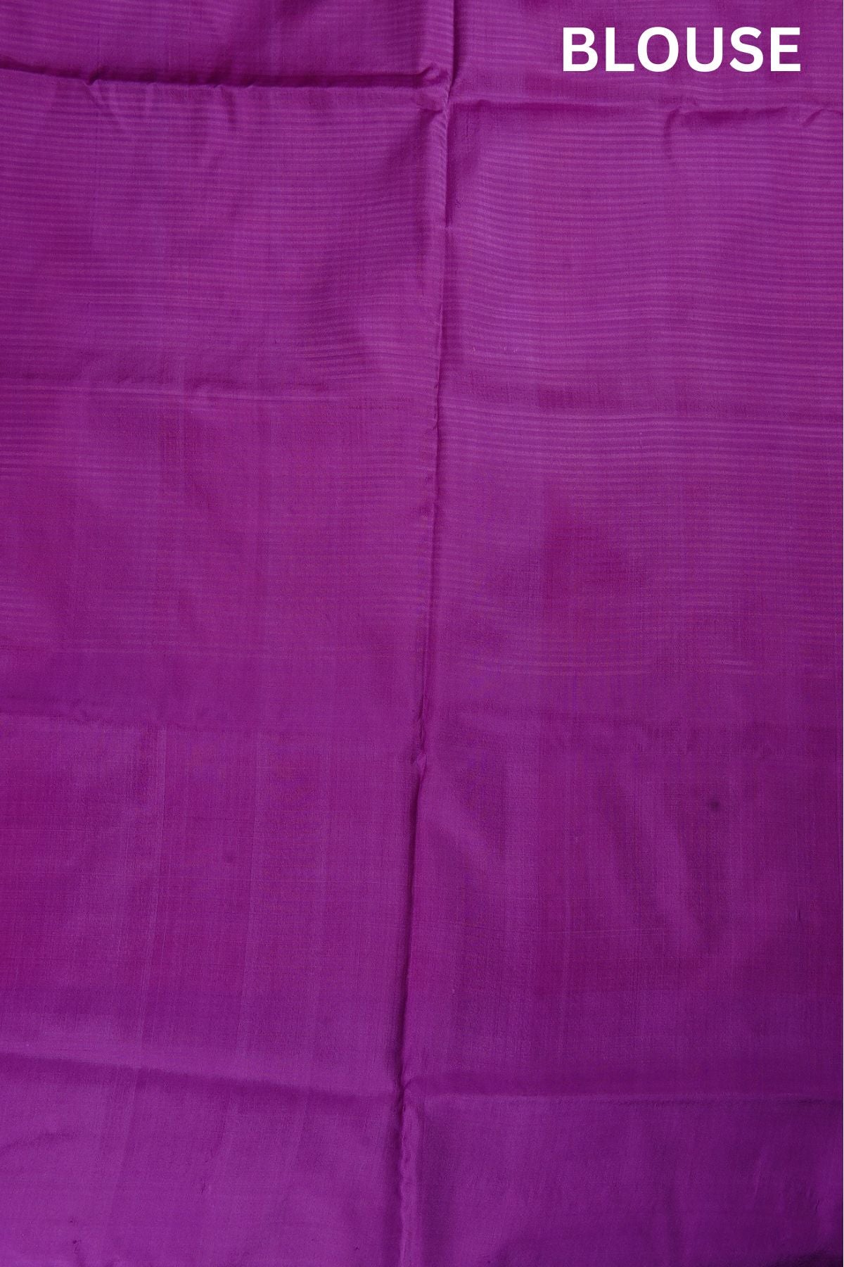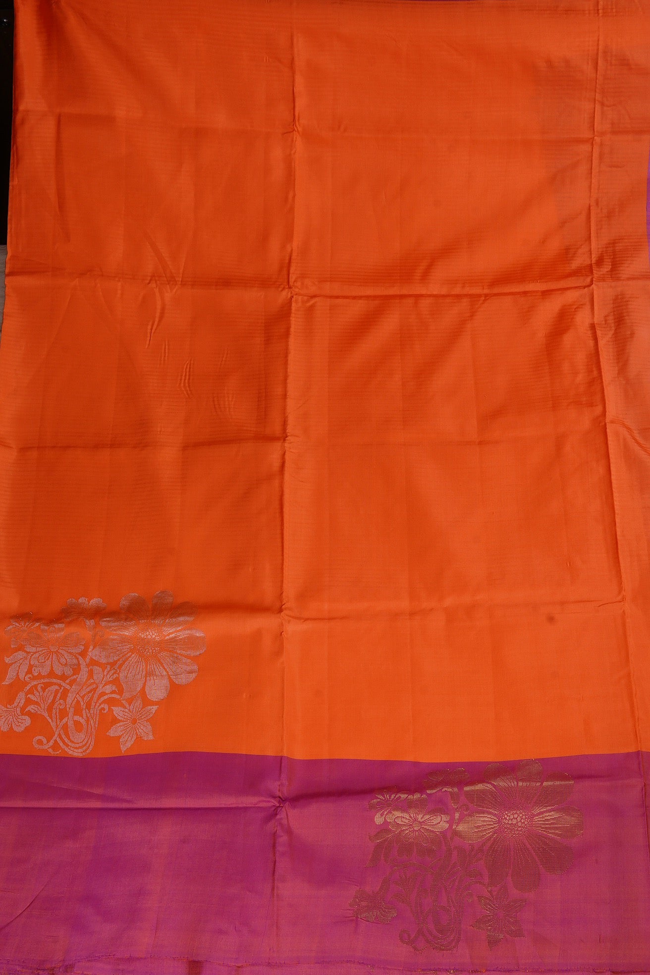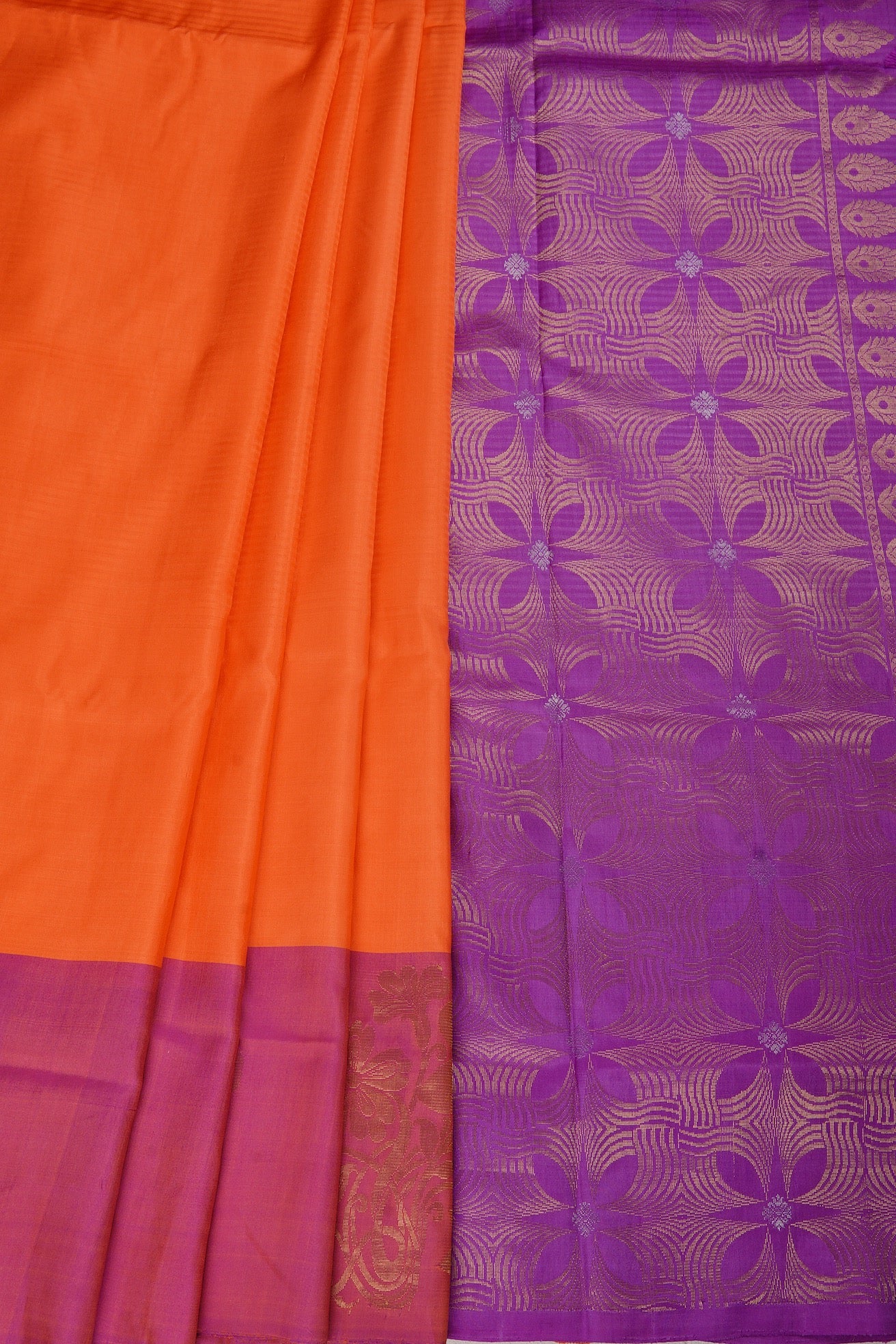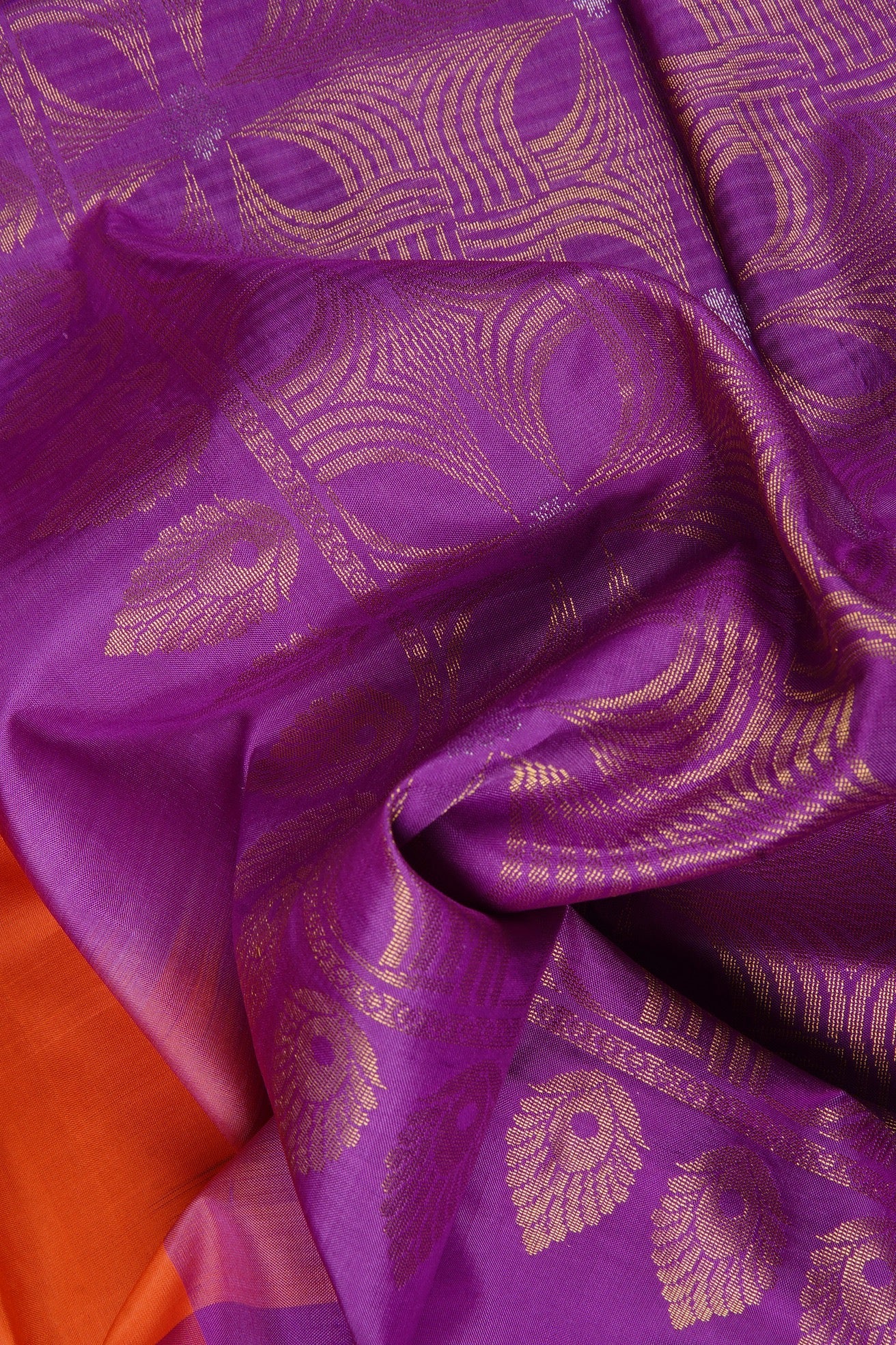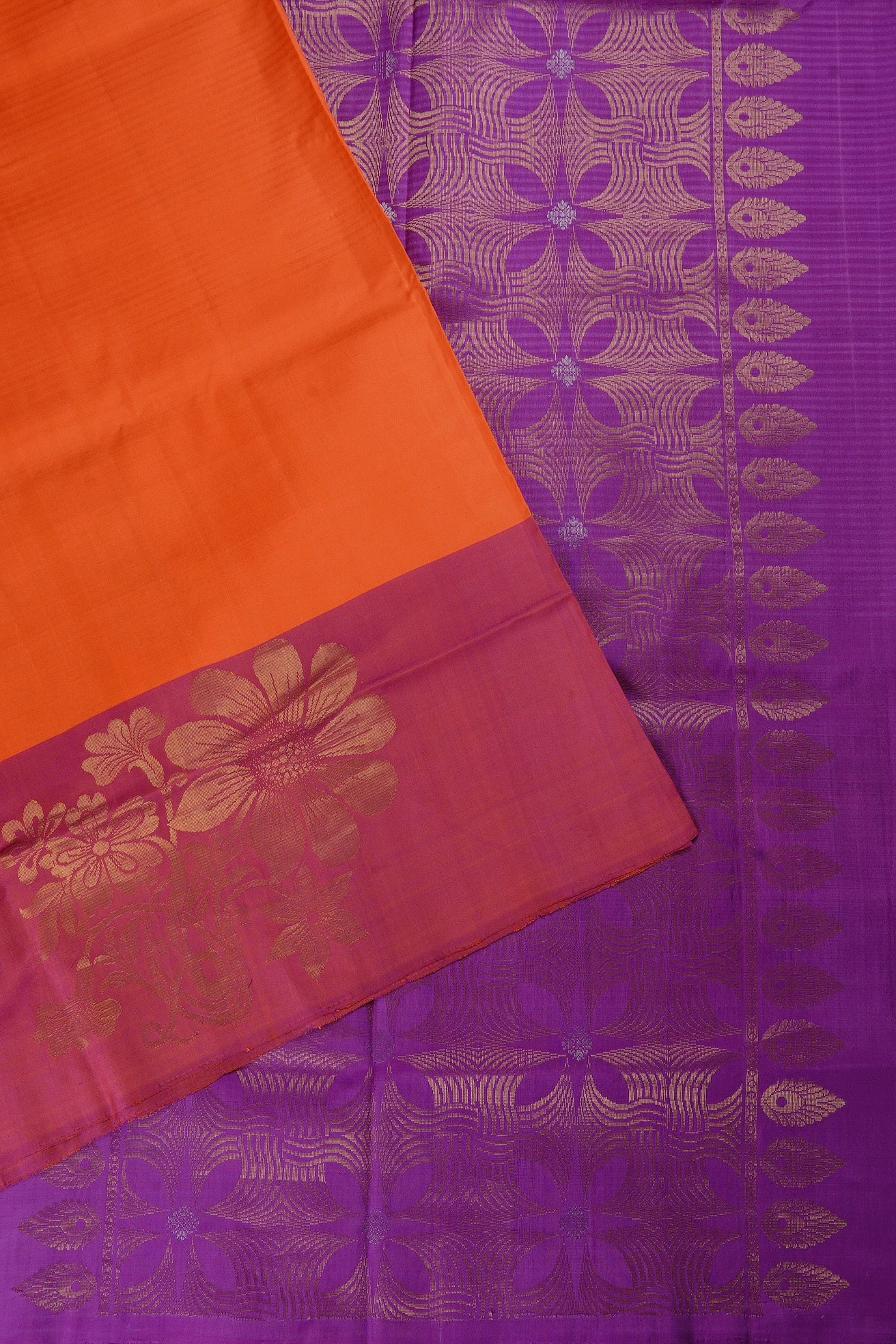 A solid orange soft silk saree with a long deep pink border, leading to the pallu with a detailed floral motif woven in gold zari. The pallu has a purple base with a contemporary floral pattern inspired by zentangle designs woven in zari, ending with a band of small feather motifs. The saree has a solid purple blouse.