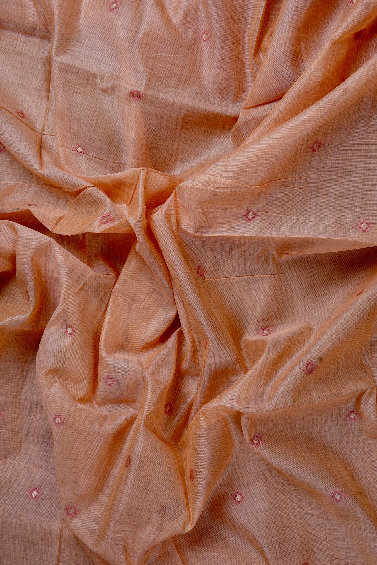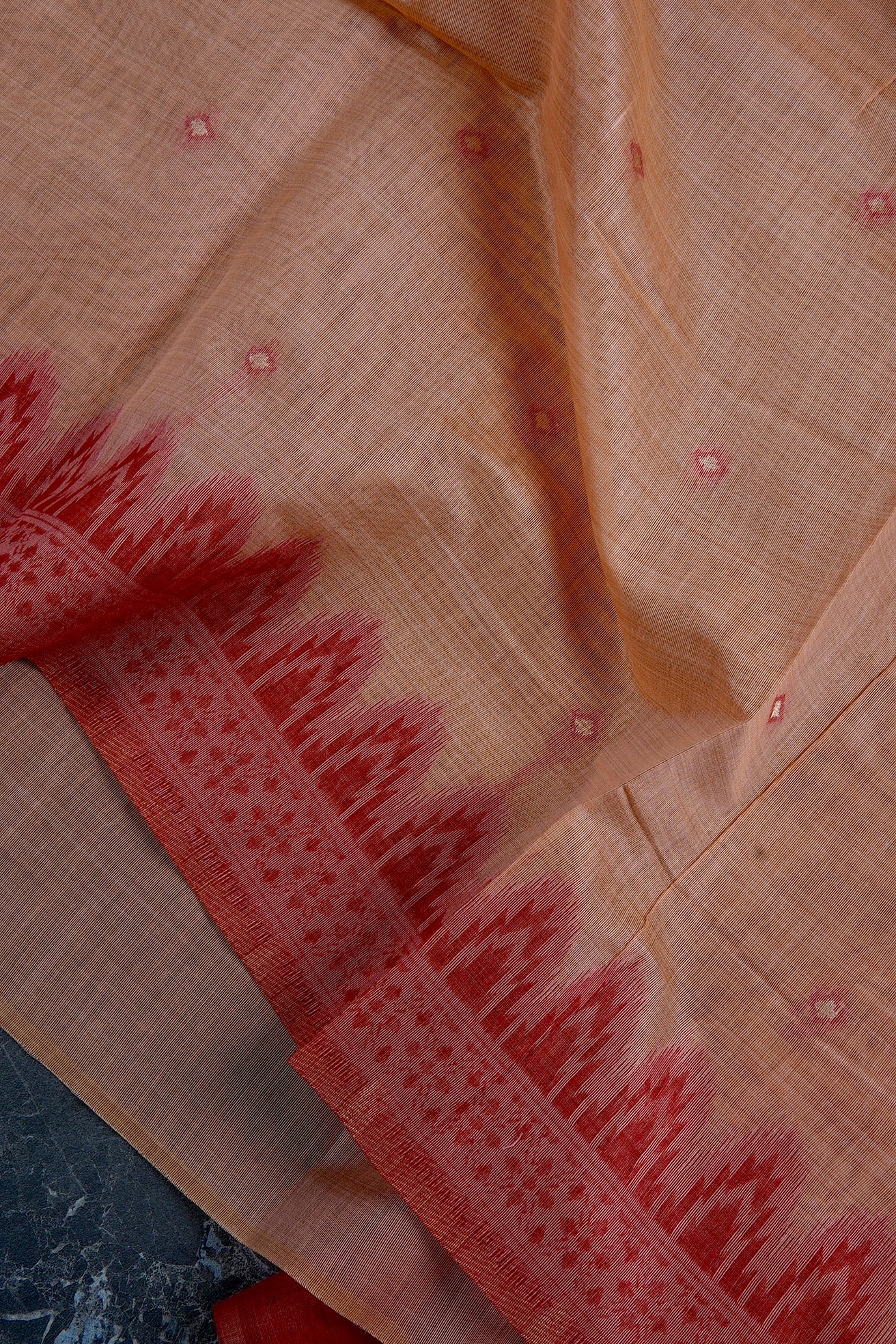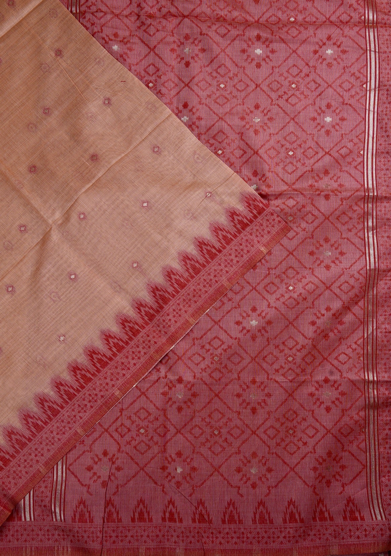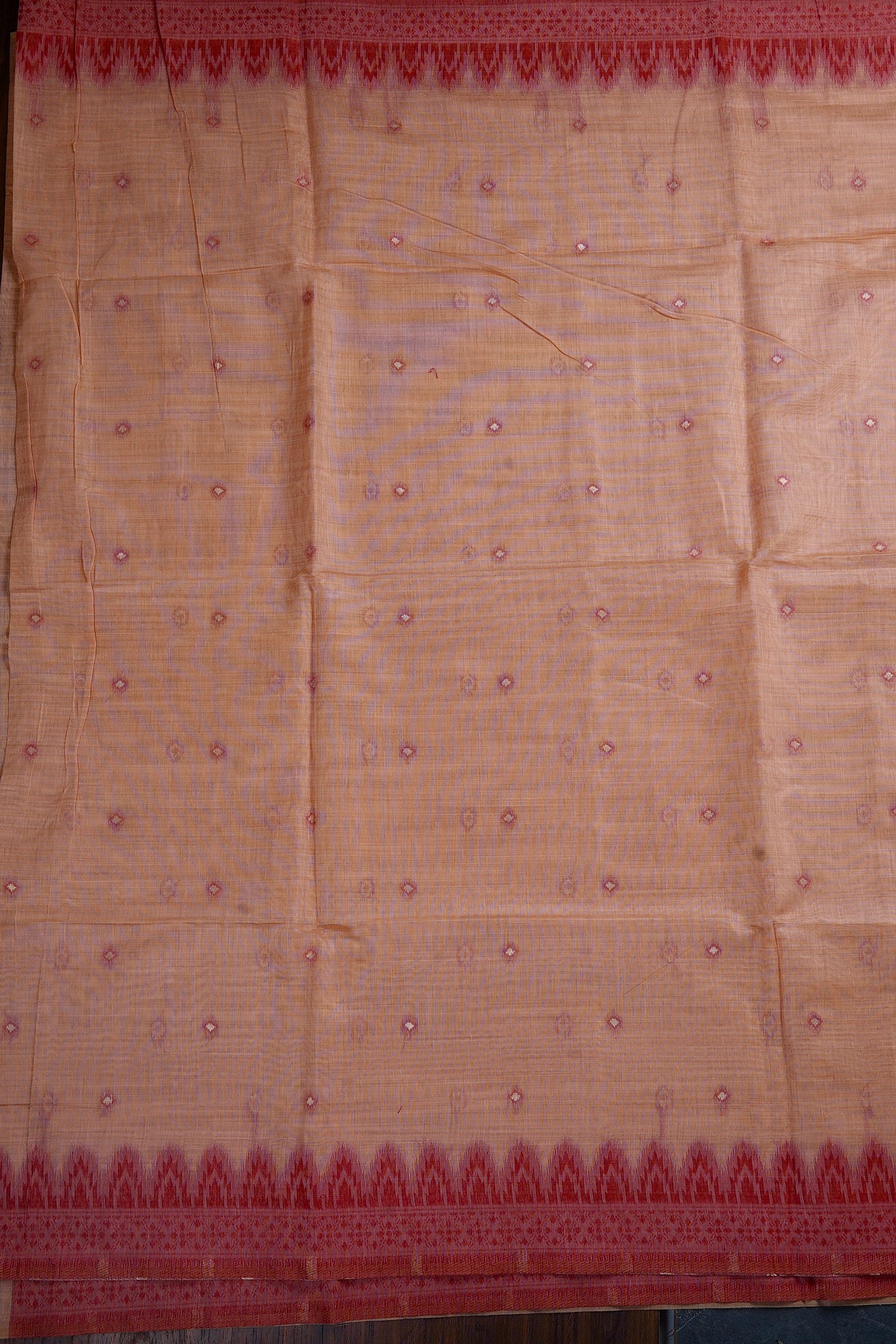 Previous NextApricot semi silk cotton saree with small diamond bhuttas woven in white with a light blush border throughout the body, and a border starting with temple reks in red and pink, followed by a band of abstract geometric patterns. The pallu has a blush base filled with diamond grids with abstract geometric patterns in red. The saree has a red blouse with small square motifs woven in white.