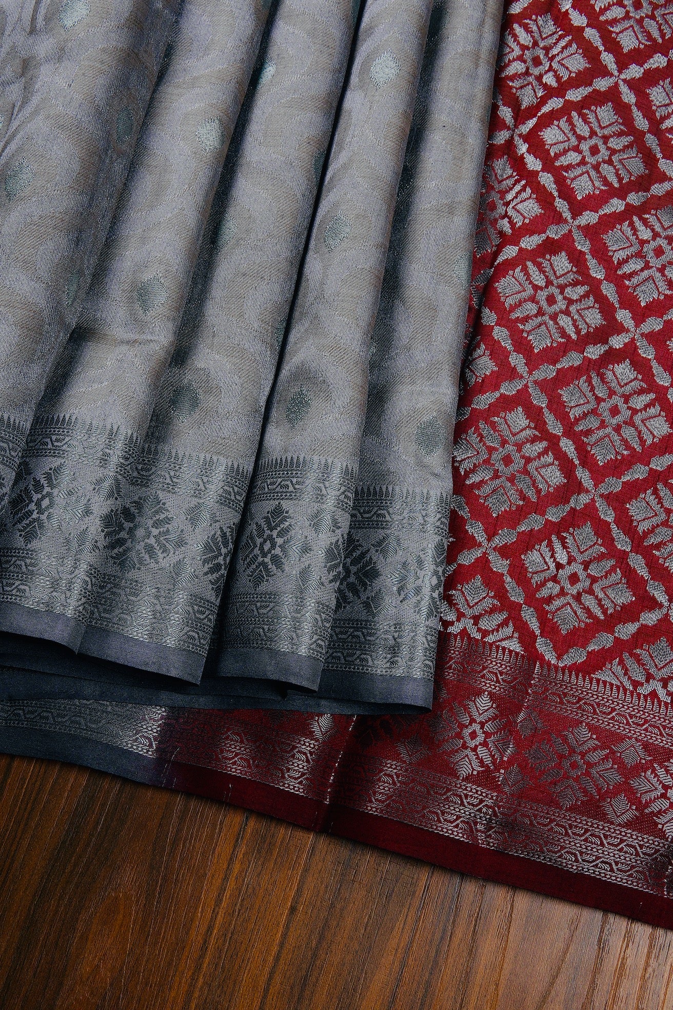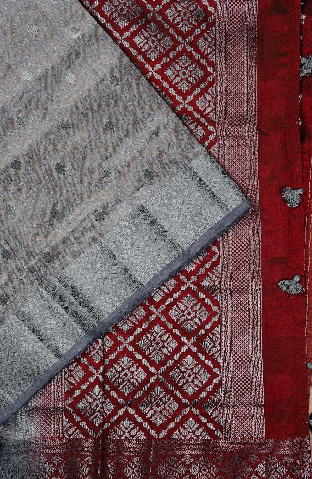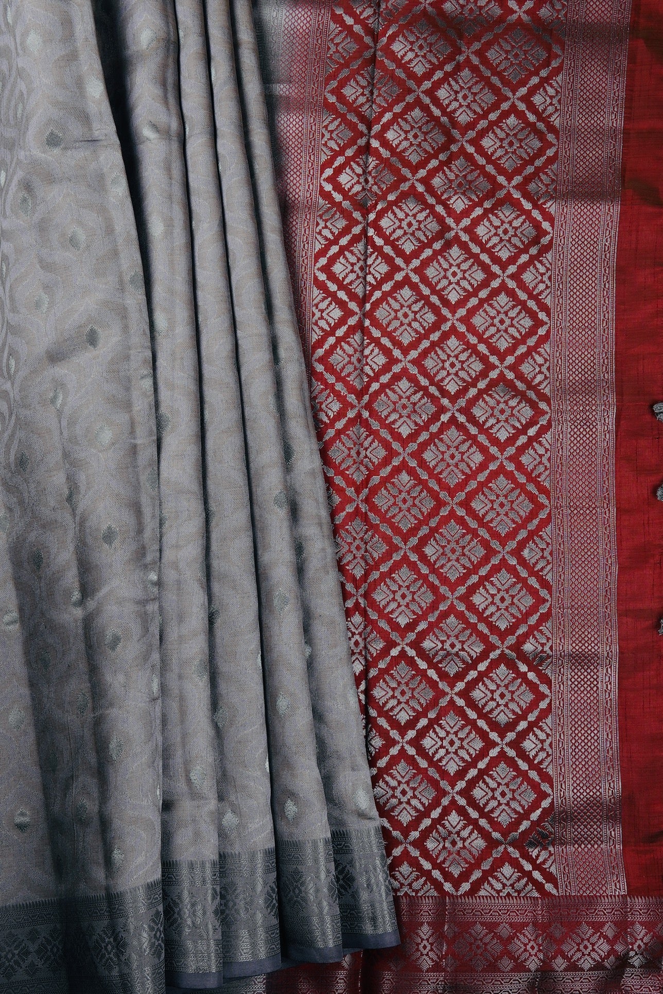 Previous NextArsenic gray semi tussar embossed saree with layered petal embossing on the body. The border motifs are contemporary with small petals and stylised floral diamonds woven in silver zari. The pallu is short with two bordering bands of diamond grids, enclosing a broad expanse of stylised diamonds bordered by diamond lattice grids woven in silver zari on a deep red base. The saree has a brick red blouse with small floral motifs woven throughout and the same border woven in silver zari.