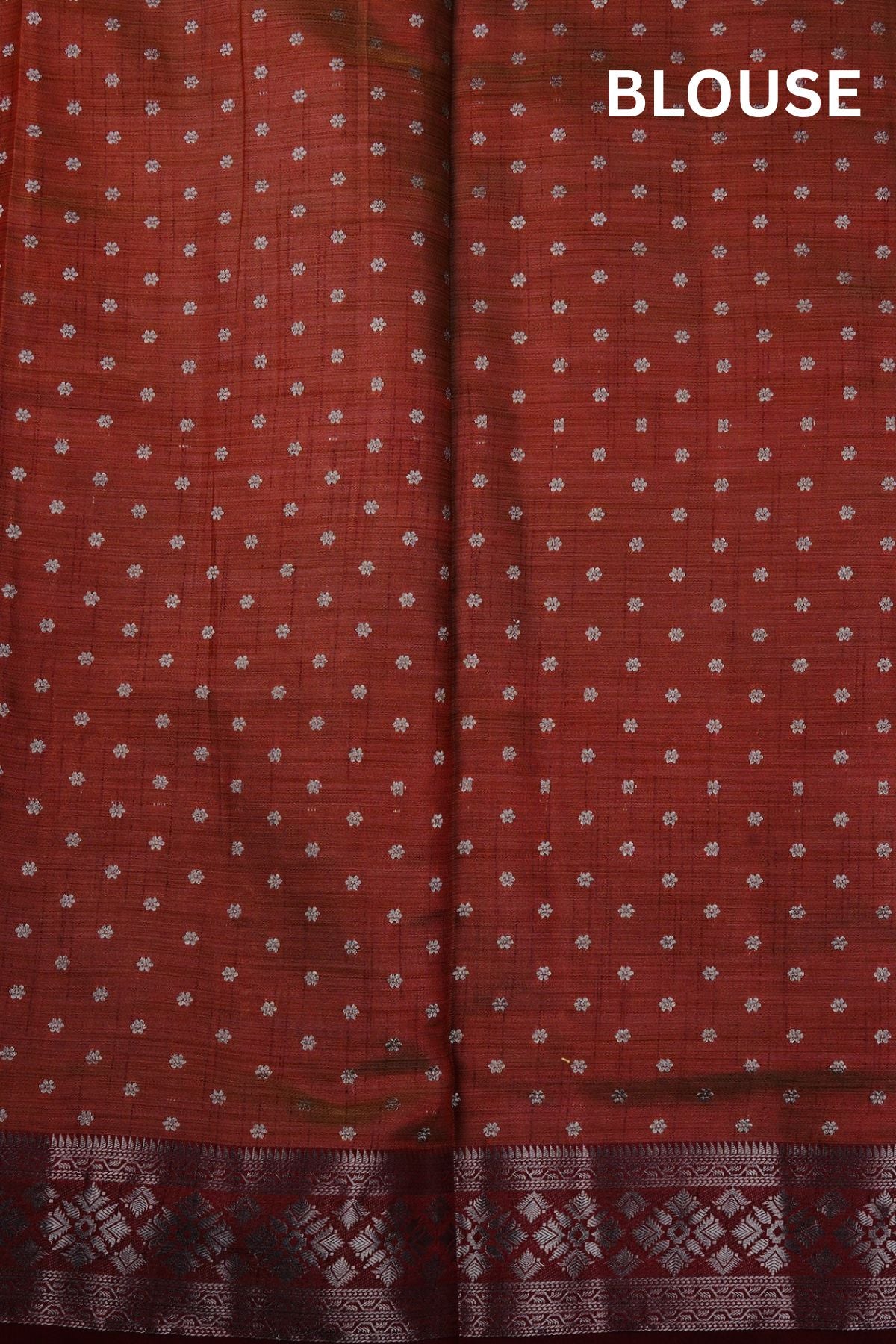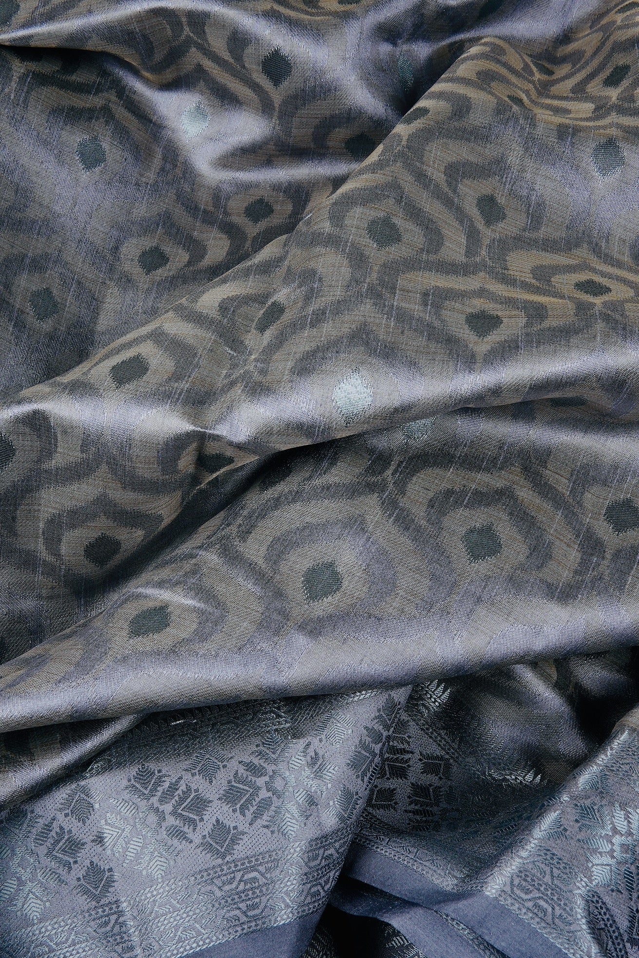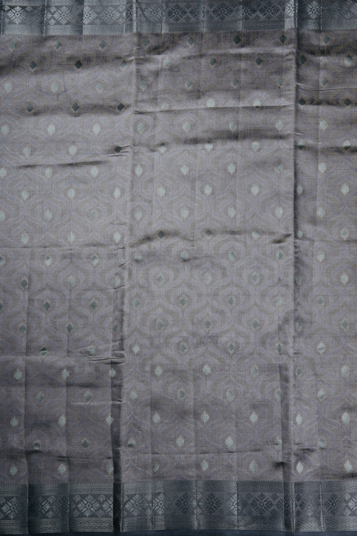 Previous NextArsenic gray semi tussar embossed saree with layered petal embossing on the body. The border motifs are contemporary with small petals and stylised floral diamonds woven in silver zari. The pallu is short with two bordering bands of diamond grids, enclosing a broad expanse of stylised diamonds bordered by diamond lattice grids woven in silver zari on a deep red base. The saree has a brick red blouse with small floral motifs woven throughout and the same border woven in silver zari.