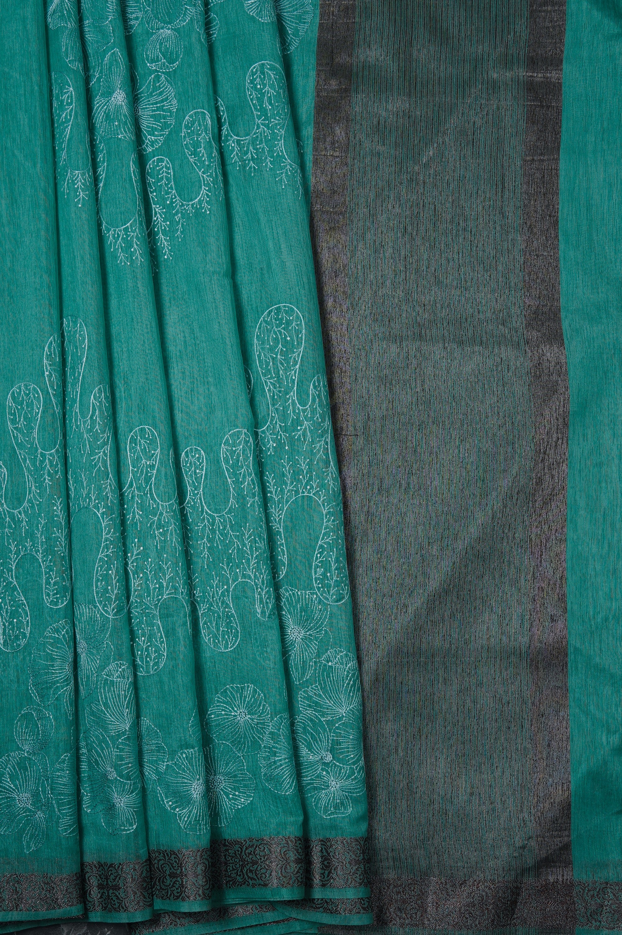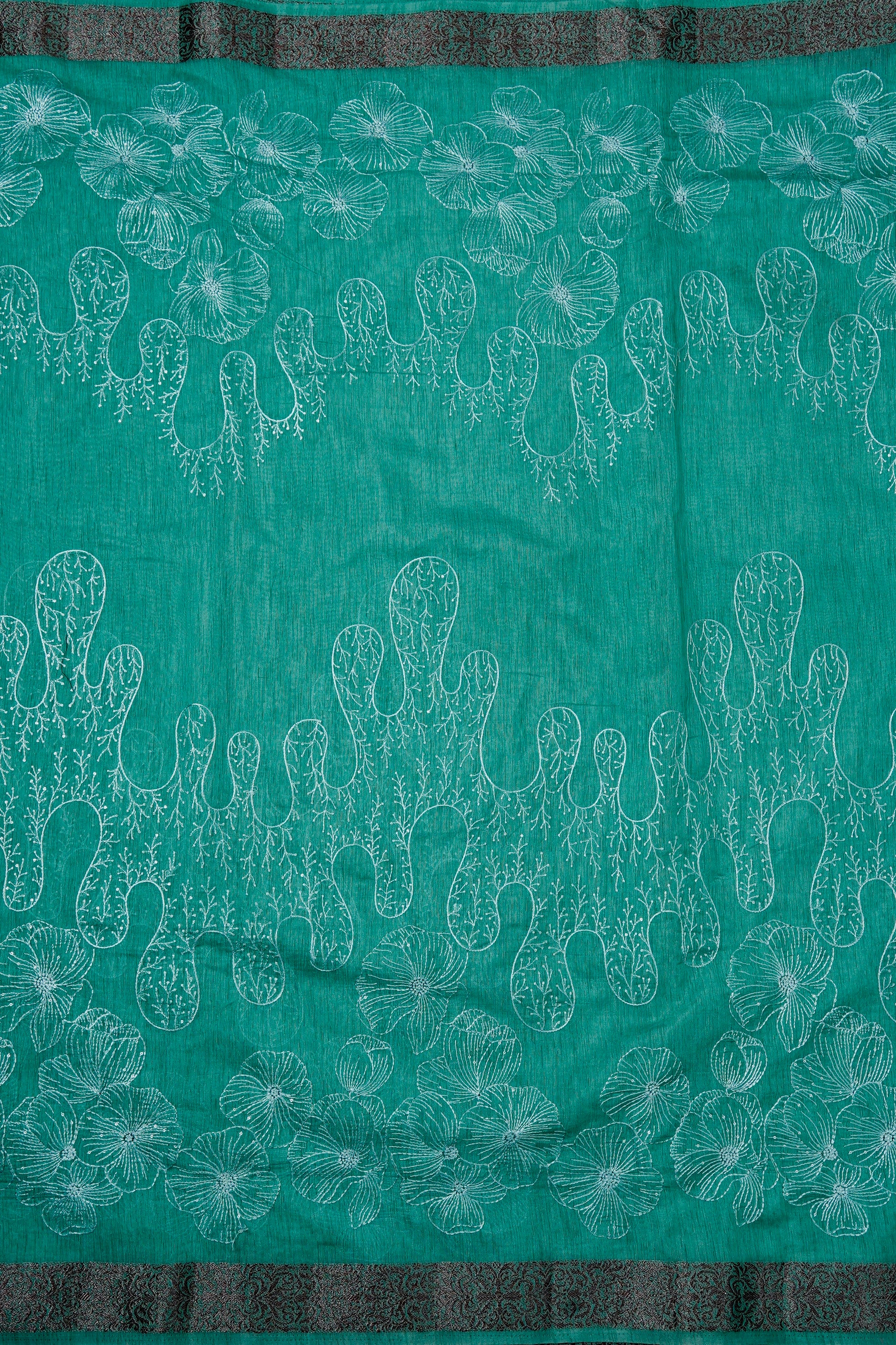 Previous NextAutumn pine green semi tussar saree with broad wavy structures holding floral motifs resembling poppy flowers woven in white throughout the body with a plain black-silver floral border. The pallu has a width of black-silver vertical stripes covered by wider bands. The saree has an autumn pine green blouse with the same border.