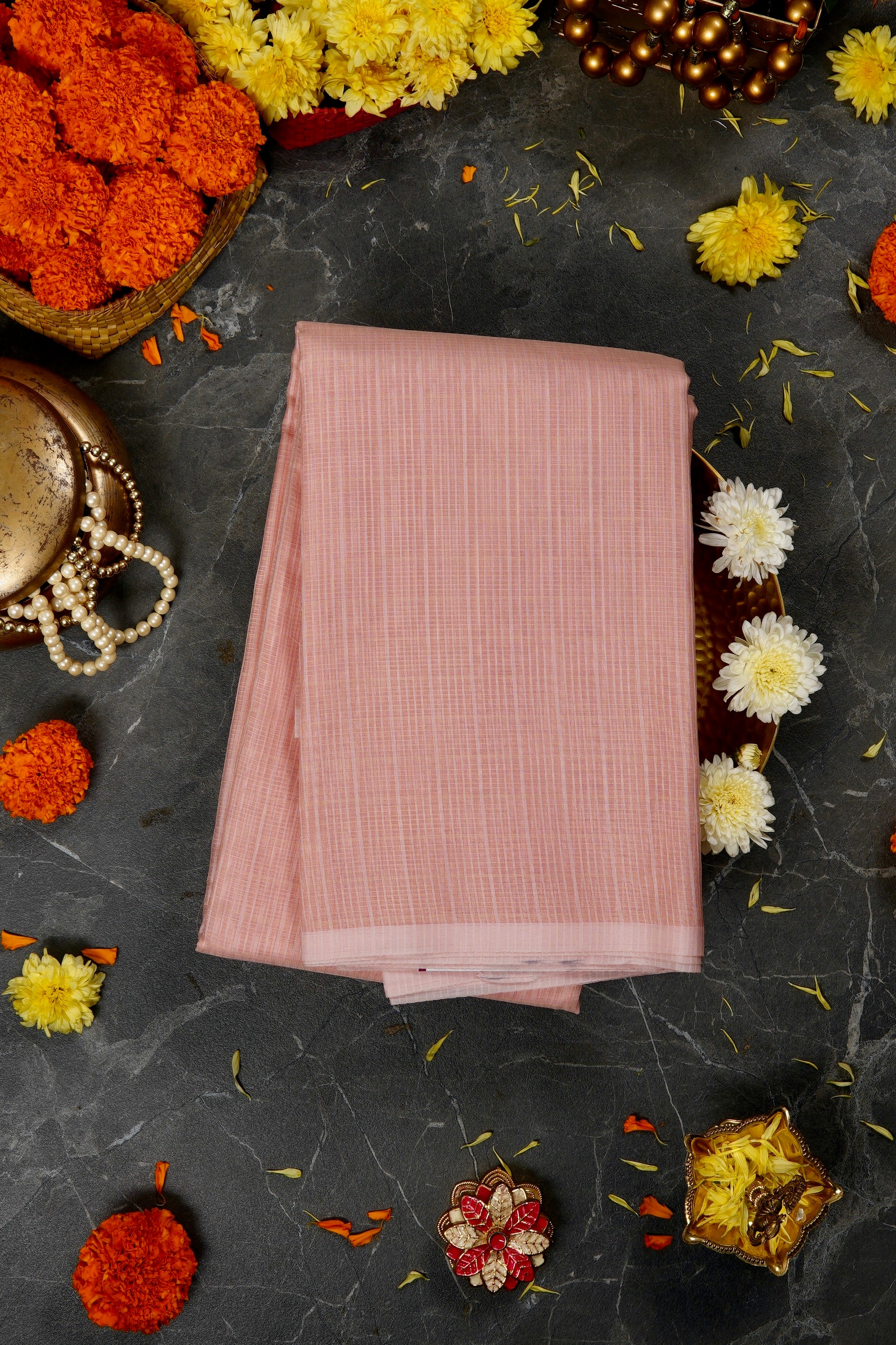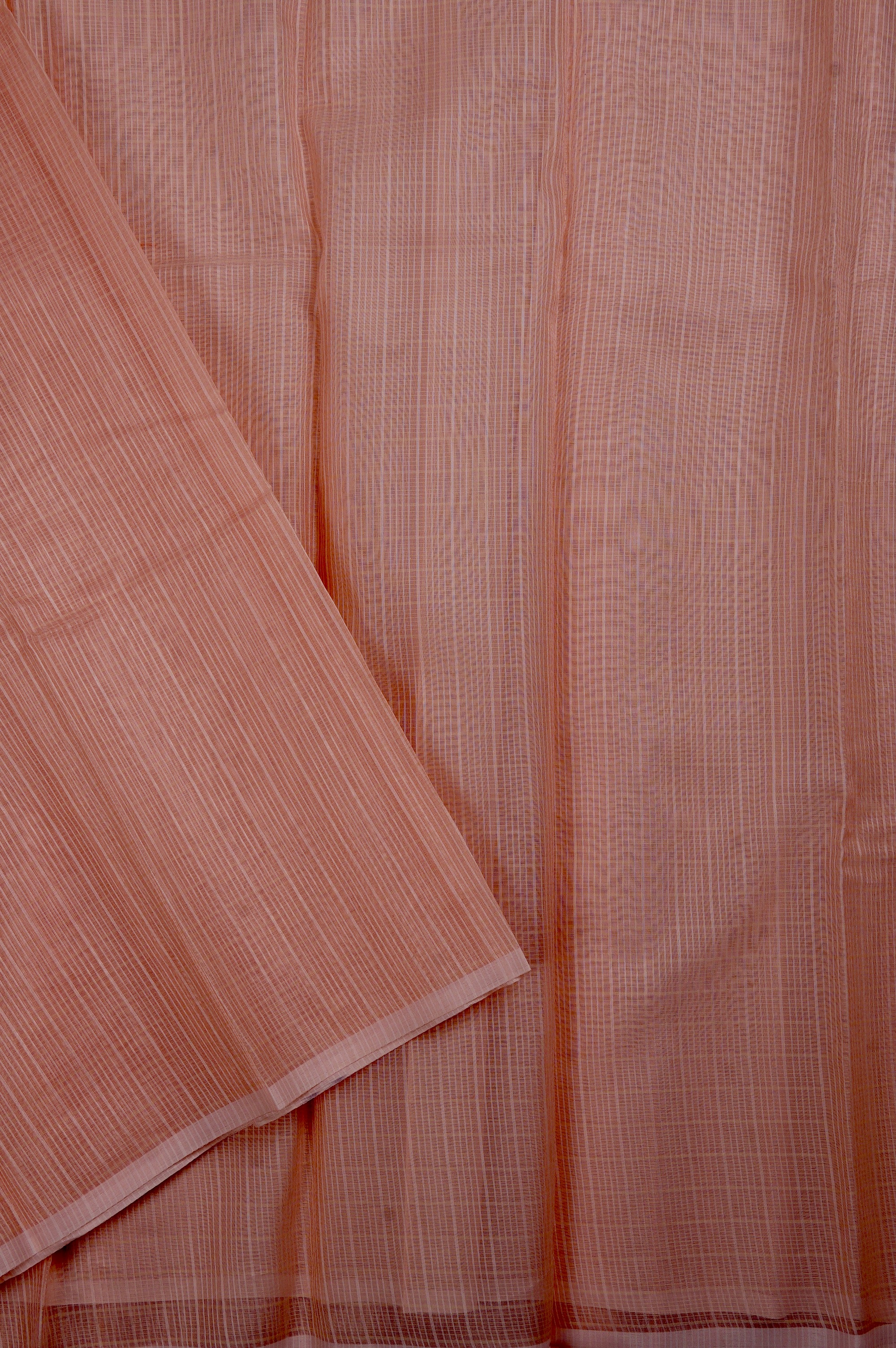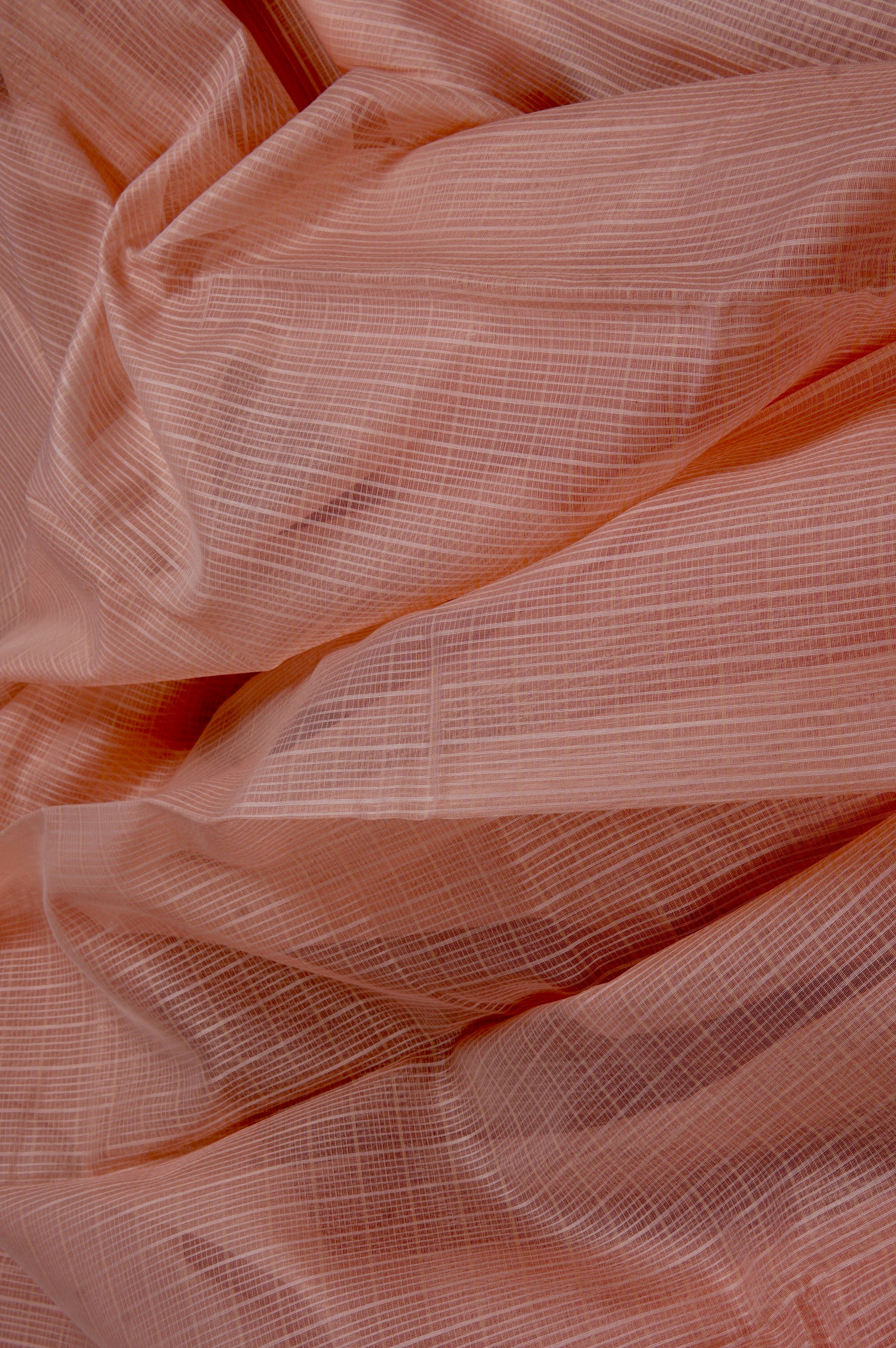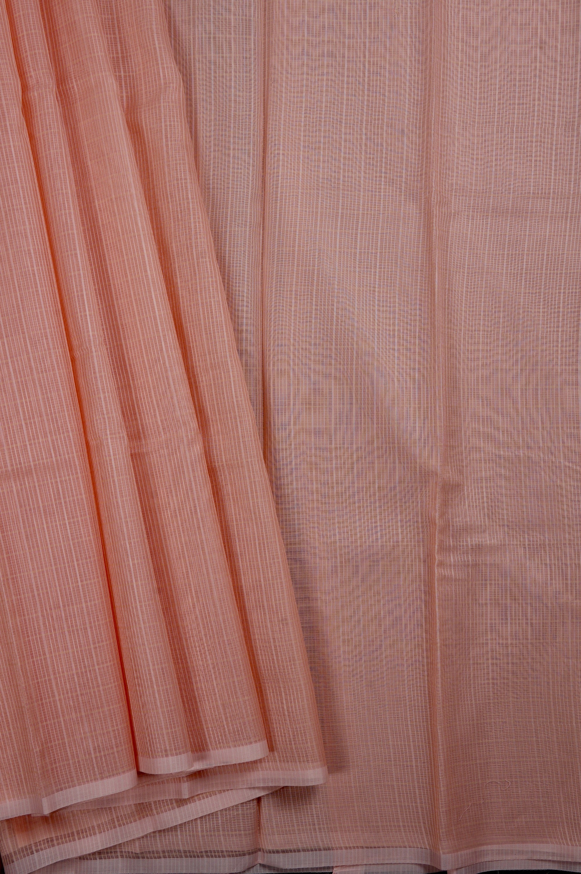 Previous NextCoral pink supernet saree with a touch of minimalism creating a striped textured look with a thin band of baby pink as its border. The saree has its pallu and blouse identical to its body making it a timeless beauty of simplicity.