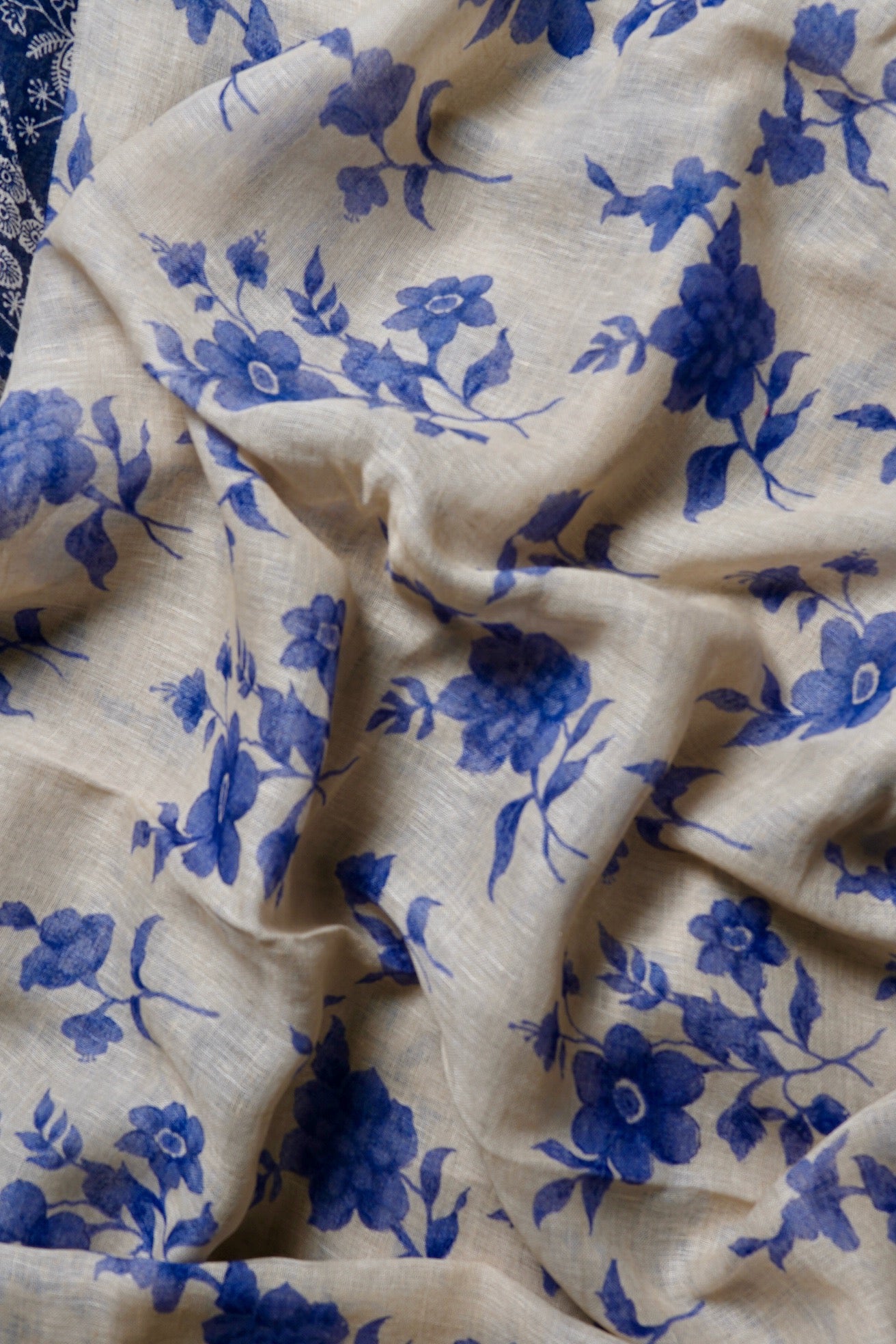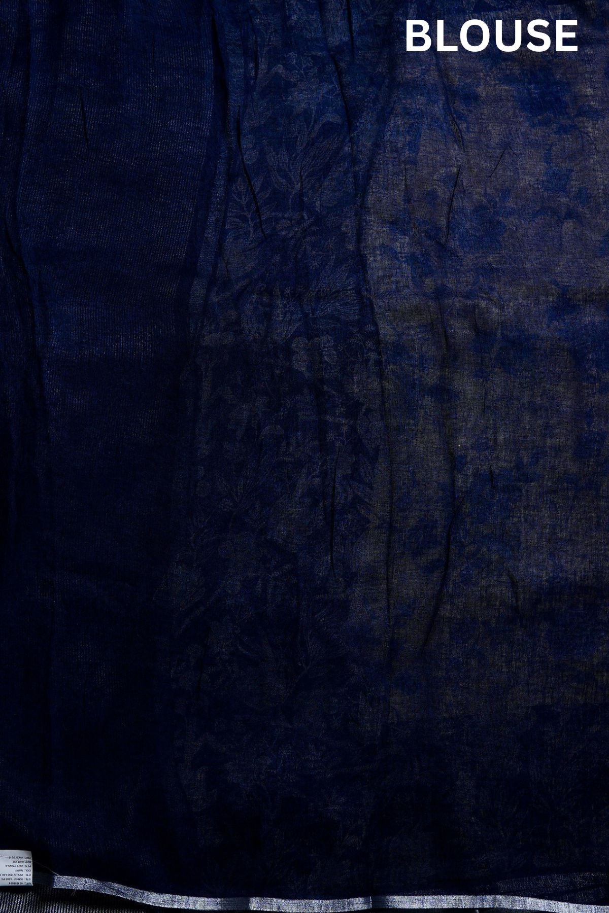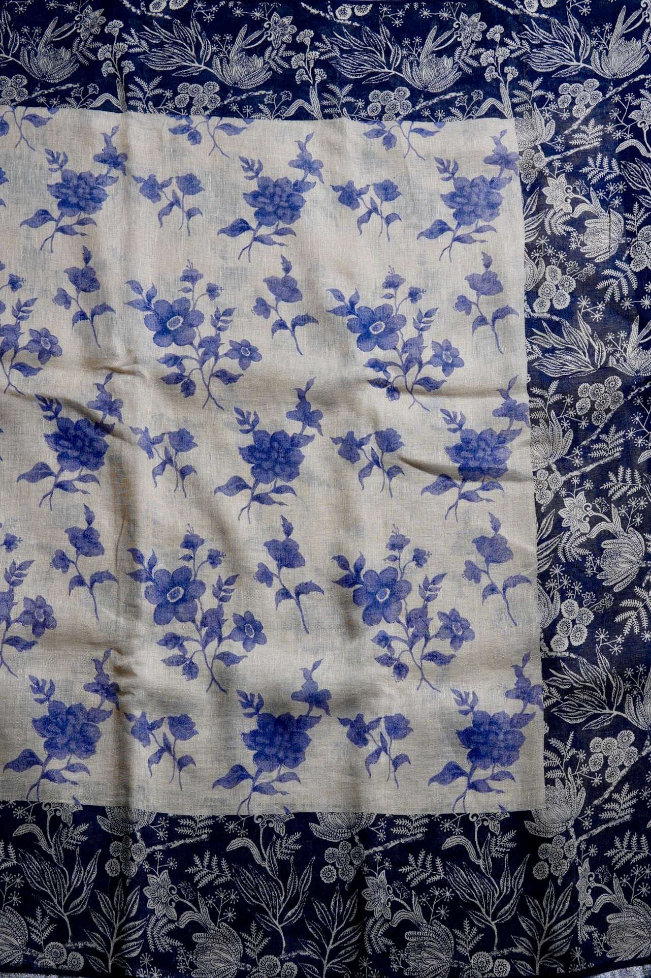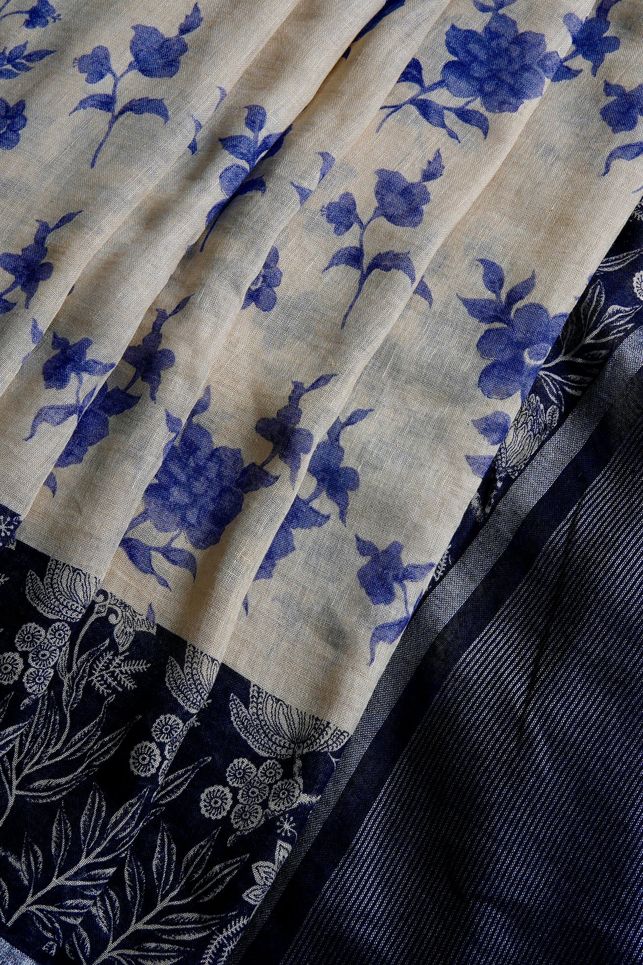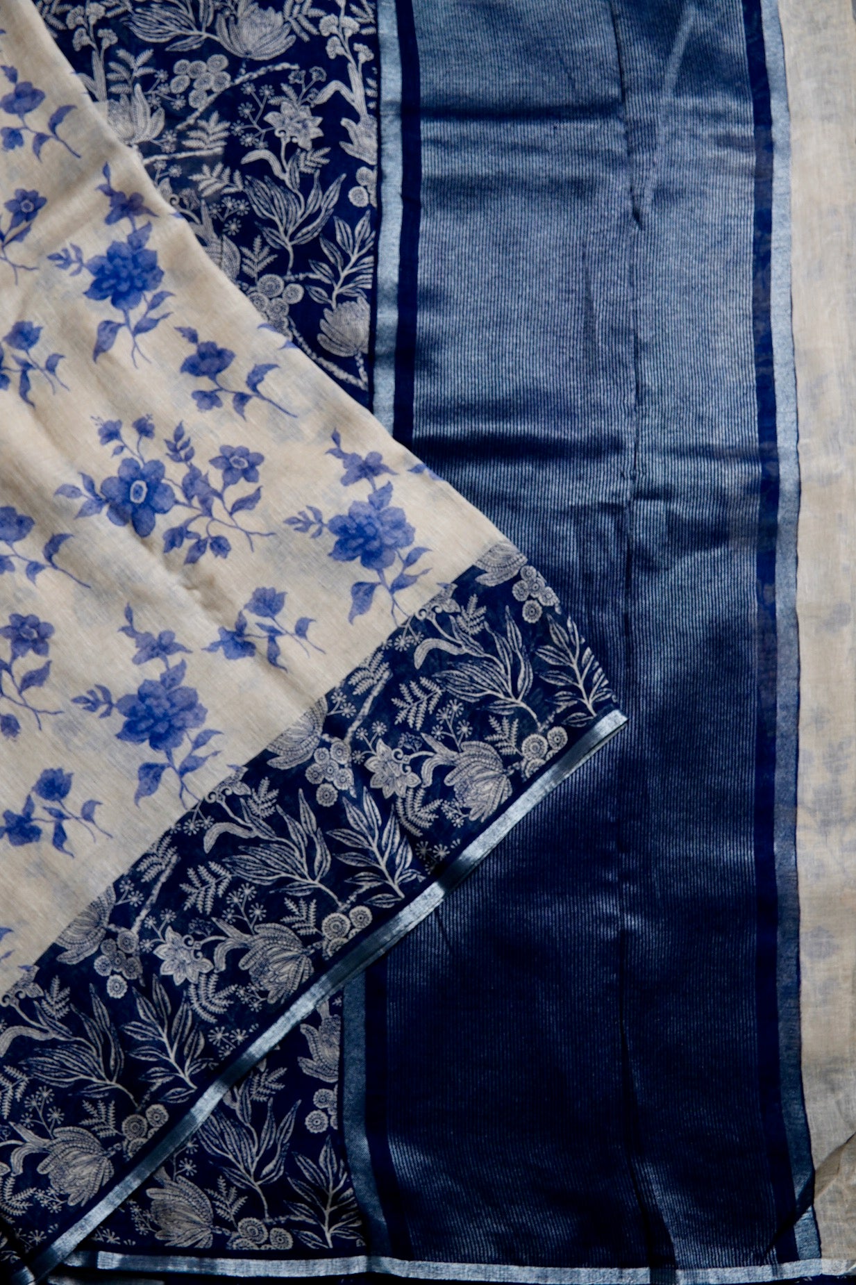 Previous NextThis contrasting cream saree has a body boasting ink-blue flowers woven amidst a bold midnight blue border holding intricate floral vines woven in silver. The pallu is a minimal pattern of thin zari lines against a midnight blue background, complementing the body. The saree has a solid midnight blue blouse to complete the like.