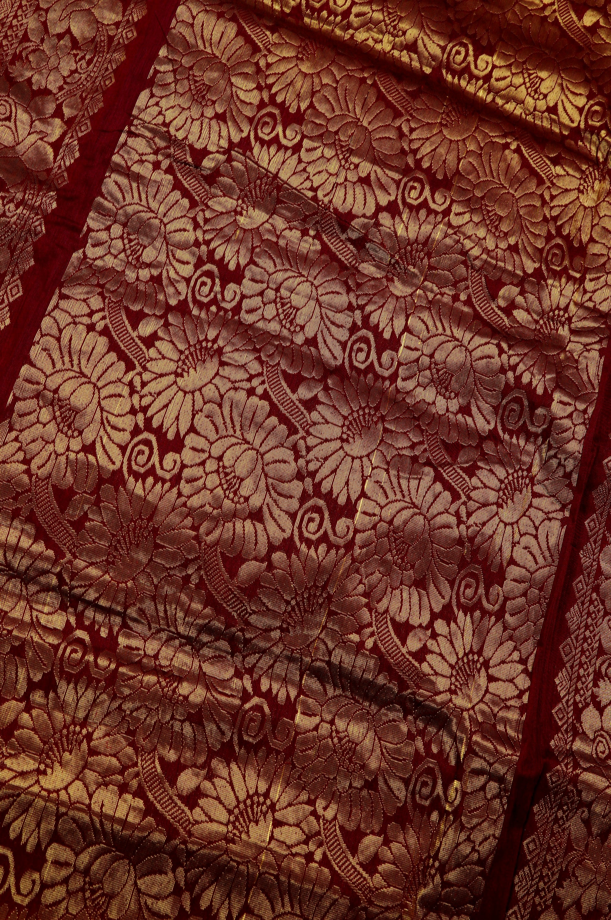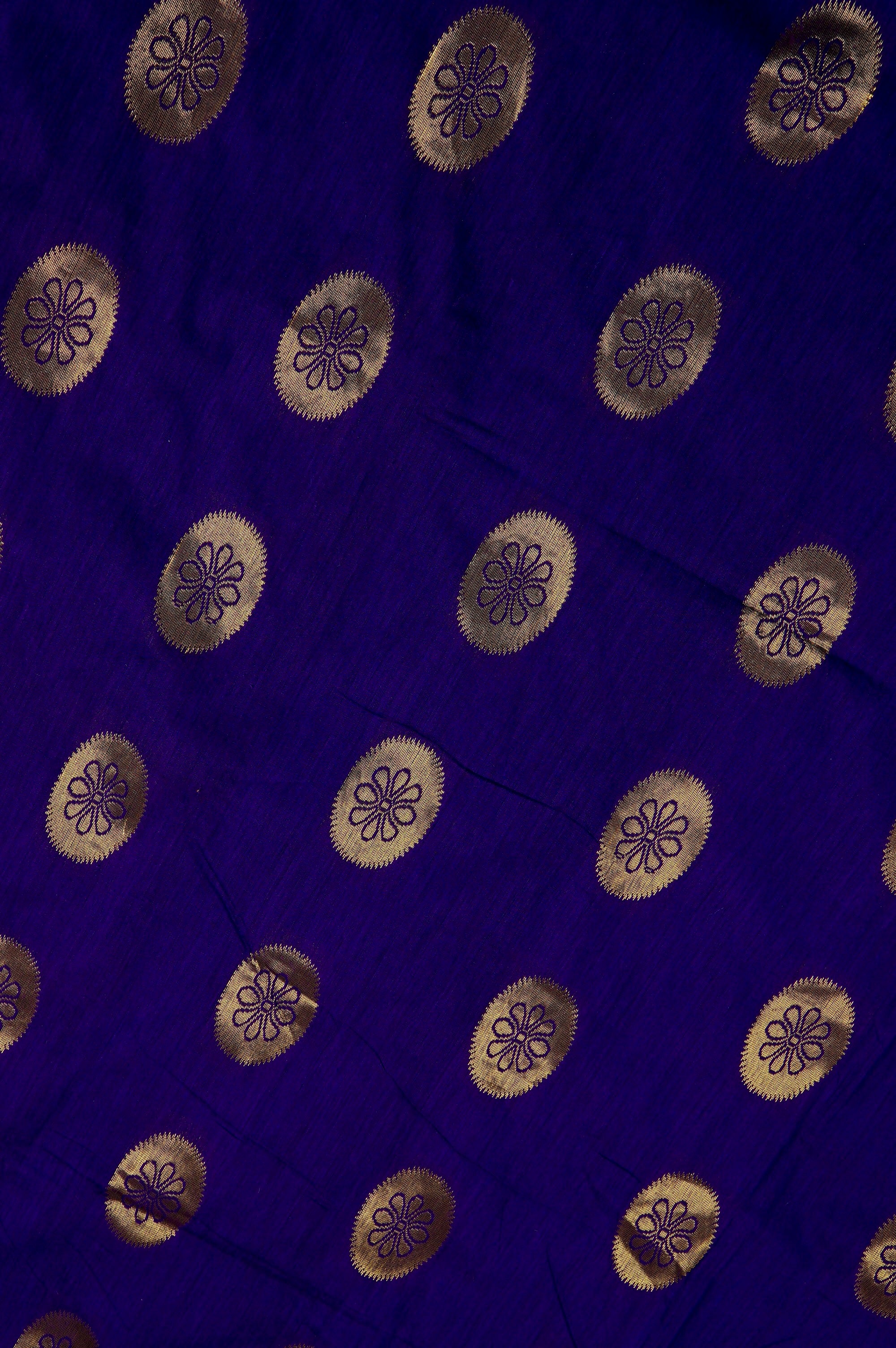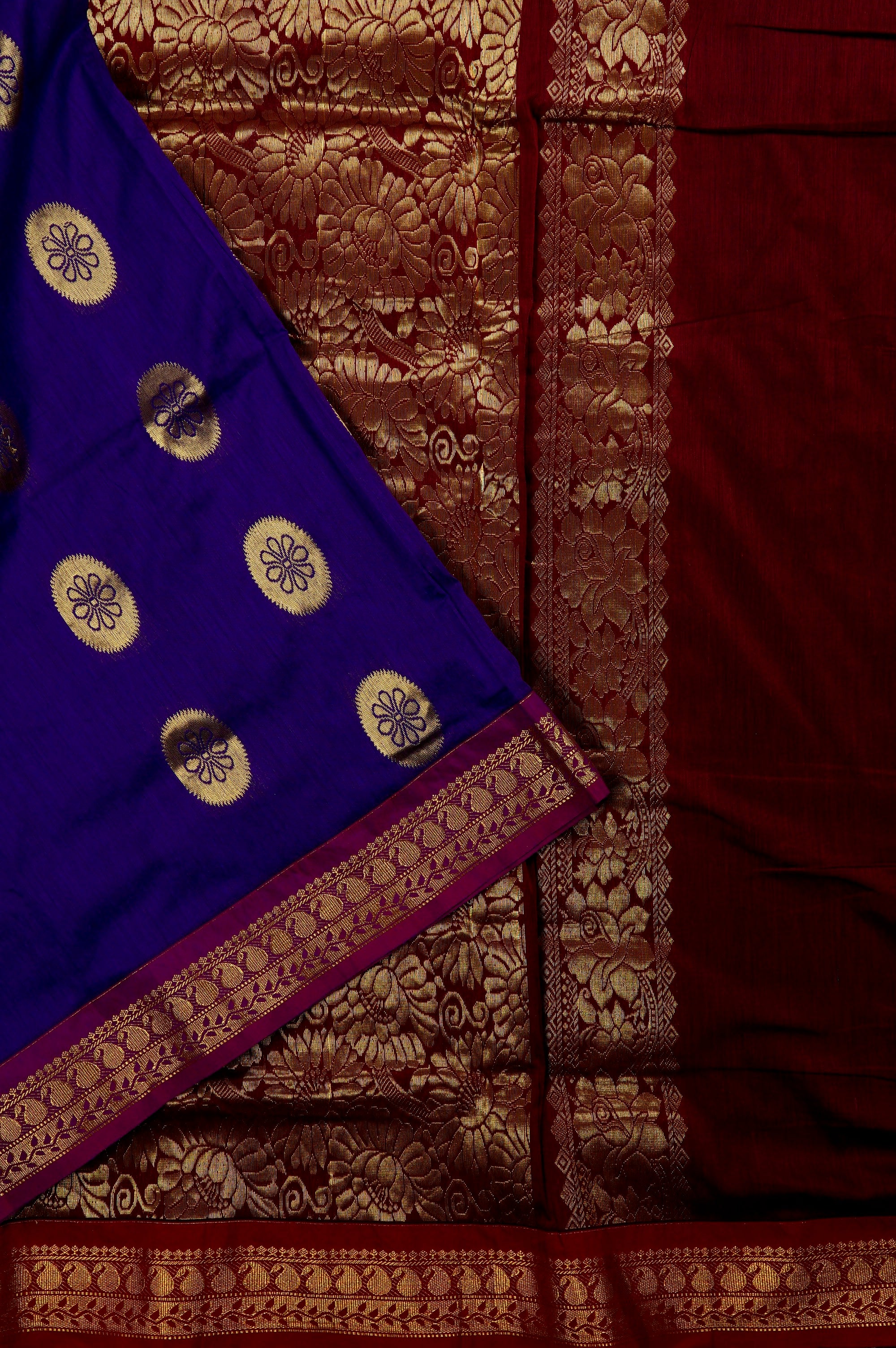 Previous NextDark indigo cotton saree with circle bhuttas woven throughout the body, with flowers woven within using the negative spaces in blue. The border has a blackberry base with a band of mango bhuttas and a band of a single creeping vine with leaves woven in gold zari. The pallu has a dark maroon base with a wide band filled with bold floral motifs woven in gold zari. The saree has a solid dark Indigo blouse with the same border.