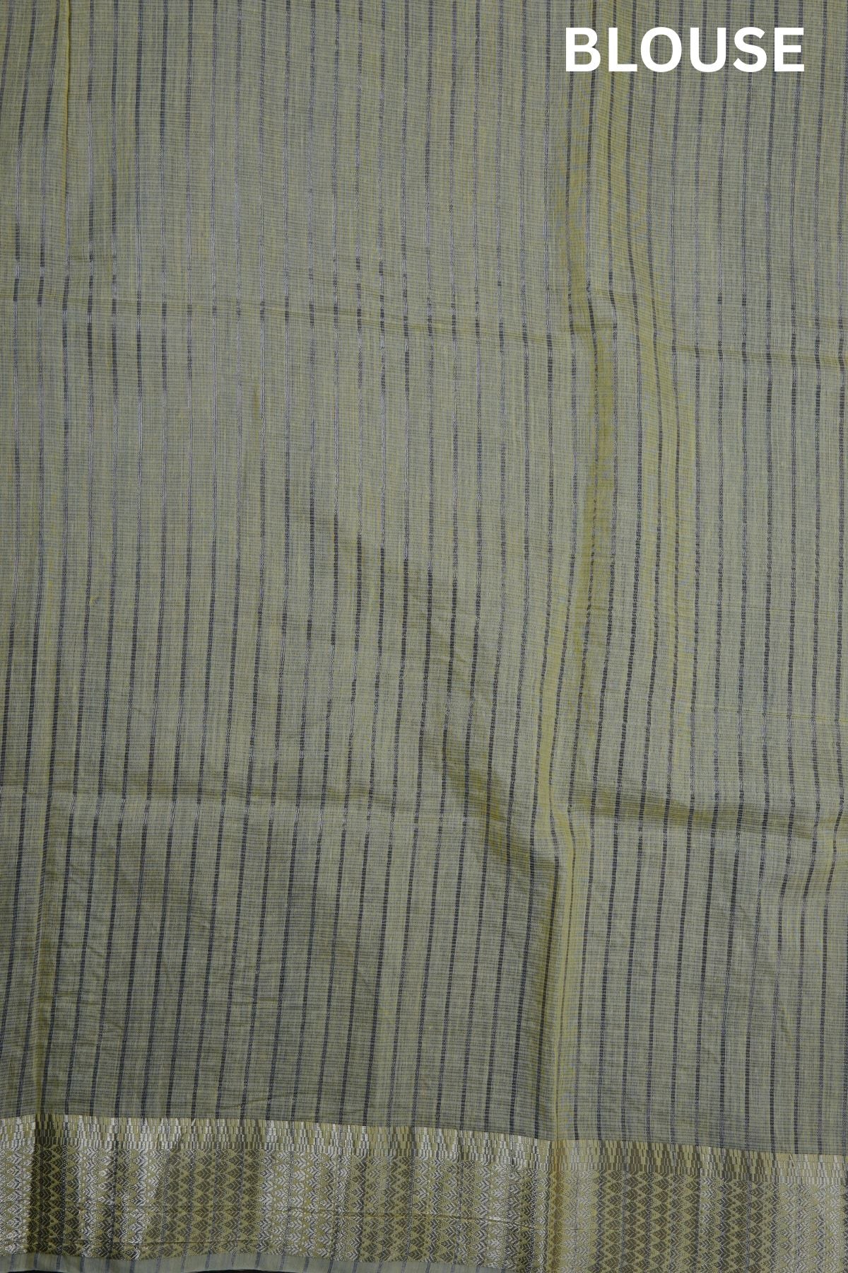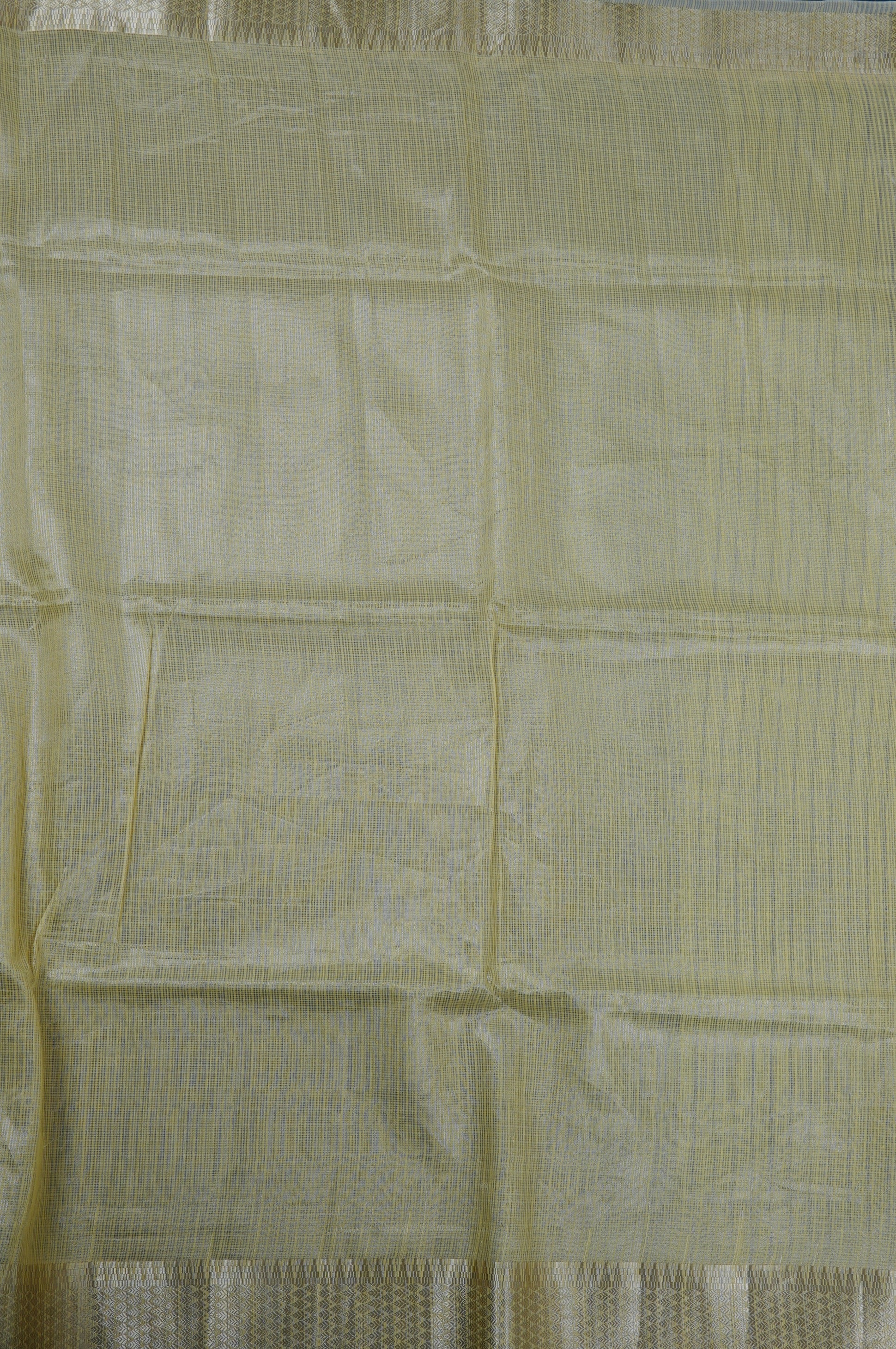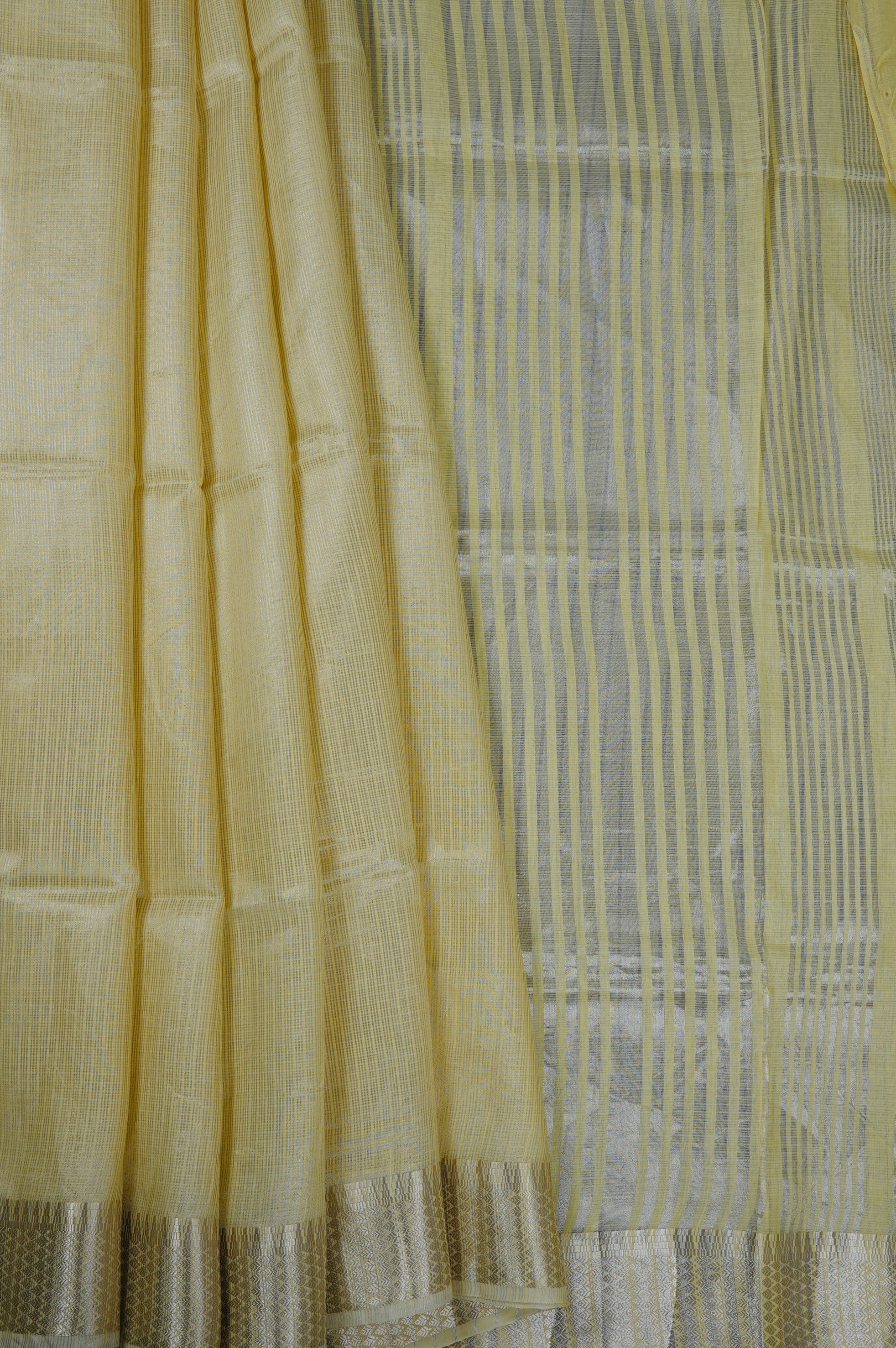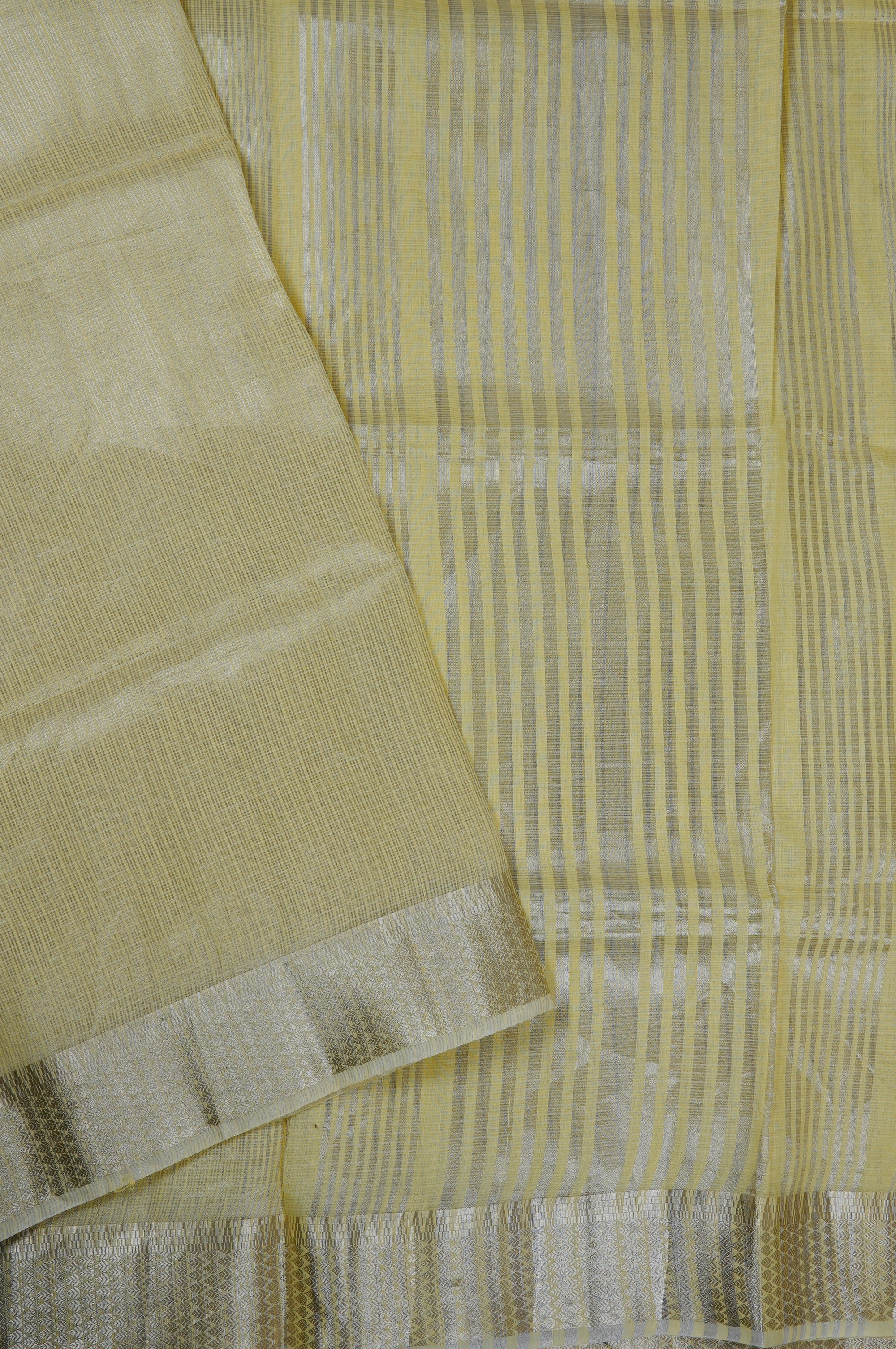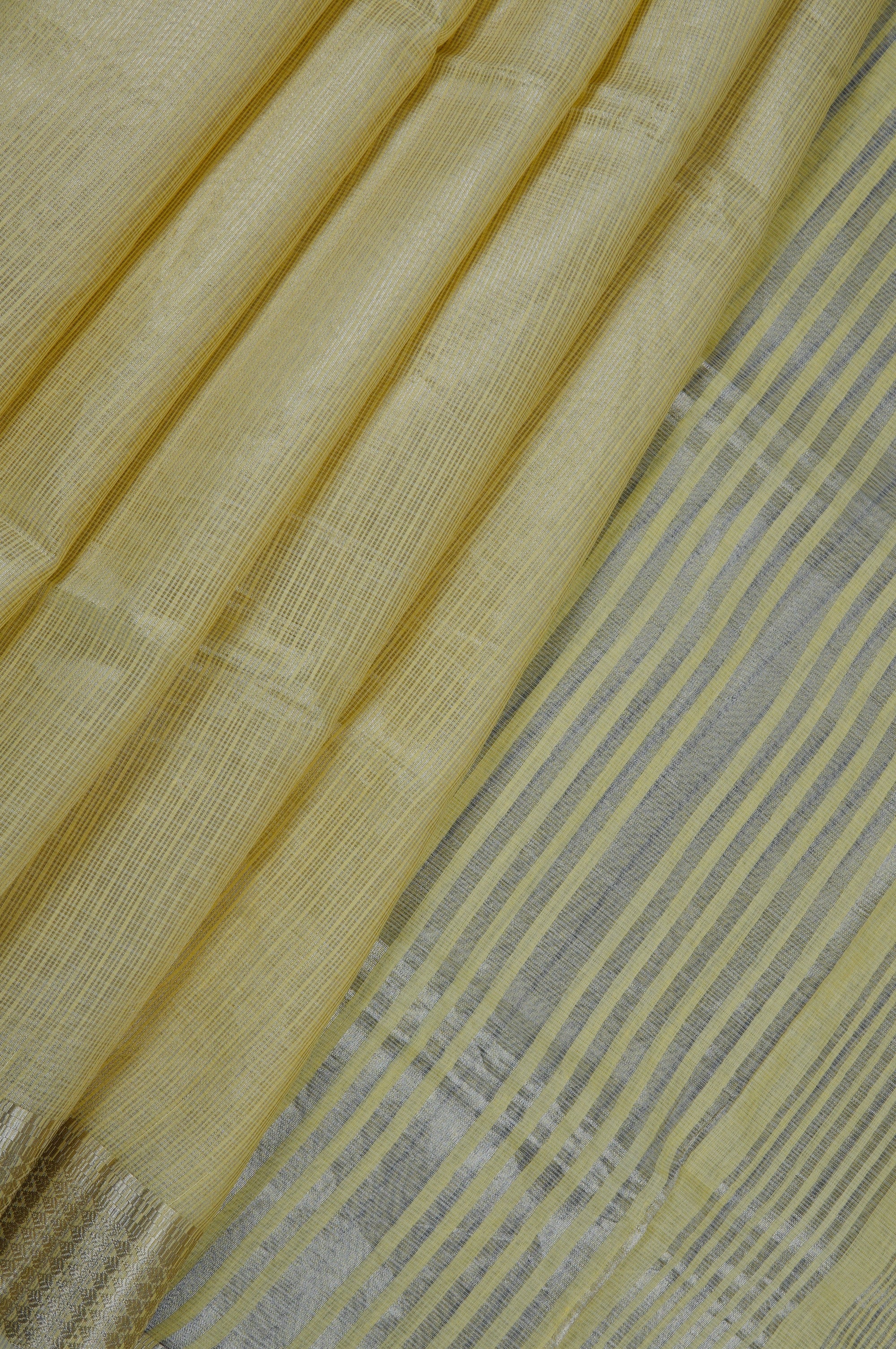 Previous NextDusty yellow semi Tussar saree with a simple zari border starting with recurring triangles, followed by horizontally woven petal motifs in silver zari. The pallu is a series of silver zari bands woven in different widths. The saree has a dusty yellow blouse with vertical silver zari stripes.