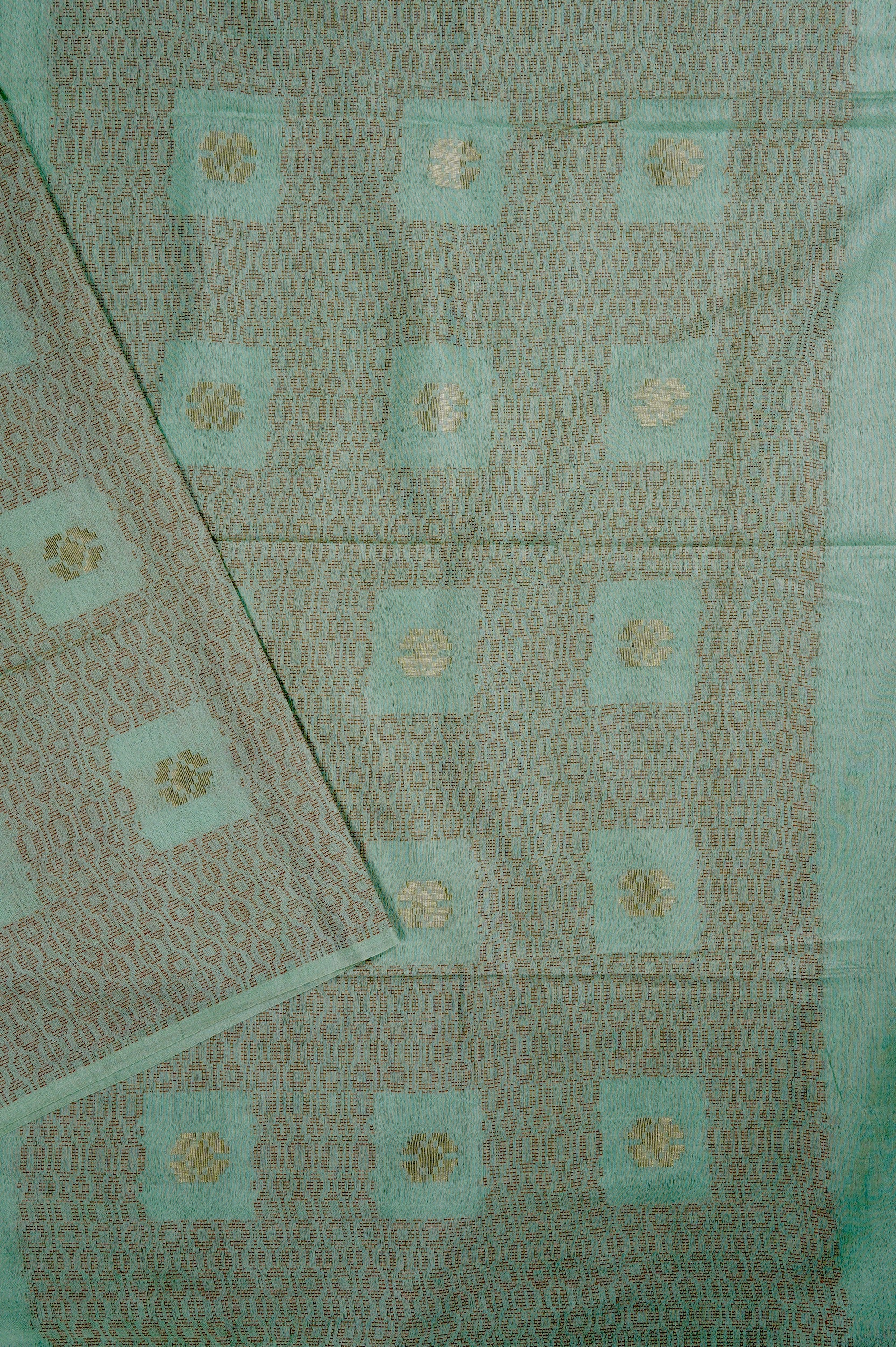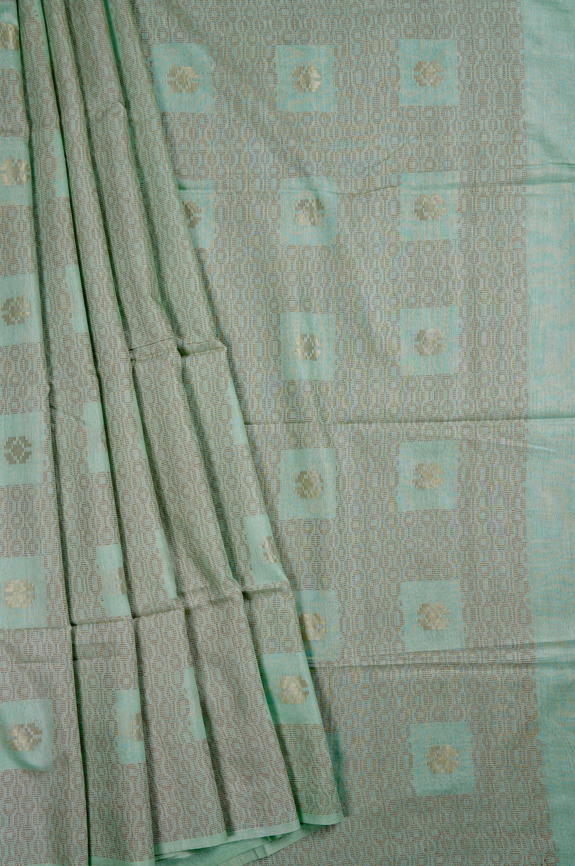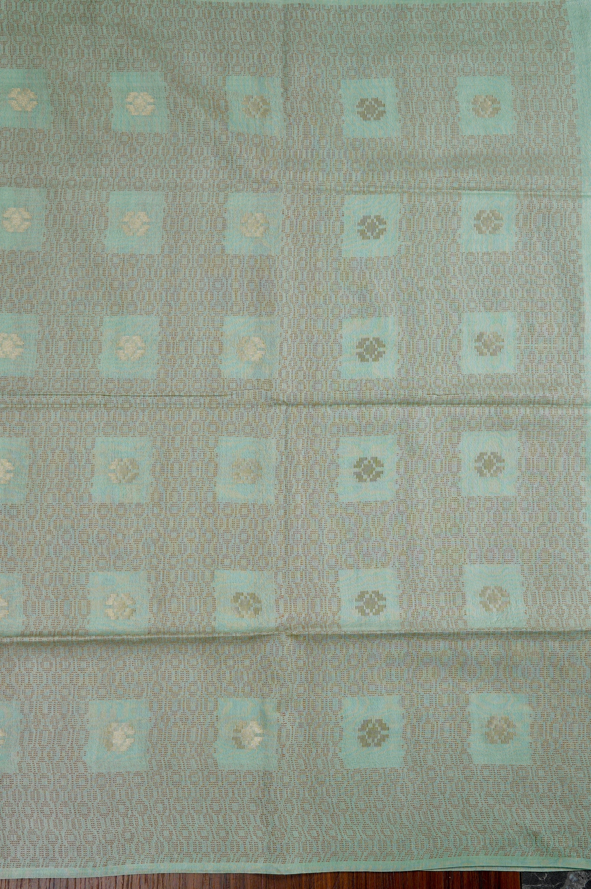 Previous NextAn eggshell blue semi jute saree oozing with a misty vibe filled with abstract geometric patterns woven in ochre with small square frames folding geometric octagonal motifs woven in gold zari. The pallu is an extension of the body, giving it a uniform look. The saree has a solid eggshell blue blouse.