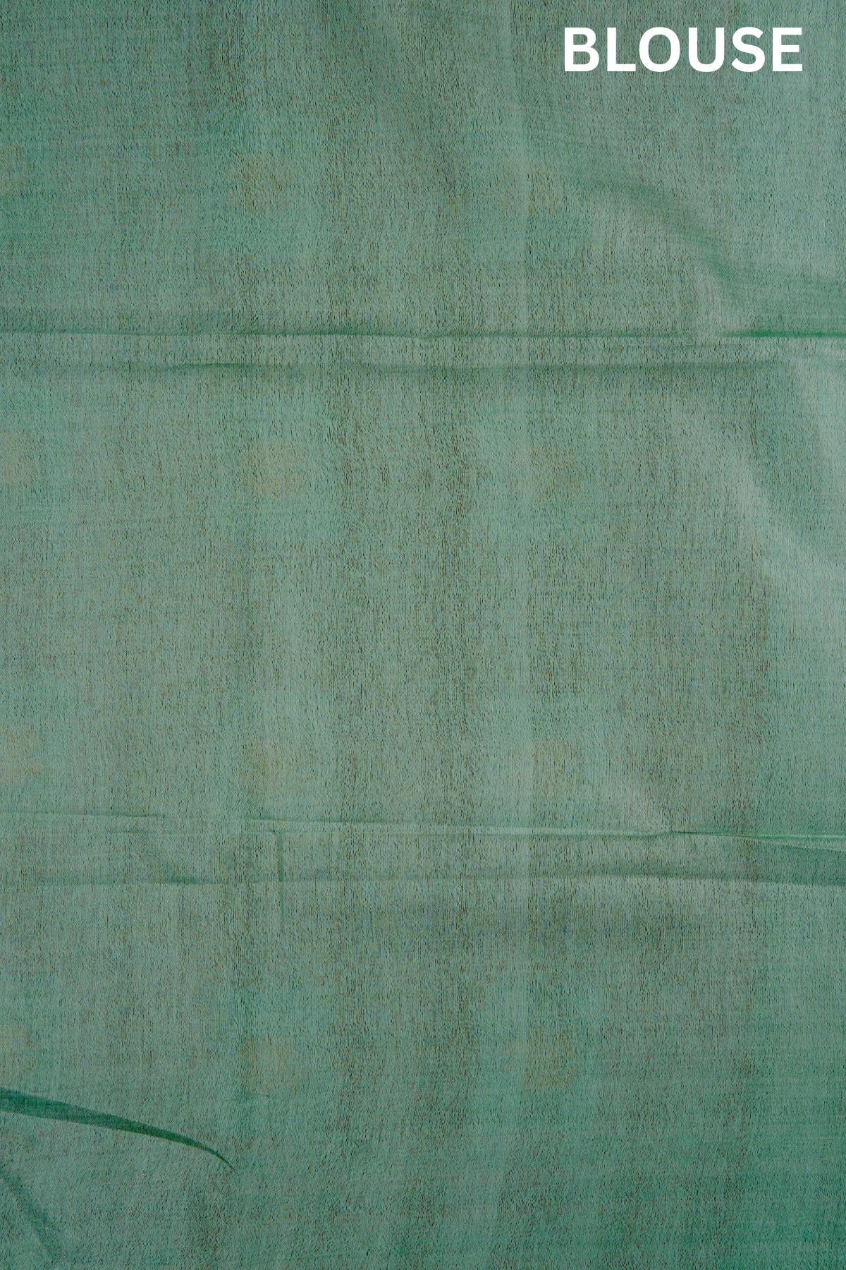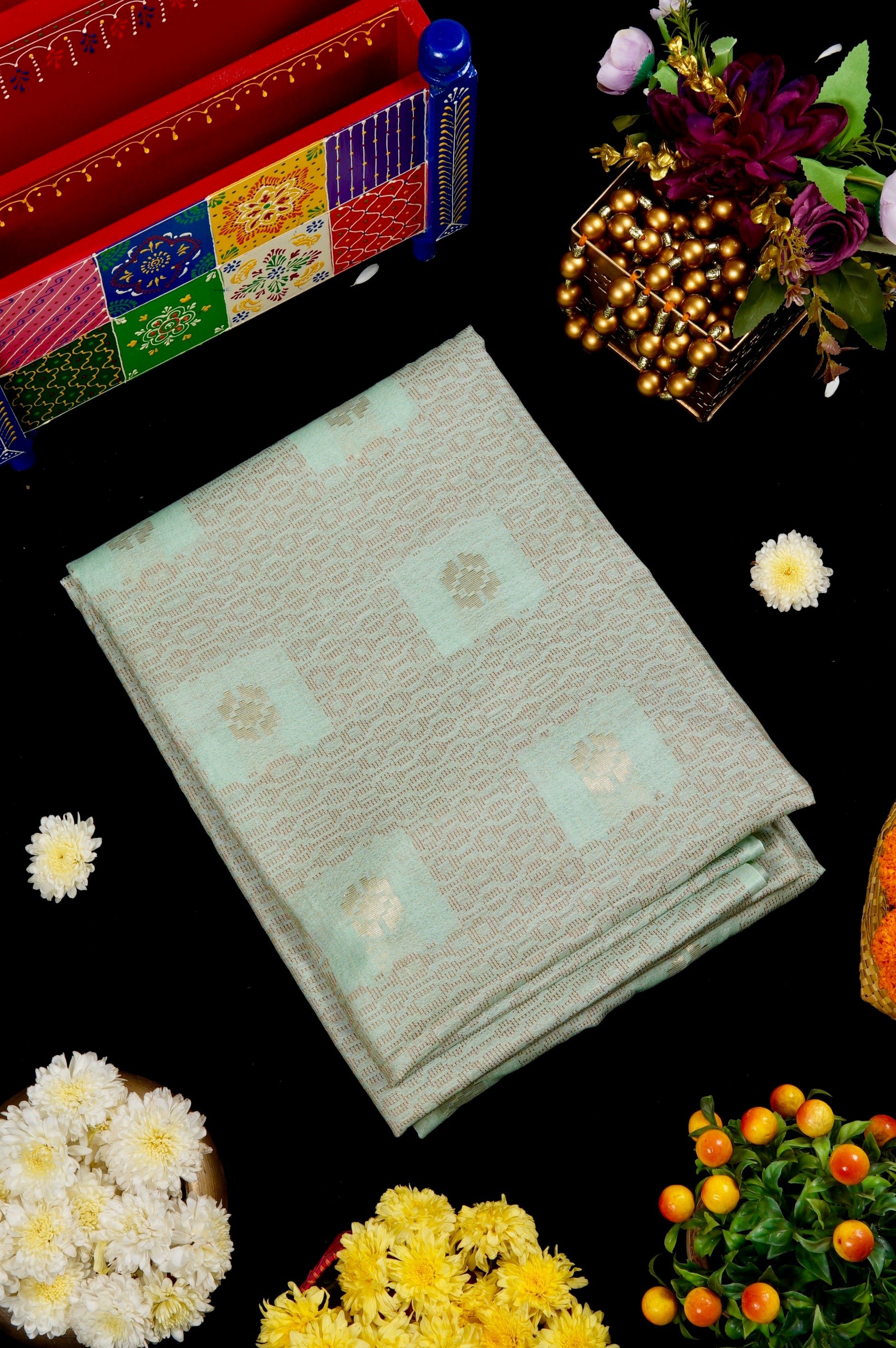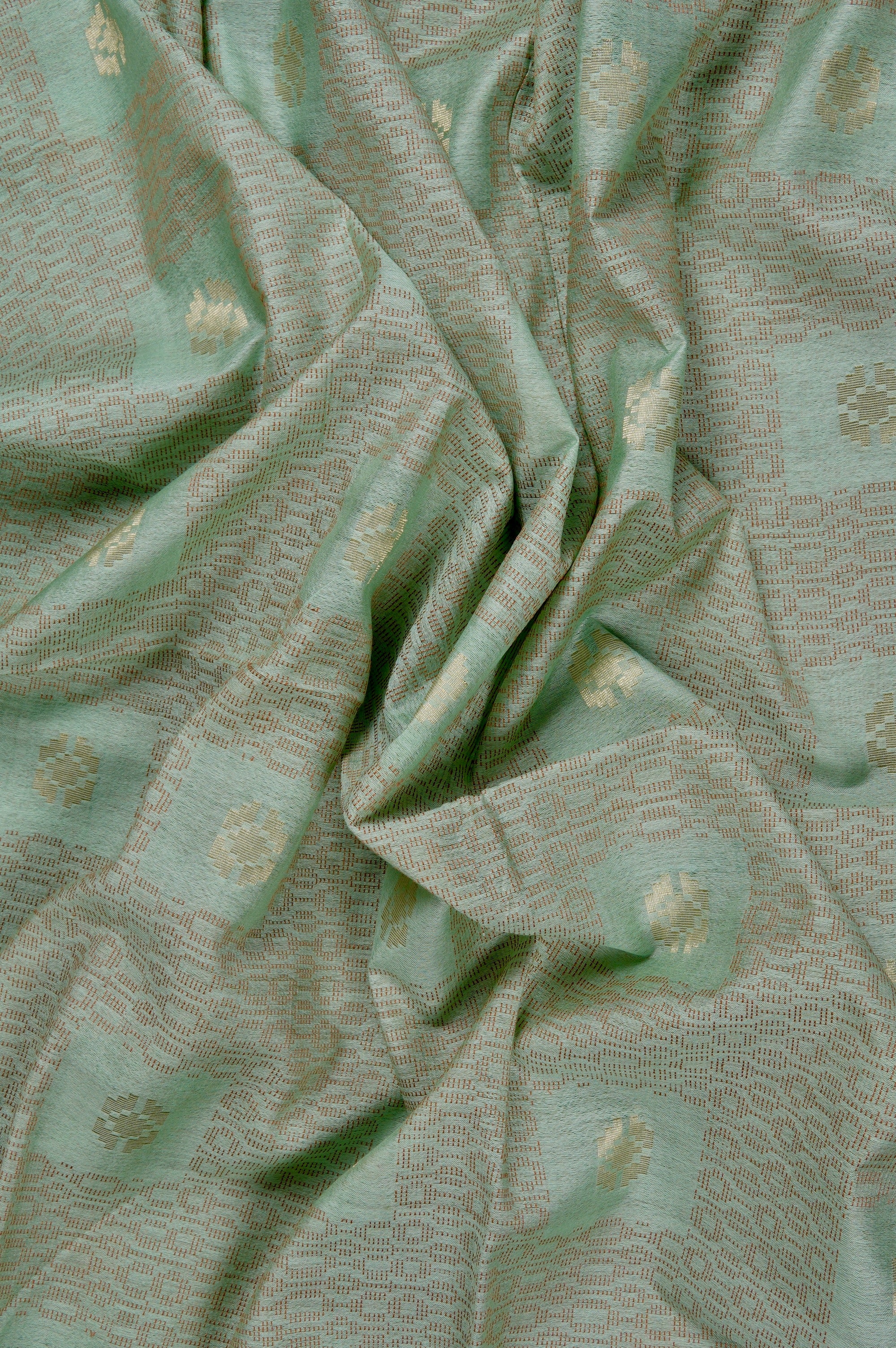 Previous NextAn eggshell blue semi jute saree oozing with a misty vibe filled with abstract geometric patterns woven in ochre with small square frames folding geometric octagonal motifs woven in gold zari. The pallu is an extension of the body, giving it a uniform look. The saree has a solid eggshell blue blouse.