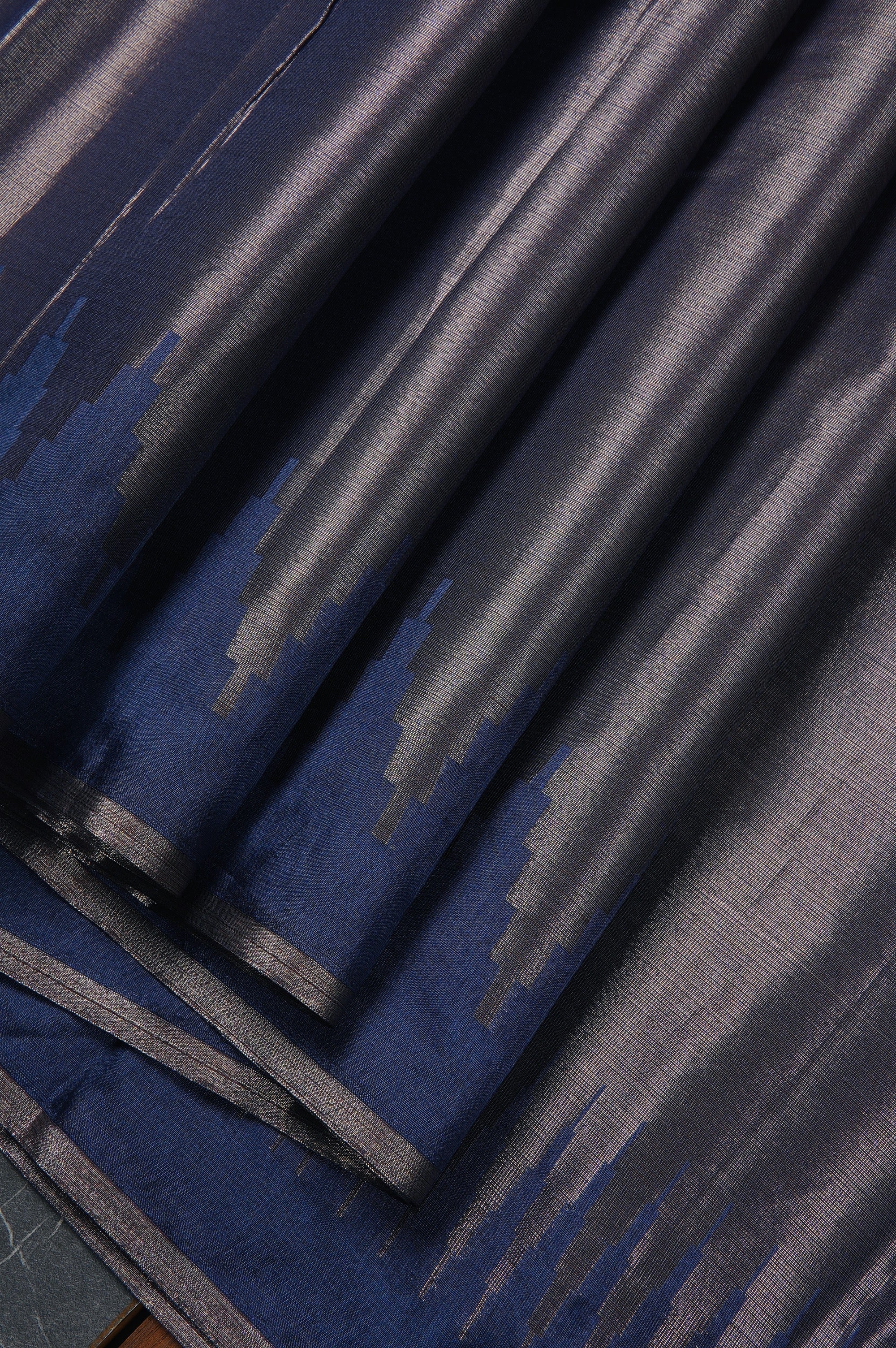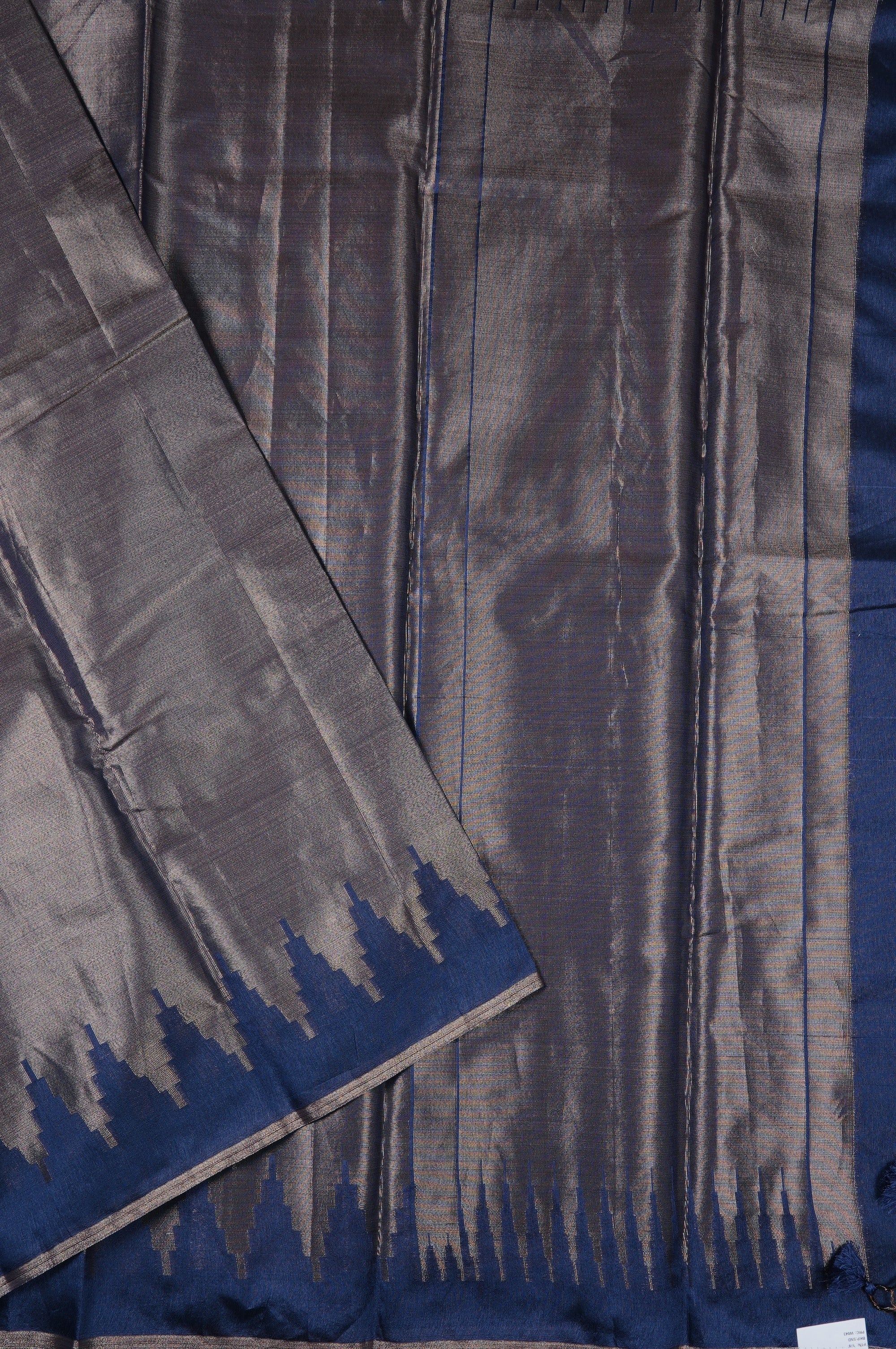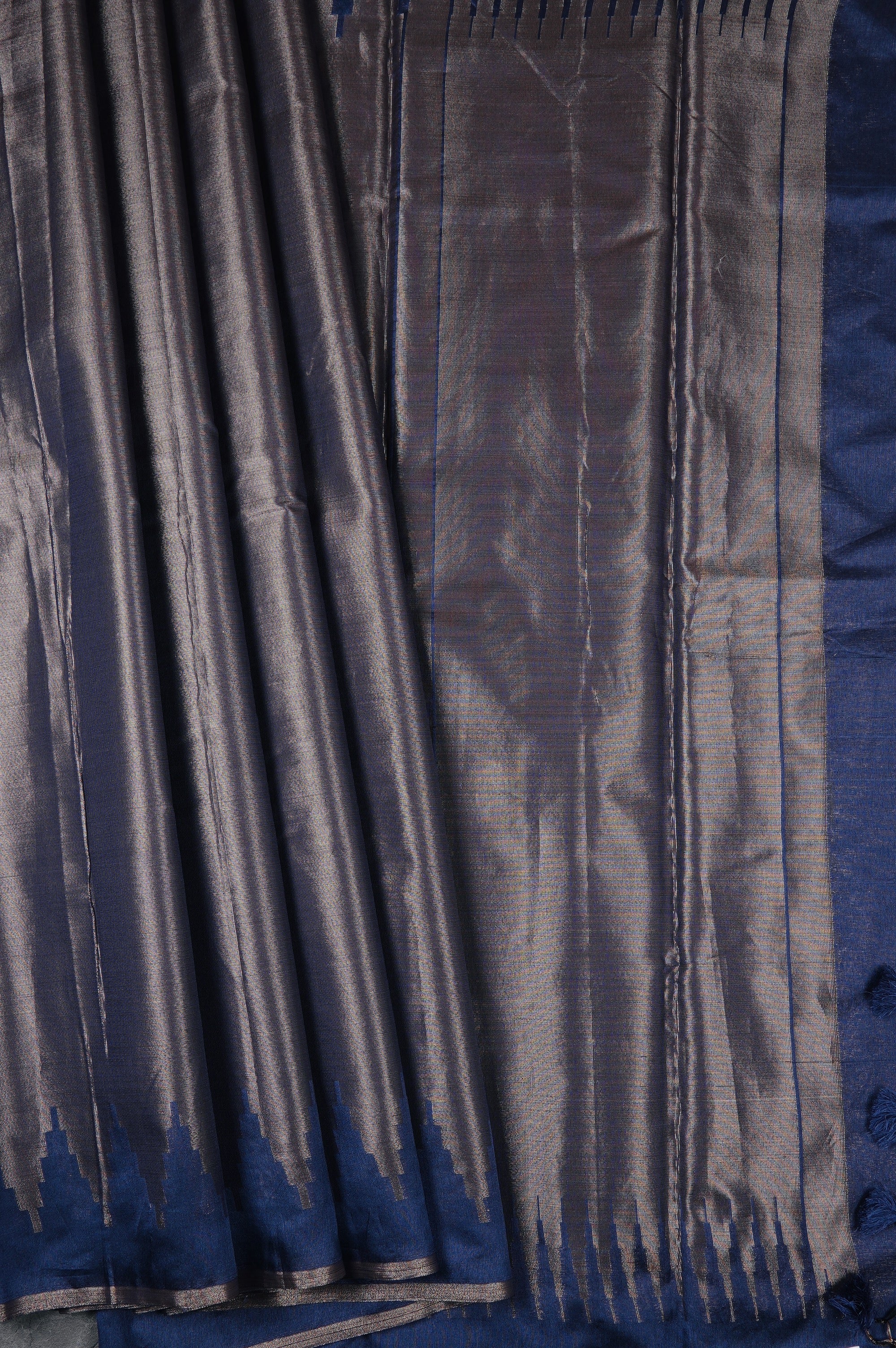 Previous NextFossil semi tussar saree with the whole body as a solid expanse of silver zari with estate blue border created by temple reks pattern from the body. The pallu is an extension of the body with thinner temple reks border in estate blue shade. The saree has an estate blue blouse with intricately woven zari threads making it almost look like a dual shade blouse.