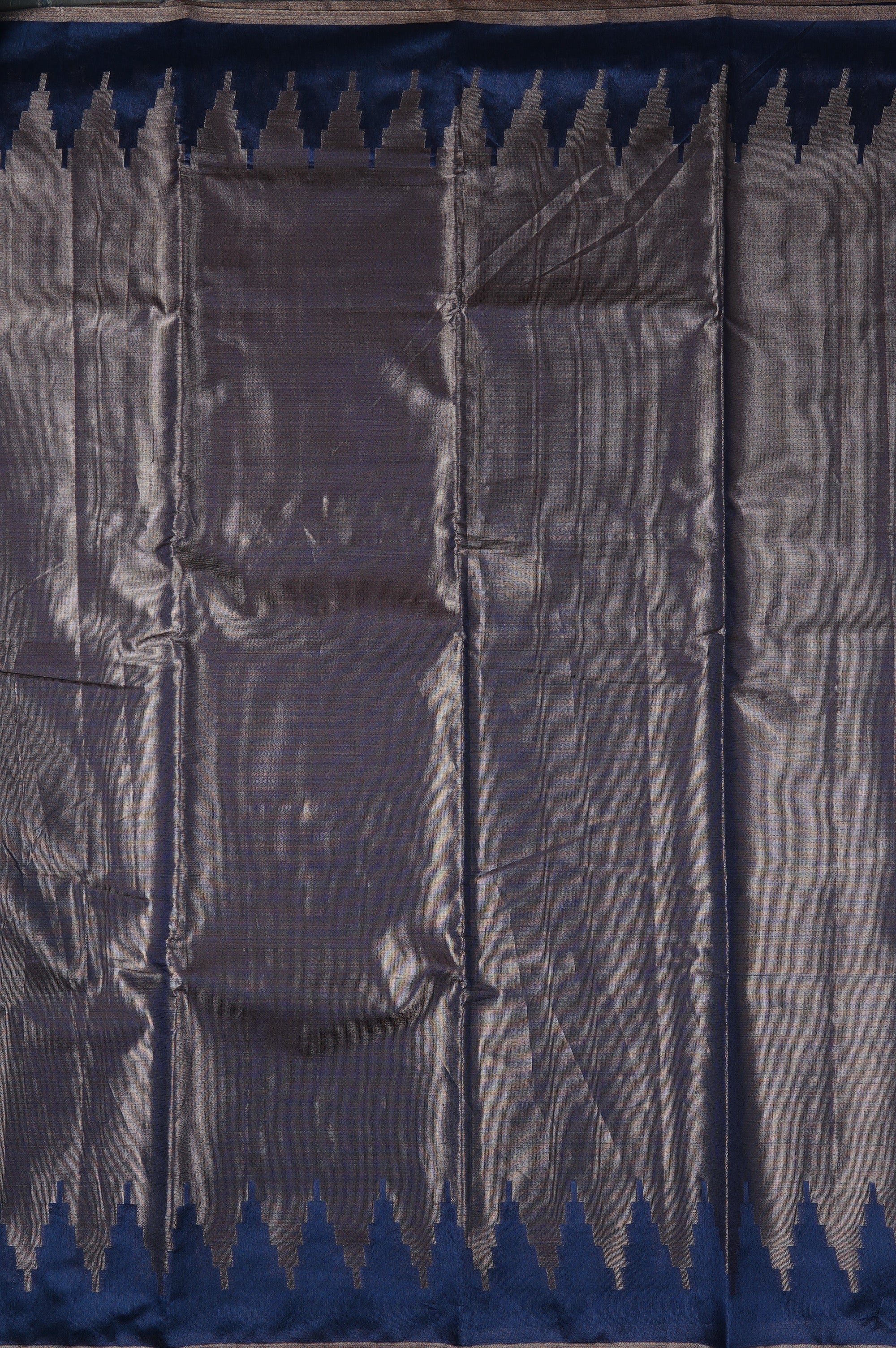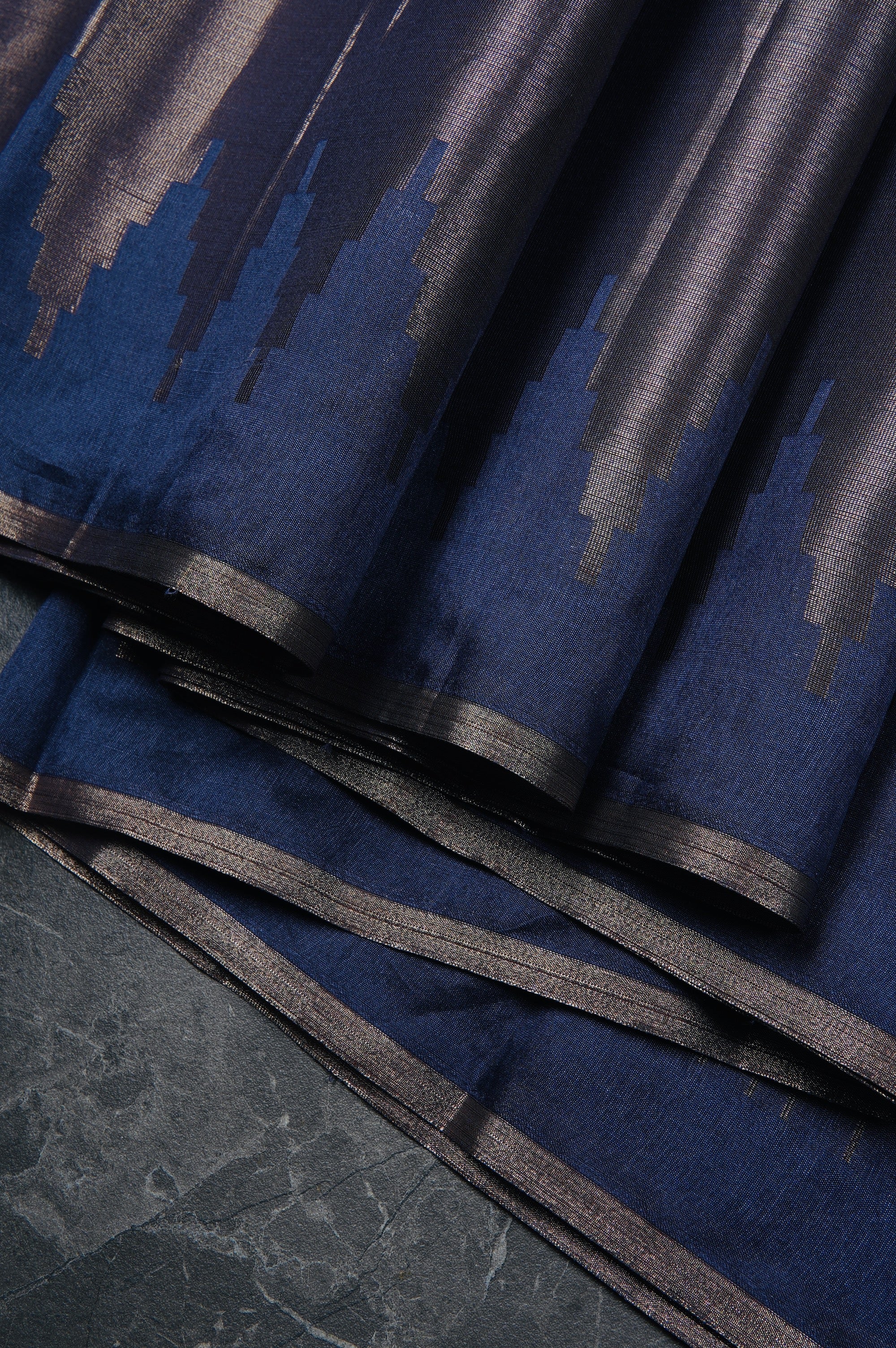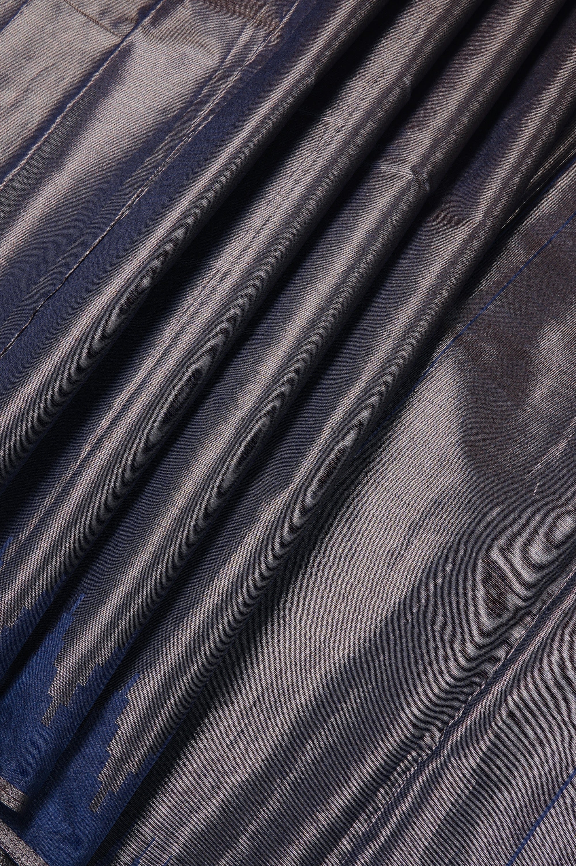 Previous NextFossil semi tussar saree with the whole body as a solid expanse of silver zari with estate blue border created by temple reks pattern from the body. The pallu is an extension of the body with thinner temple reks border in estate blue shade. The saree has an estate blue blouse with intricately woven zari threads making it almost look like a dual shade blouse.