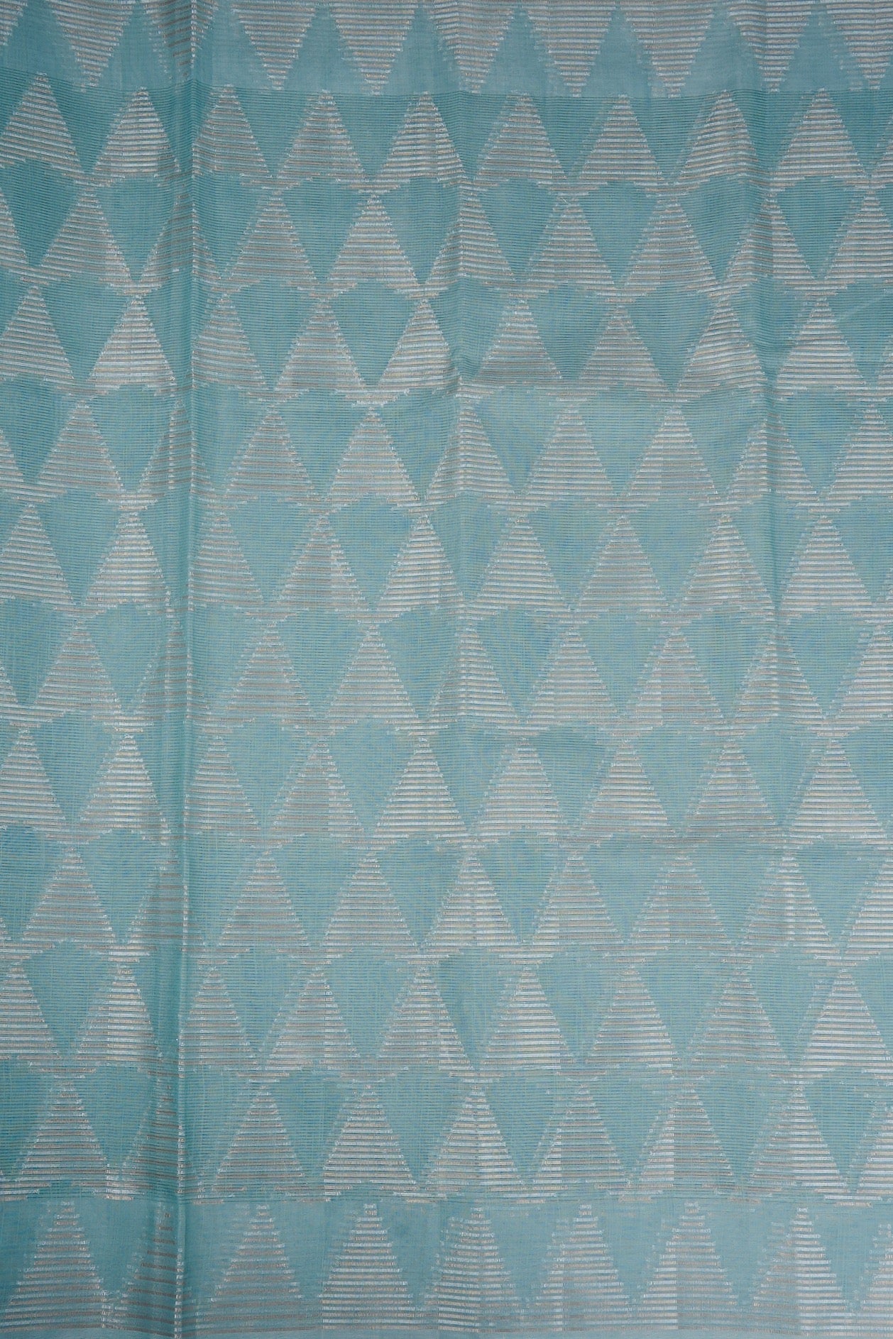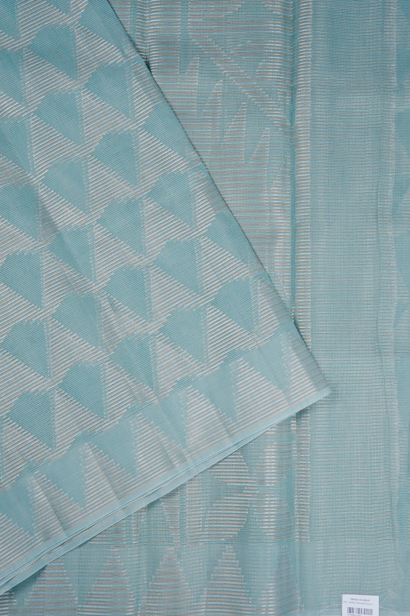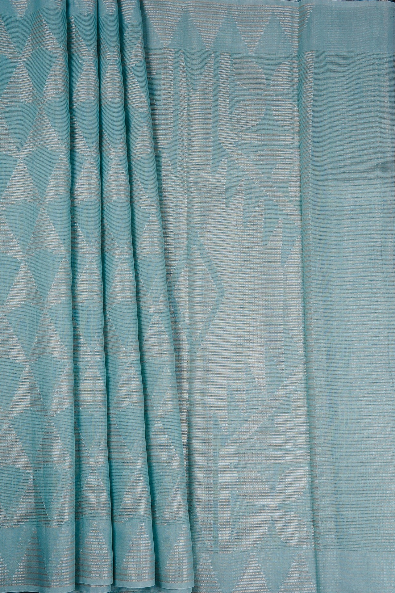 Ice blue semi silk cotton saree with arrow motifs woven alternatively in gold and silver threads. The pallu has an elaborate diamond motif bordered by stylised diamond borders and surrounded by broad floral motifs woven in silver and gold zari. The saree has an ice blue blouse with horizontal zari lines woven alternatively in silver and gold.