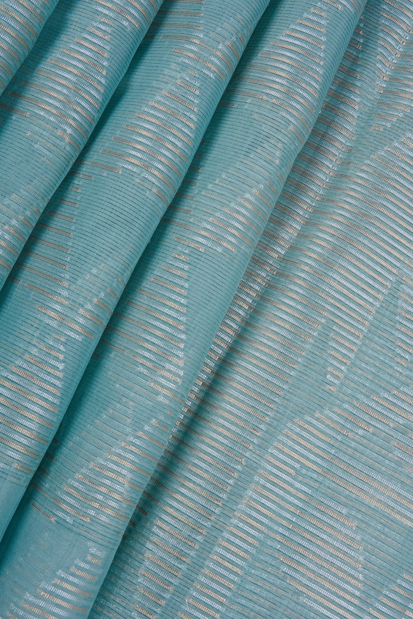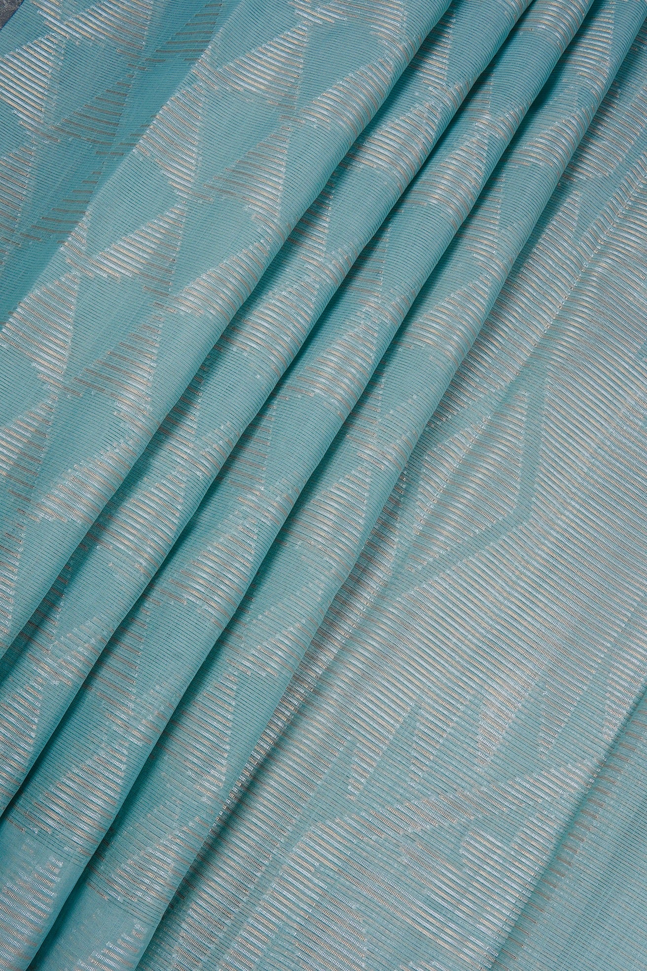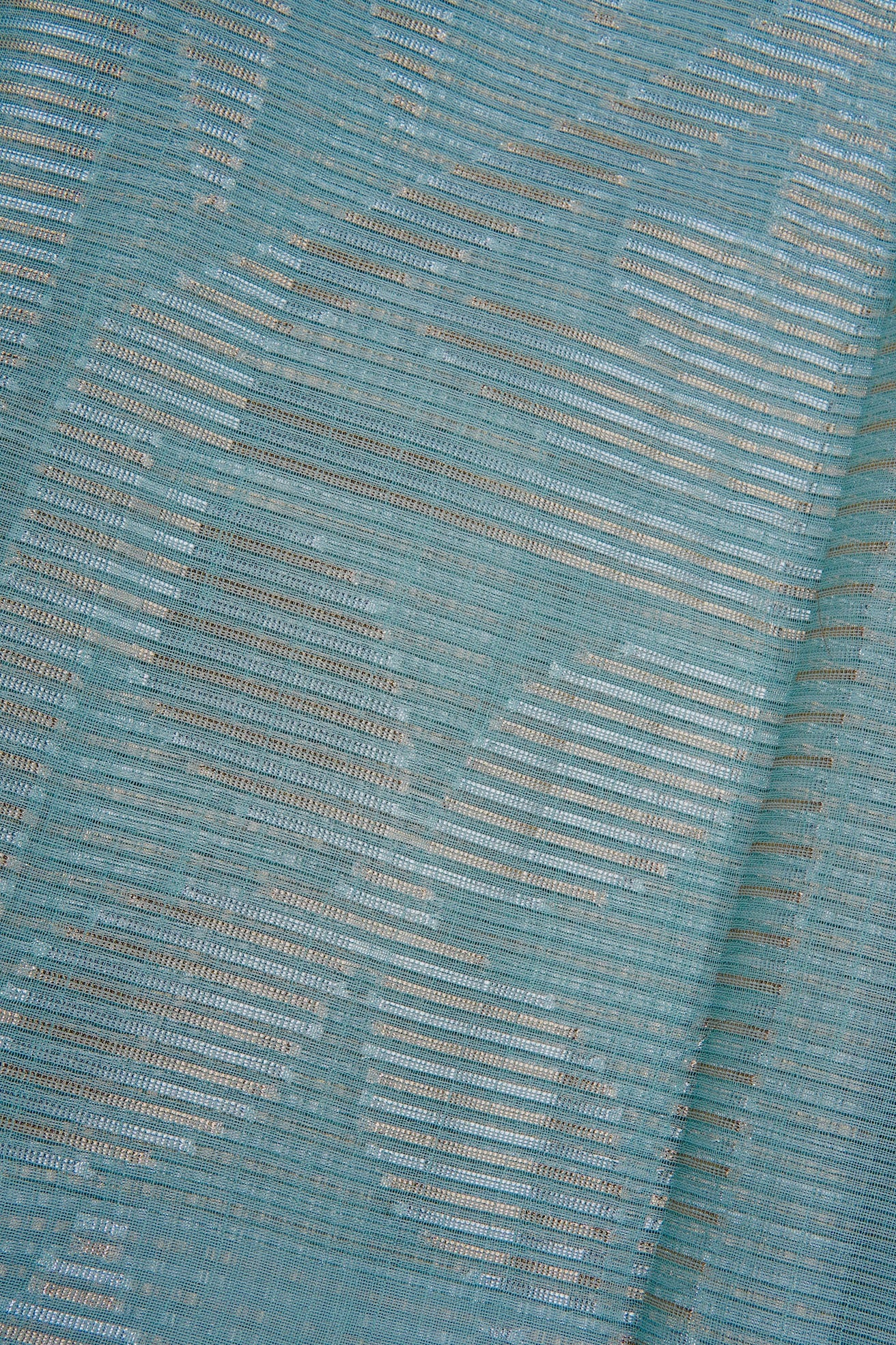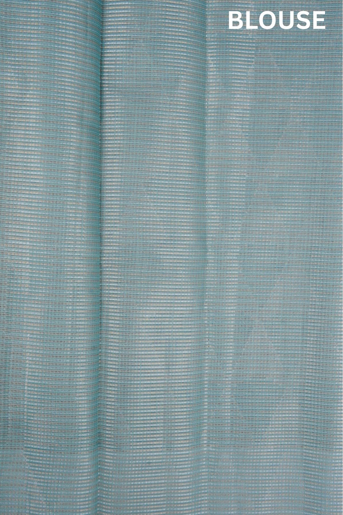 Ice blue semi silk cotton saree with arrow motifs woven alternatively in gold and silver threads. The pallu has an elaborate diamond motif bordered by stylised diamond borders and surrounded by broad floral motifs woven in silver and gold zari. The saree has an ice blue blouse with horizontal zari lines woven alternatively in silver and gold.