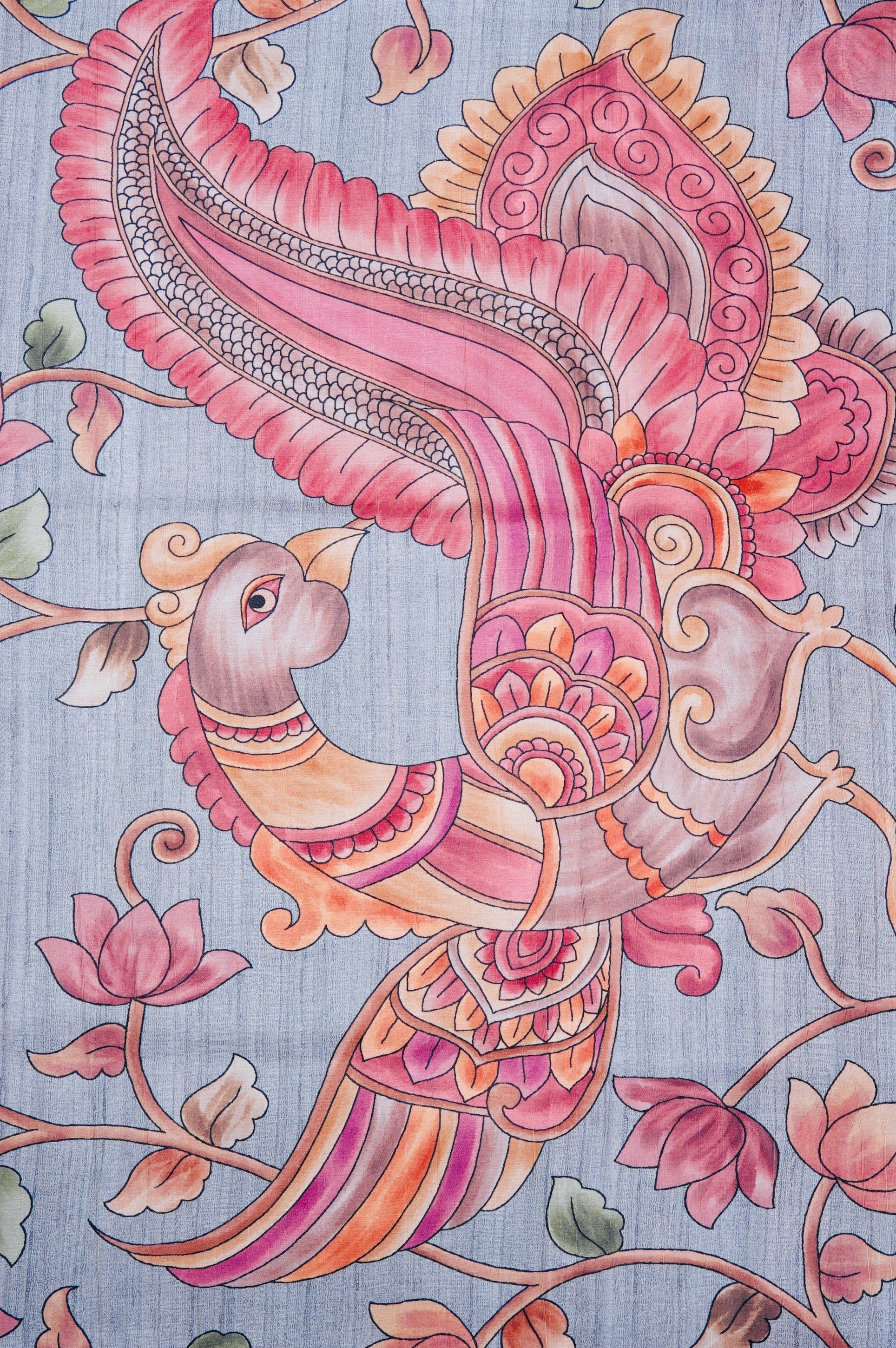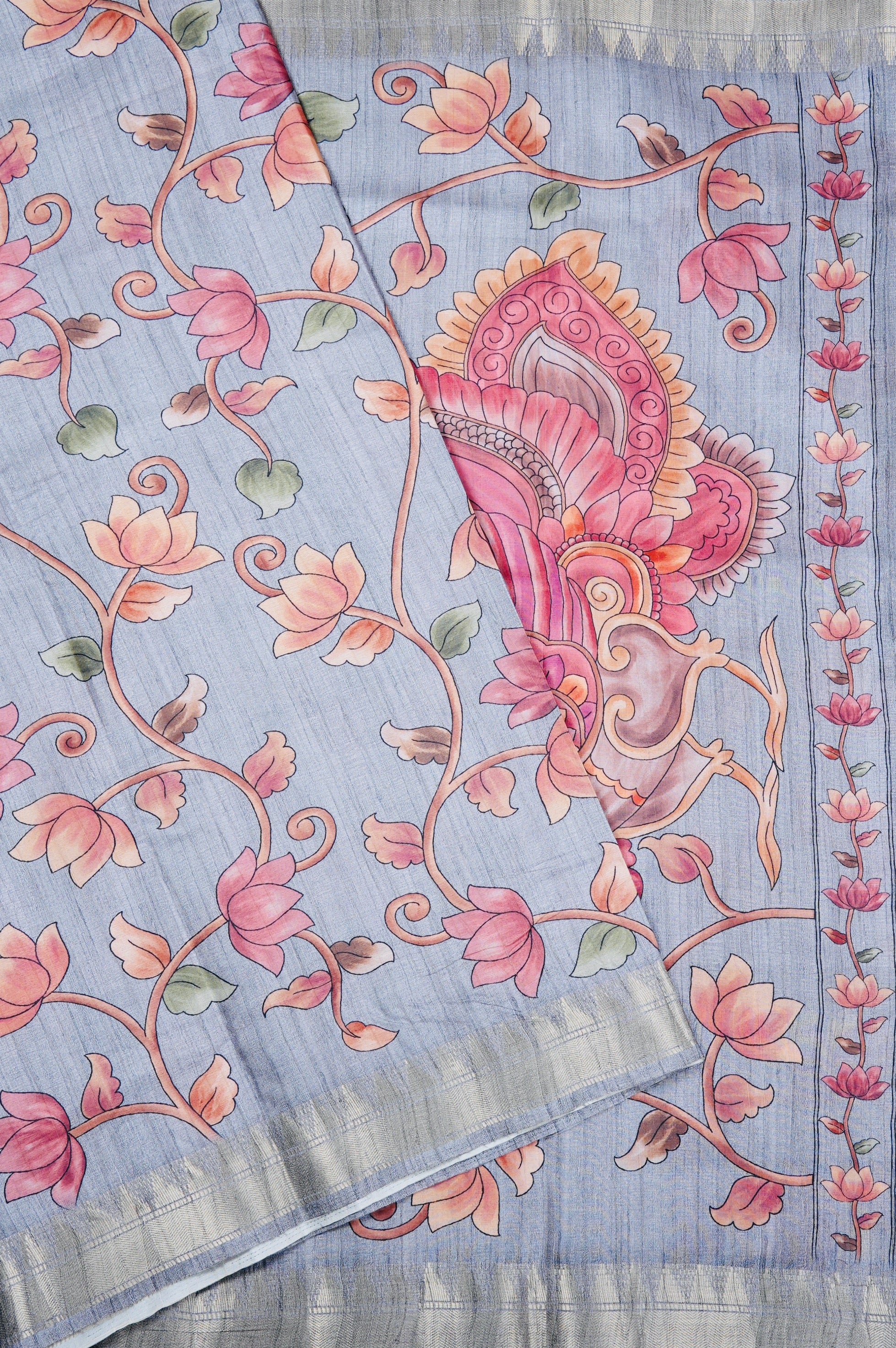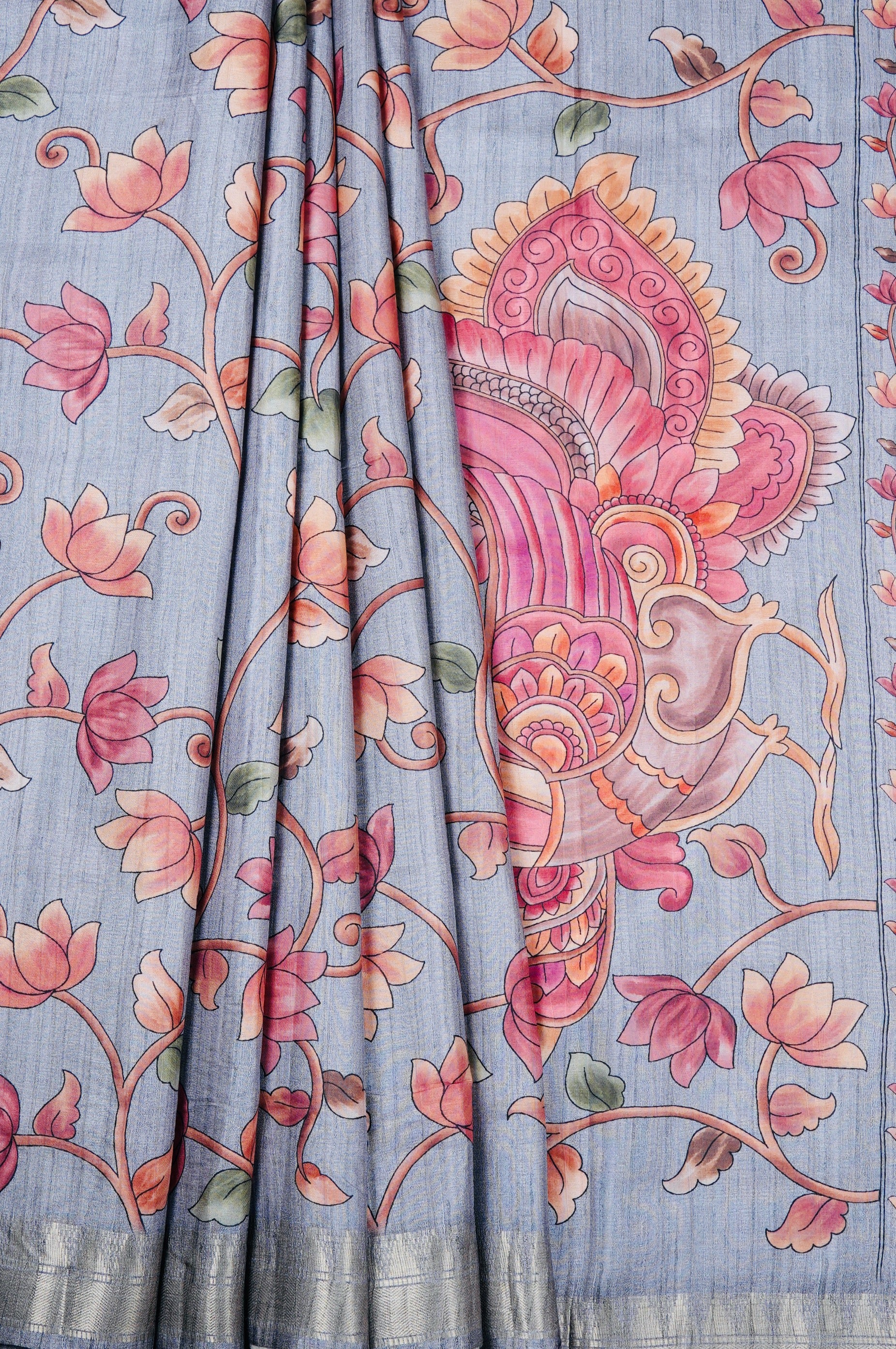 Previous NextKentucky blue semi tussar saree with Kalamkari inspired floral patterns in salmon, green and brown outlined in black, with a simple gold zari border that starts with temple reks pattern followed by simple bands of zari. The pallu has a massive peacock motif beautifull placed among the florals in complementing colors. The saree has a plain Kentucky blue blouse with the same border.