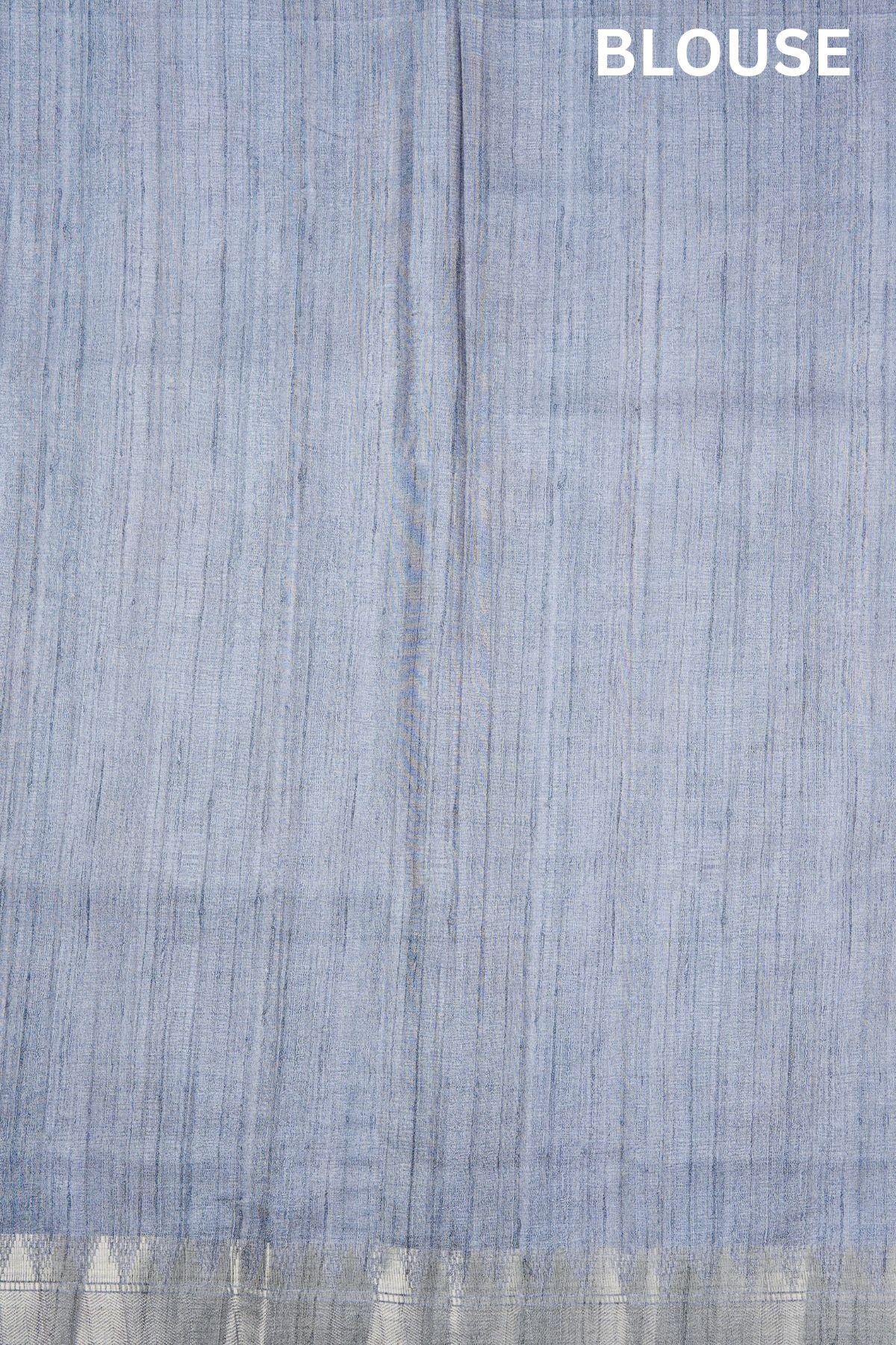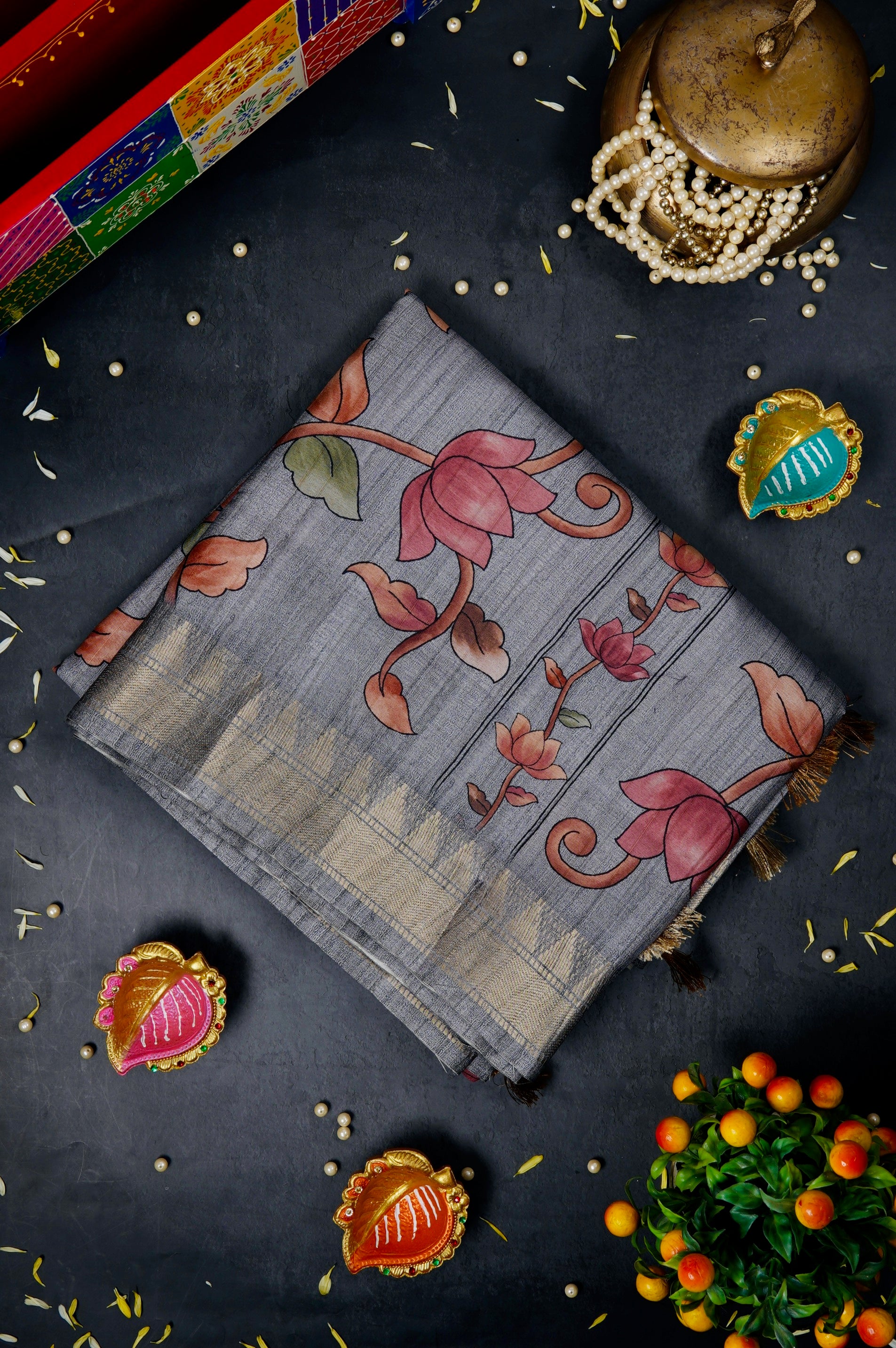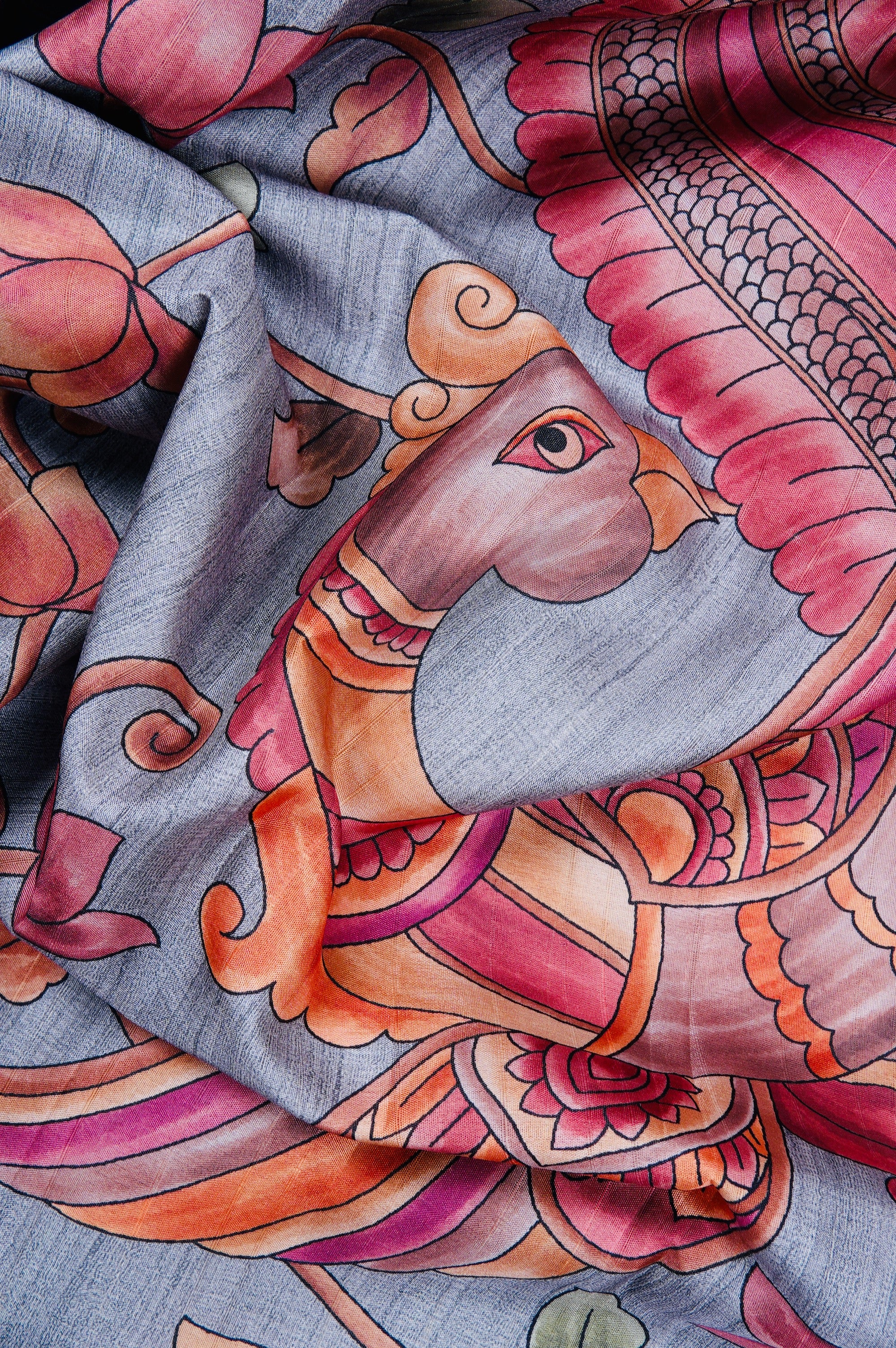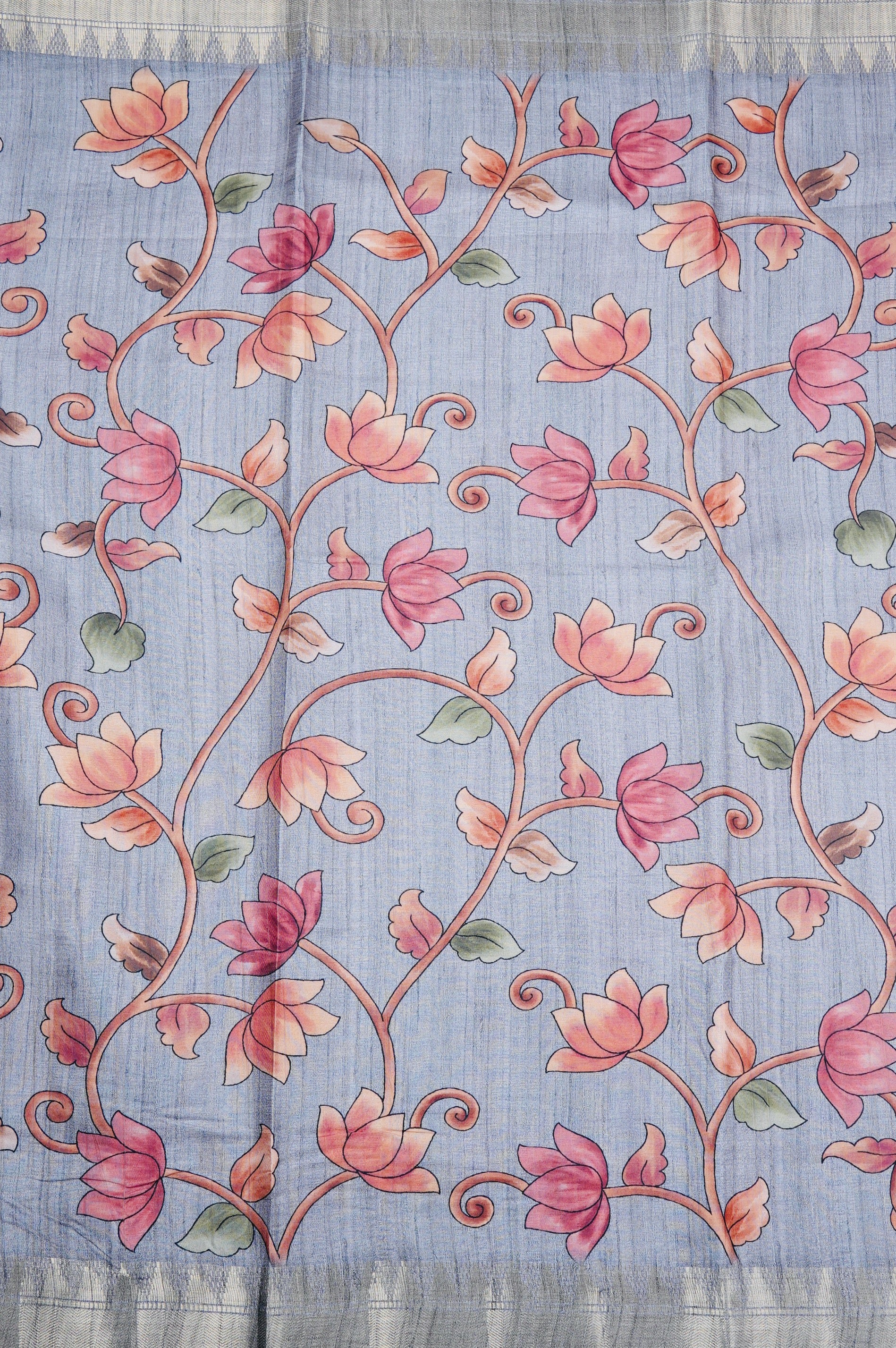 Previous NextKentucky blue semi tussar saree with Kalamkari inspired floral patterns in salmon, green and brown outlined in black, with a simple gold zari border that starts with temple reks pattern followed by simple bands of zari. The pallu has a massive peacock motif beautifull placed among the florals in complementing colors. The saree has a plain Kentucky blue blouse with the same border.