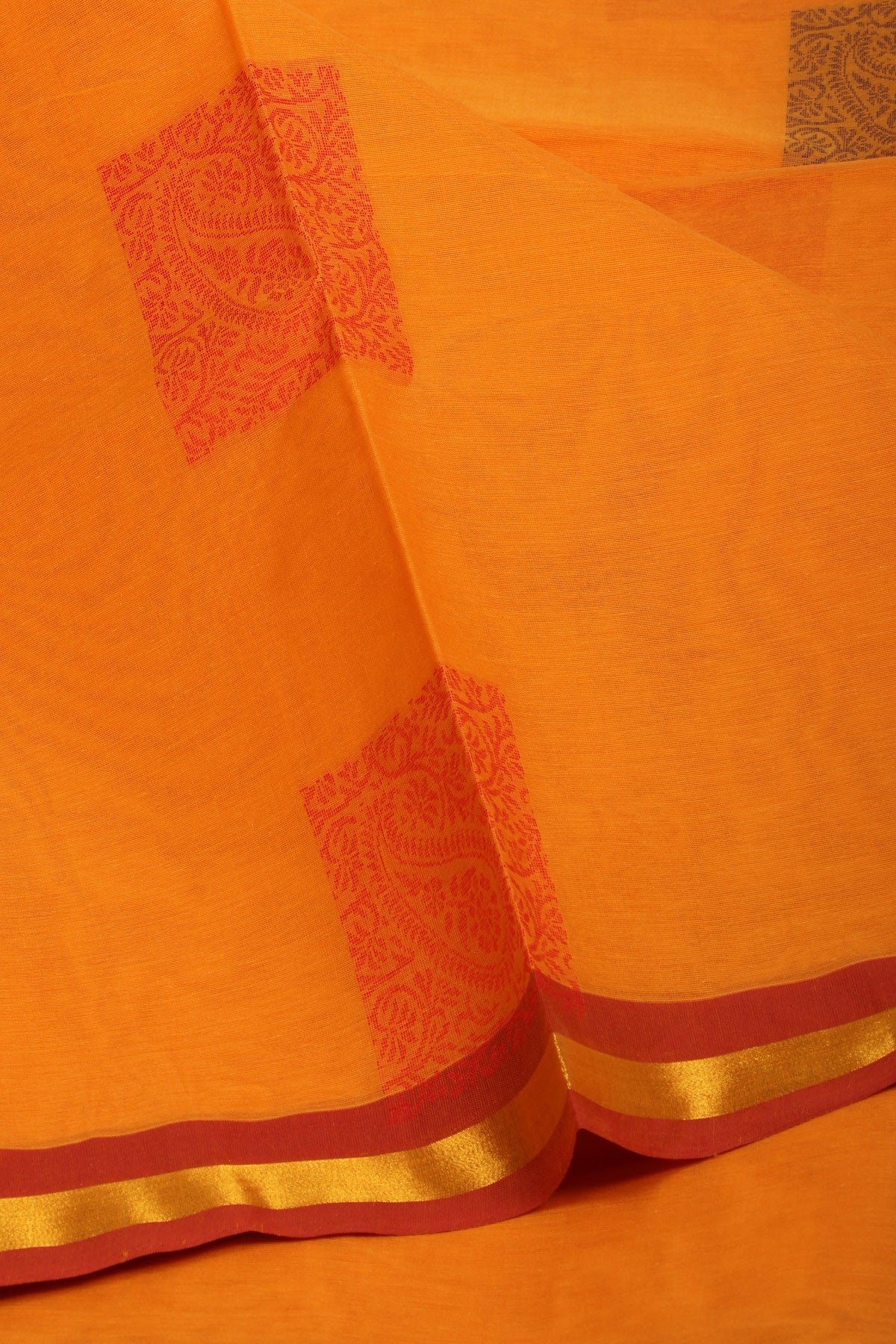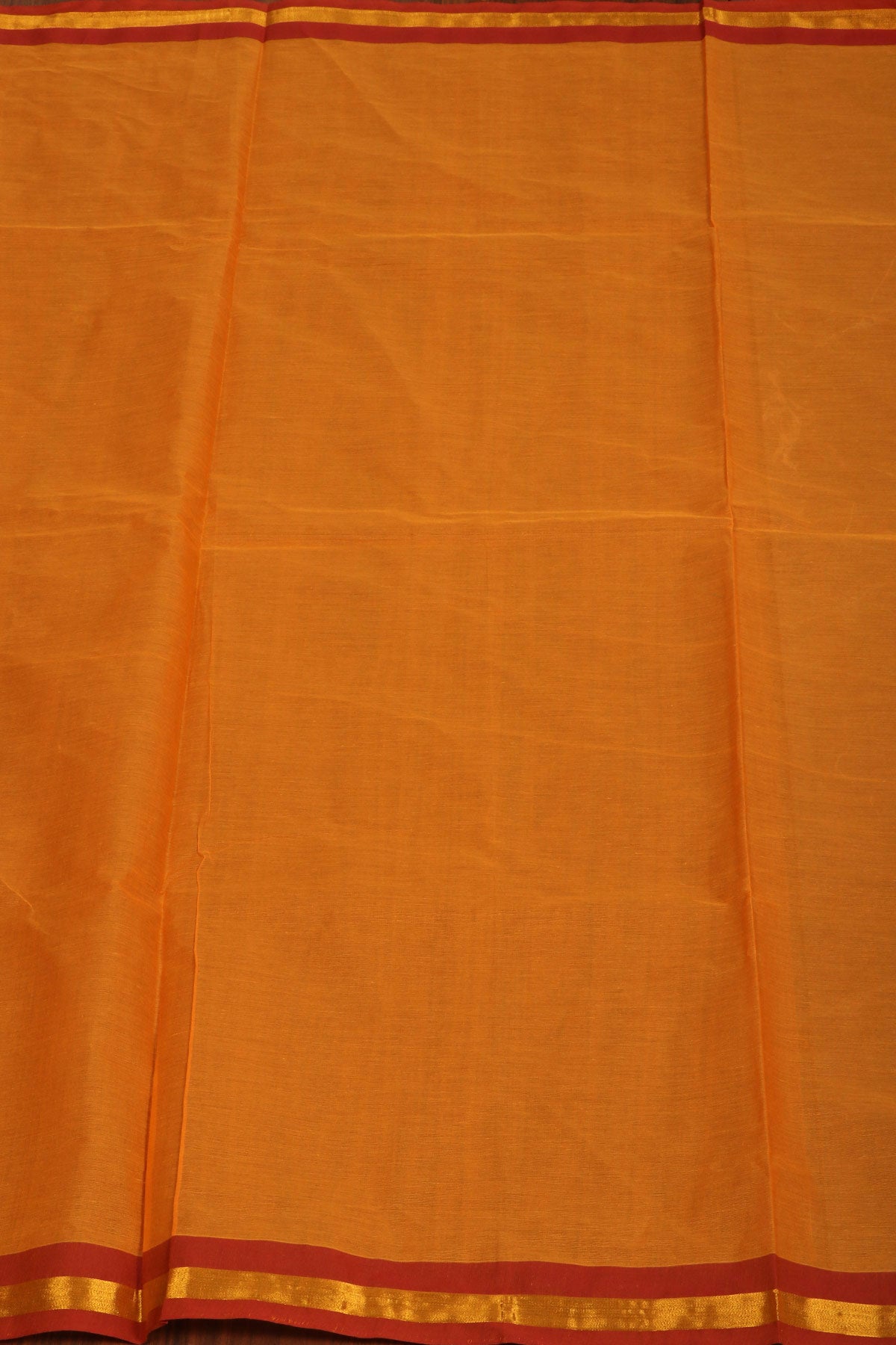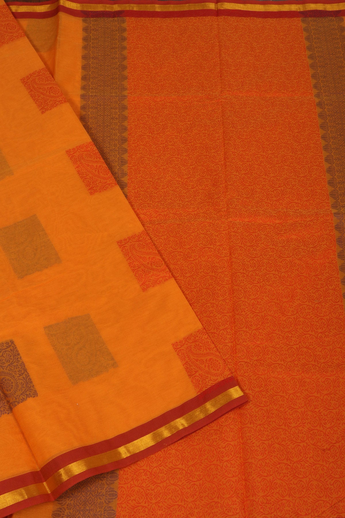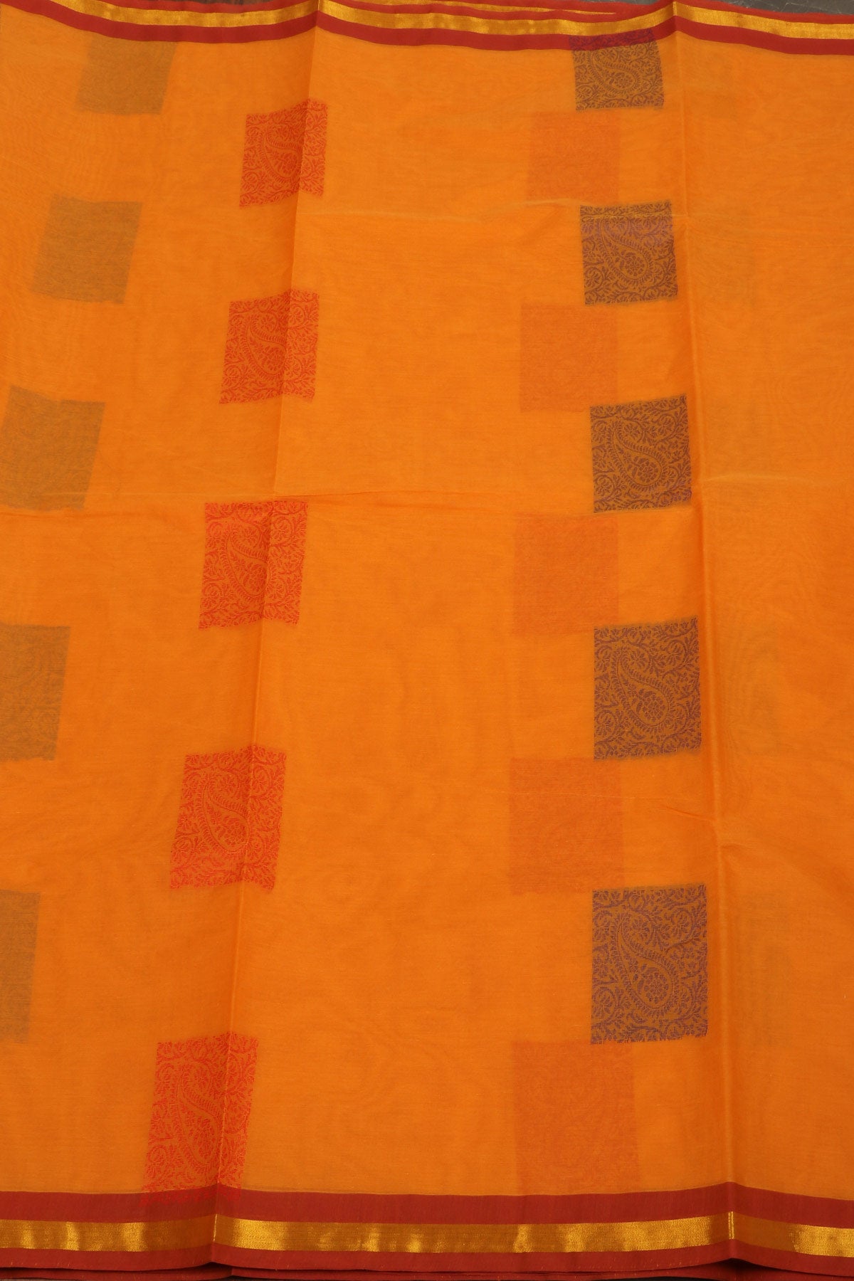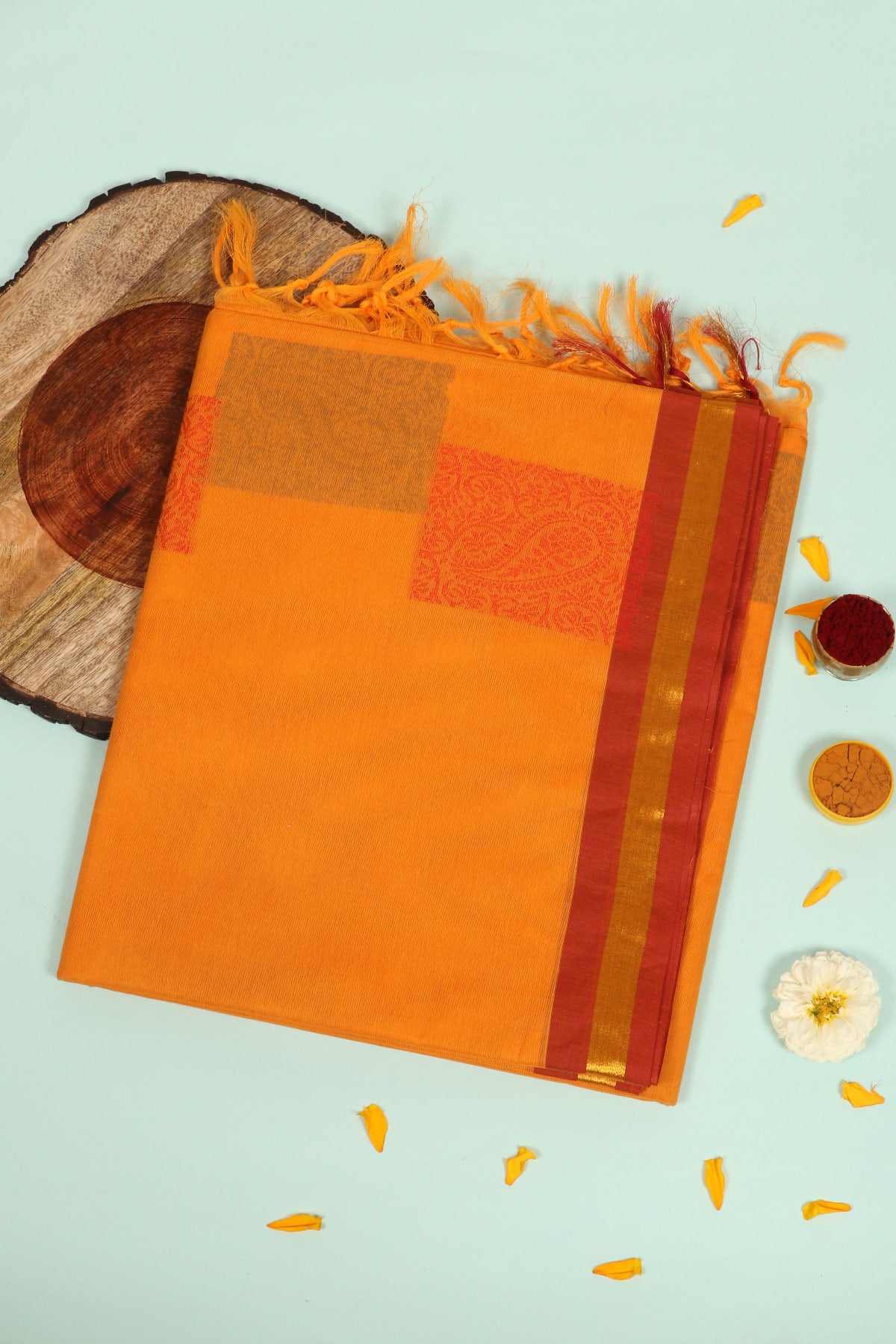 Previous NextMango yellow ethnic cotton saree with a gold zari piping border along with framed paisley thread motifs in zari and threads, woven across the body.