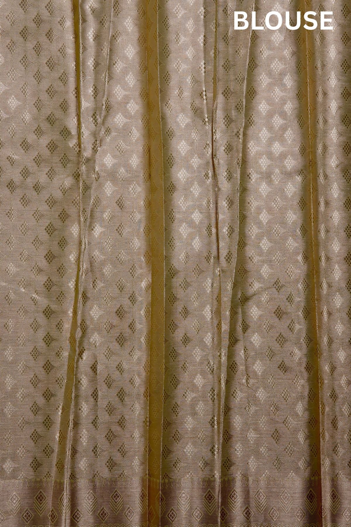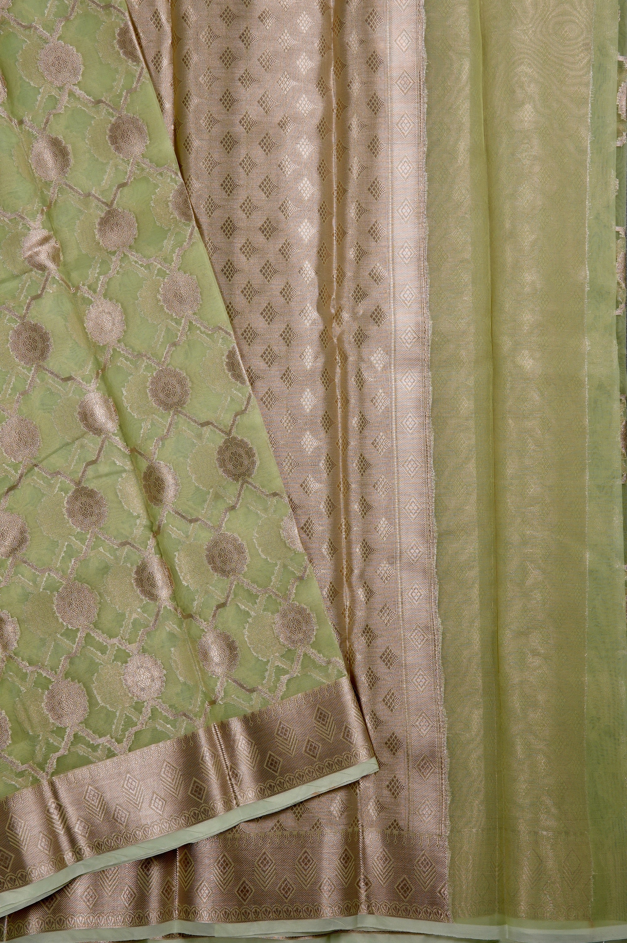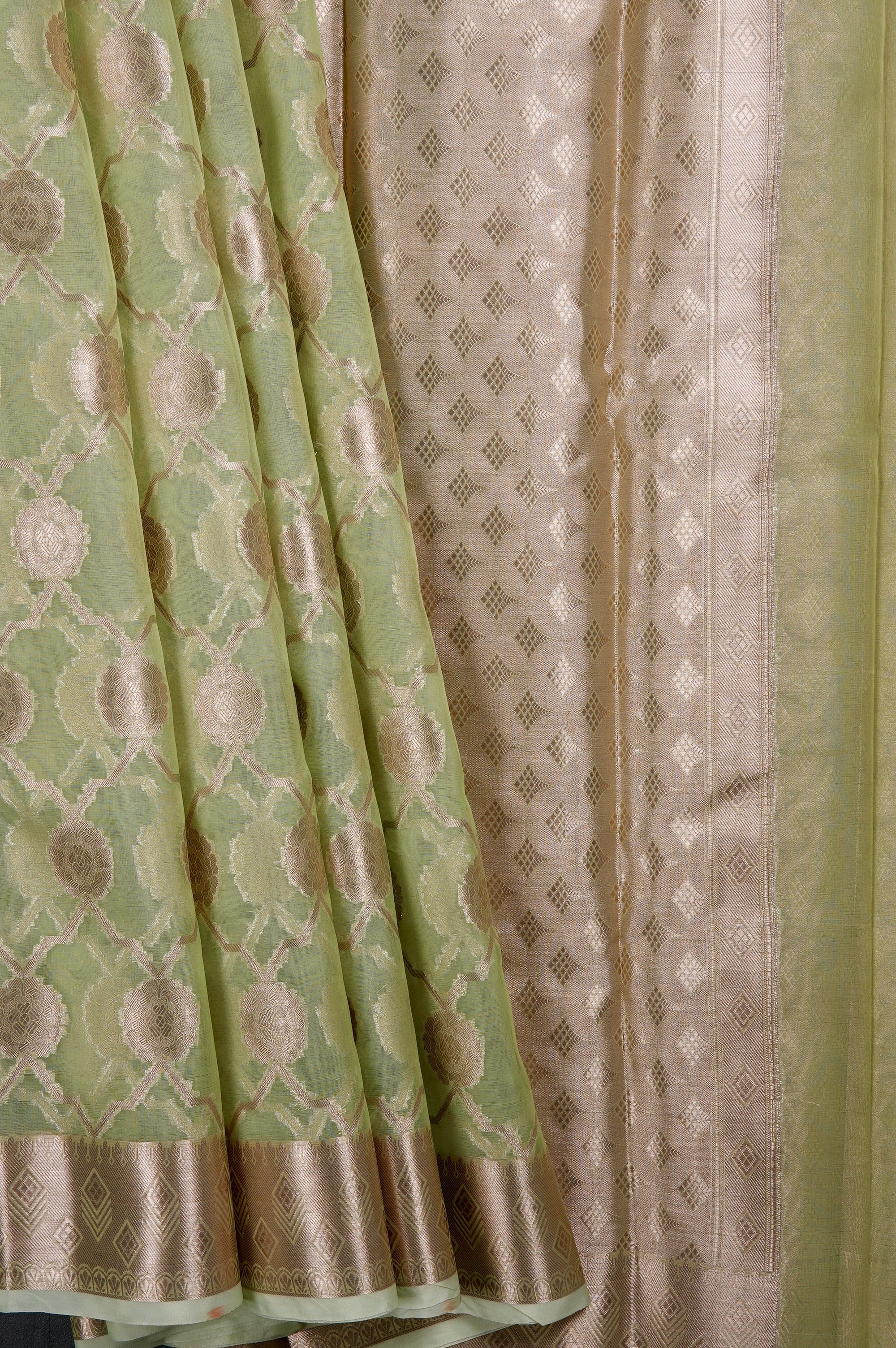 Previous NextMoss green organza saree with stylised diamond grids woven with broad flowers with bold petals on their ends in gold zari, with a border that has a zari base and stacked up diamond motifs. The pallu has a wide band of zari filled with small diamond motifs with one end extended, resembling a manta ray. The saree has a zari blouse blouse filled with small diamond-grid motifs.