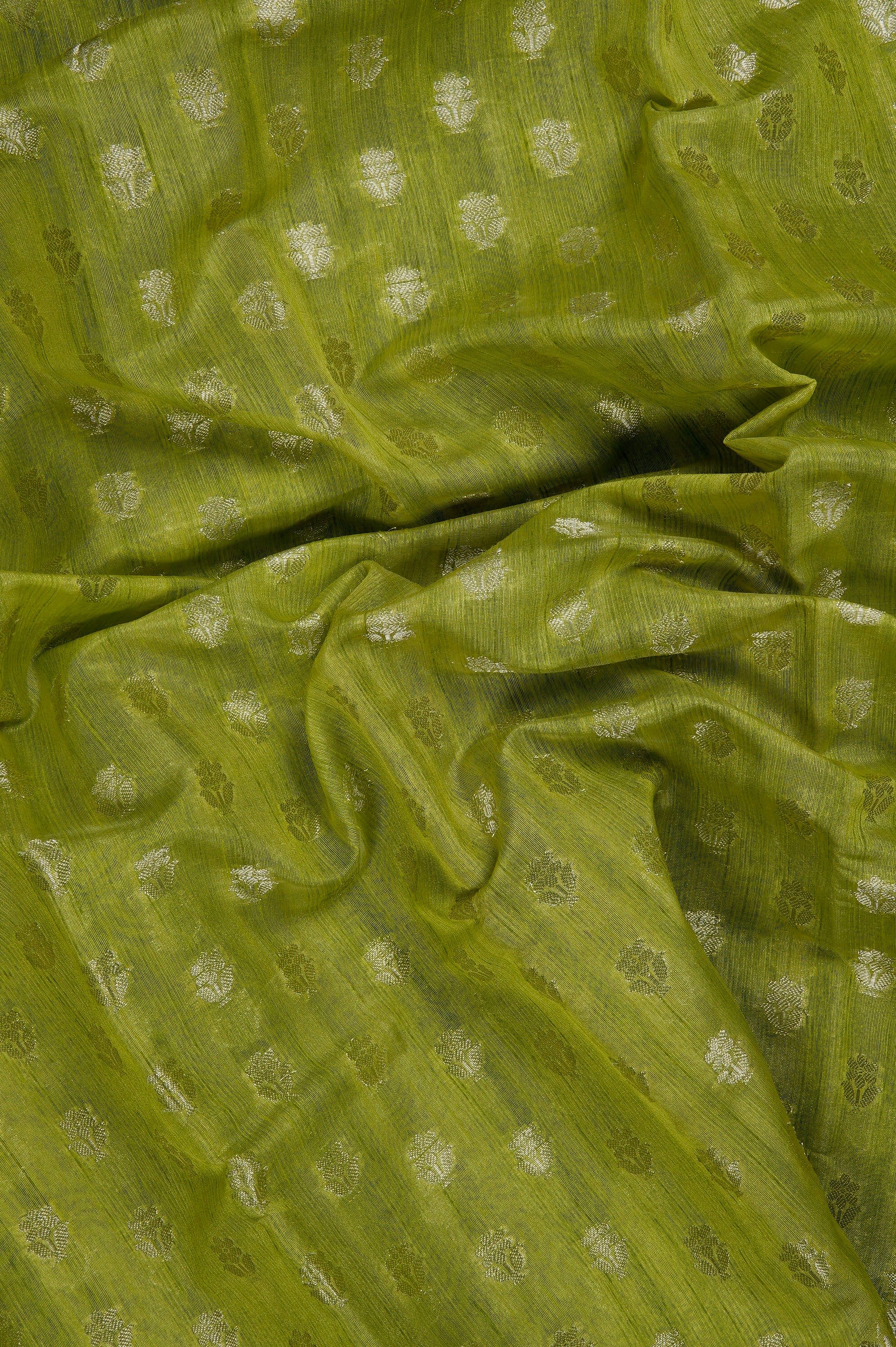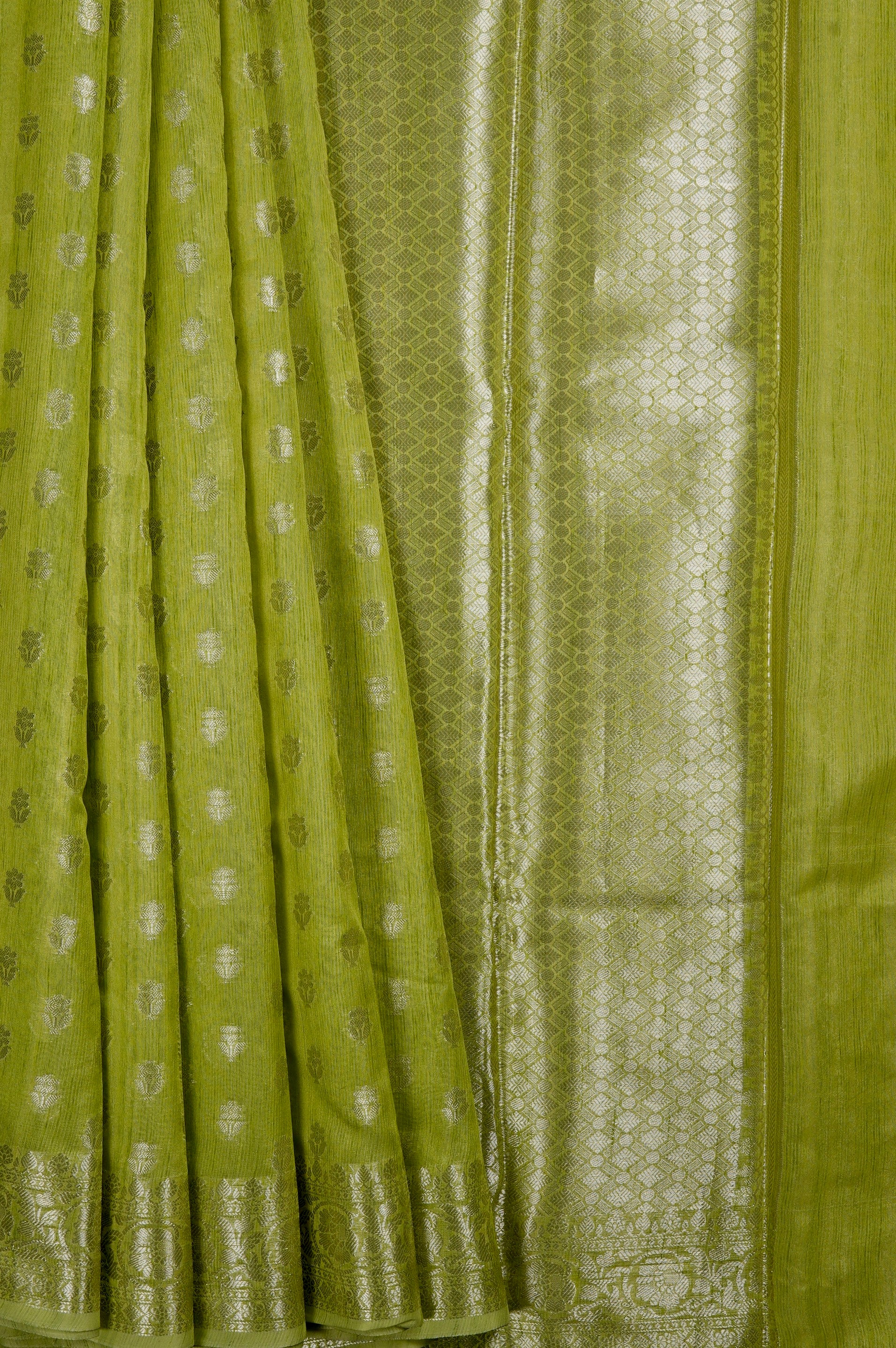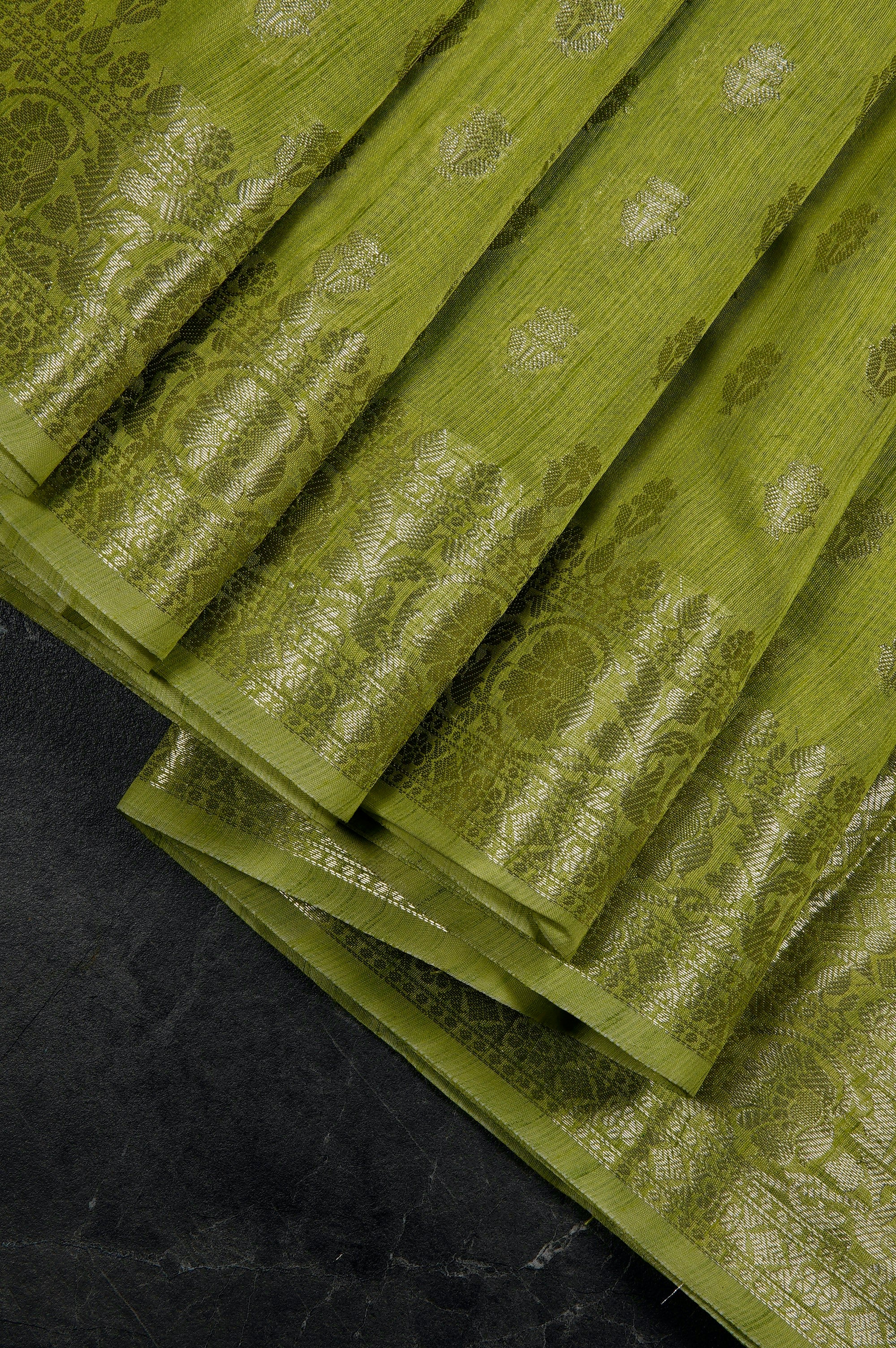 Previous NextMurky green semi tussar saree with small plant motifs woven throughout the body woven in silver zari. The borderis a band of kdi pattern border by small bands of recurring motifs woven in the silver zari. The pallu is a thick widths of diamond grids separated by stylised geometric lines in silver. The saree has a blouse identical to the pallu.