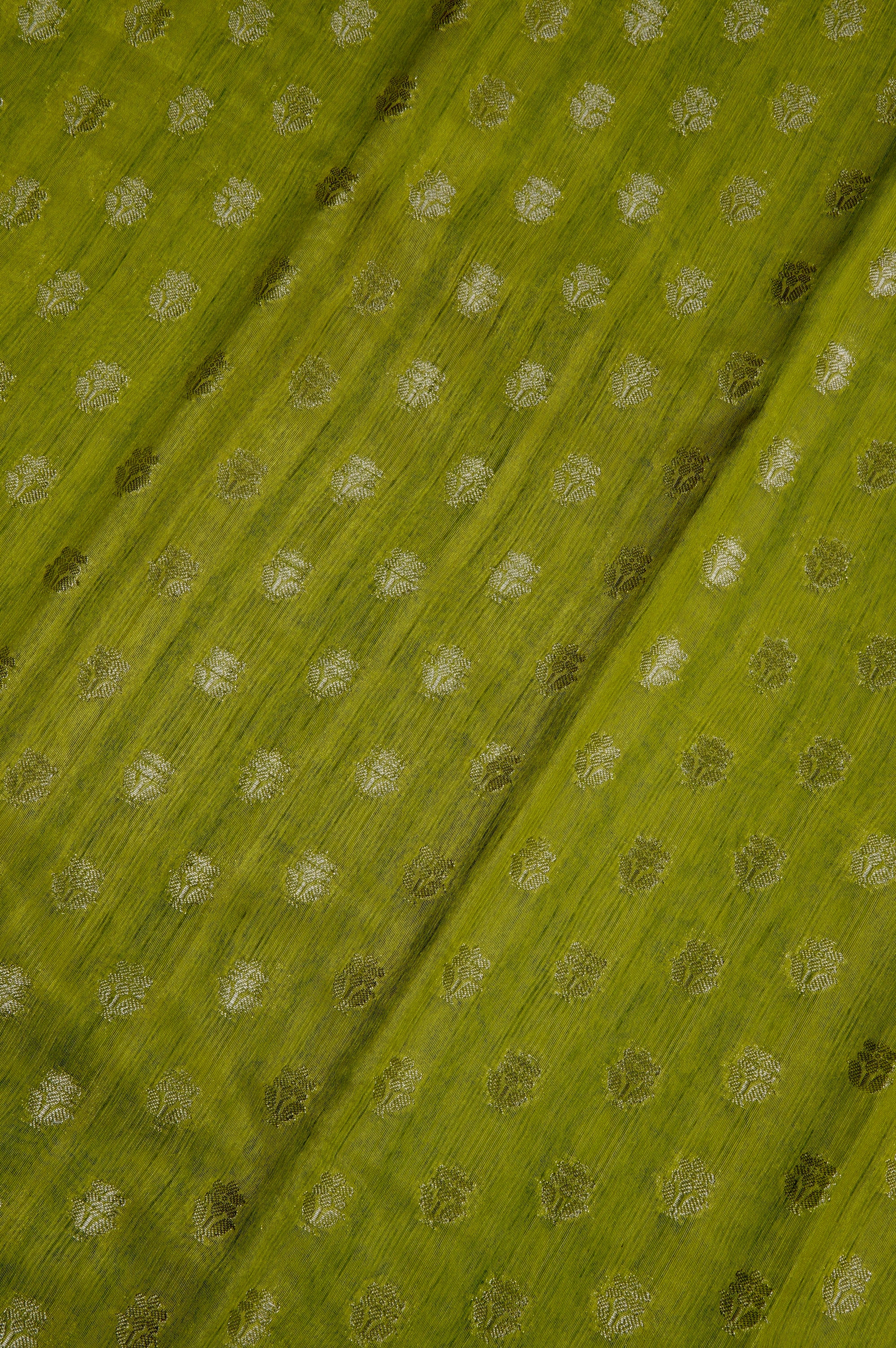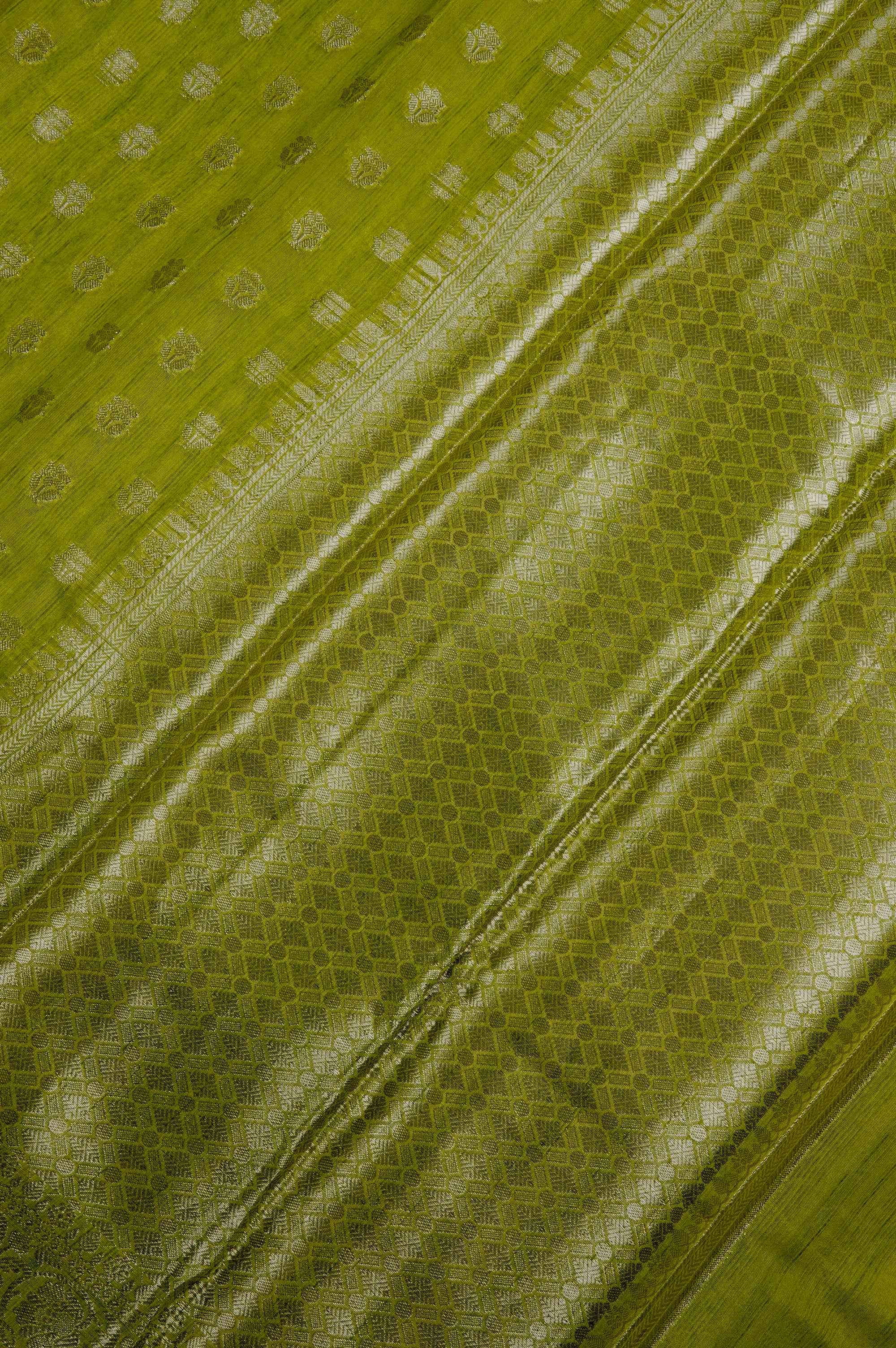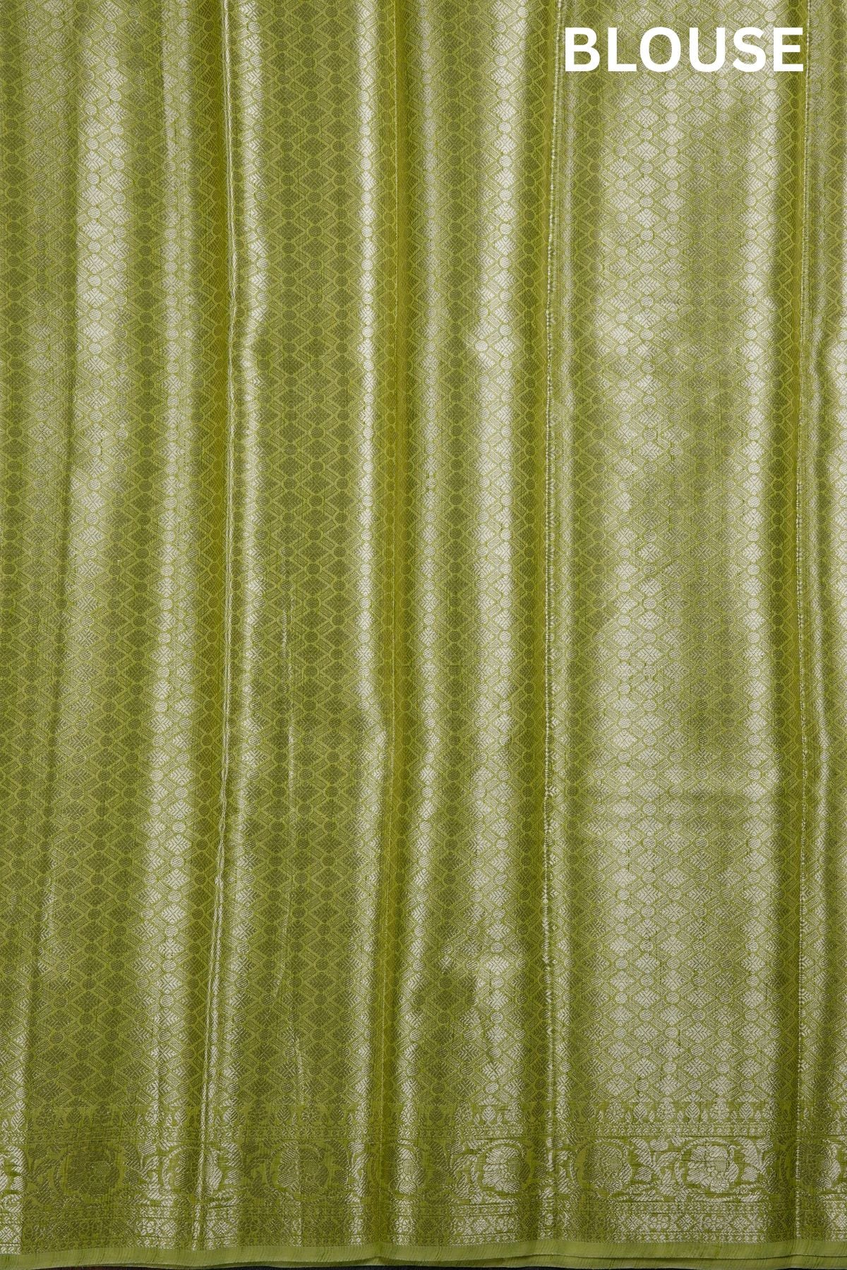 Previous NextMurky green semi tussar saree with small plant motifs woven throughout the body woven in silver zari. The borderis a band of kdi pattern border by small bands of recurring motifs woven in the silver zari. The pallu is a thick widths of diamond grids separated by stylised geometric lines in silver. The saree has a blouse identical to the pallu.