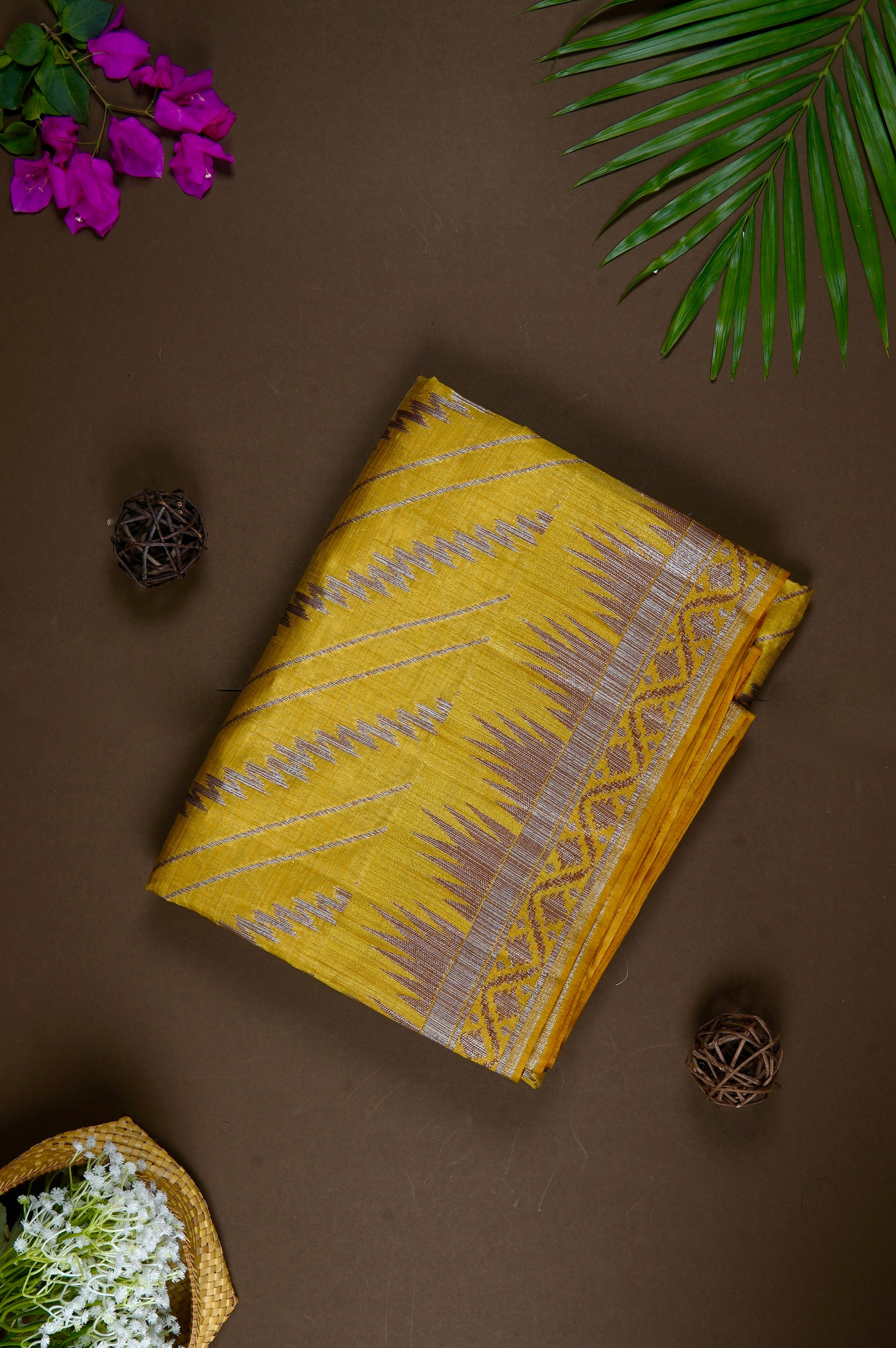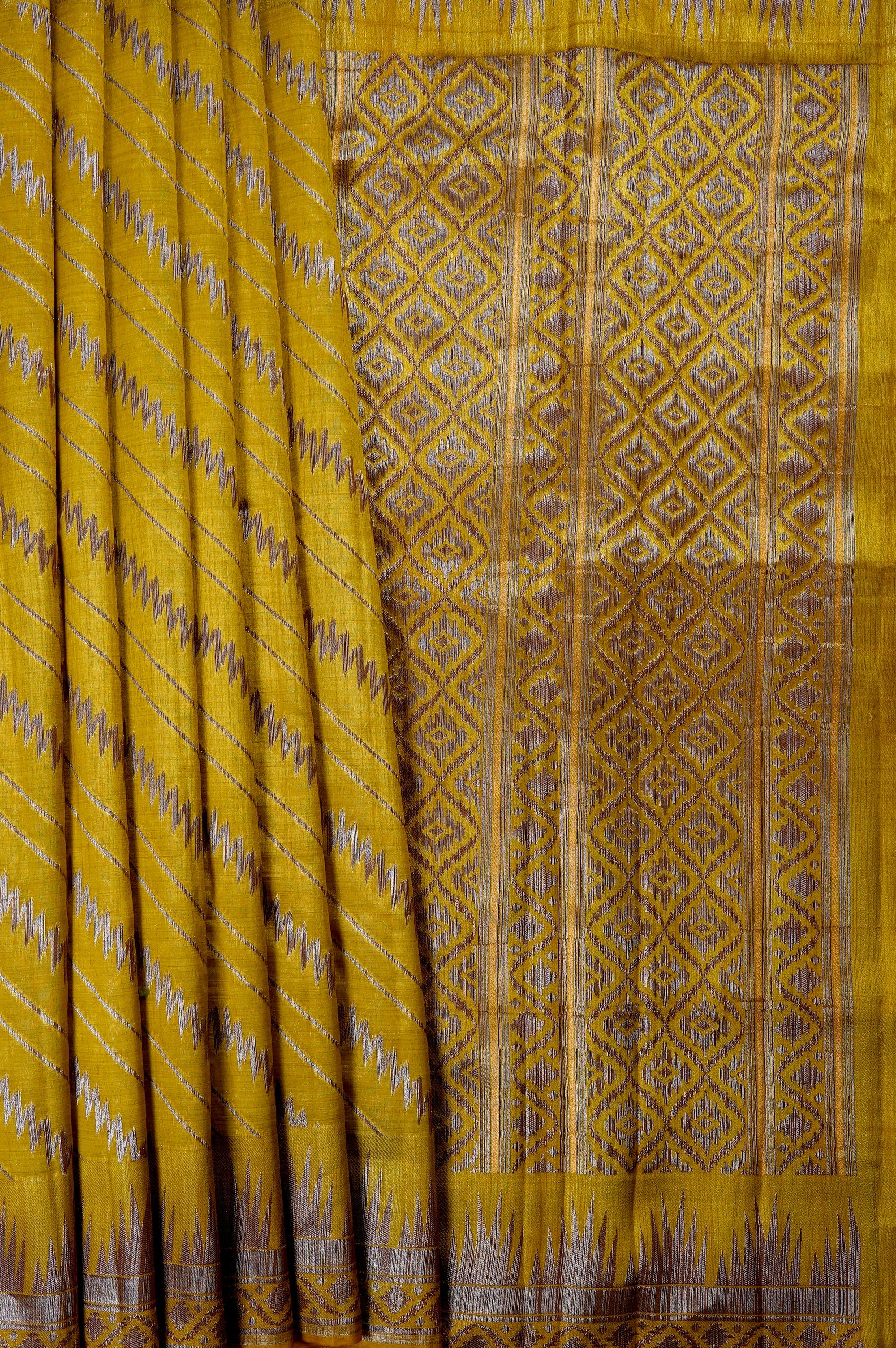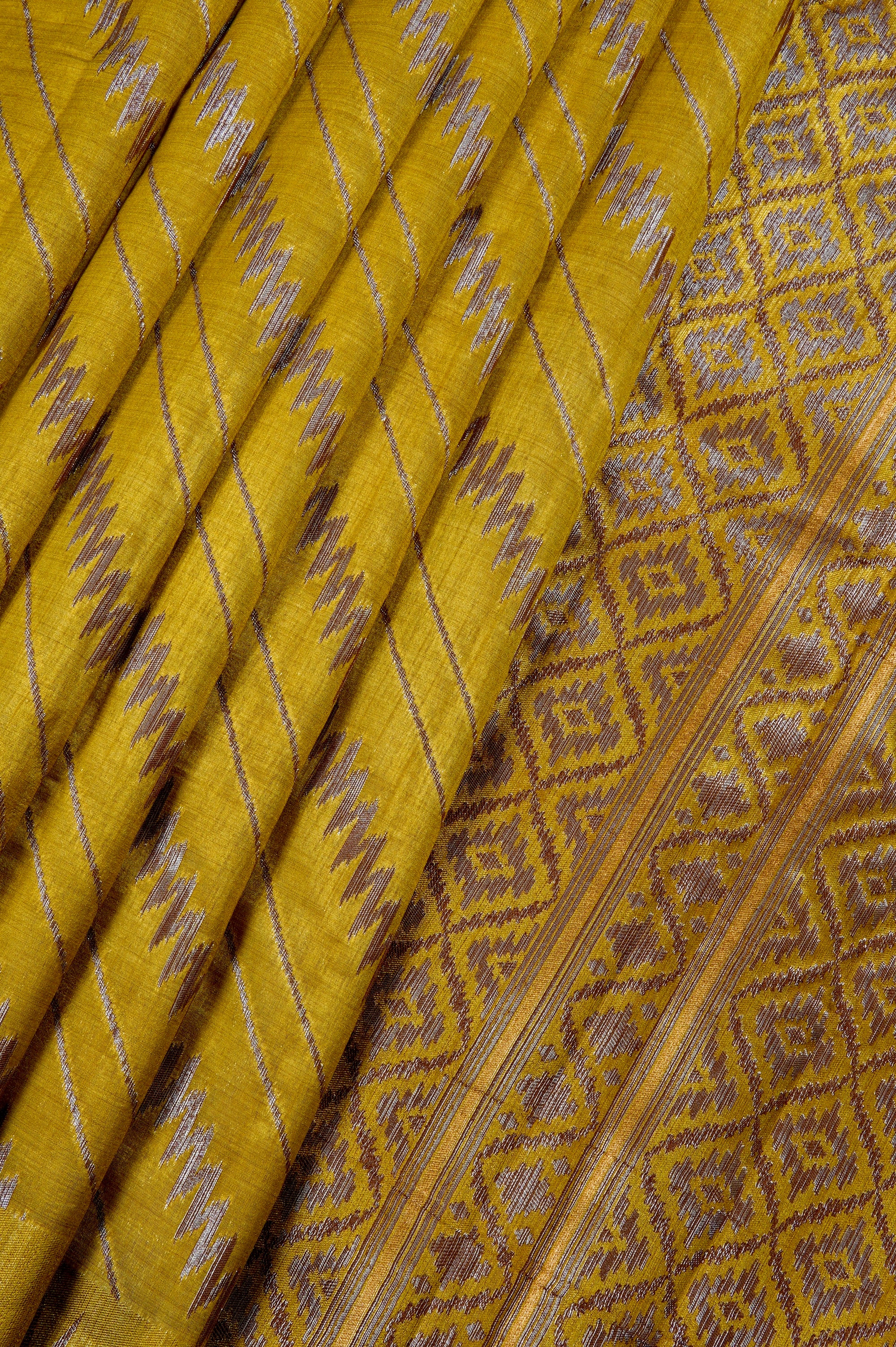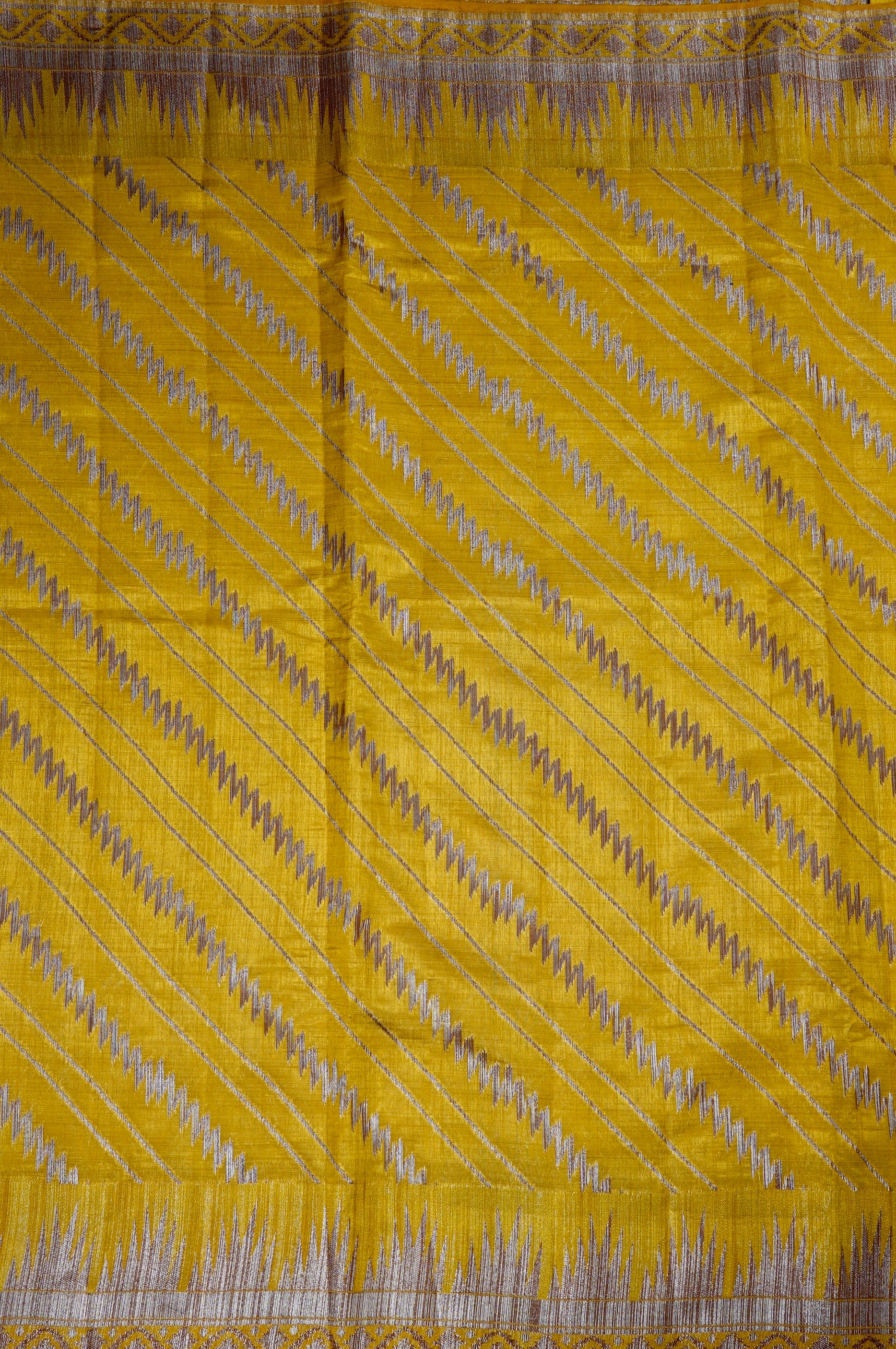 Previous NextMake a statement with this vibrant mustard yellow semi tussar saree. Offering a beautifully textured and lightweight drape, the body is highlighted by striking diagonal stripes featuring intricate silver zig-zag chevron motifs. The design is elegantly framed by traditional temple rek borders. The pallu showcases and elaborate, all-over silver geometric diamond pattern arranged in striking vertical panels, this saree perfectly balances a bold color alongside traditional patterns in zari.