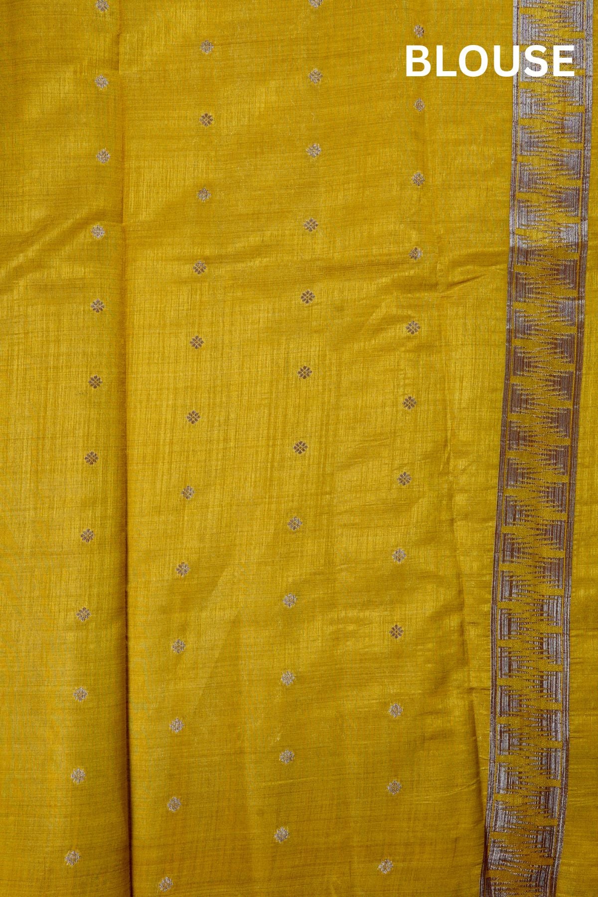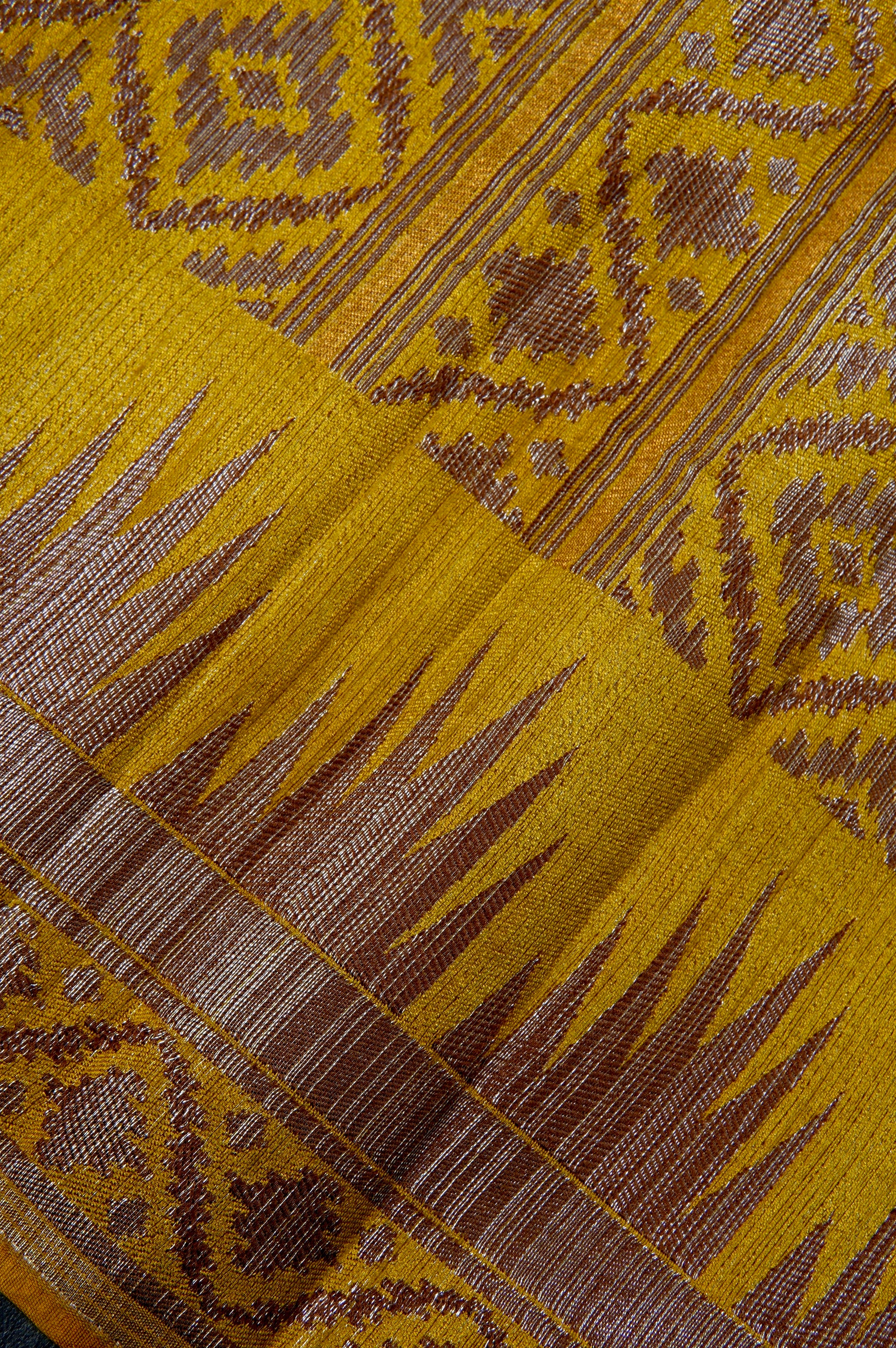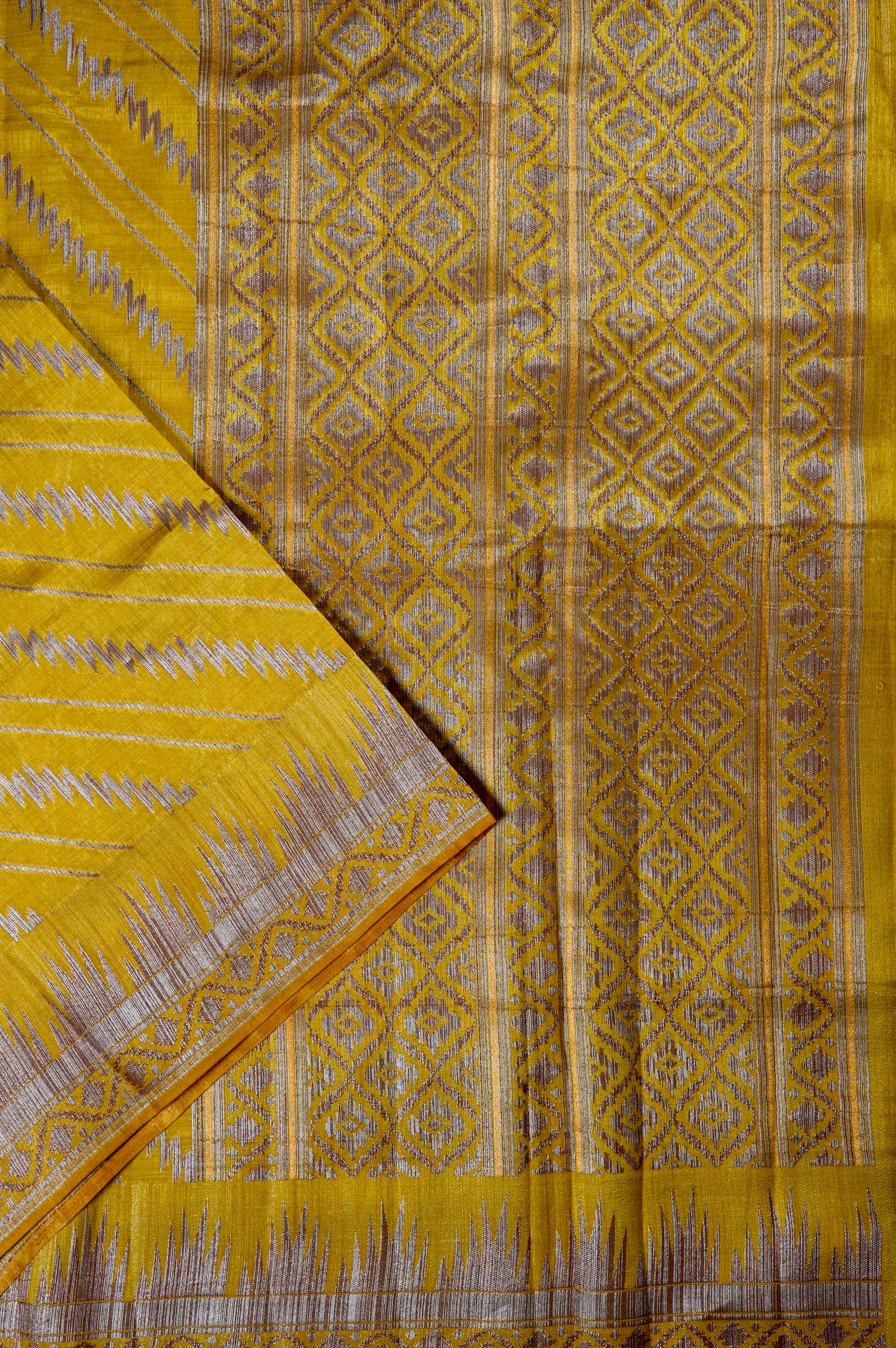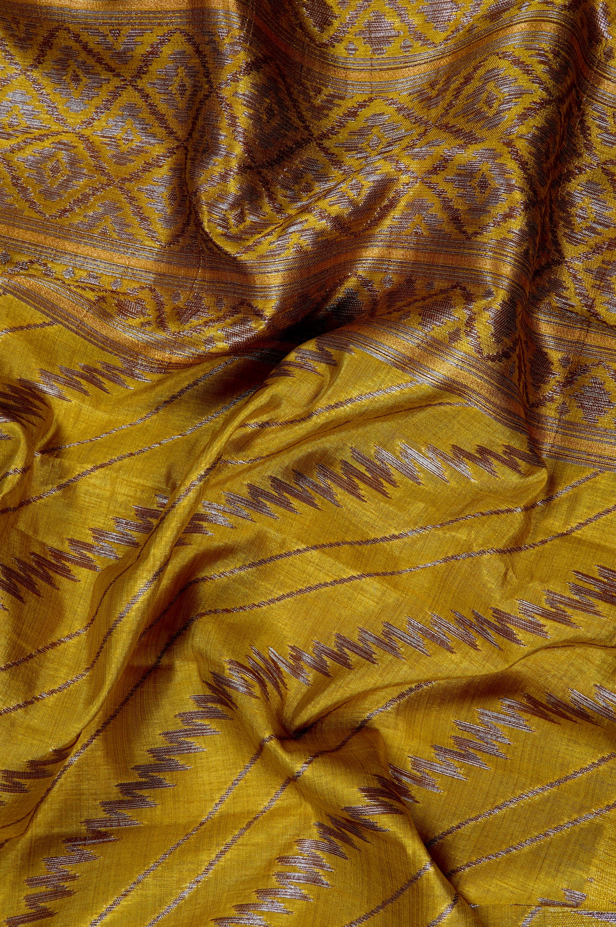 Previous NextMake a statement with this vibrant mustard yellow semi tussar saree. Offering a beautifully textured and lightweight drape, the body is highlighted by striking diagonal stripes featuring intricate silver zig-zag chevron motifs. The design is elegantly framed by traditional temple rek borders. The pallu showcases and elaborate, all-over silver geometric diamond pattern arranged in striking vertical panels, this saree perfectly balances a bold color alongside traditional patterns in zari.
