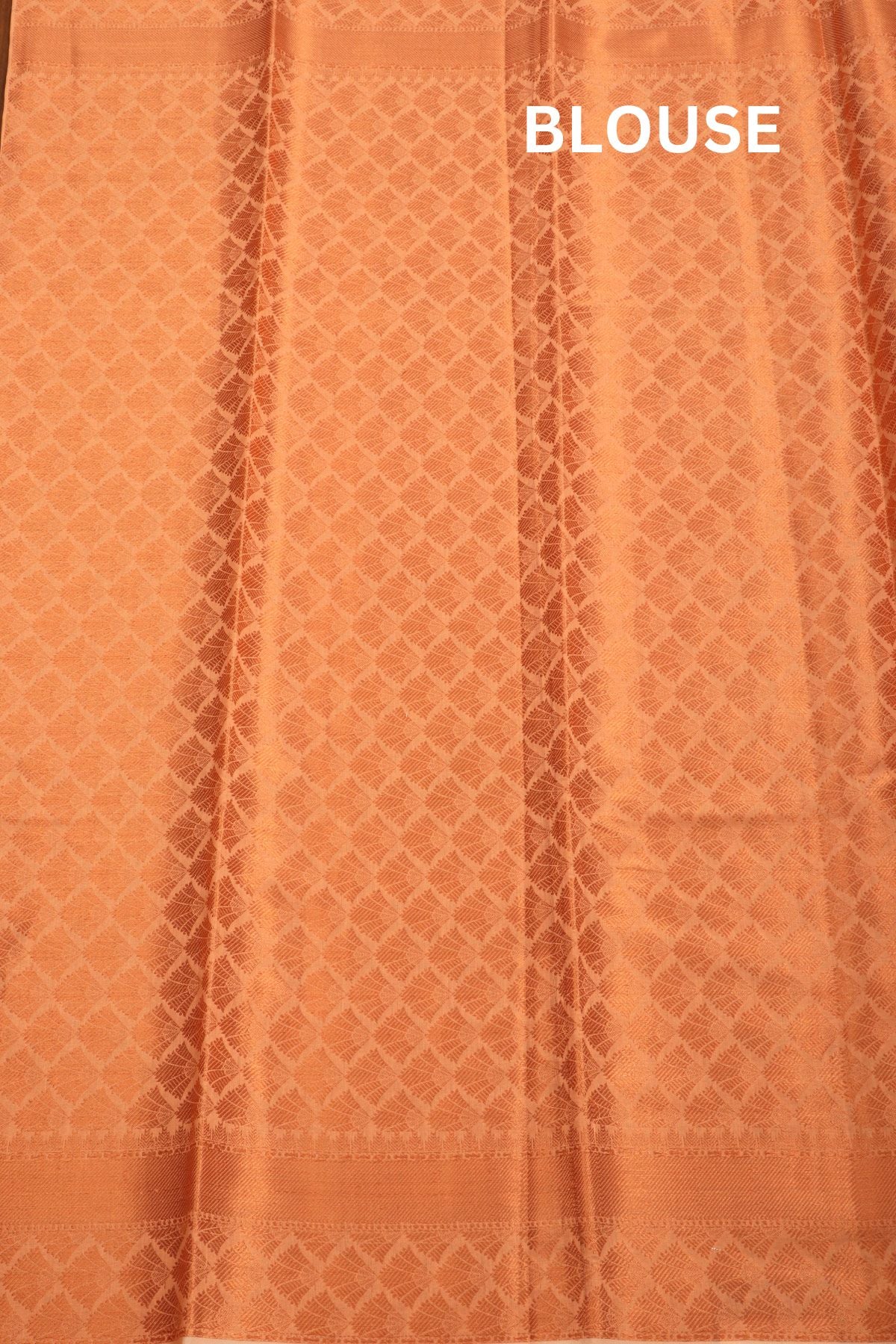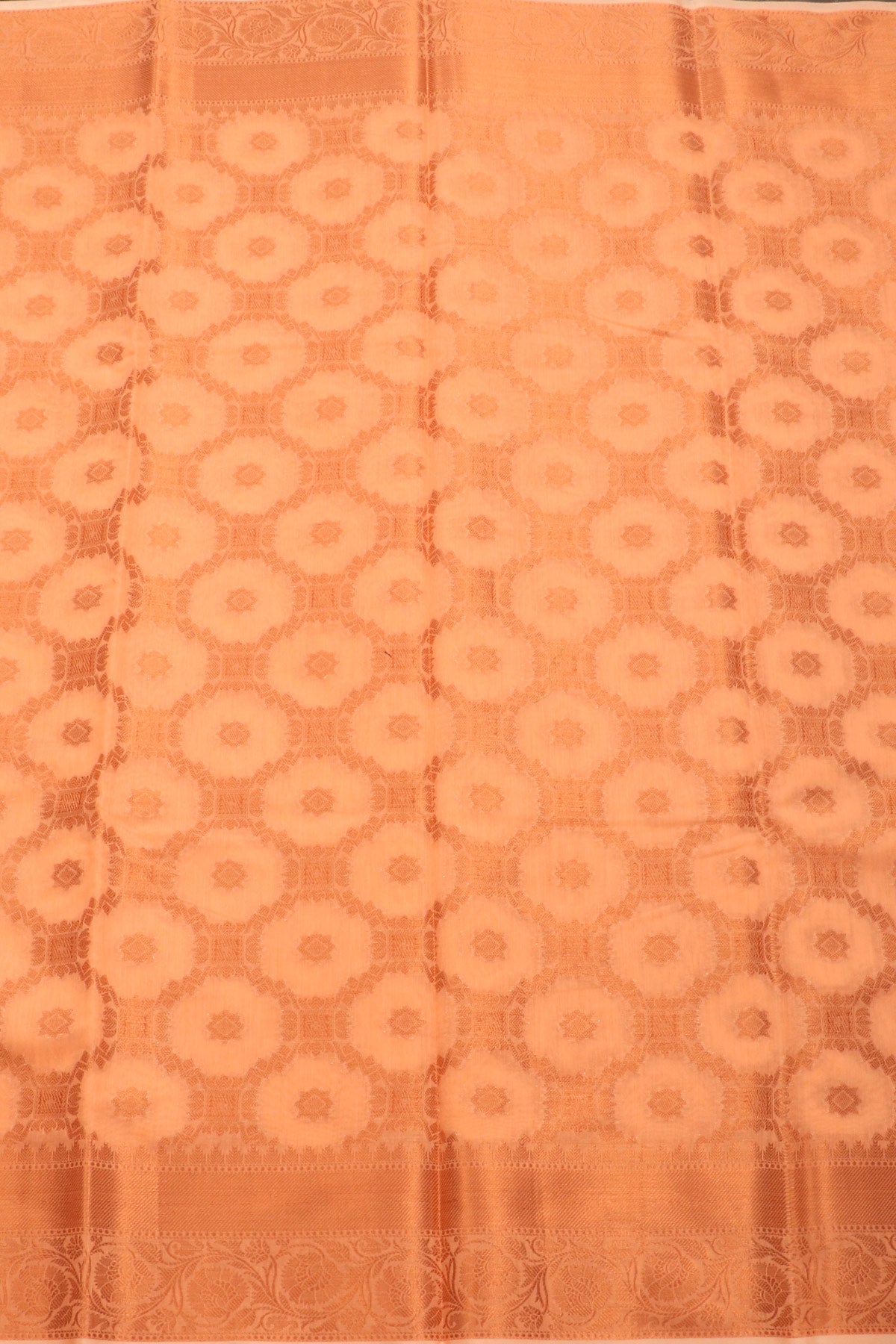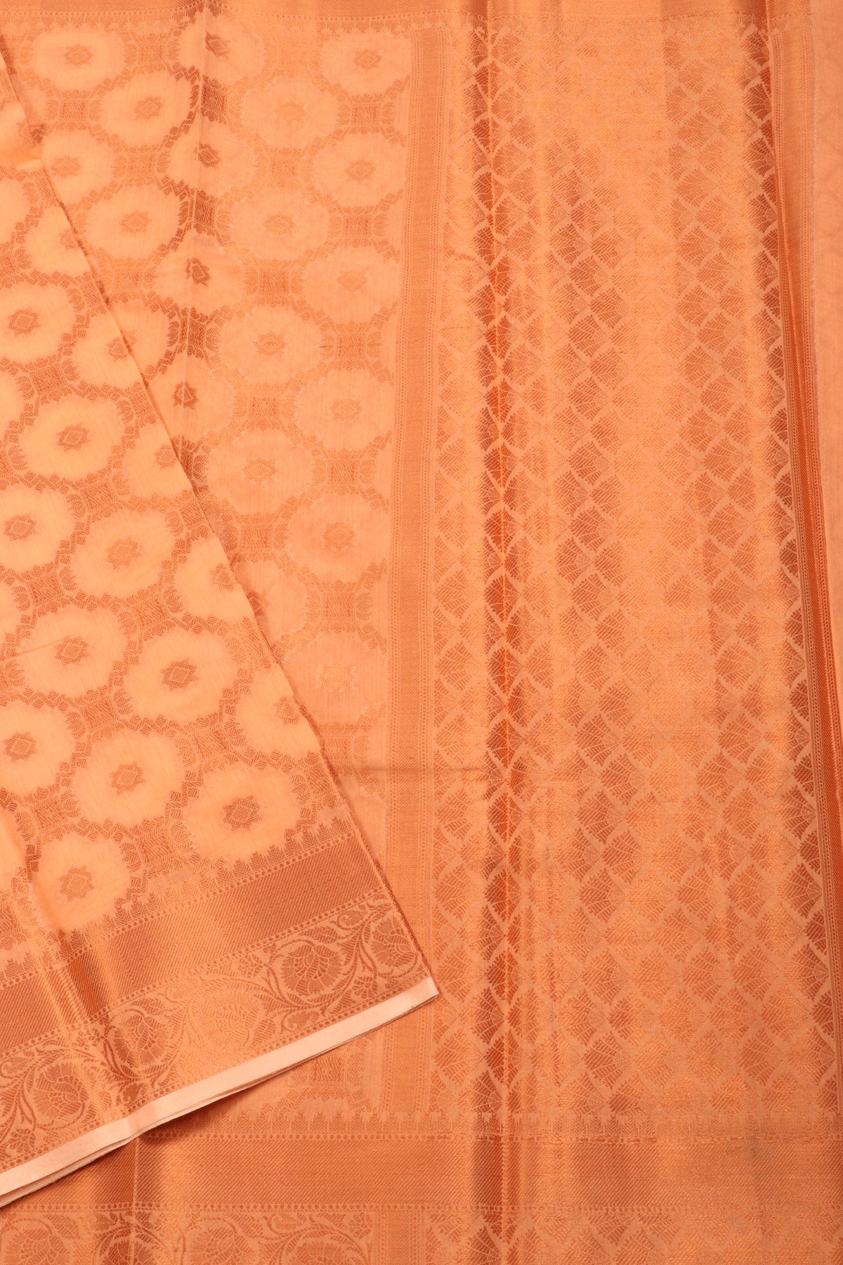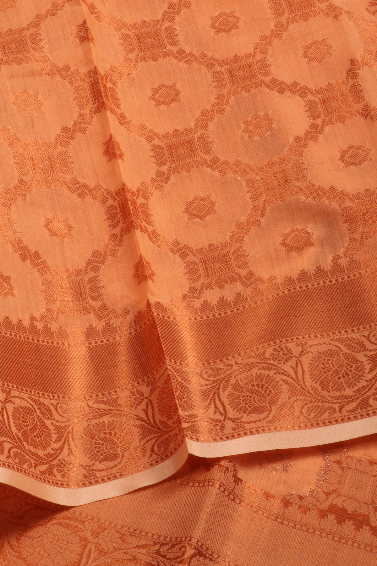 Previous NextPeach semi silk cotton saree with Chettinad tile inspired patterns taking over the body in gold zari, paired with an elegant "self" border.