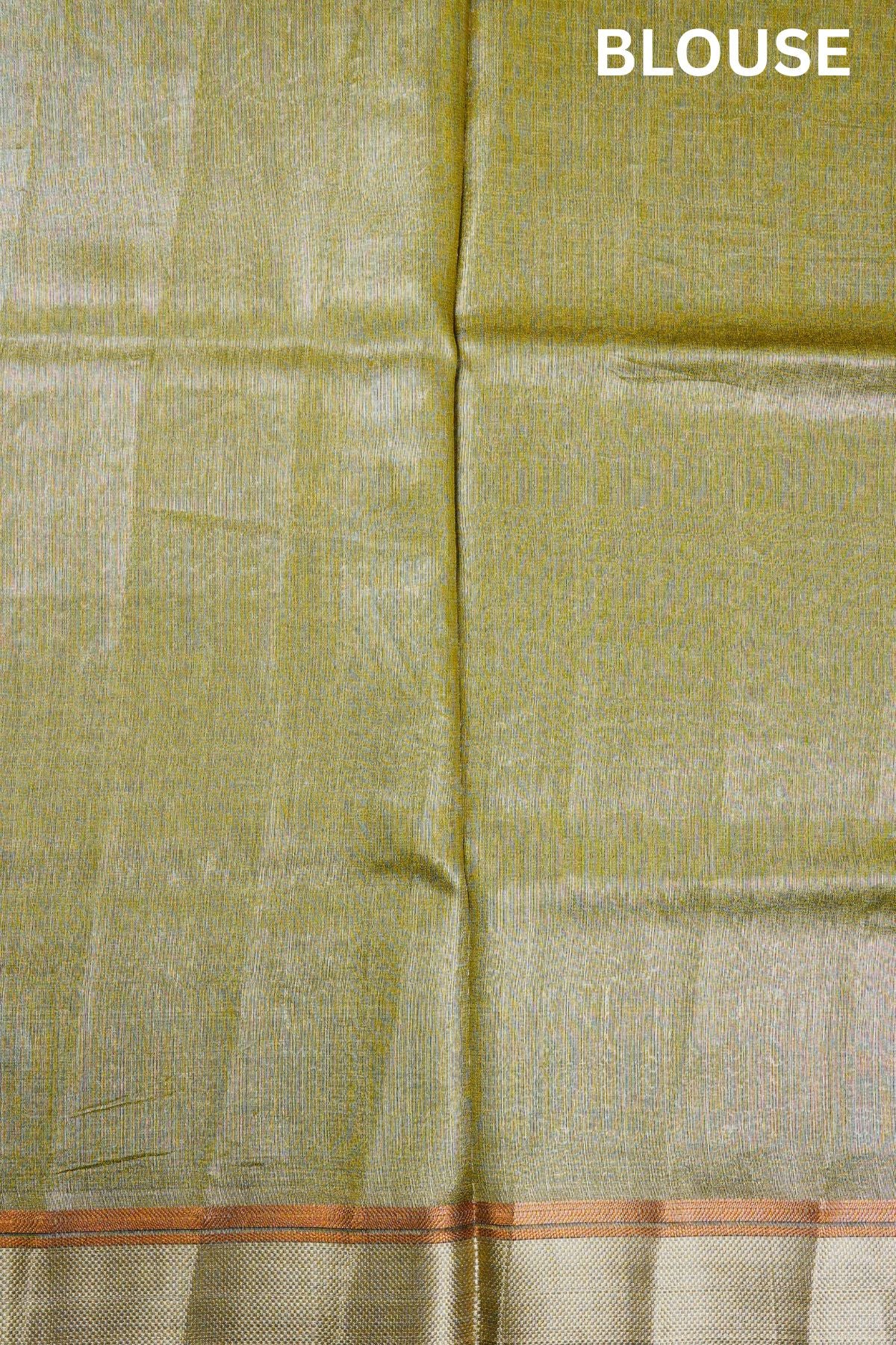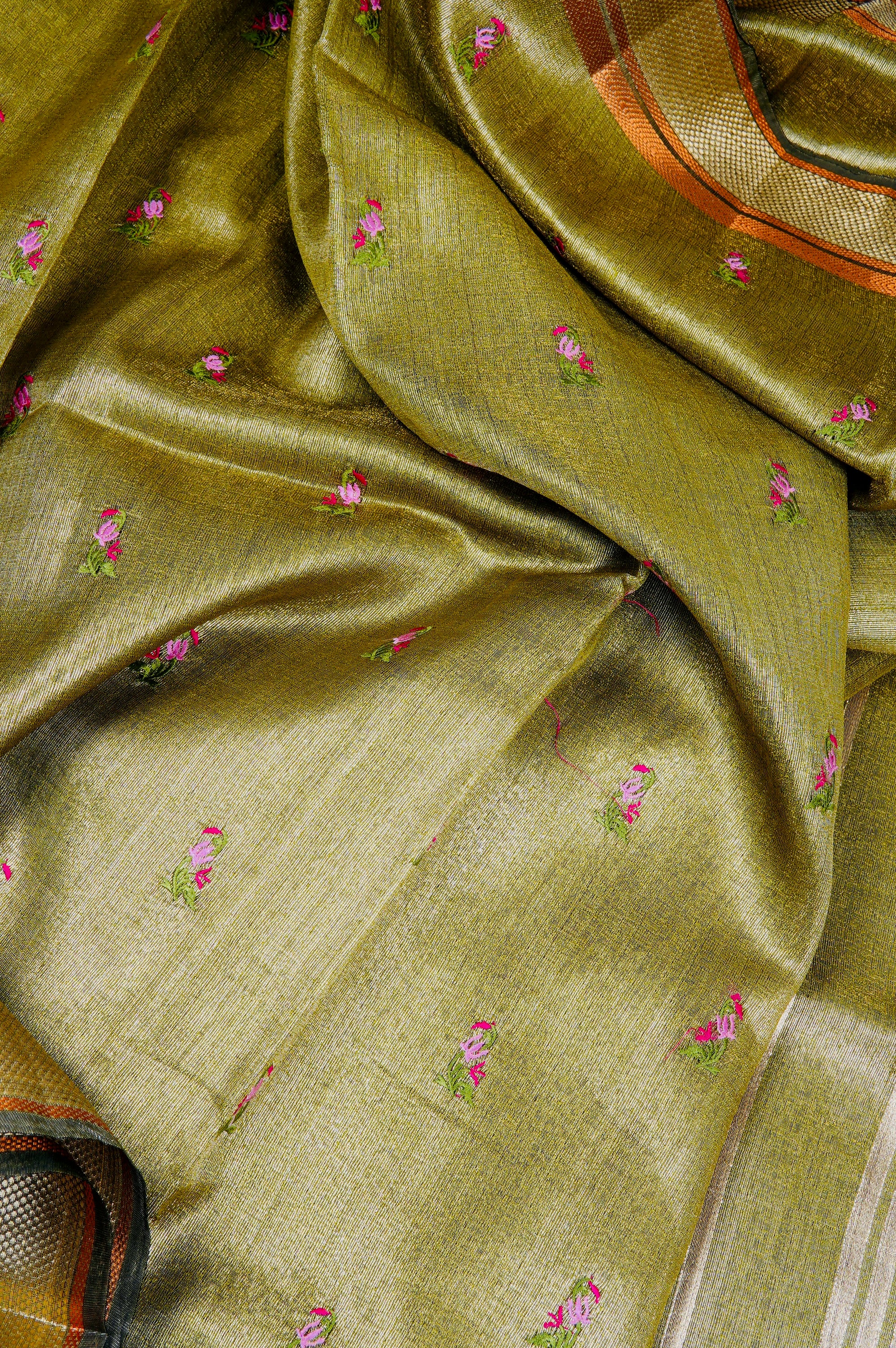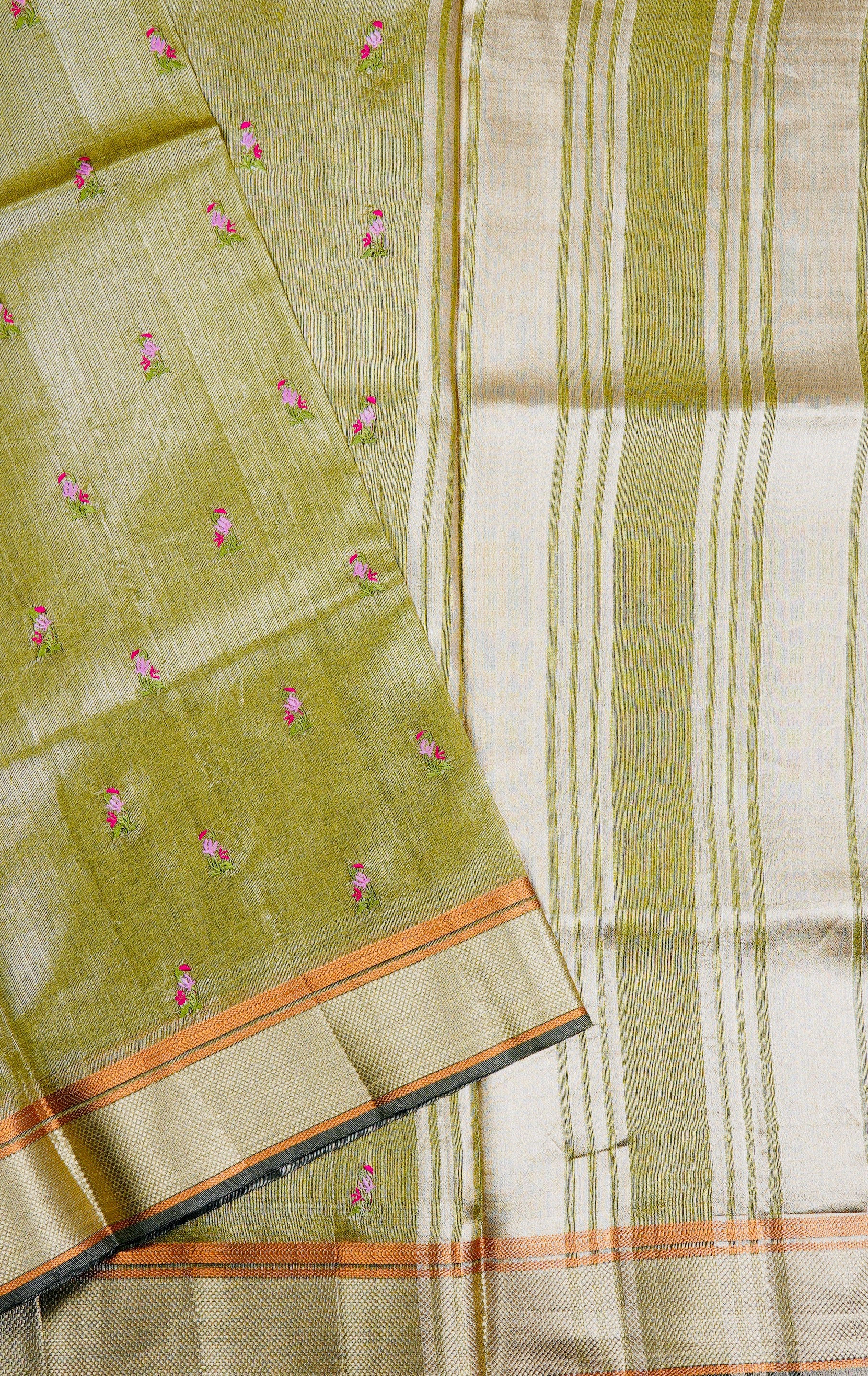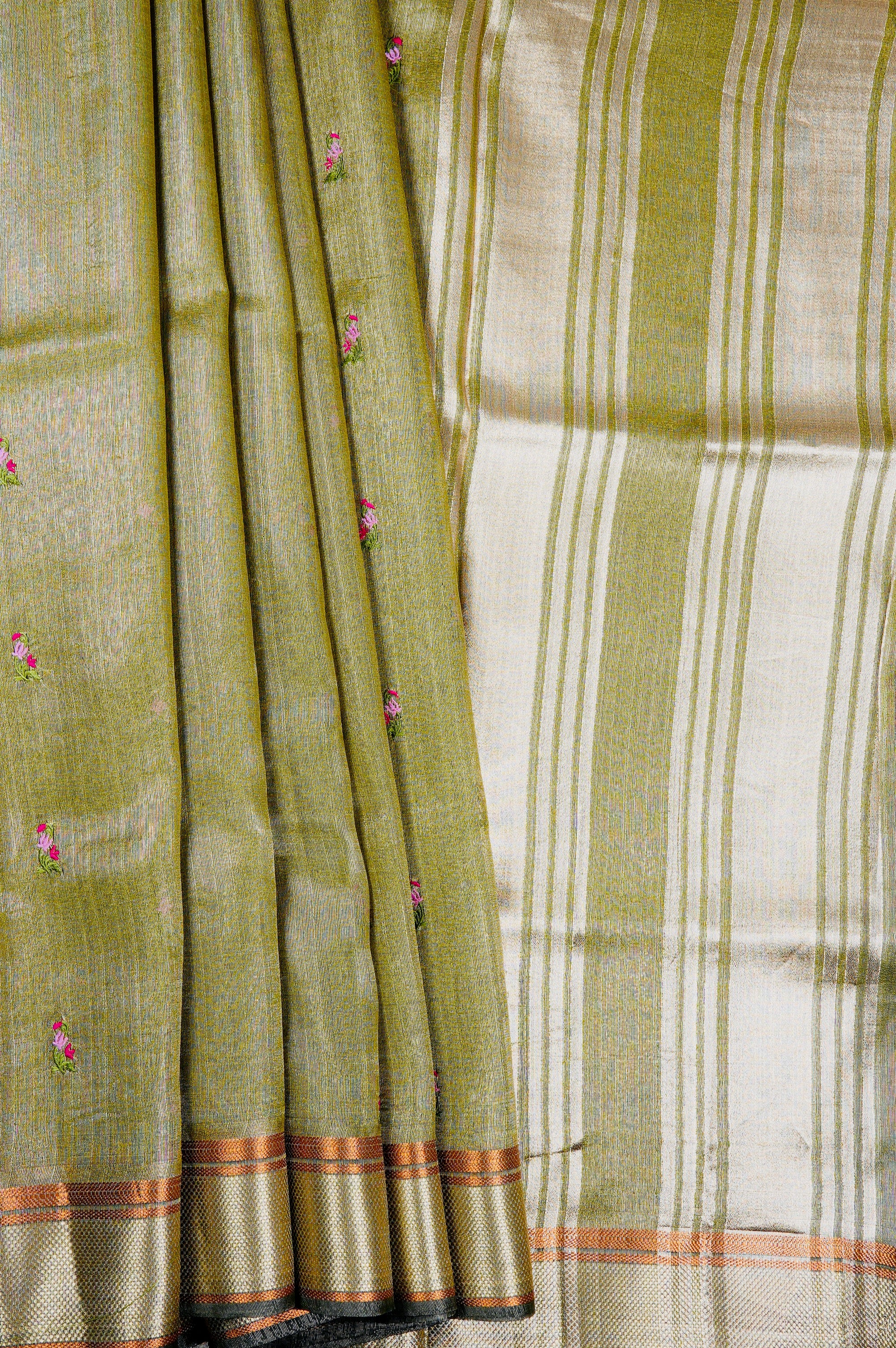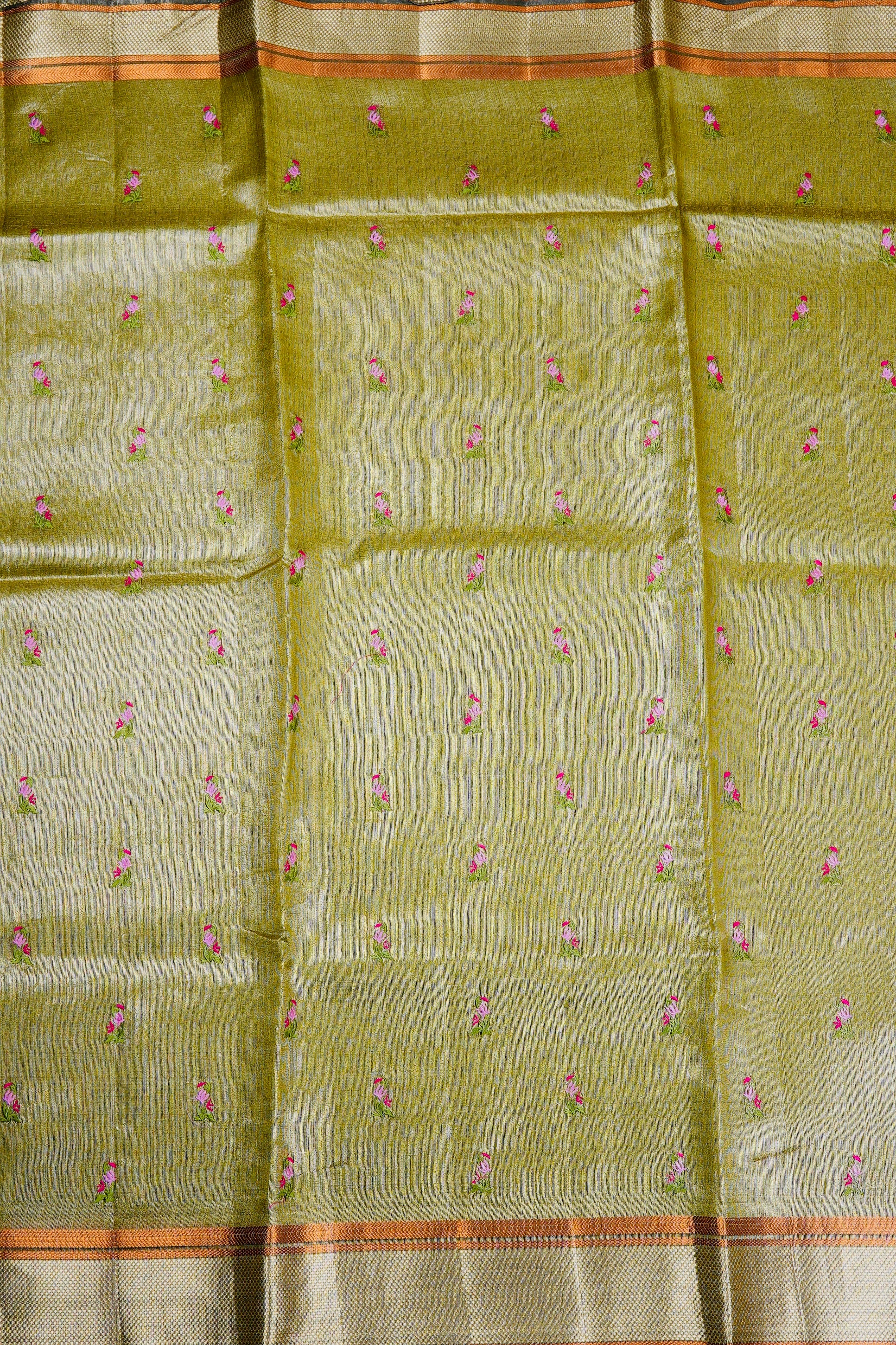 Previous NextPear green semi tussar saree with gold undertones filled with small florals woven in pink and green throughout the body, and a border starting with a band of gold zari, followed by a band of paler zari. The pallu has a series of vertical gold zari bands woven in different widths. The saree has a plain pear green blouse with the same border.