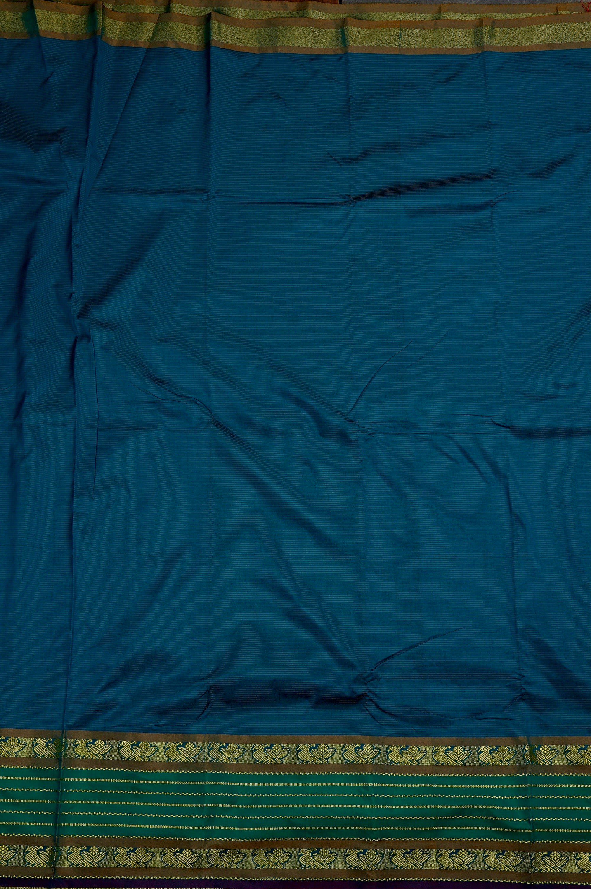 Previous NextPrussian blue art silk saree with dual border constituted by bands of teal, followed by dark purple, bordered and separated by a band of peacock motifs woven in gold zari. The pallu has a deep red base with vaira oosi woven vertically spaced out in lines, with a dual border of olive brown and rustic red holding the same motifs as the body. The saree has a deep red blouse with the same border.