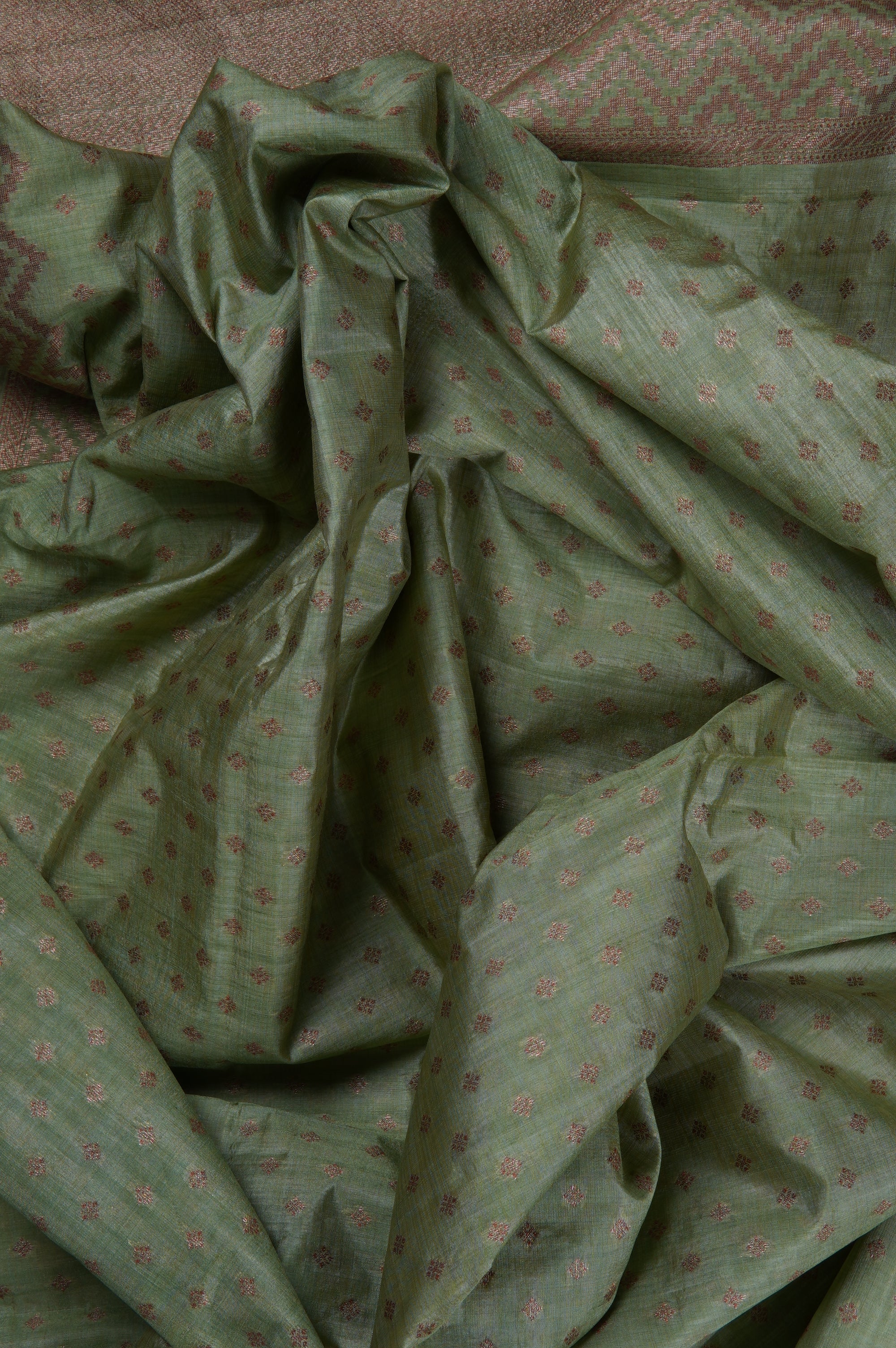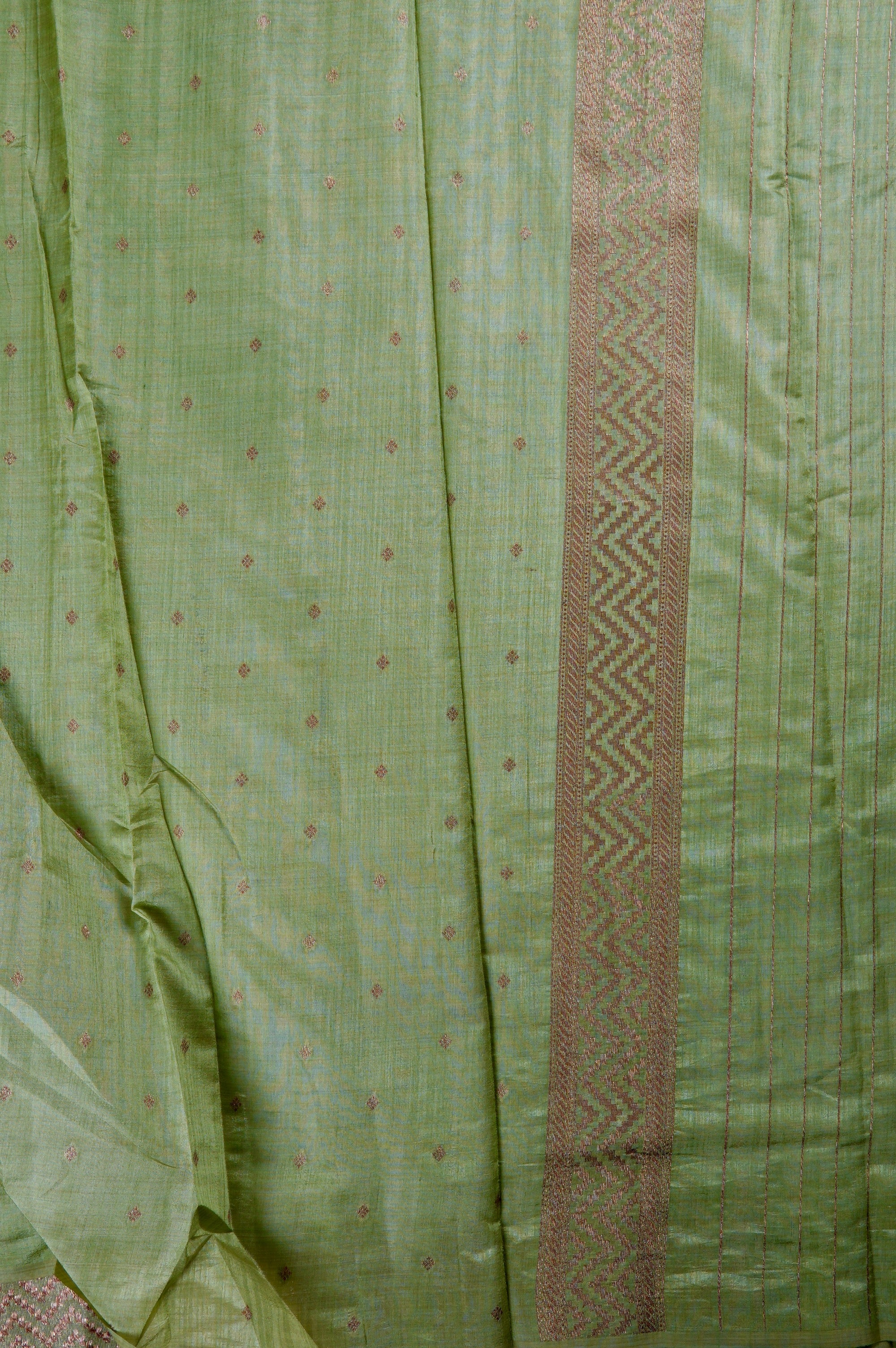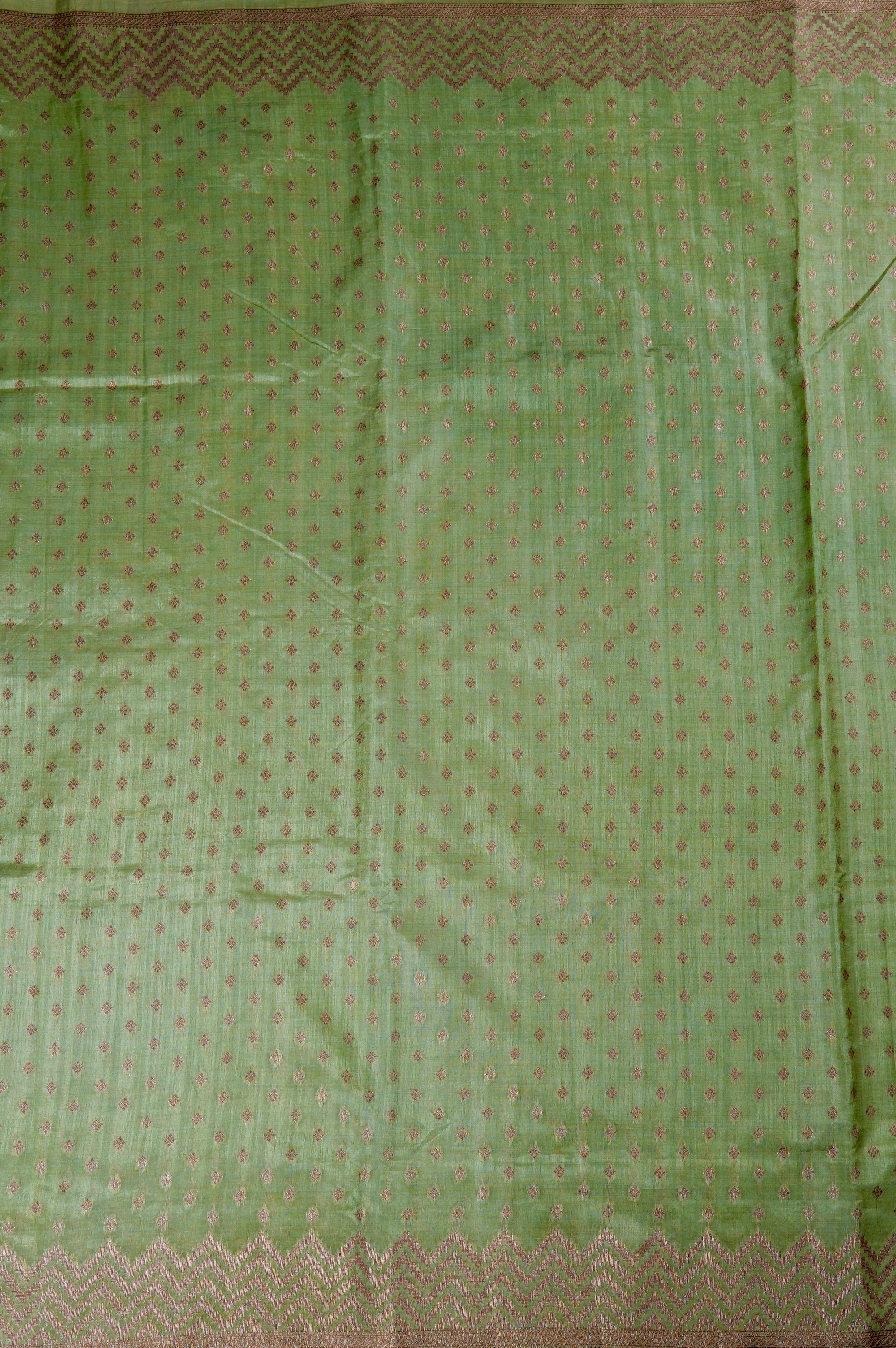 Previous NextSage green semi tussar saree with small diamond bhutta woven in zari throughout the body extending to a recurring diamond pattern border woven in zari, ending with a band of small diagonal stripes. The pallu has a rich weave of zari with repeating diamond patterns filled with zari work almost seeming like an expanse of gold, ending with the same border as the saree. The saree has a sage green blouse with small diamond bhuttas woven in zari and the same border.