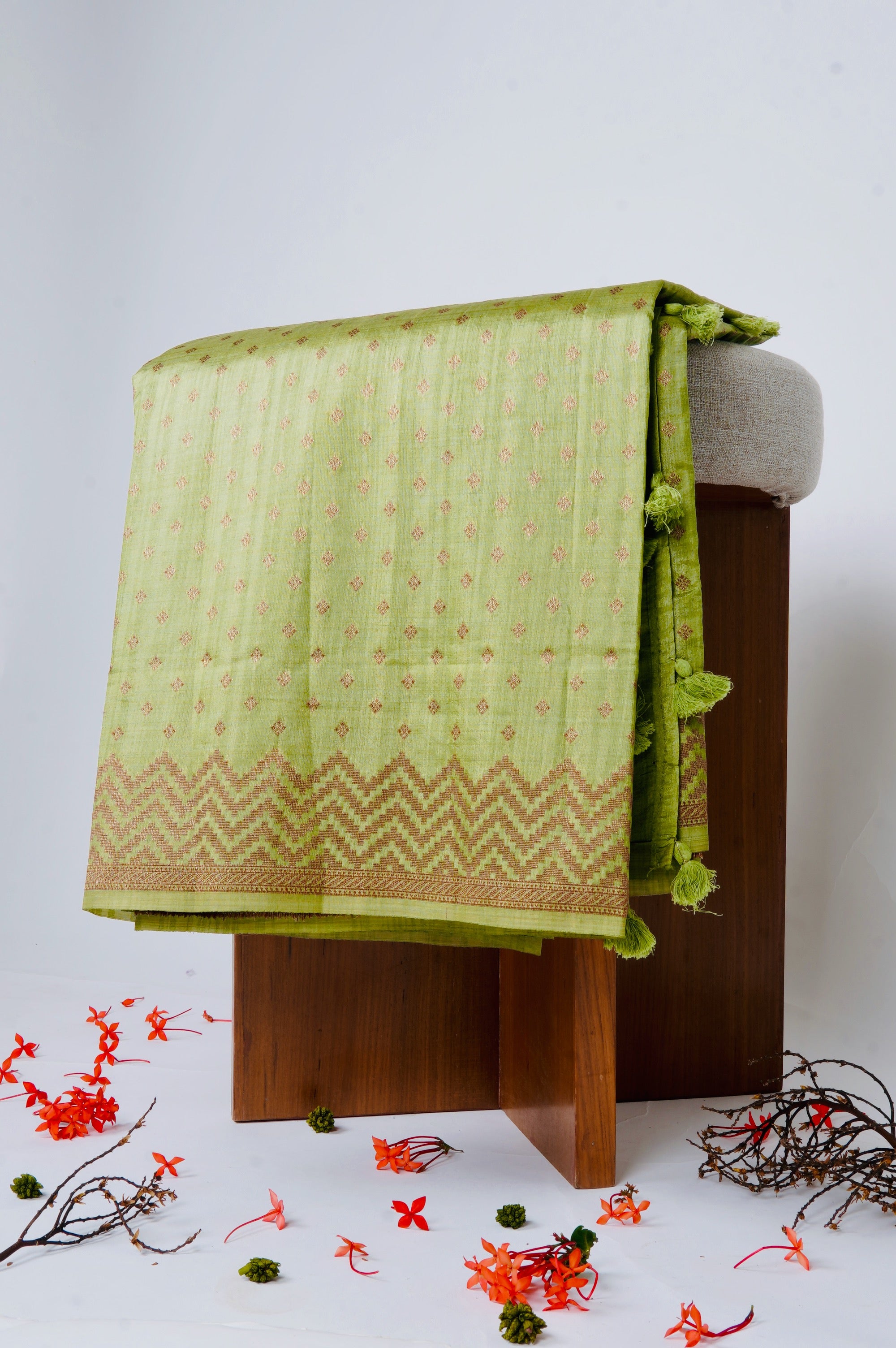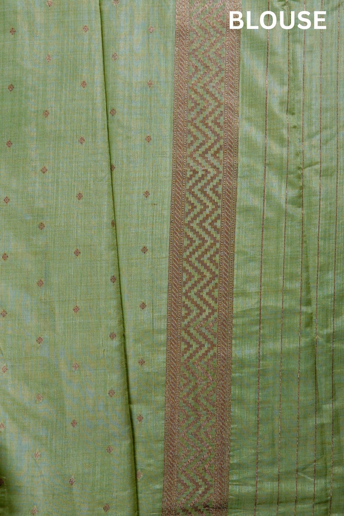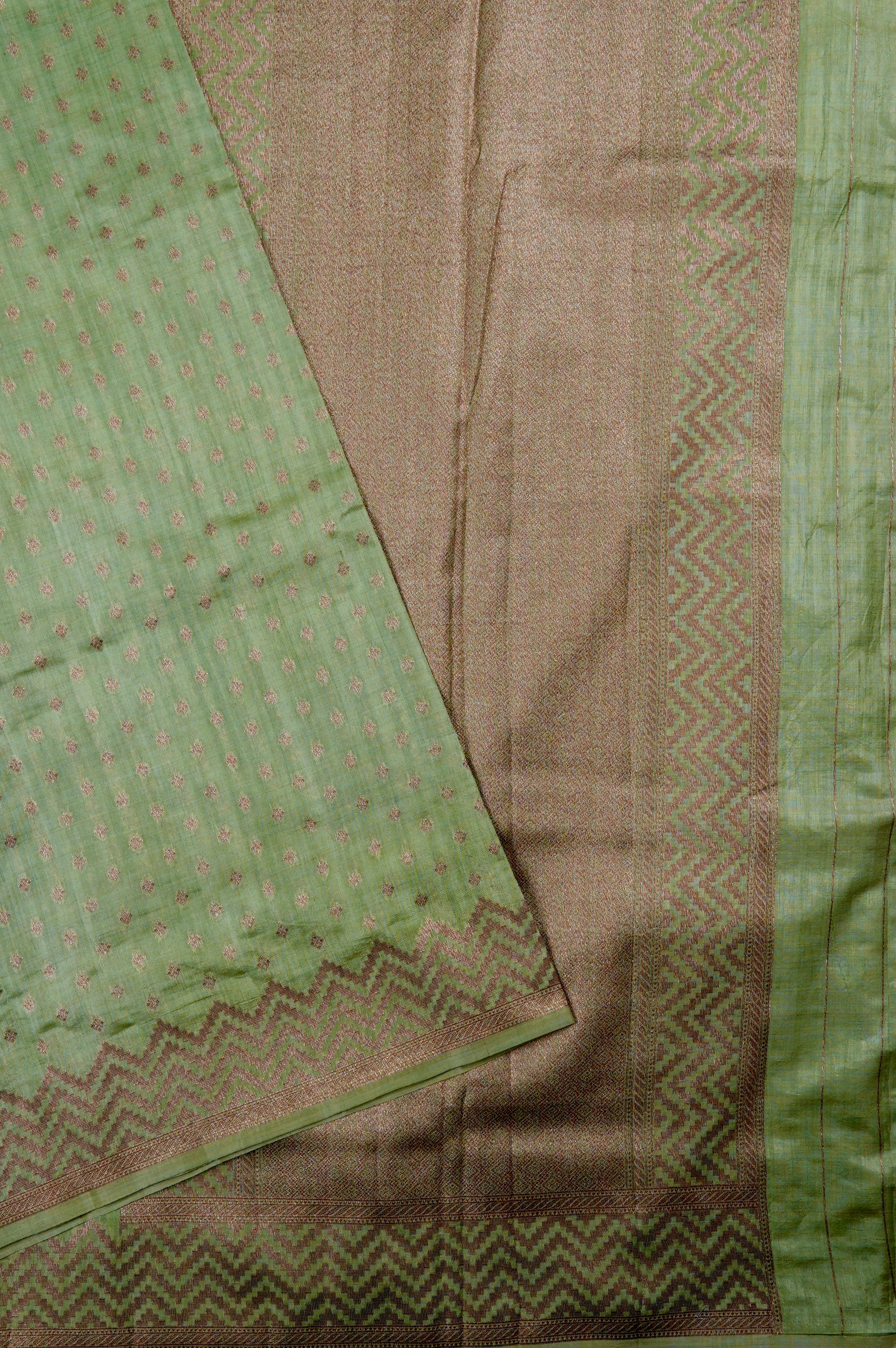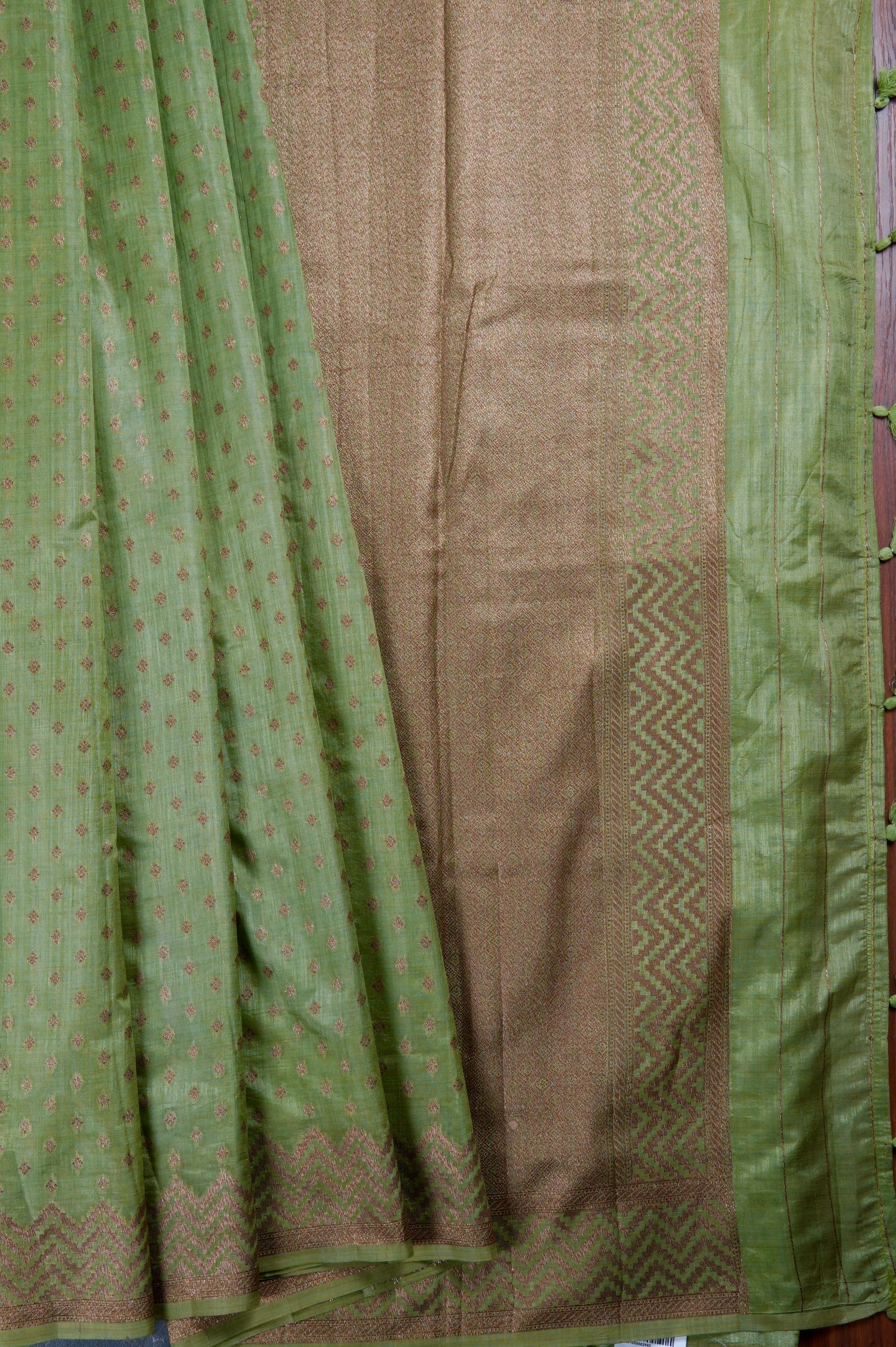 Previous NextSage green semi tussar saree with small diamond bhutta woven in zari throughout the body extending to a recurring diamond pattern border woven in zari, ending with a band of small diagonal stripes. The pallu has a rich weave of zari with repeating diamond patterns filled with zari work almost seeming like an expanse of gold, ending with the same border as the saree. The saree has a sage green blouse with small diamond bhuttas woven in zari and the same border.