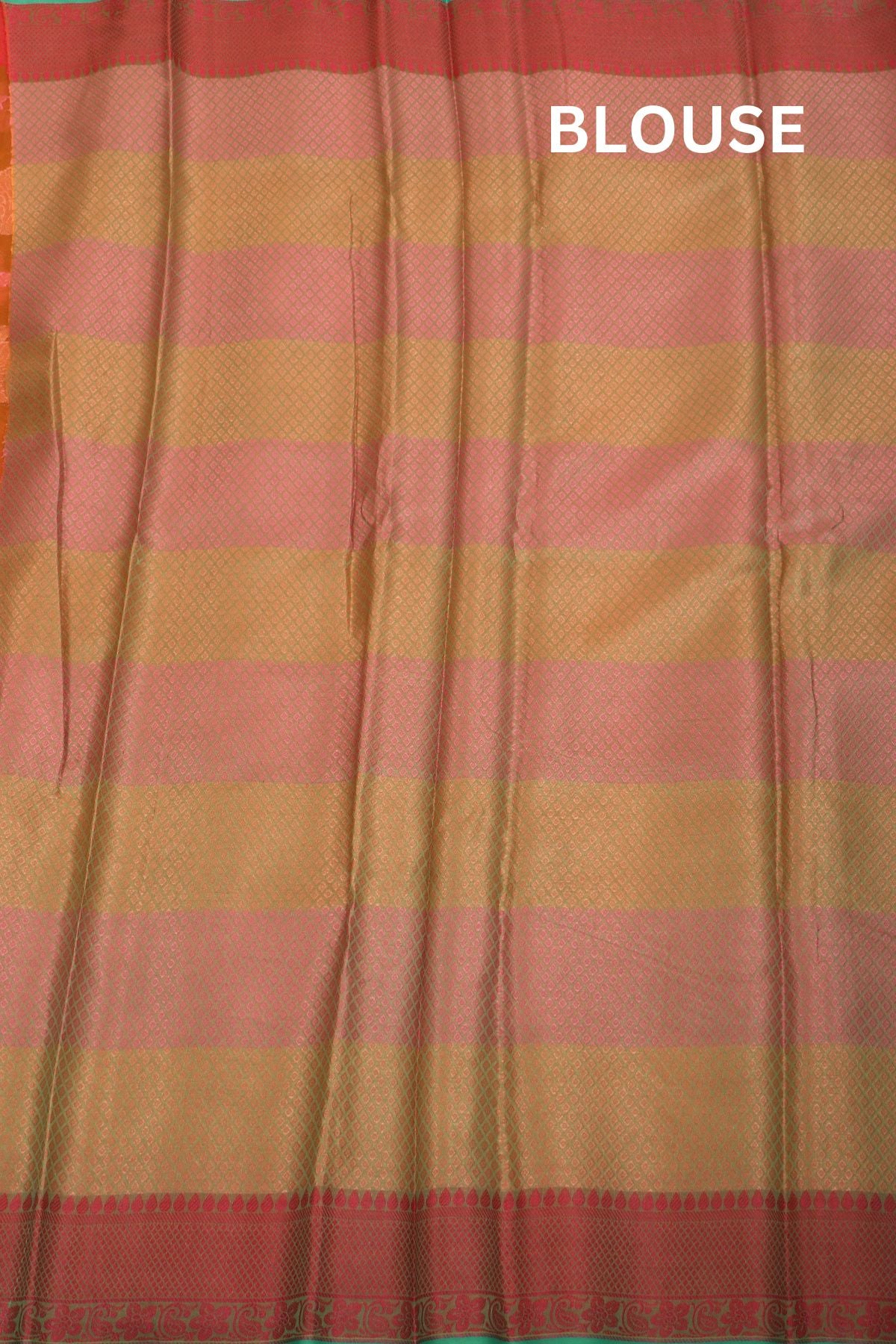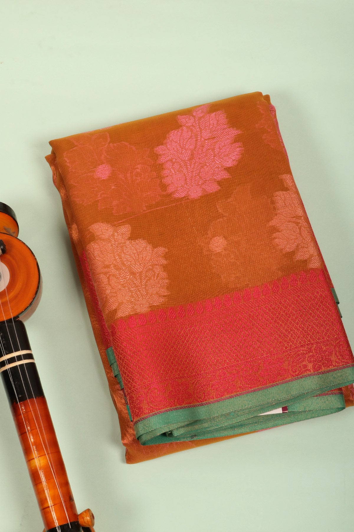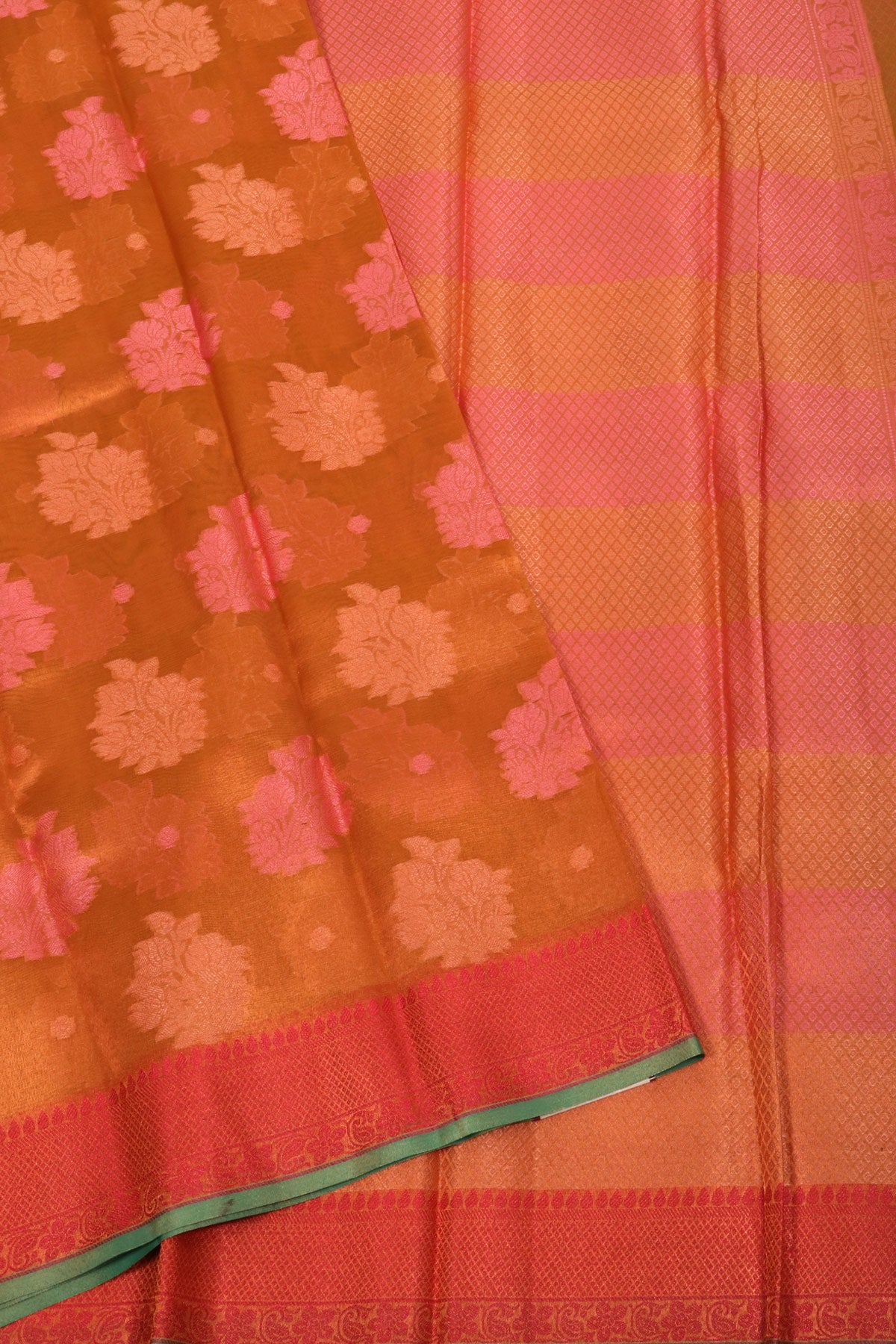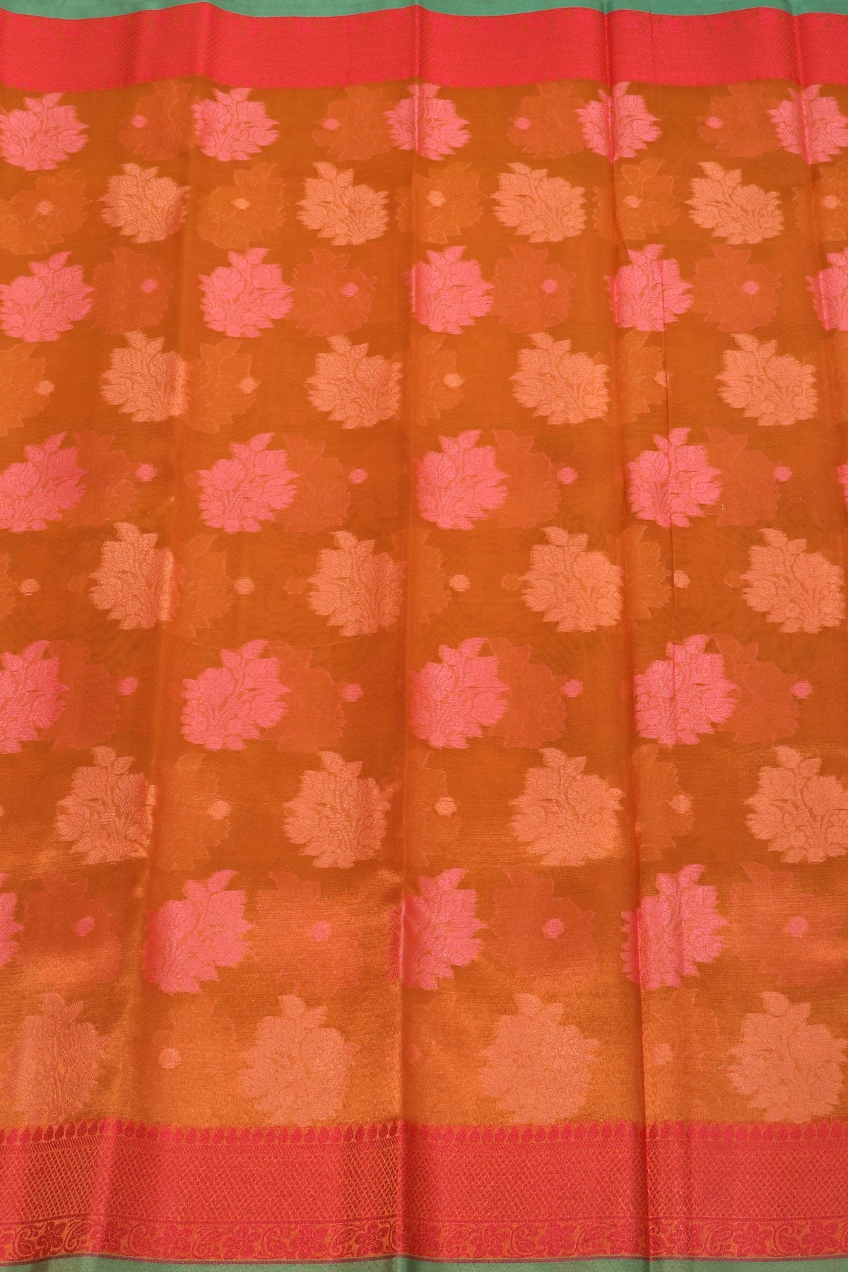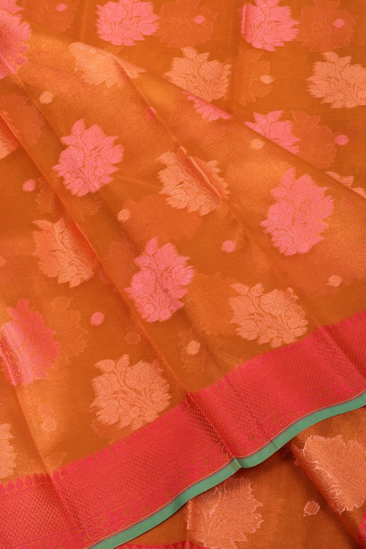Previous NextSquash orange supernet saree with floral bhuttas alternating in gold and coloured zari, paired with a contrast pink border in coloured zari.