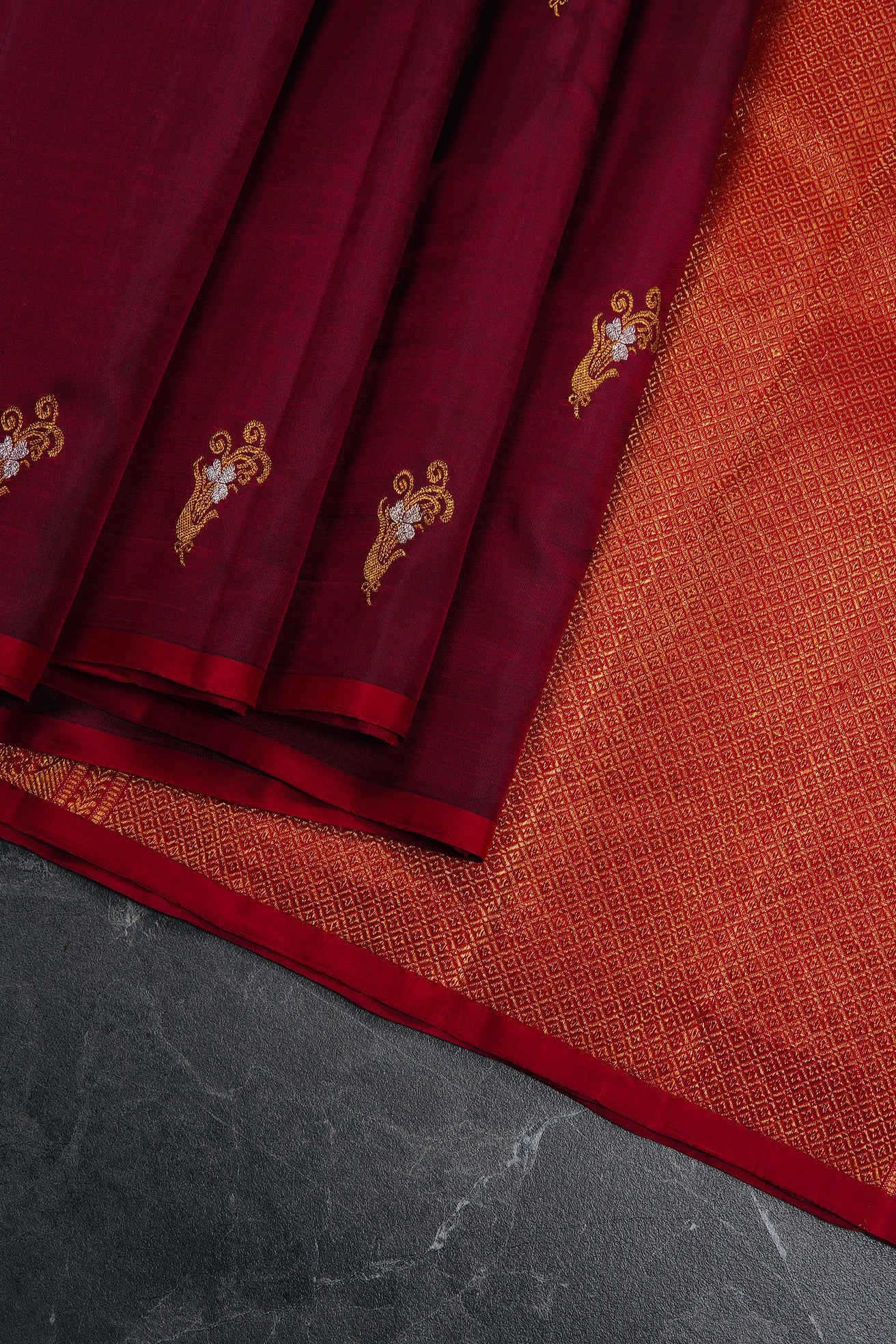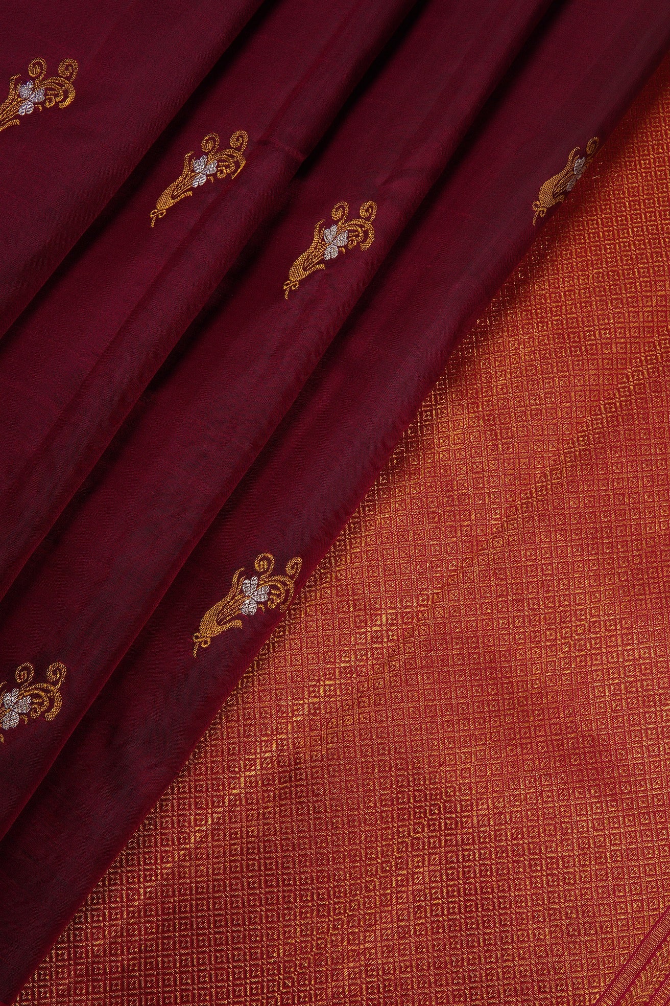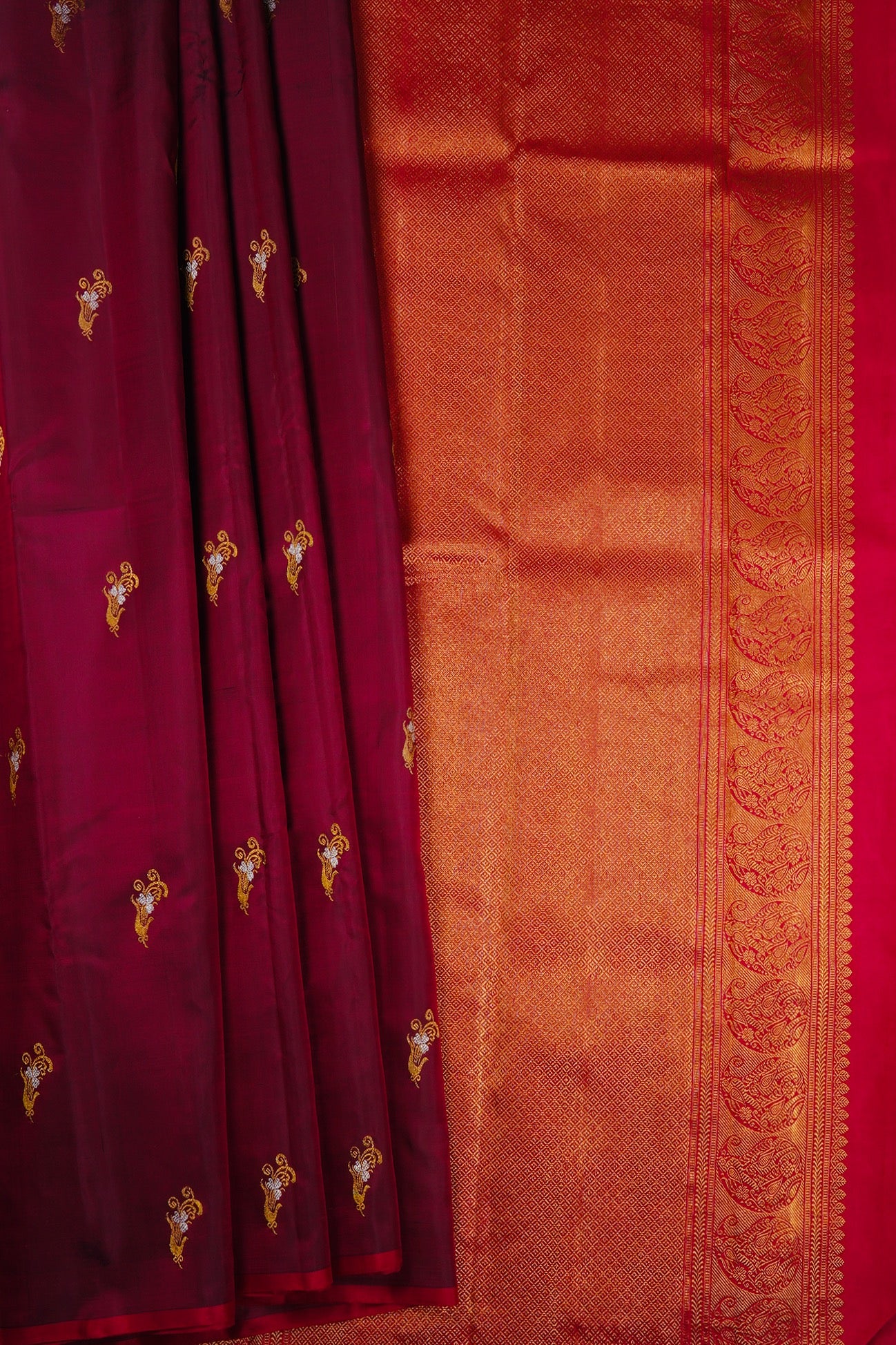 Burgundy Kanchipuram Silk Saree with stylised flower motifs woven in gold and silver zari throughout the body. The pallu has an intricate width of a grid patterns filled with motifs and ends with a band of stylised mango bhuttas woven in gold zari on a bright pink base. The saree has a solid raspberry pink blouse.