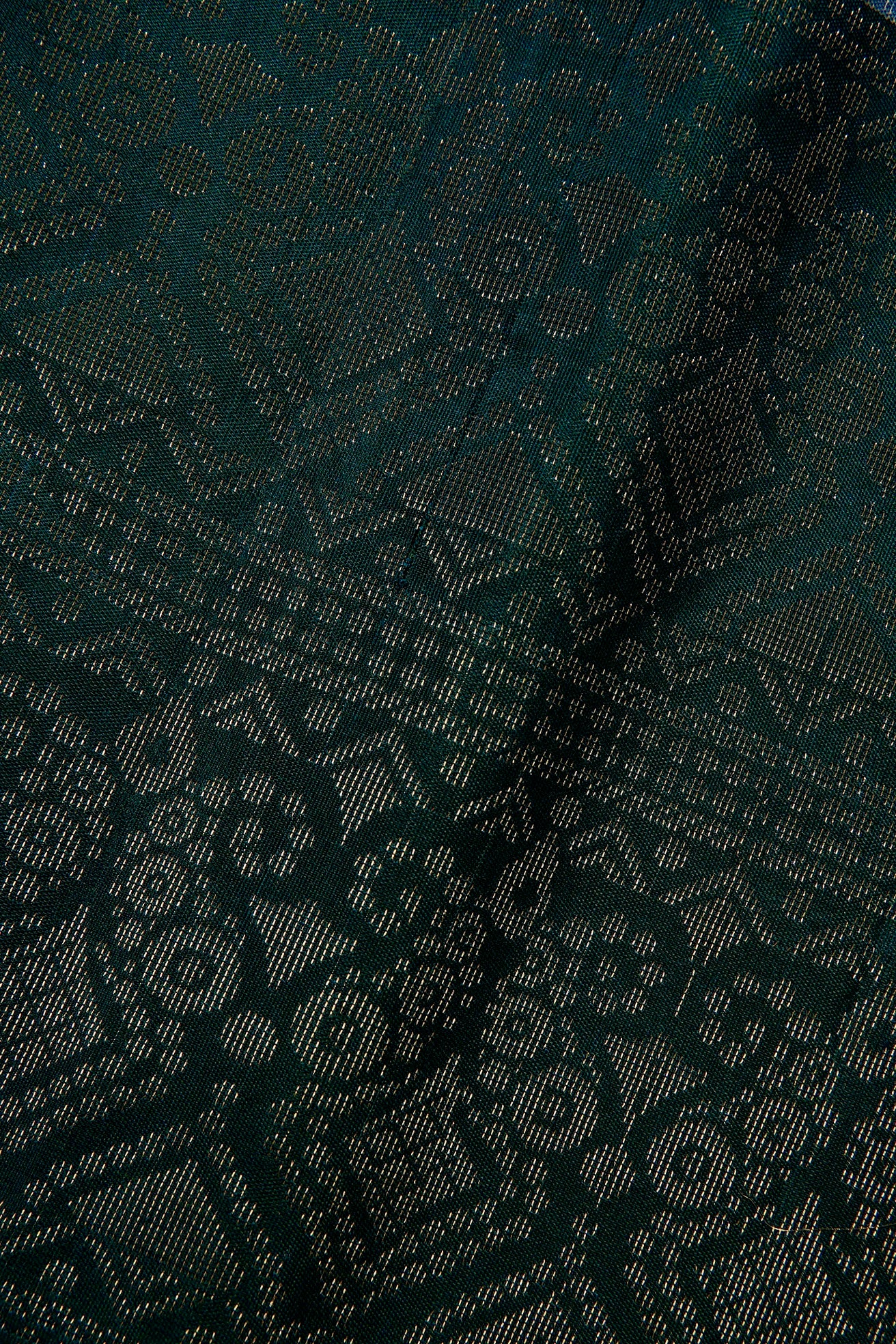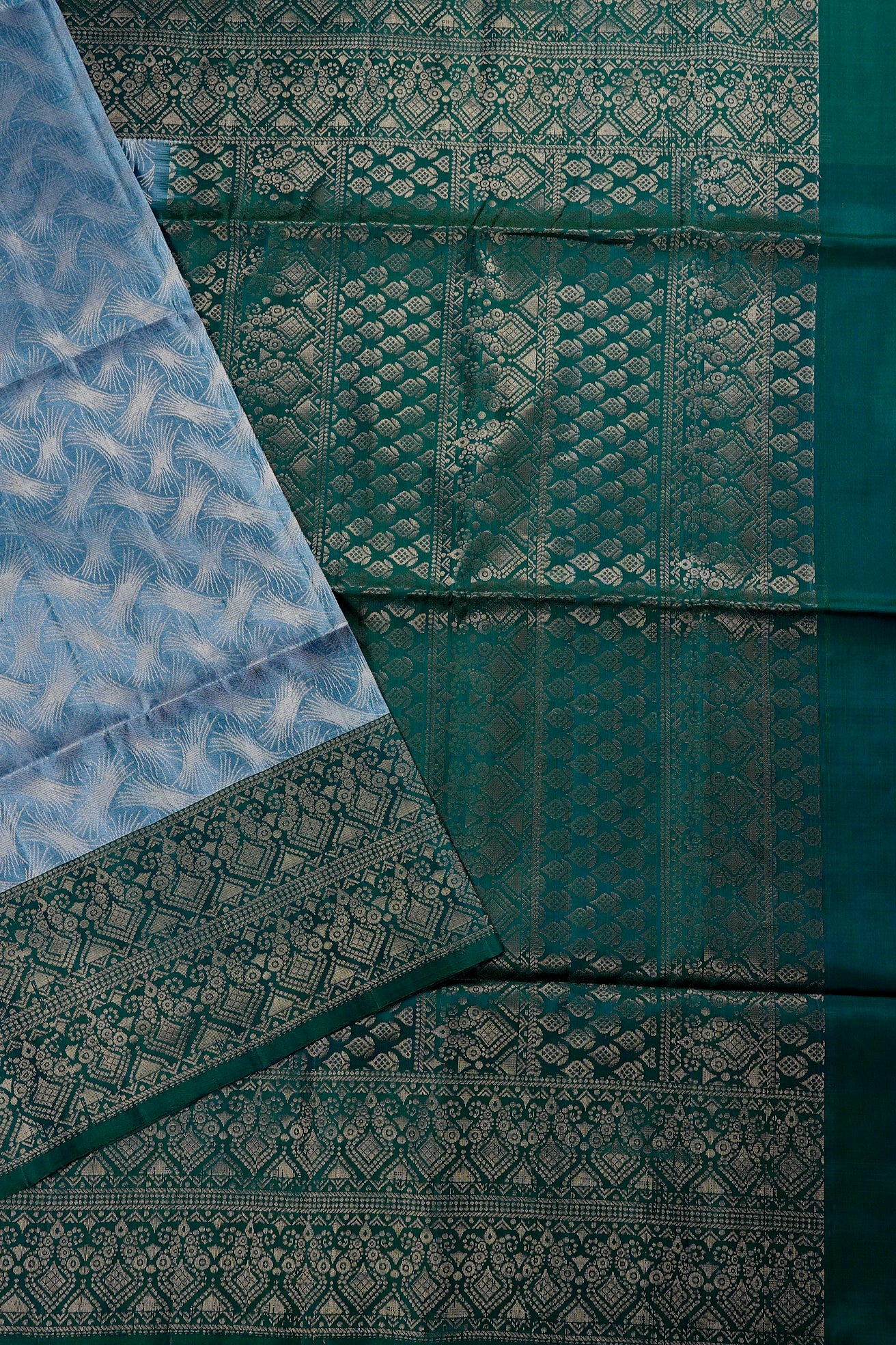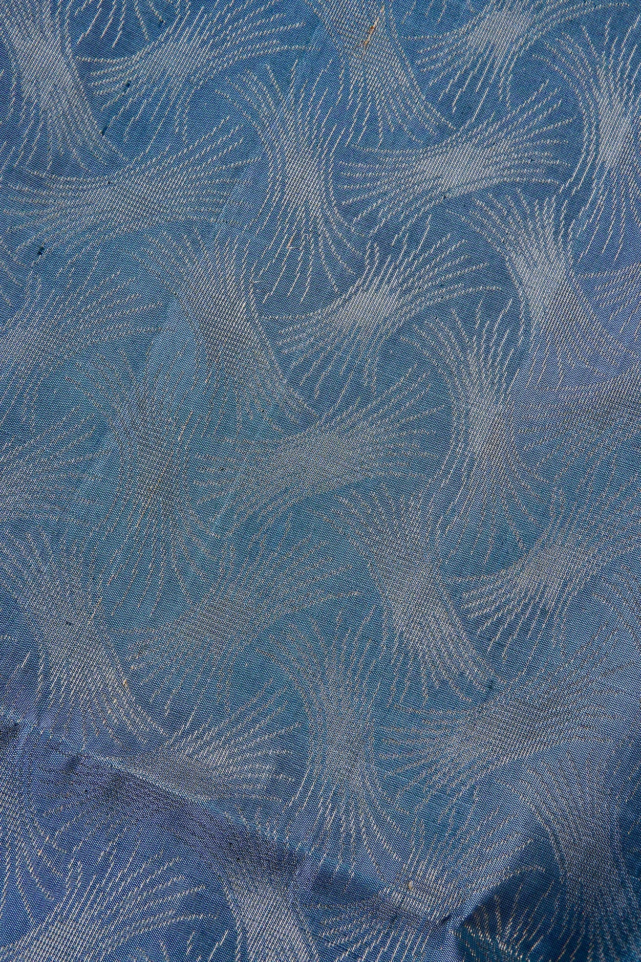 Previous NextA balanced soft silk saree with an ice blue body, filled with intricate hair like extensions looking like withered parts of a flower forming a american smocking-inspired pattern woven in zari. The border is dark teal with two repeating layers of beautifully woven petal patterns extending into a twirling opening formed by mango bhuttas in gold zari. The pallu too, has a dark teal base alternatively holding bands of the border patterns and a series of plant motifs woven in gold zari. The saree has a solid dark teal blouse.