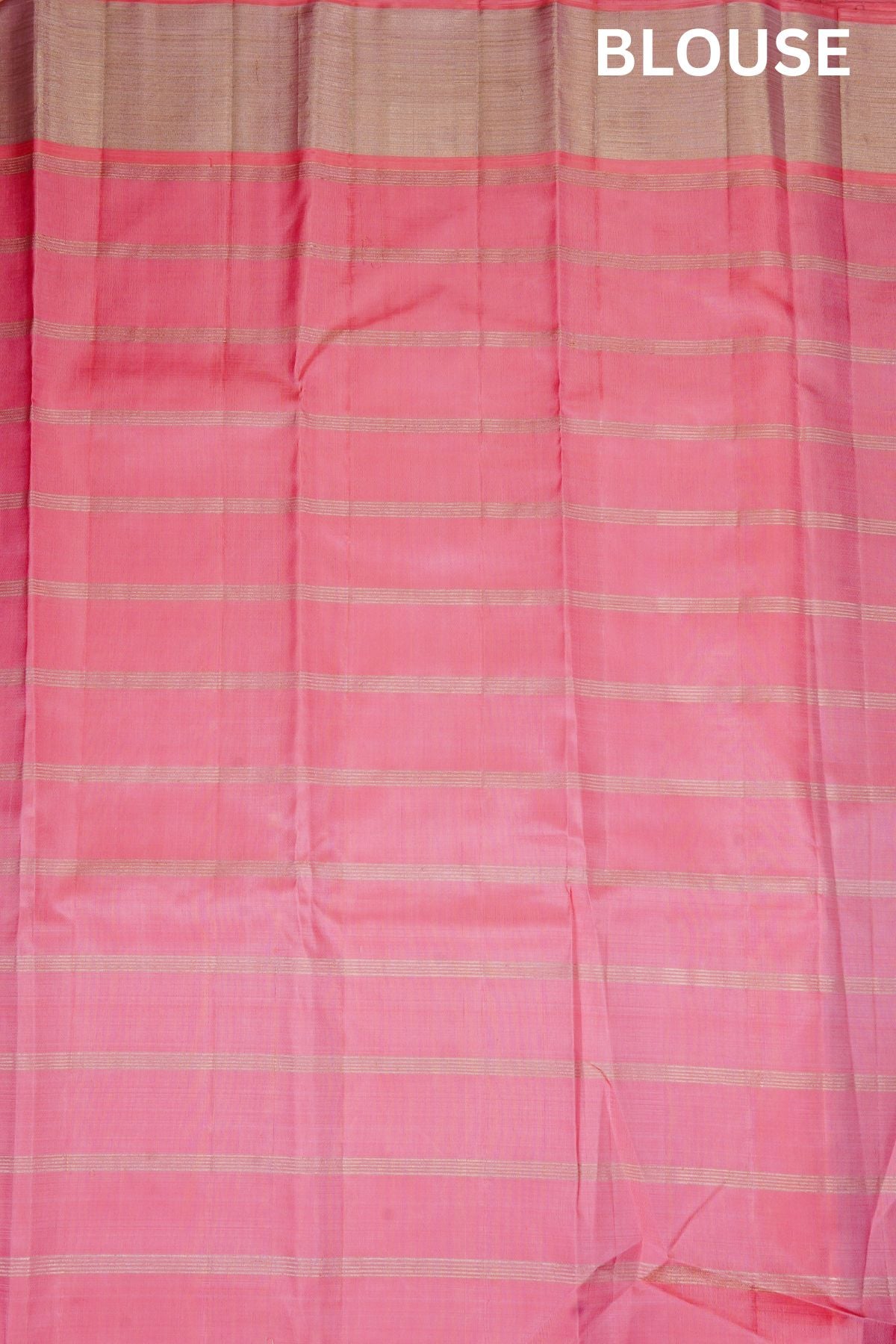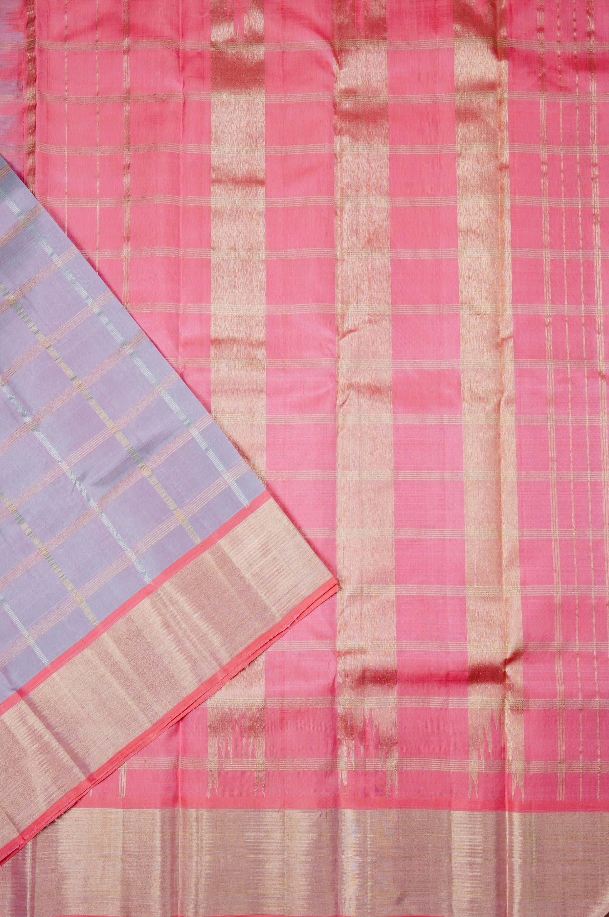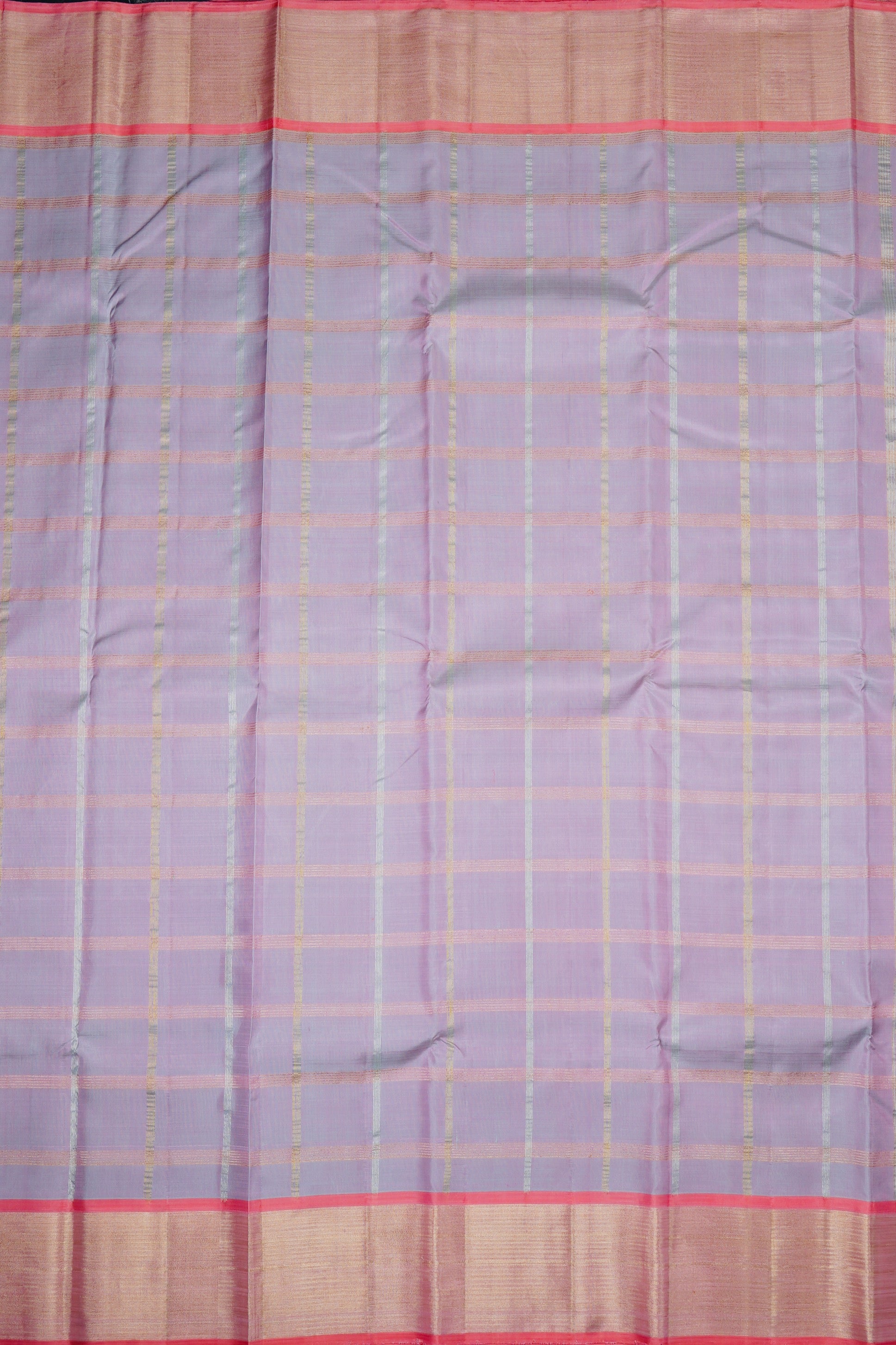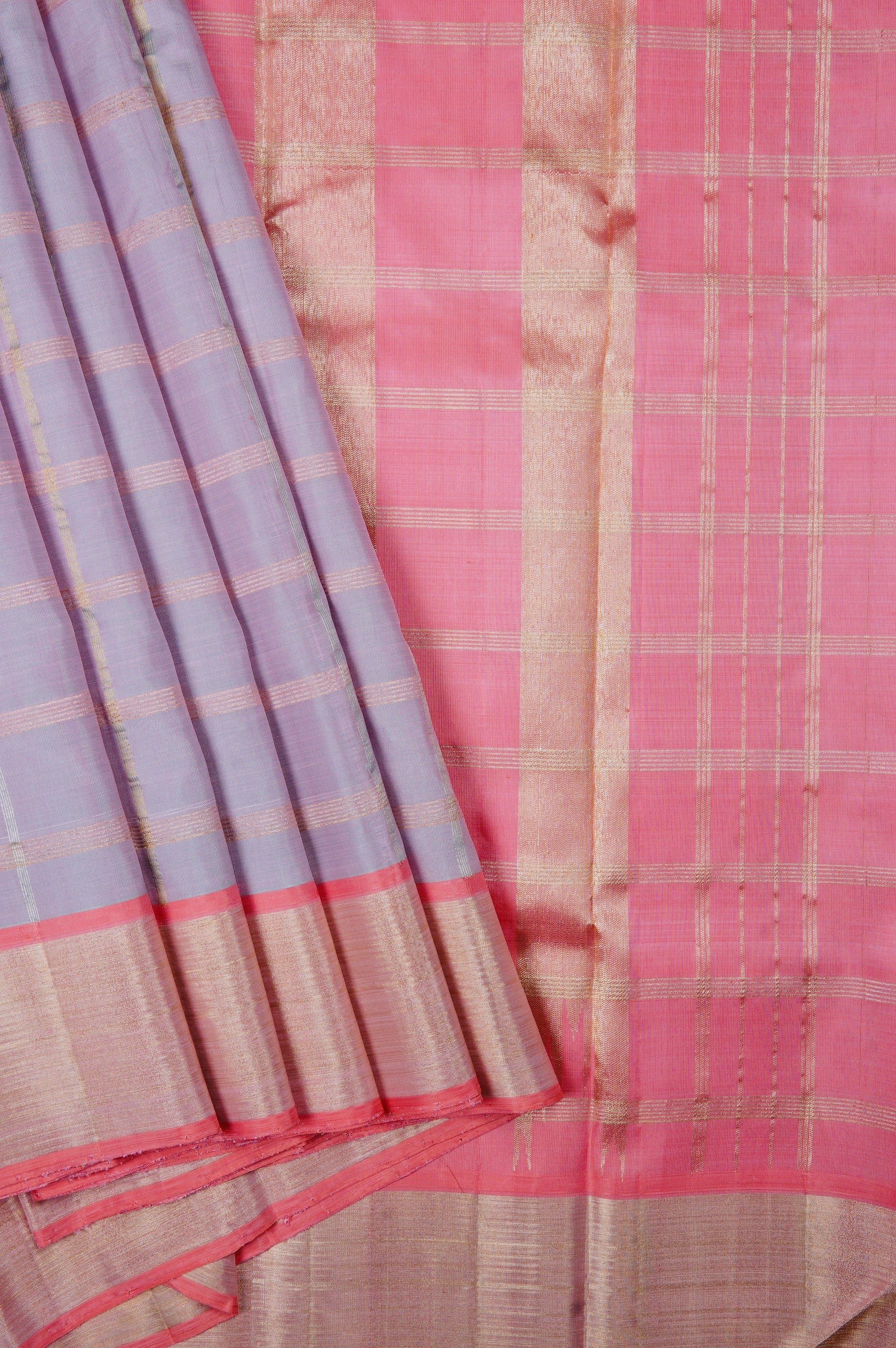 Powder purple kanchipuram silk saree with series of vertical silver zari lines and horizontal gold zari lines forming broad checks throughout the body, with a wide band of zari bound by two small bands of blush pink as its border. The pallu has a blush pink base with vertical bands of gold zari and horizontal zari lines. The saree has a blush pink blouse with horizontal zari lines and the same border.