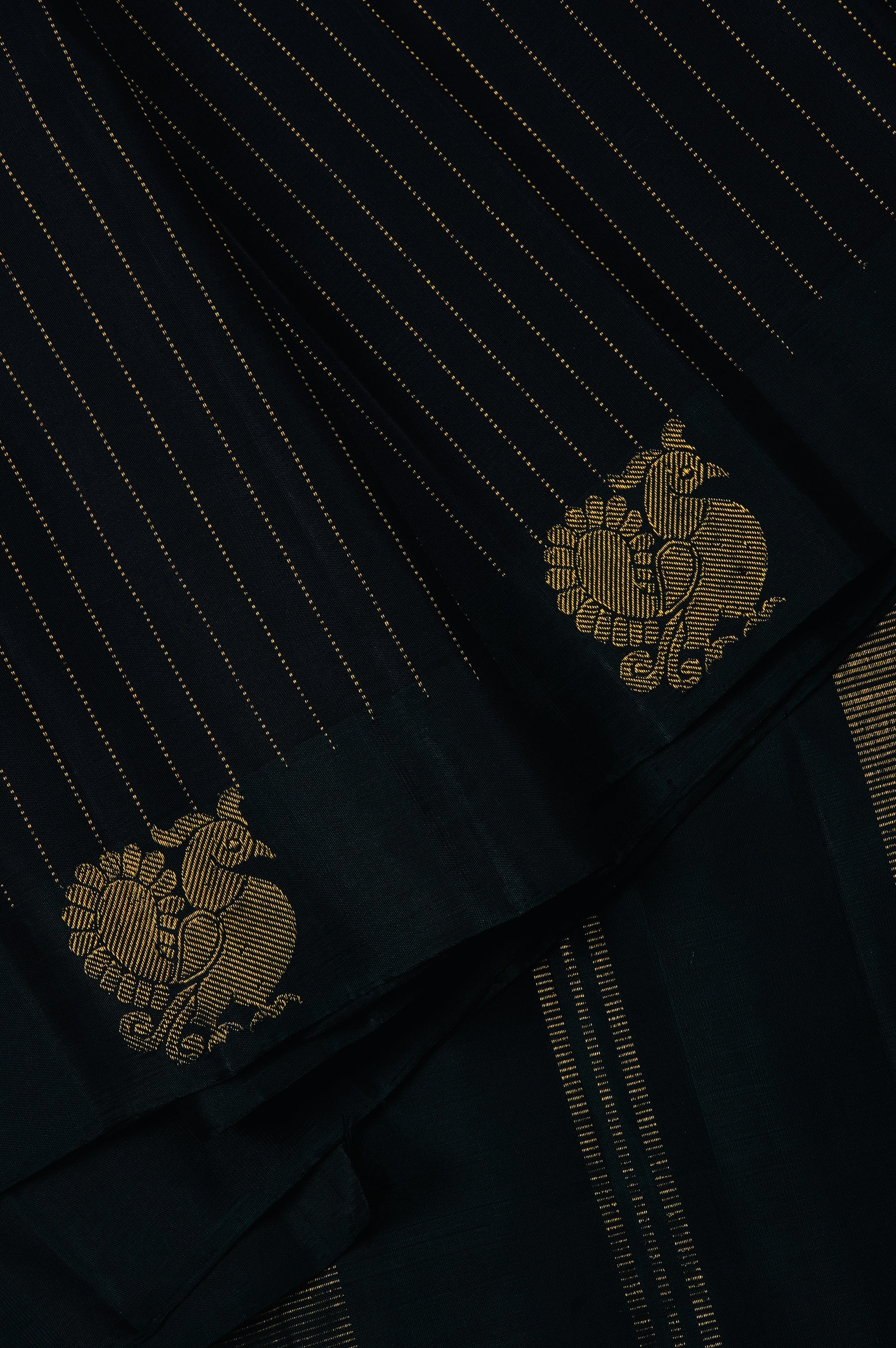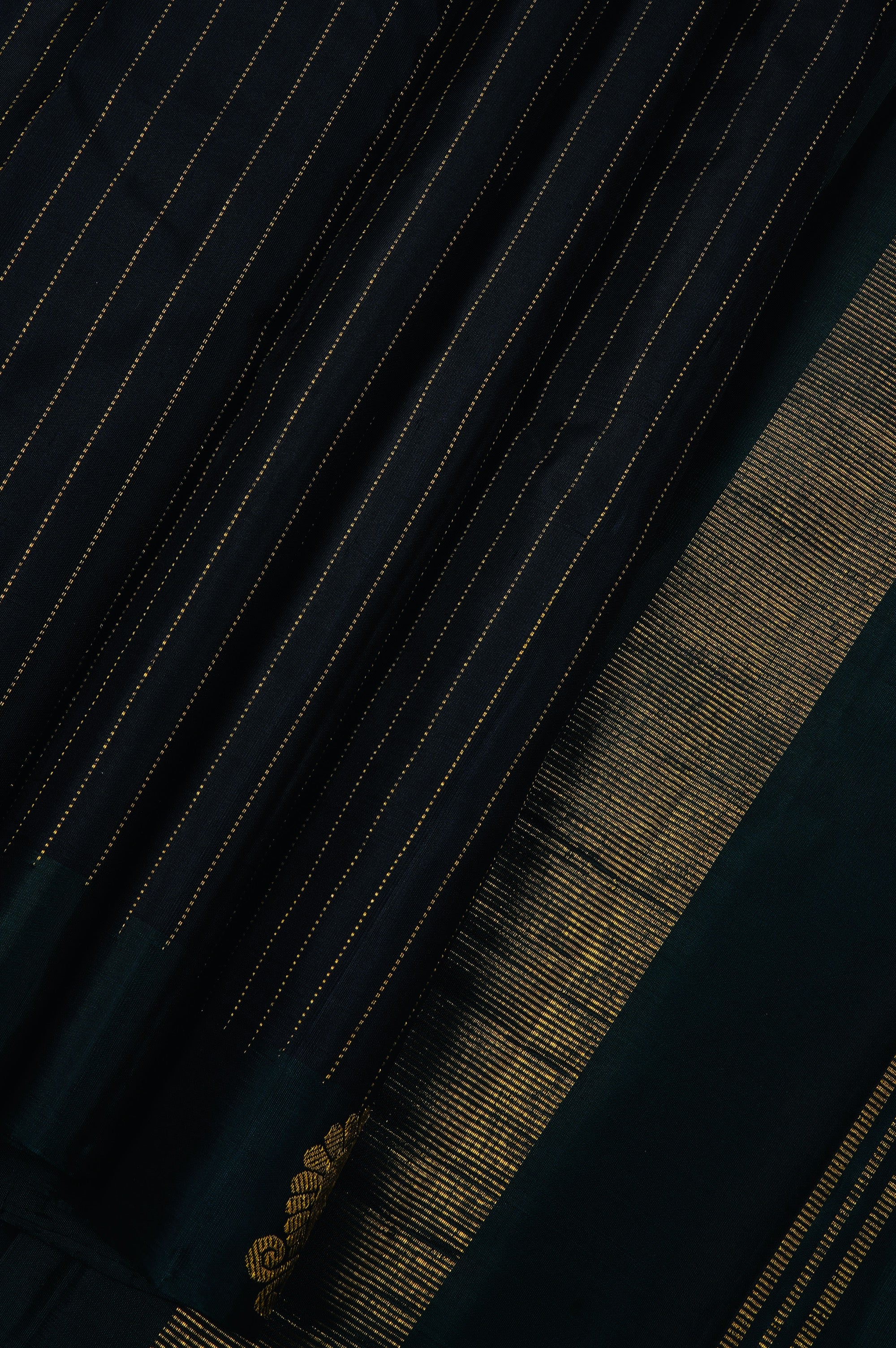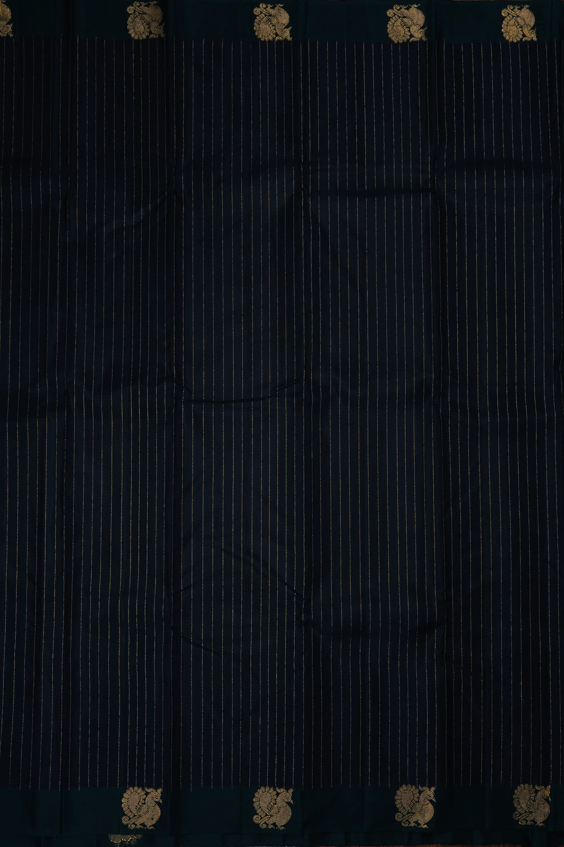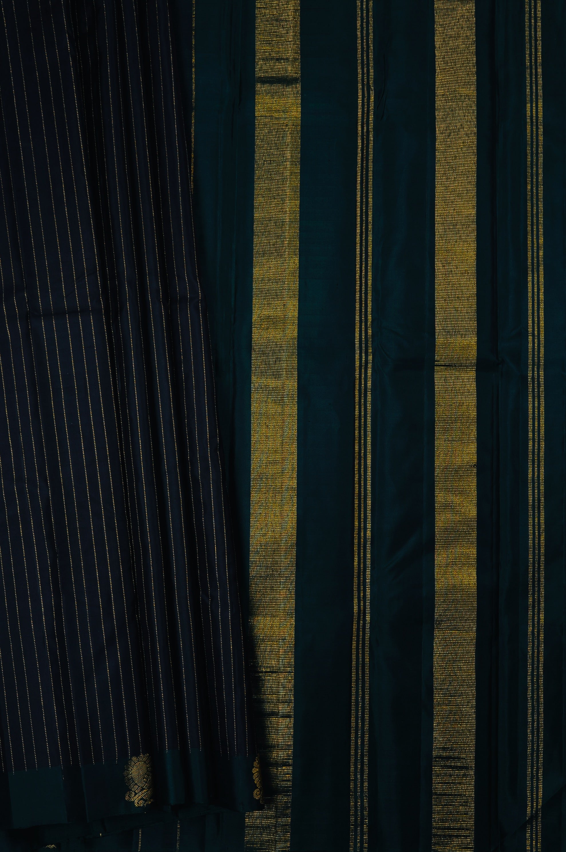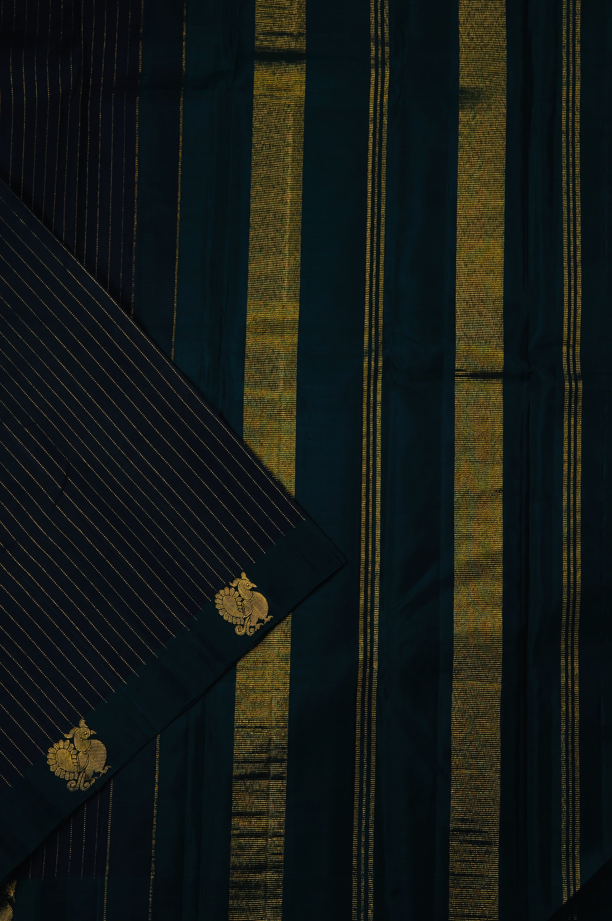 Previous NextPrestige blue kanchipuram silk saree with vaira oosi woven in gold zari and a daintree border with peacock motifs woven in gold zari. The pallu has a daintree base with gold zari bands in varying widths. The saree has a plain daintree blouse.