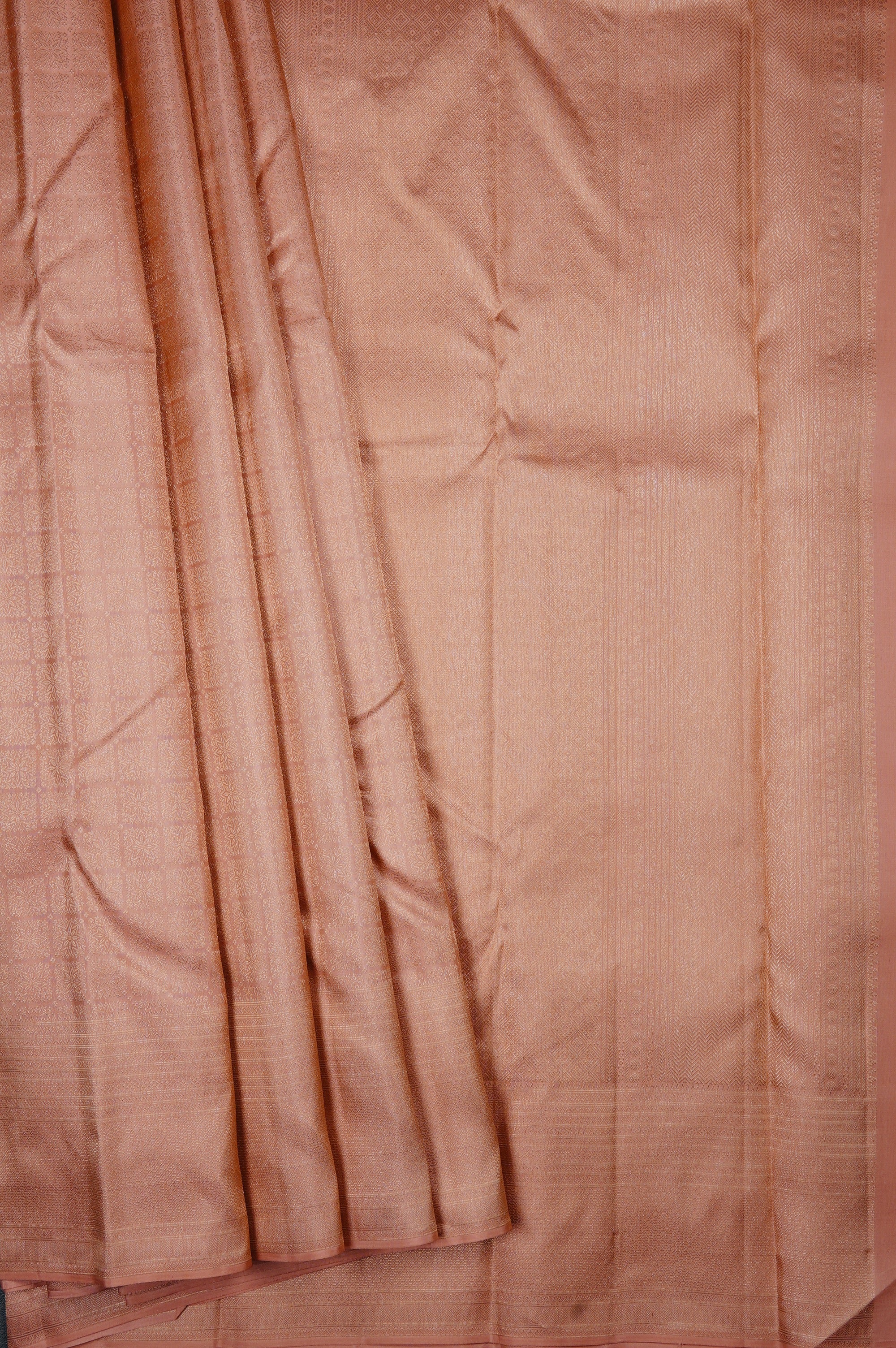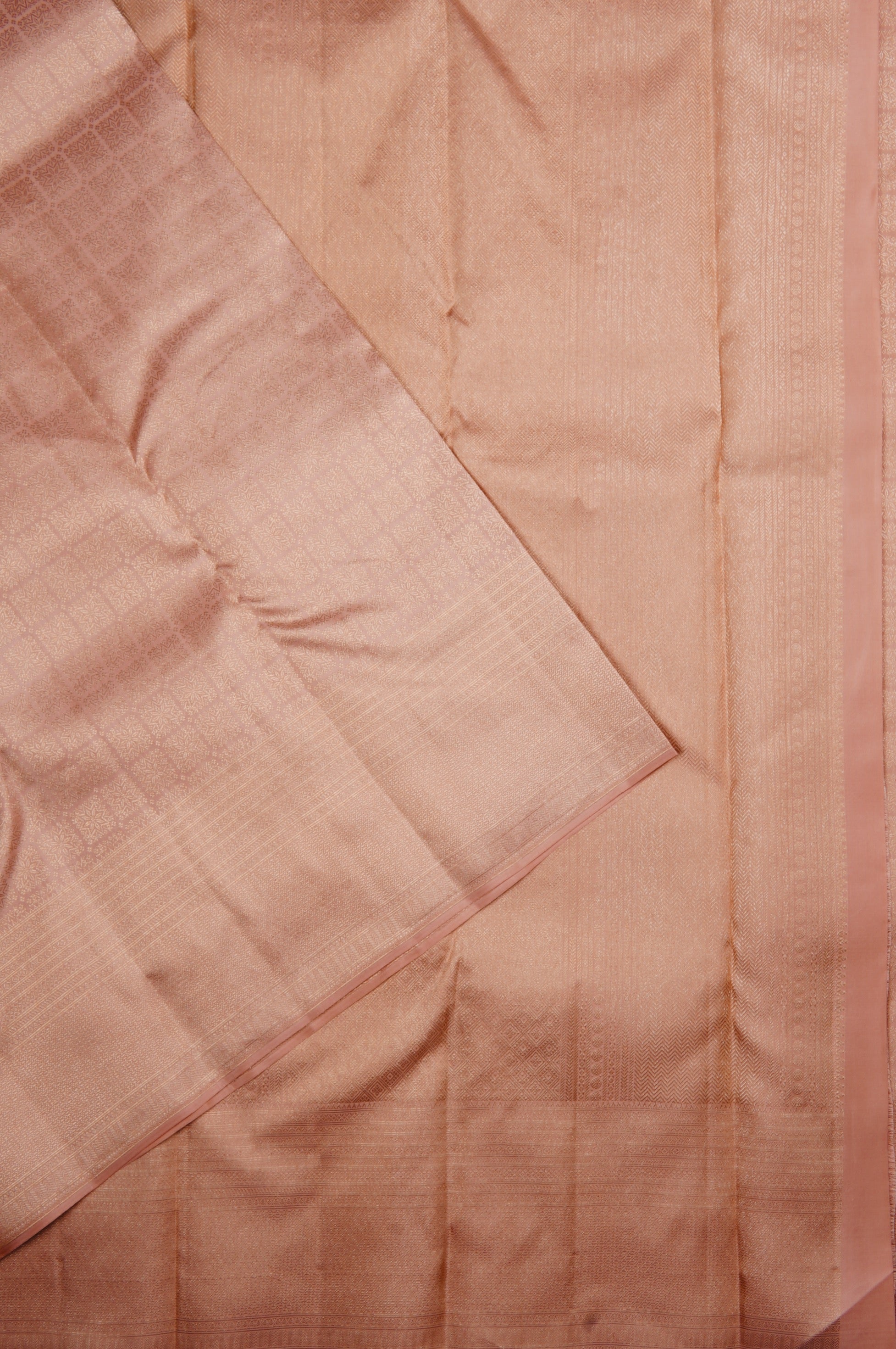 Previous NextBaby pink kanchipuram silk saree with sharp floral motifs bound by small diamond motifs seemingly bound by a square woven in zari, creating an illusion of checks in the negative spaces. The border has a series of bands of motifs including diamonds, stylised triangles, arrows and a wide band of zari work. The pallu has a wide area of diamond grid work enclosing stylised concentric diamonds, followed by a band of neli pattern bound by strips of diamonds, rudraksham bhuttas, arrows and circular bhuttas woven in zari. The saree has a baby pink blouse with very intricate diamond grids woven in zari with the same border.