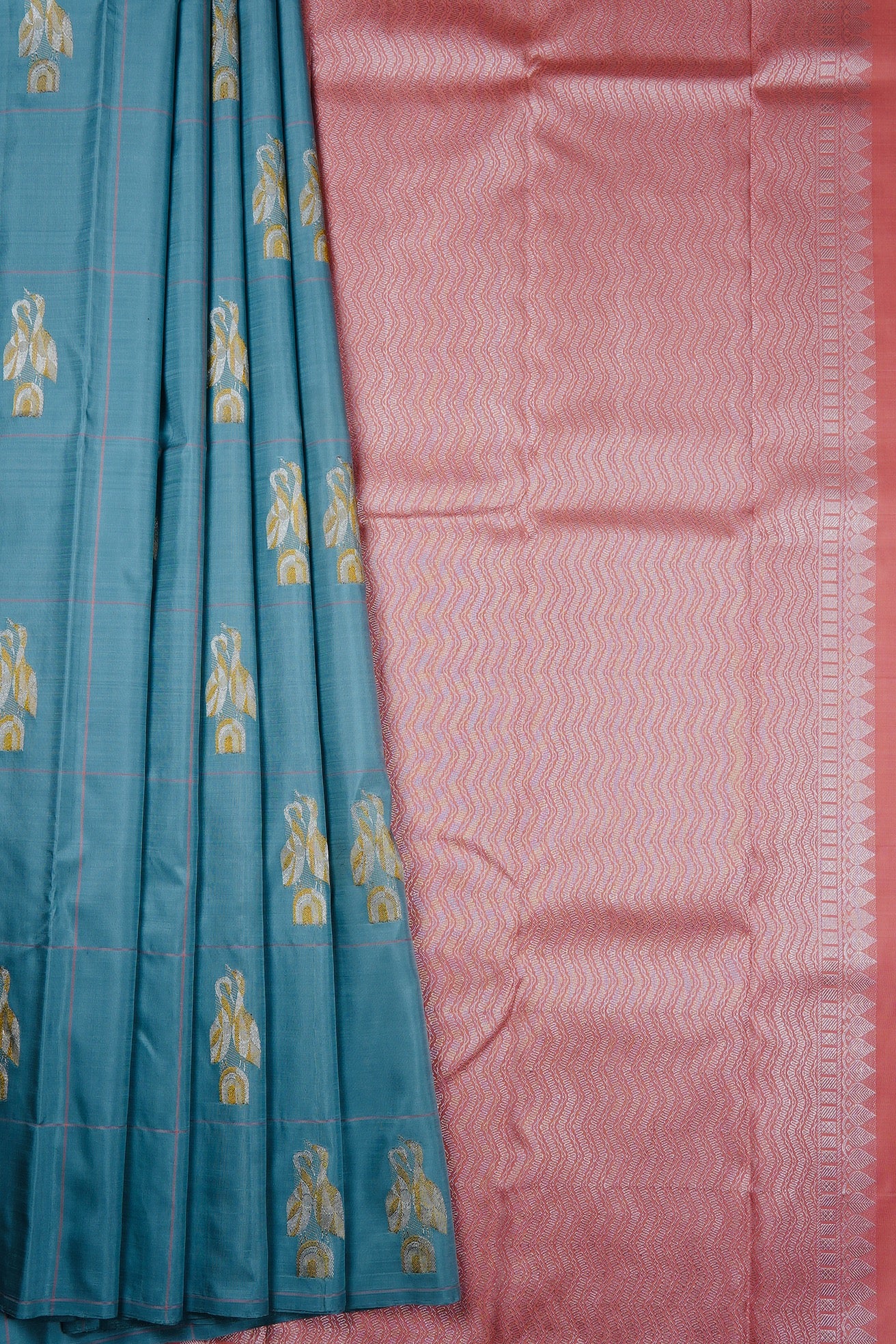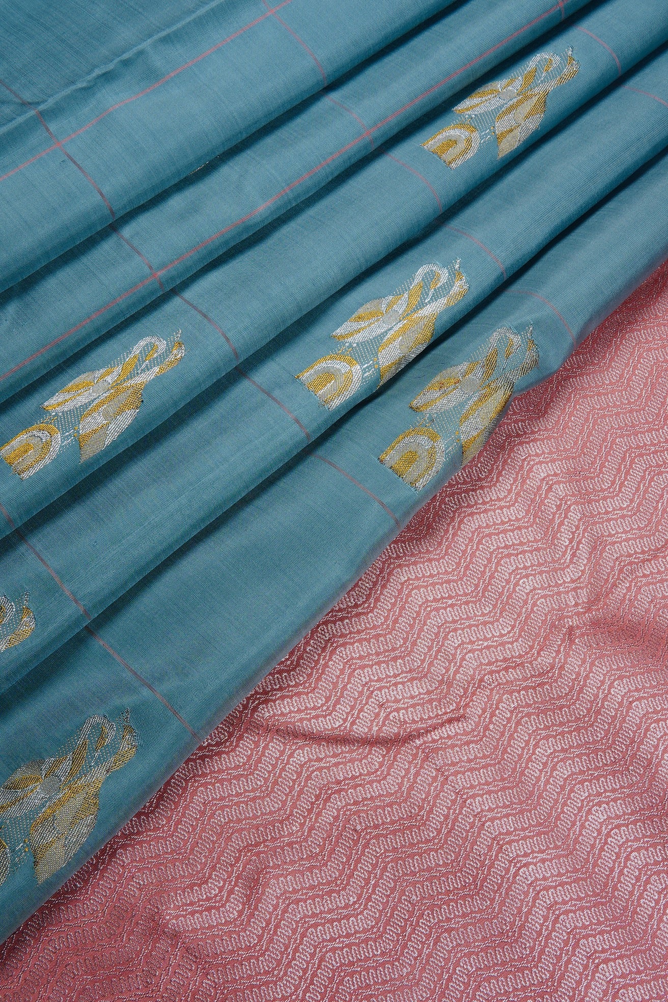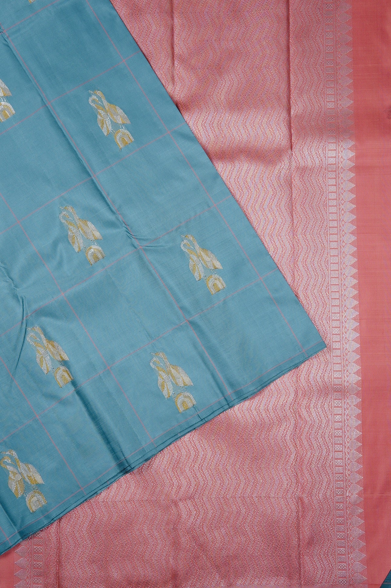 Previous NextCornflower blue Kanchipuram Silk Saree with broad checks woven in blush pink threads and motifs resembling two storks together woven in gold and silver zari. The pallu has a blush pink base with tangled and cruvey lined forming waves throughout woven in gold and silver zari followed by thin bands of stripes and continuous thilakam bhuttas woven in silver zari. The saree has a plain blush pink blouse.