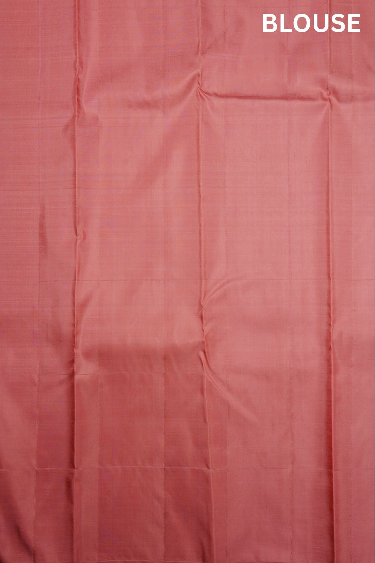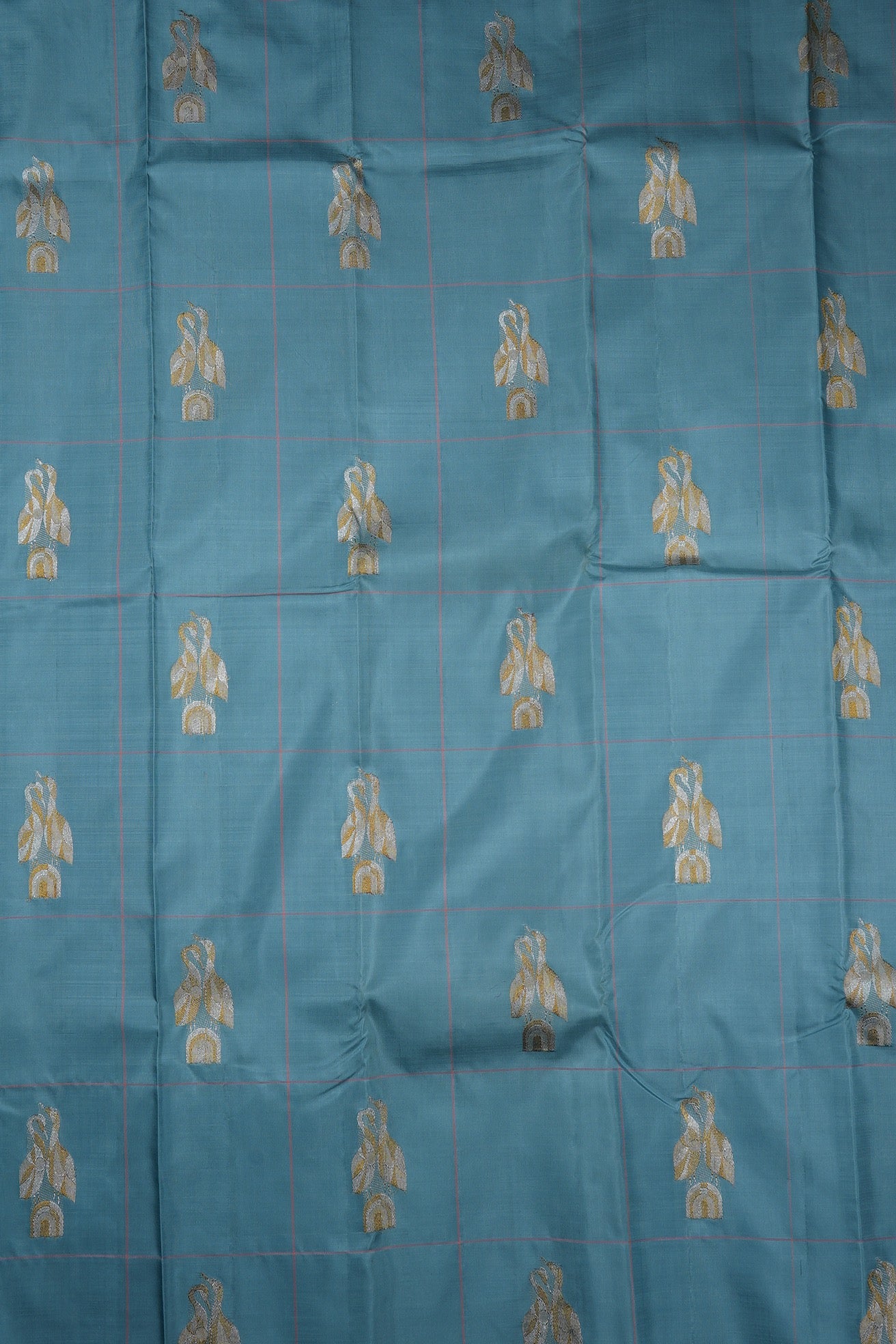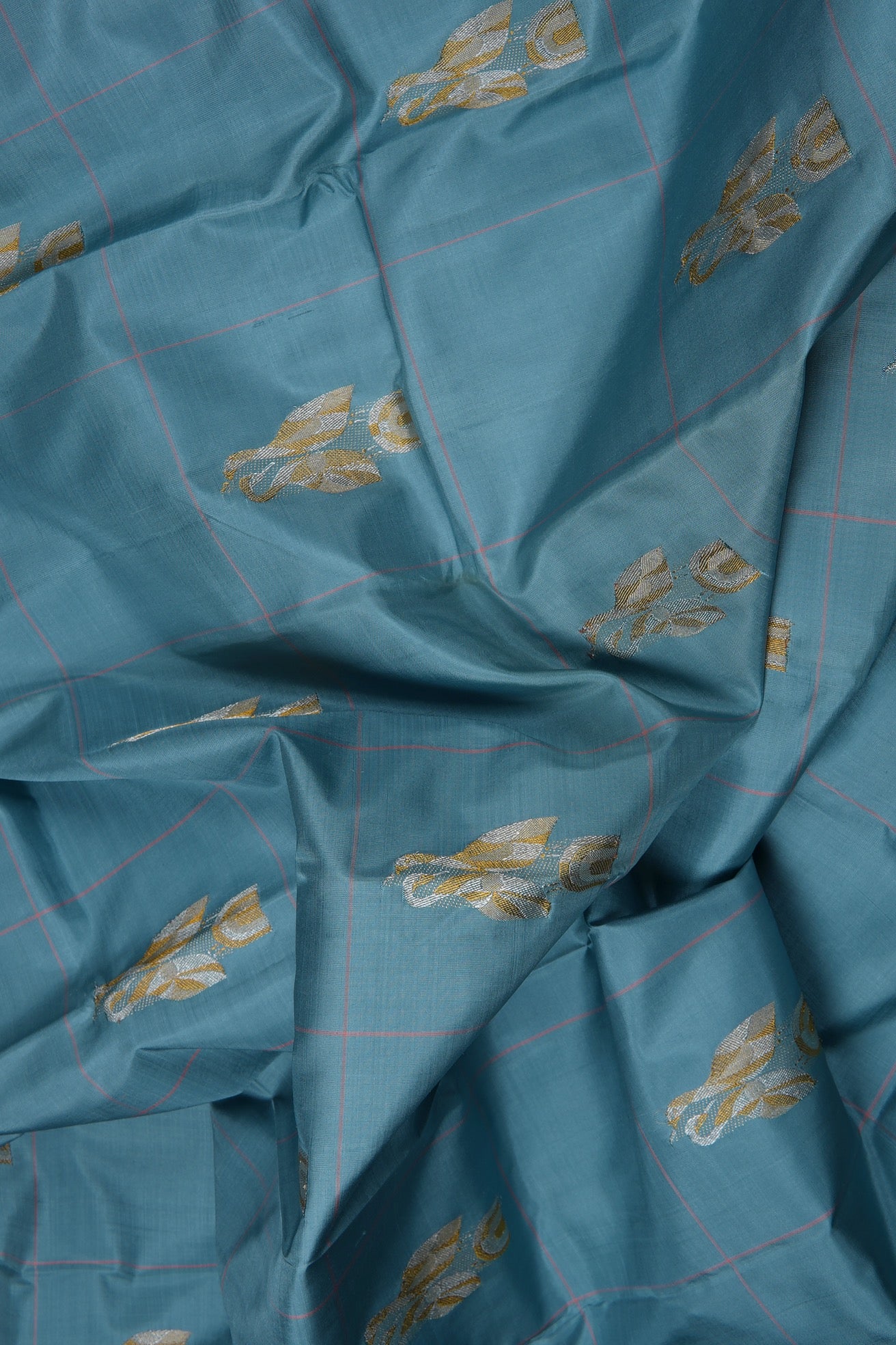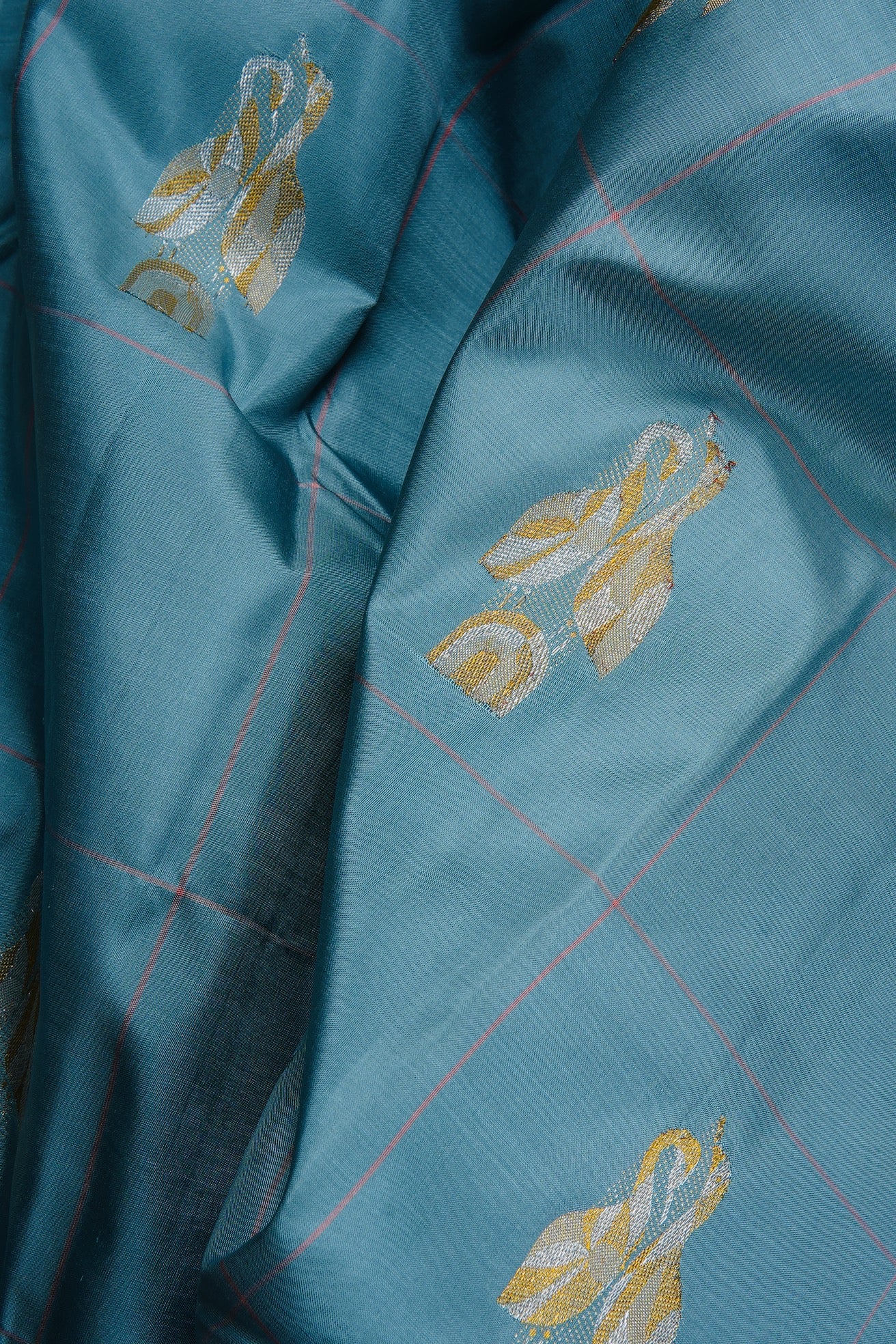 Previous NextCornflower blue Kanchipuram Silk Saree with broad checks woven in blush pink threads and motifs resembling two storks together woven in gold and silver zari. The pallu has a blush pink base with tangled and cruvey lined forming waves throughout woven in gold and silver zari followed by thin bands of stripes and continuous thilakam bhuttas woven in silver zari. The saree has a plain blush pink blouse.