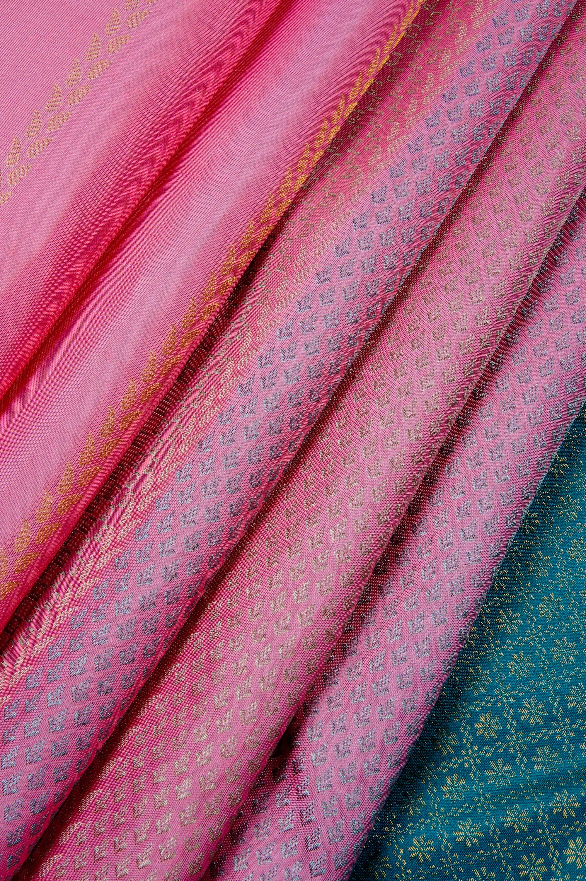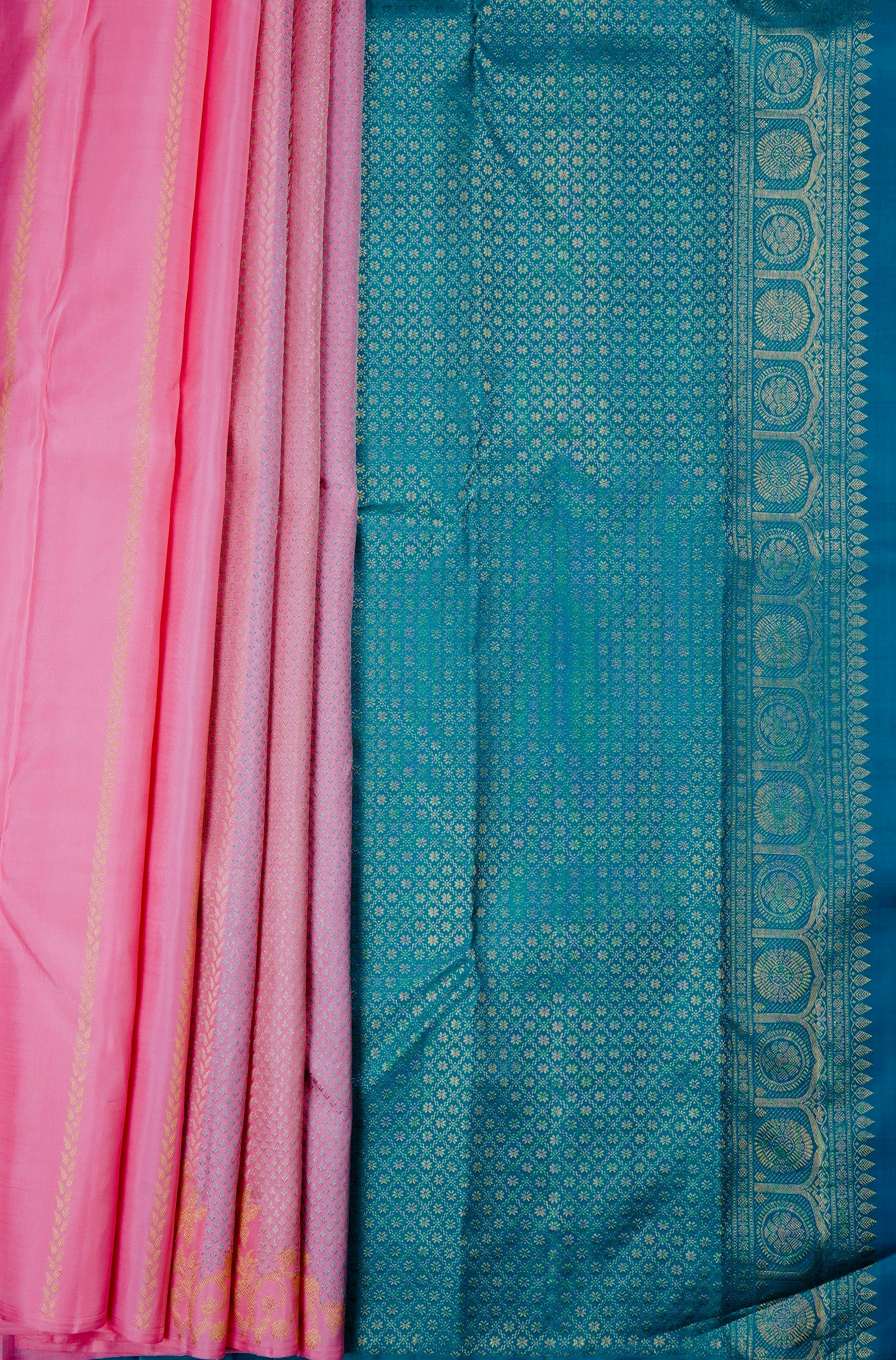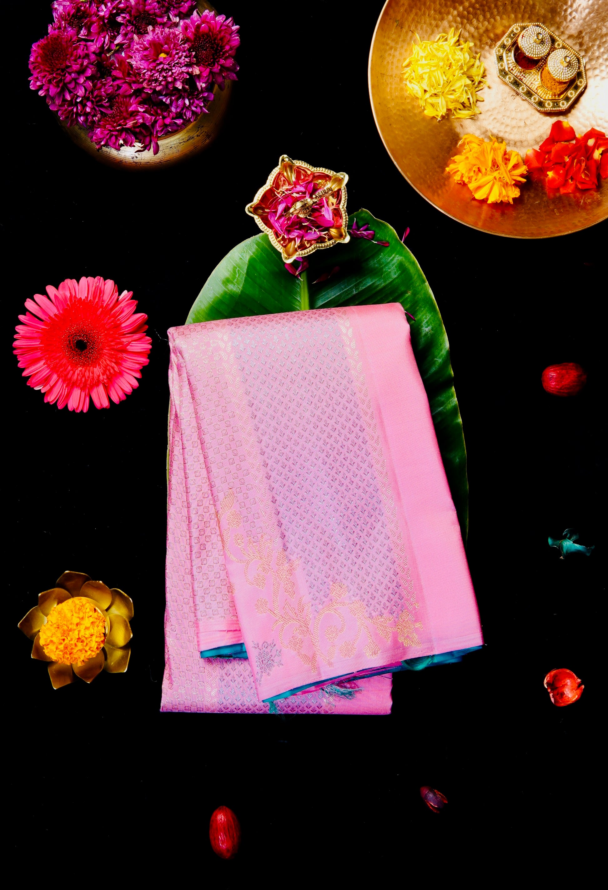 Previous NextLight pink kanchipuram silk saree with strips of light pink and blush pink decorated with interlaced patterns and stylised diamonds, ending with floral patterns woven in gold and silver zari, each strip separated by a line of dual zari petals. The pallu has a fjord blue base with petal lines forming diamond grids, holding floral motifs, followed by a band of alternating diamond bhuttas and rudraksham bhuttas and a wide strip of grand frames holding intricate mandala motifs woven in gold zari. The saree has a plain fjord blue blouse.