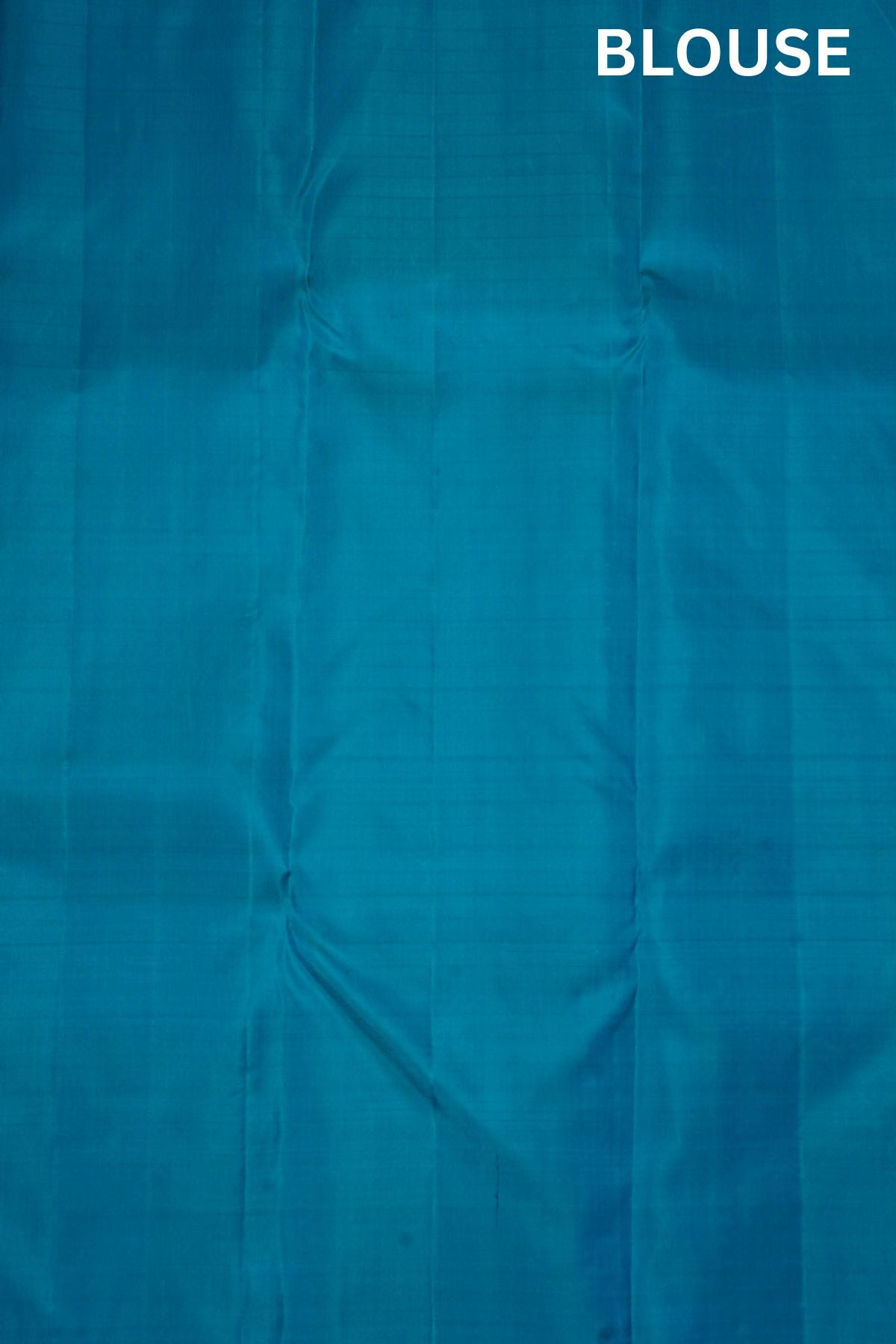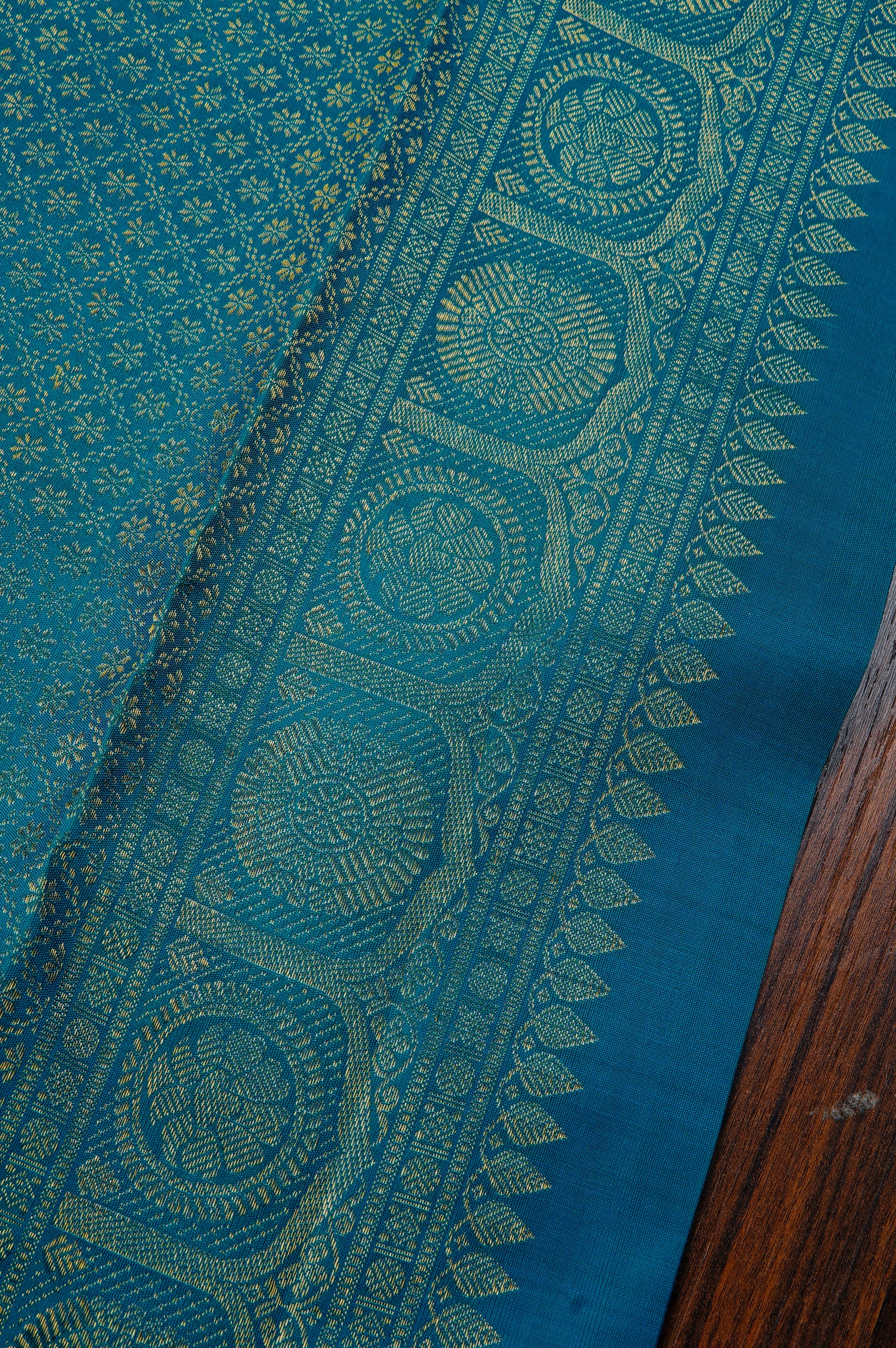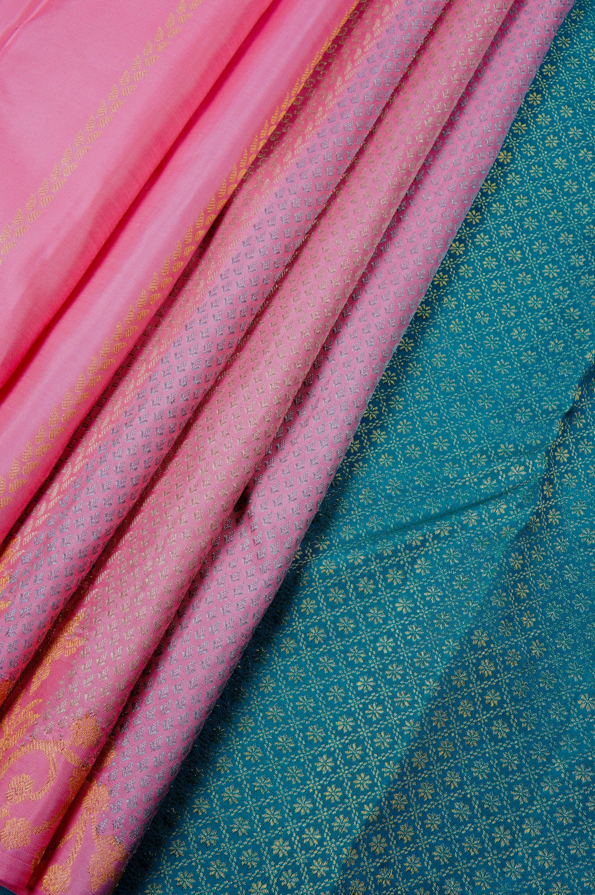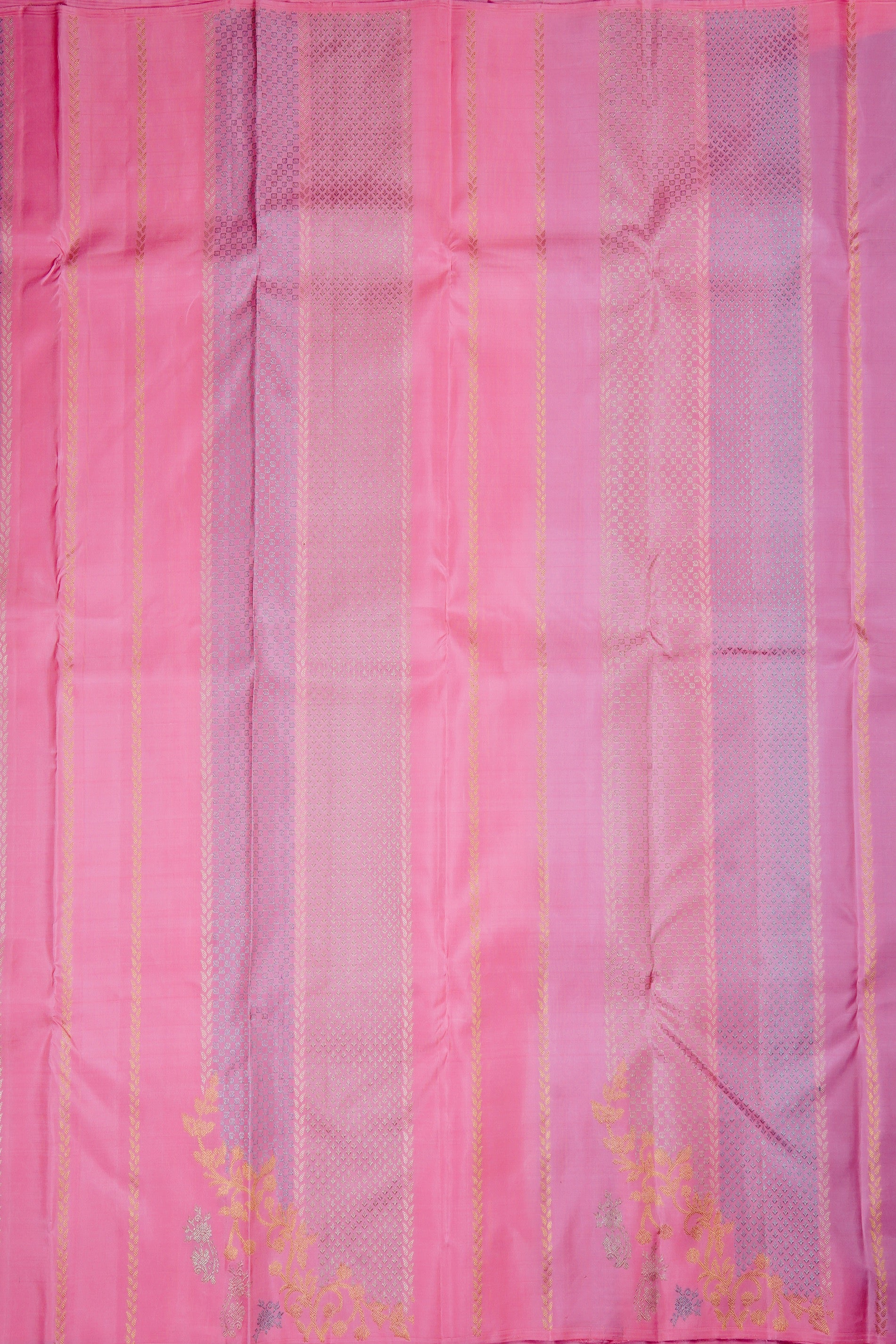 Previous NextLight pink kanchipuram silk saree with strips of light pink and blush pink decorated with interlaced patterns and stylised diamonds, ending with floral patterns woven in gold and silver zari, each strip separated by a line of dual zari petals. The pallu has a fjord blue base with petal lines forming diamond grids, holding floral motifs, followed by a band of alternating diamond bhuttas and rudraksham bhuttas and a wide strip of grand frames holding intricate mandala motifs woven in gold zari. The saree has a plain fjord blue blouse.