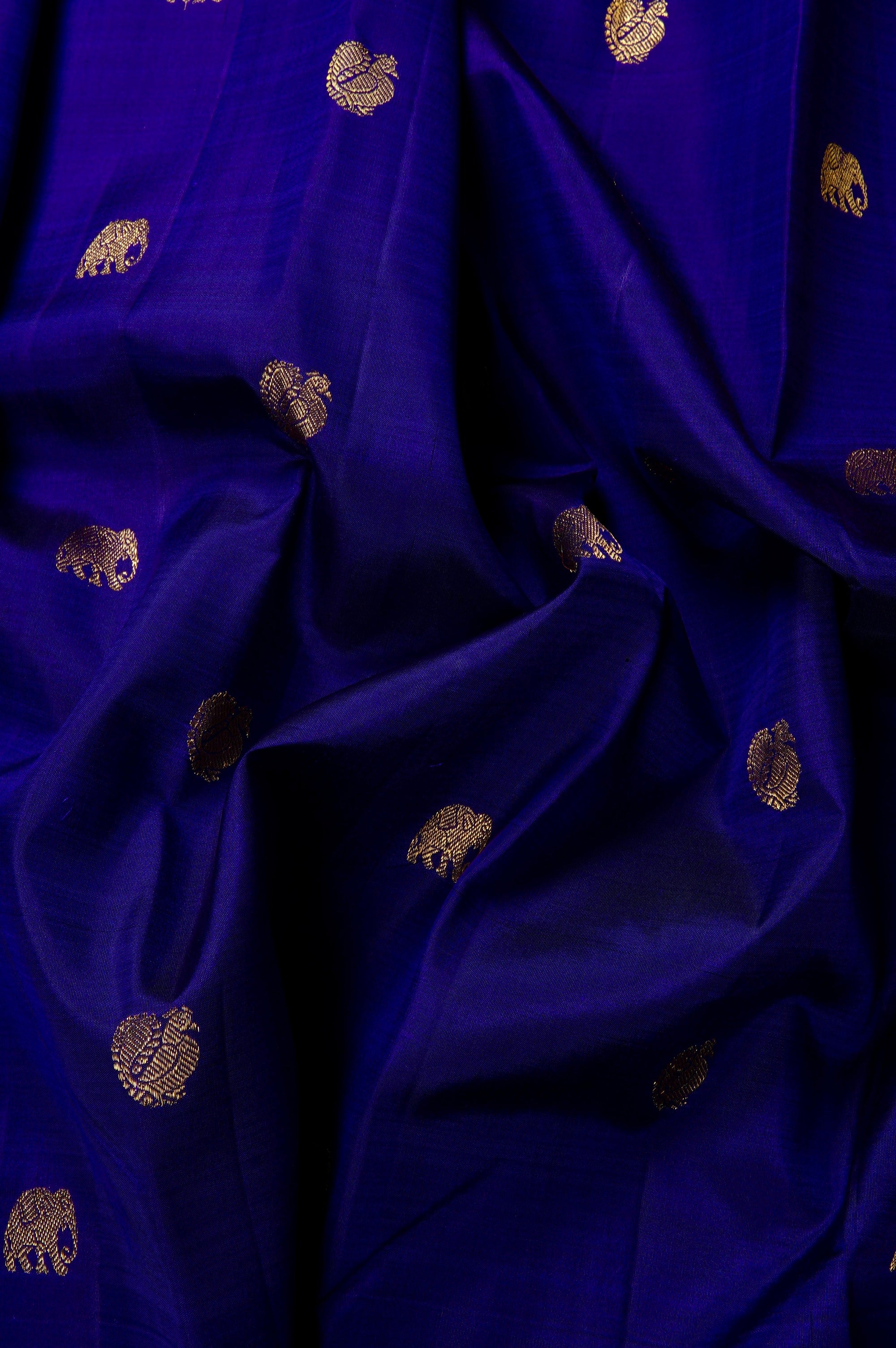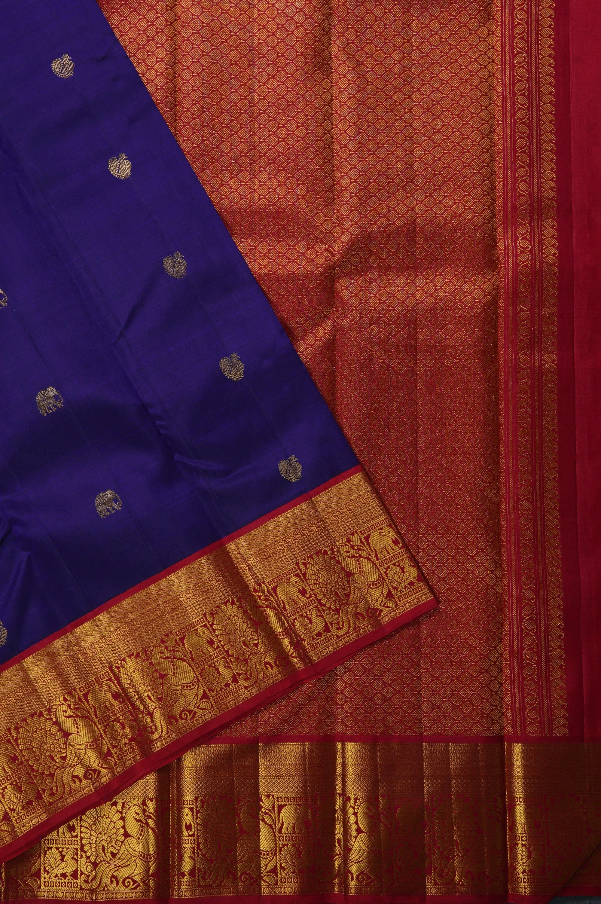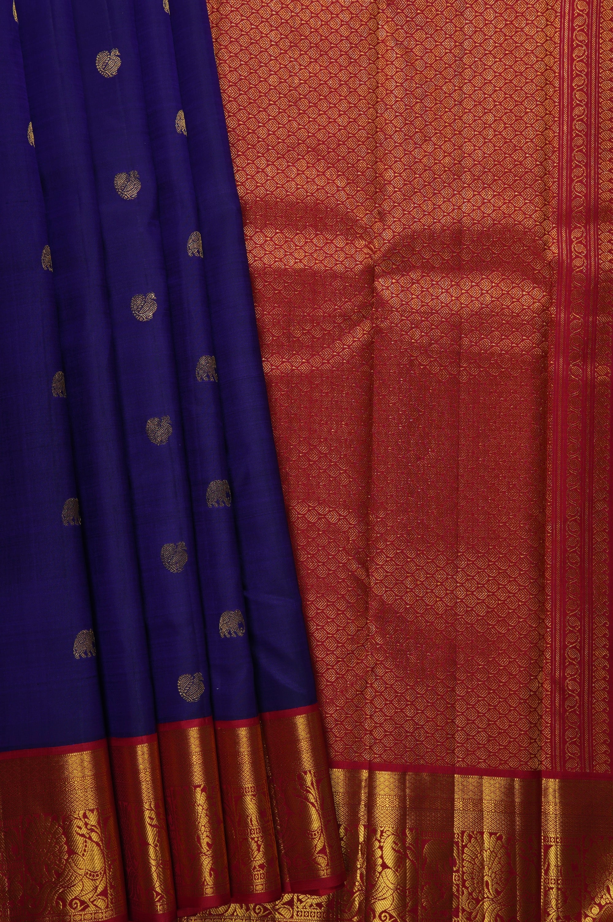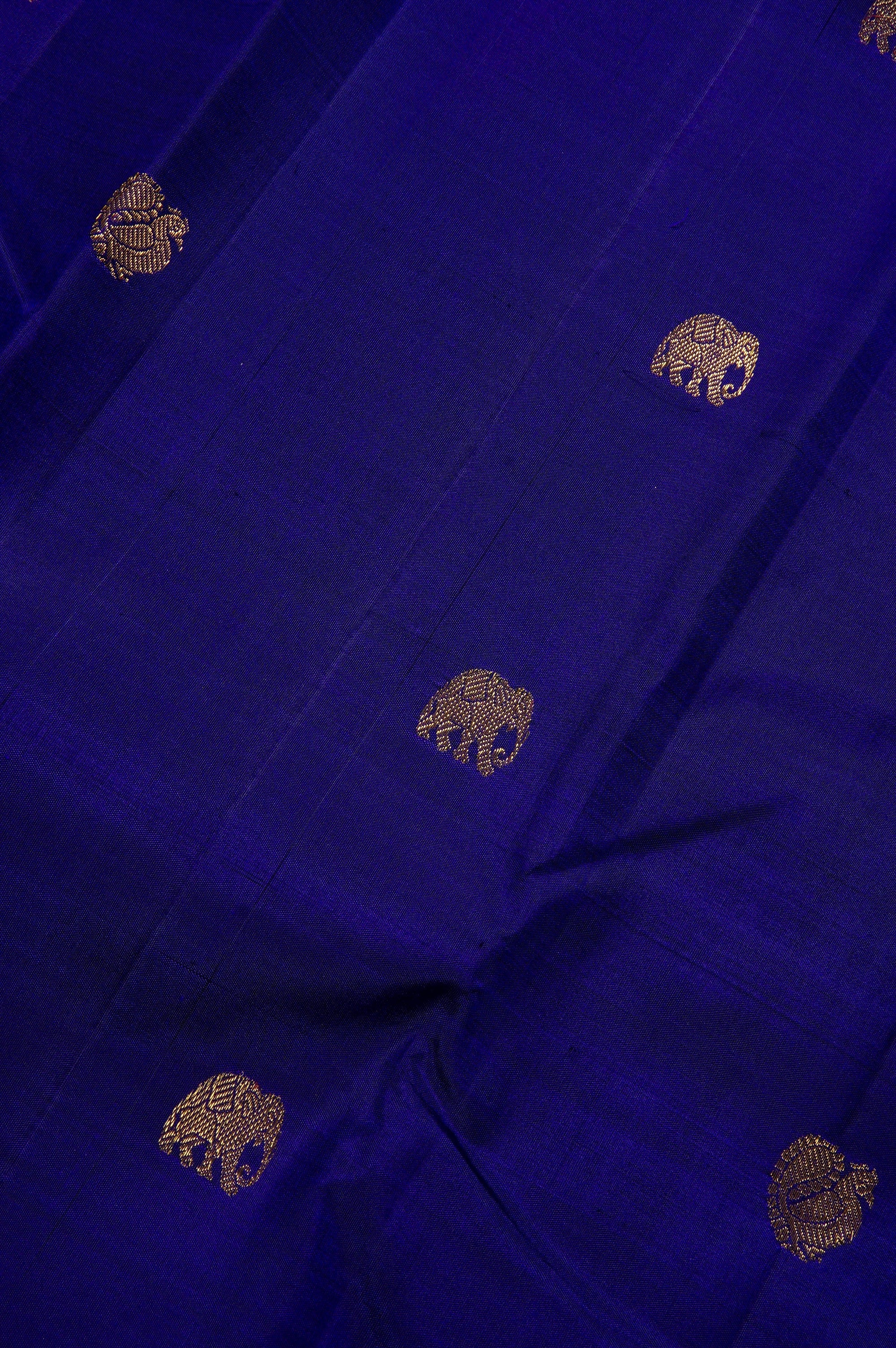 Previous NextThis navy blue kanchipuram silk saree is a majestic blend of deep tones and traditional craftsmanship. The body is scattered with meticulously woven gold zari elephant bhuttas, symbolizing strength and royalty. This deep field is strikingly offset by a vibrant contrast red Border, which is richly detailed with a traditional procession of peacock and elephant bhuttas, framed by intricate geometric patterns and gold zari bands. The grandeur continues into the pallu, which features a dense, all-over gold zari jacquard in a classic grid resembling a honeycomb, holding recurring thilakam bhuttas looking life neatly arranged leaves in gold zari.