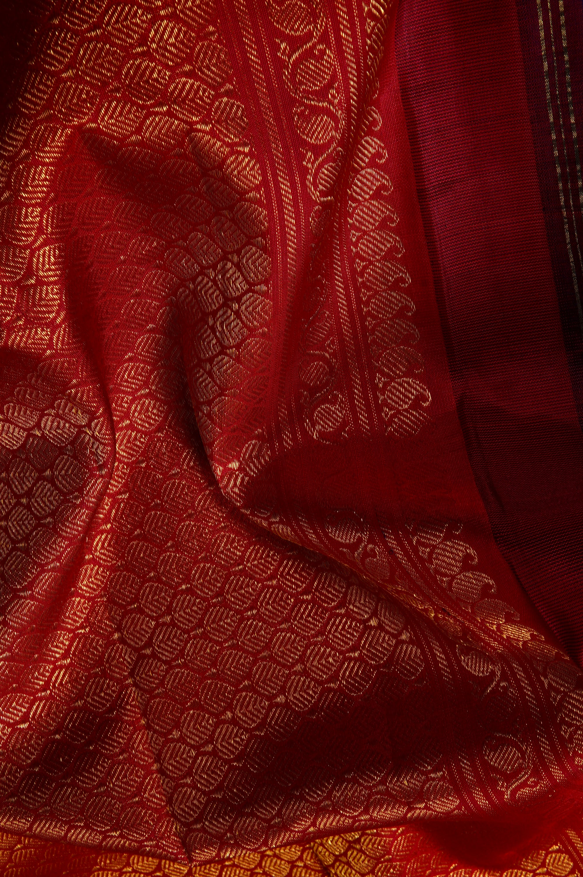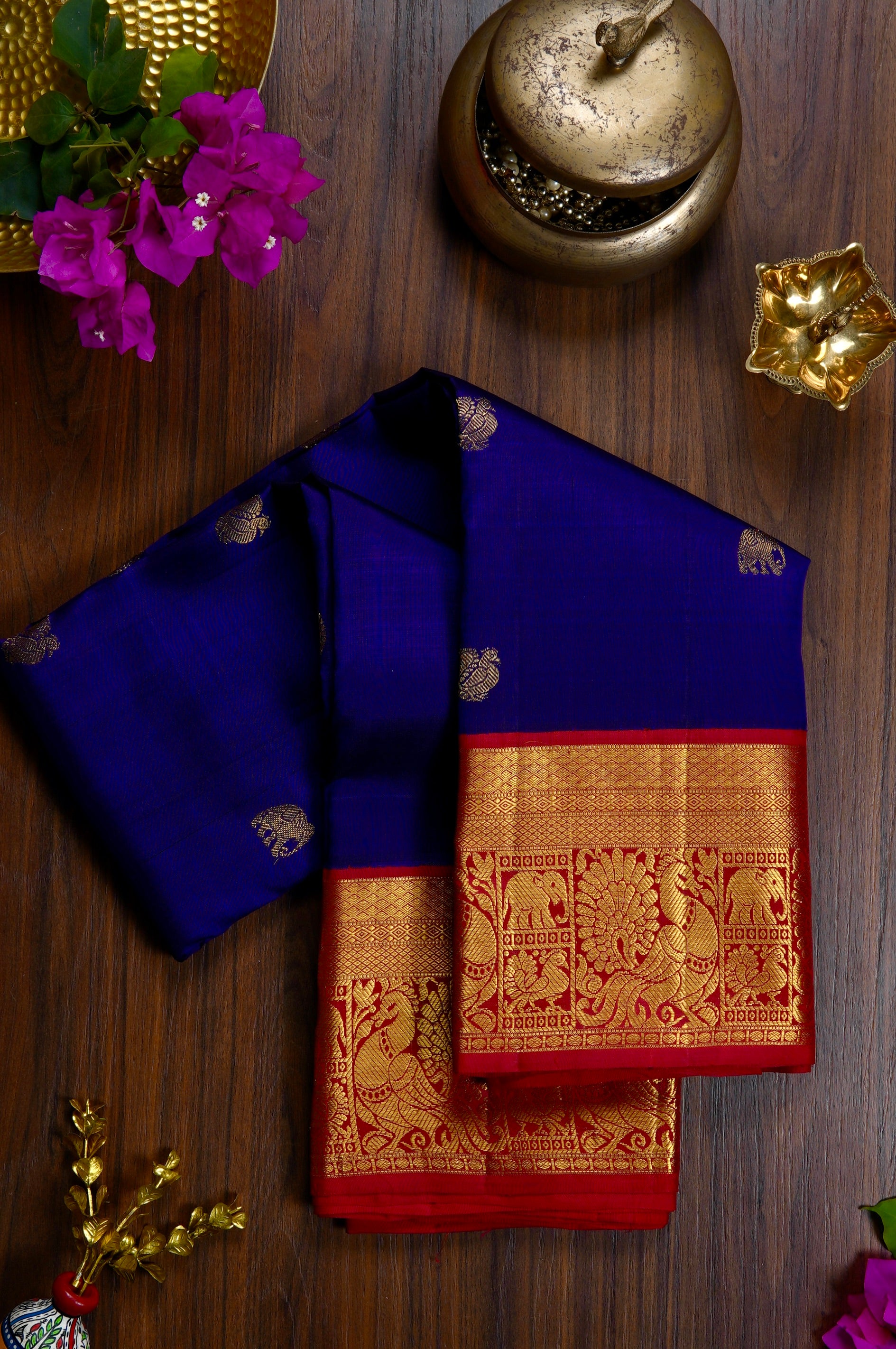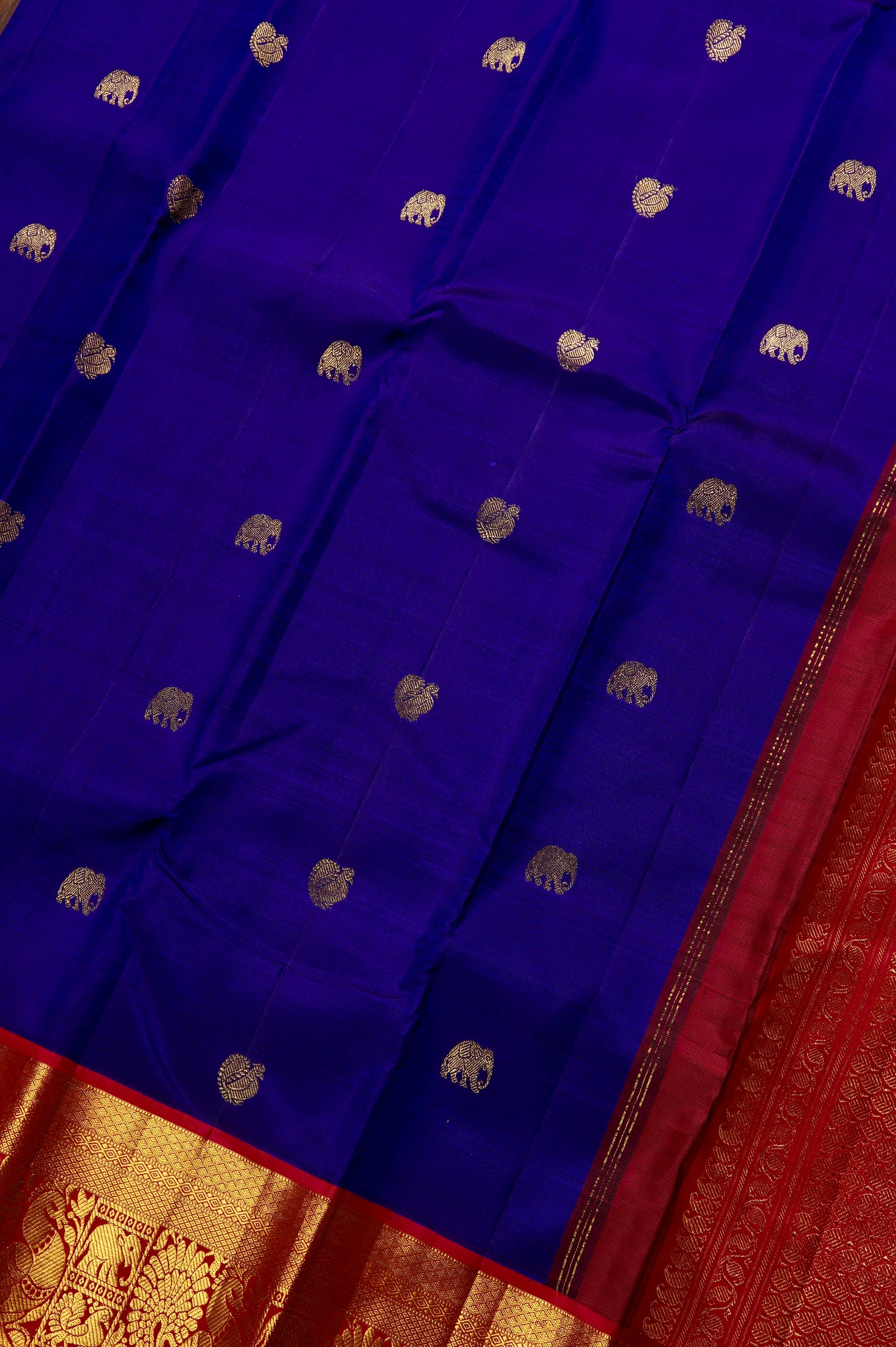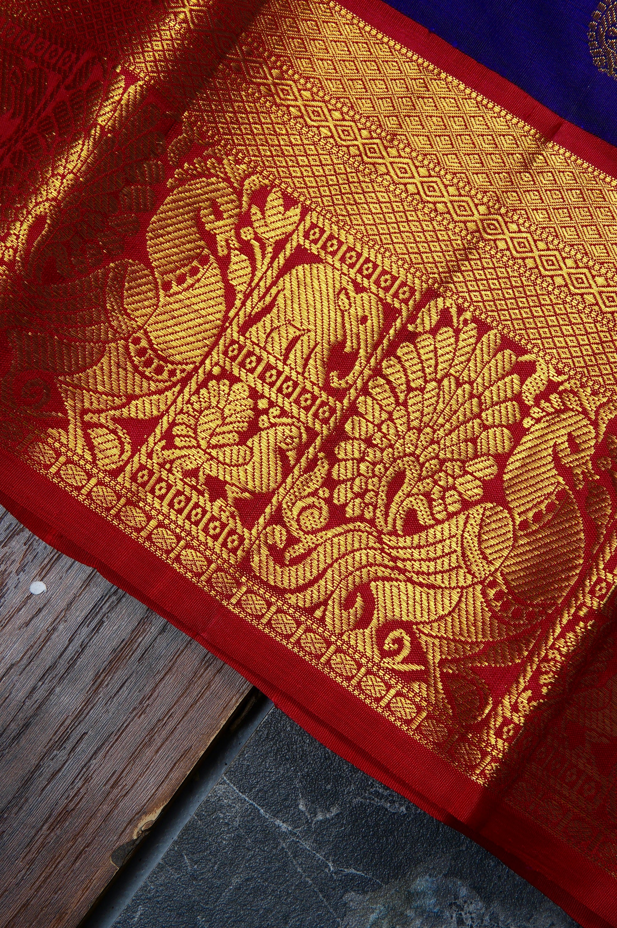 Previous NextThis navy blue kanchipuram silk saree is a majestic blend of deep tones and traditional craftsmanship. The body is scattered with meticulously woven gold zari elephant bhuttas, symbolizing strength and royalty. This deep field is strikingly offset by a vibrant contrast red Border, which is richly detailed with a traditional procession of peacock and elephant bhuttas, framed by intricate geometric patterns and gold zari bands. The grandeur continues into the pallu, which features a dense, all-over gold zari jacquard in a classic grid resembling a honeycomb, holding recurring thilakam bhuttas looking life neatly arranged leaves in gold zari.