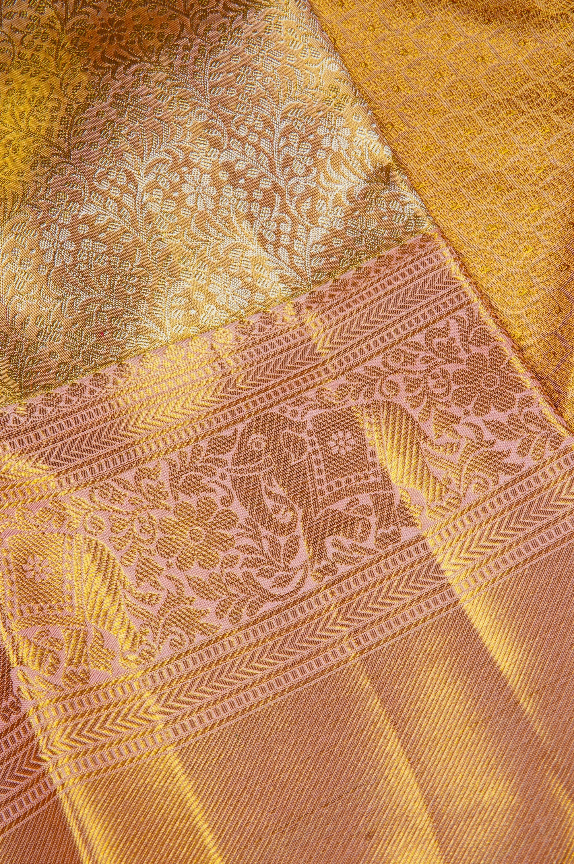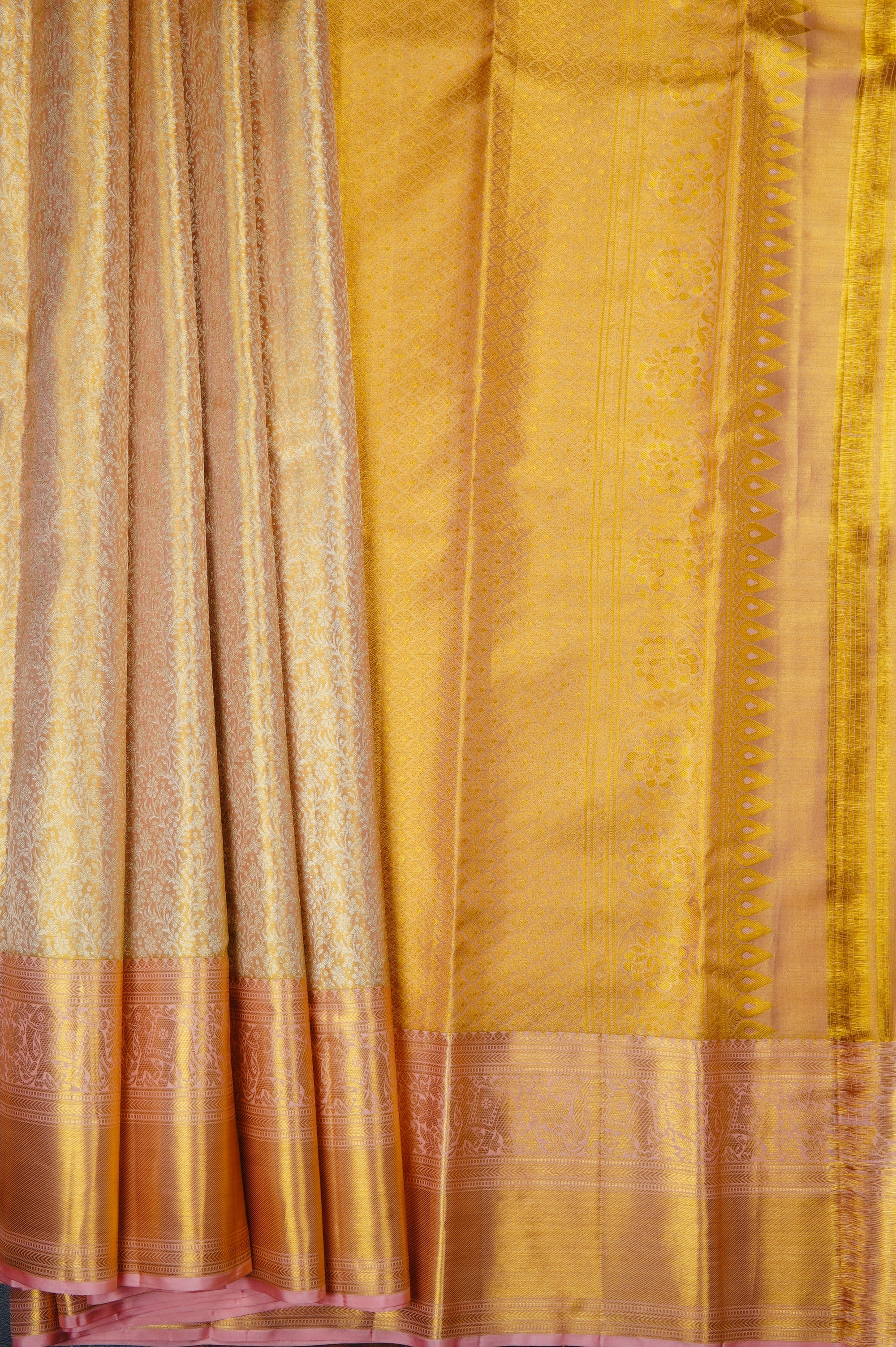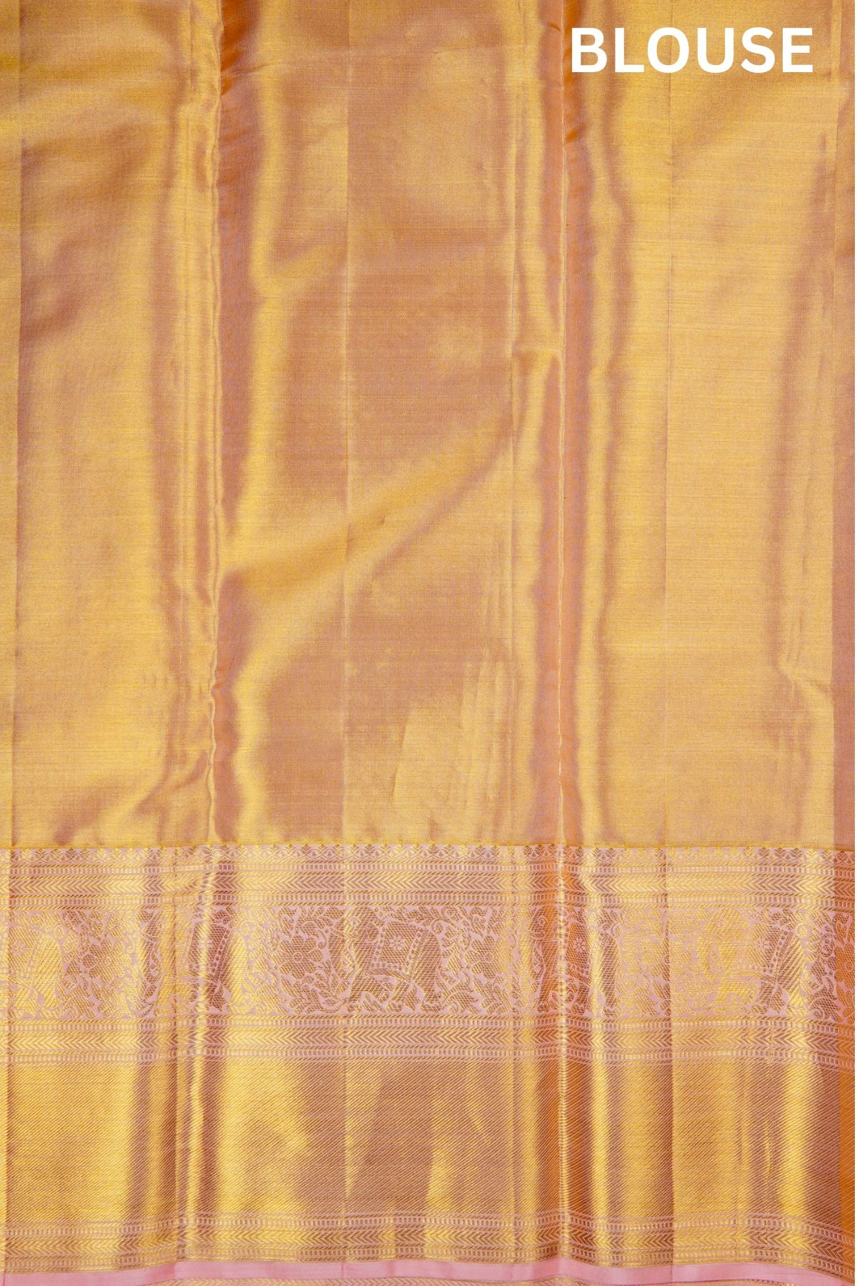 Previous NextRose gold kanchipuram silk saree woven with a very light pink with bold gold threads creating an antique pink-gold shade for the saree, filled with floral motifs woven in silver zari throughout the body. The border has a series of bands including motifs like squares, petals and arrows, bordering a band of elephant motifs surrounded by floral kodi patterns woven in gold zari, ending with a thick band of zari work. The pallu starts with a wide area of stylised diamonds, followed by a wide band of elaborate florals and a line of petals, all woven in gold and silver zari. The saree has a dual tone blouse with the same border.