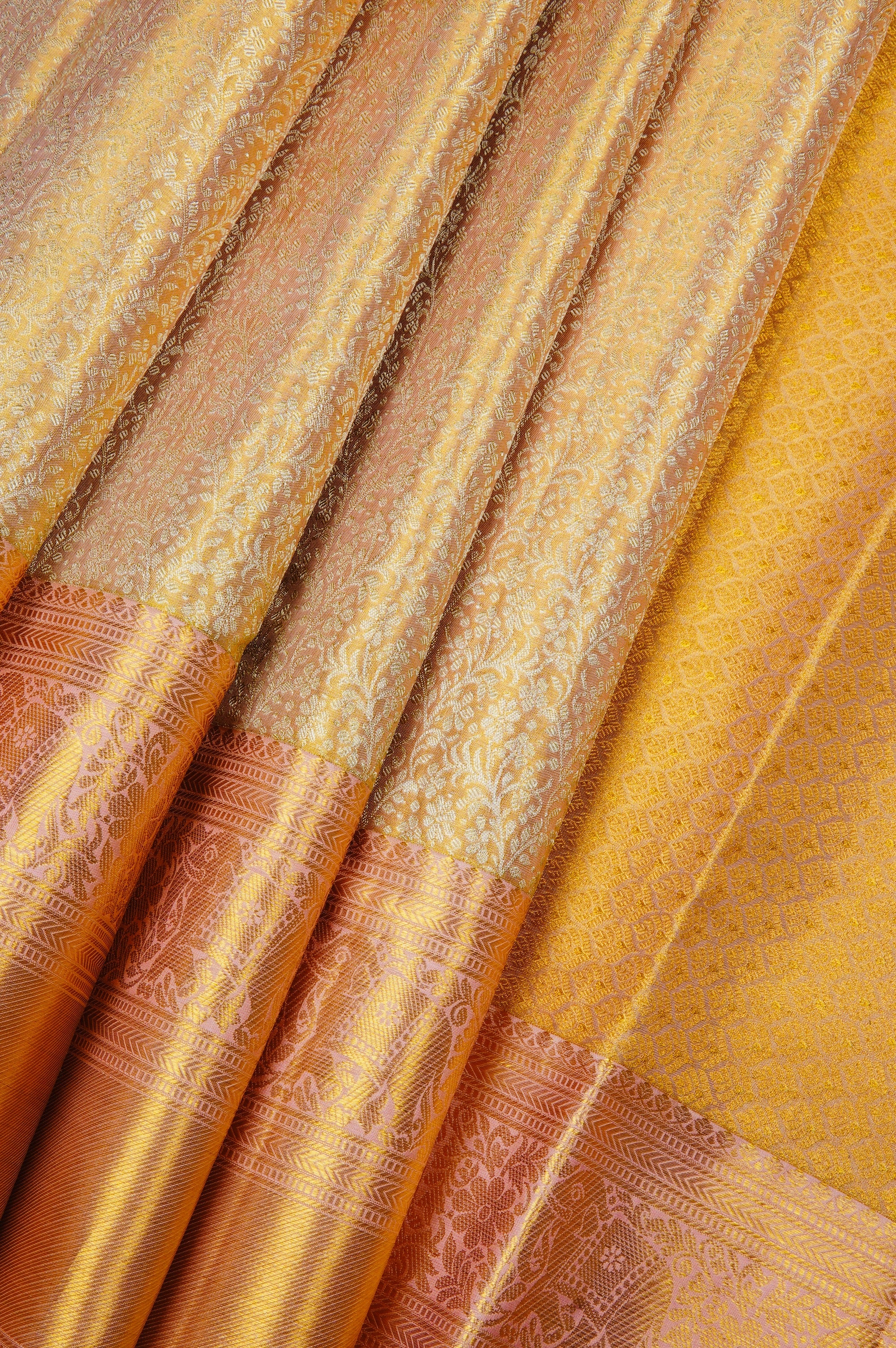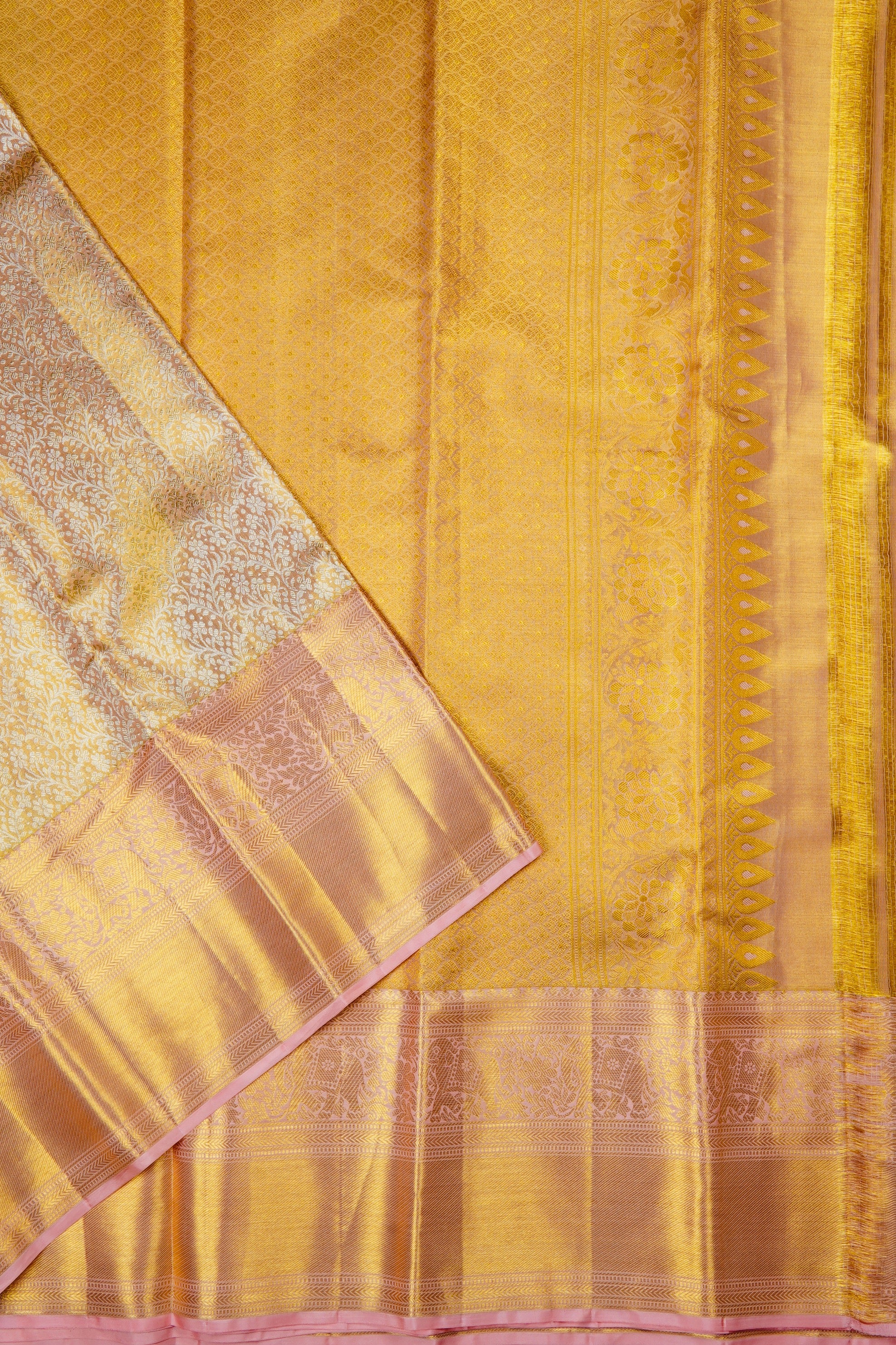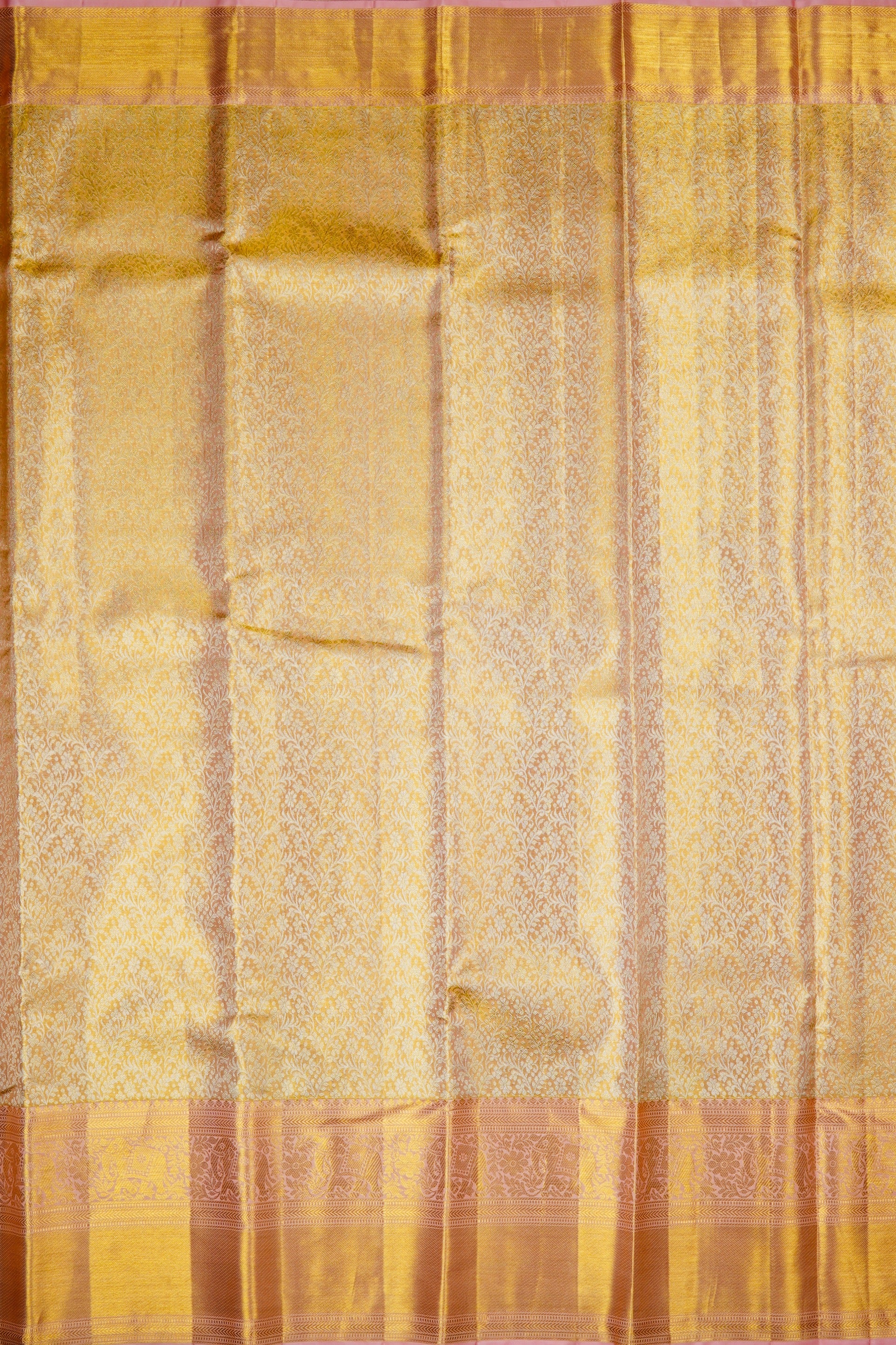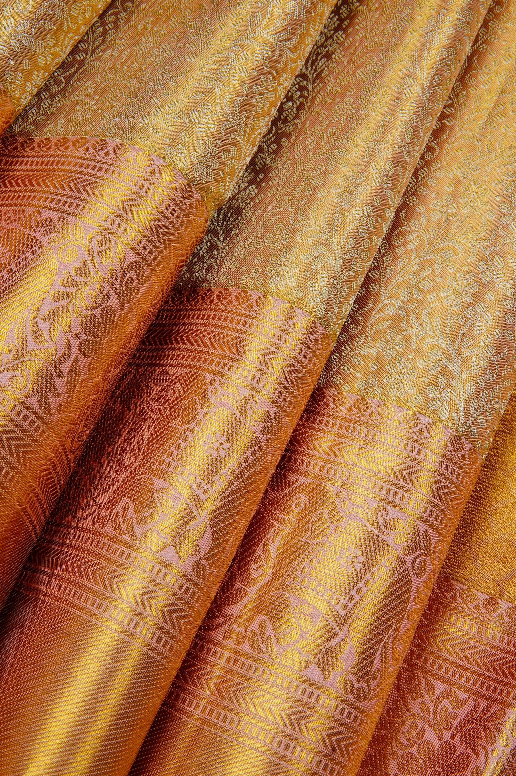Previous NextRose gold kanchipuram silk saree woven with a very light pink with bold gold threads creating an antique pink-gold shade for the saree, filled with floral motifs woven in silver zari throughout the body. The border has a series of bands including motifs like squares, petals and arrows, bordering a band of elephant motifs surrounded by floral kodi patterns woven in gold zari, ending with a thick band of zari work. The pallu starts with a wide area of stylised diamonds, followed by a wide band of elaborate florals and a line of petals, all woven in gold and silver zari. The saree has a dual tone blouse with the same border.