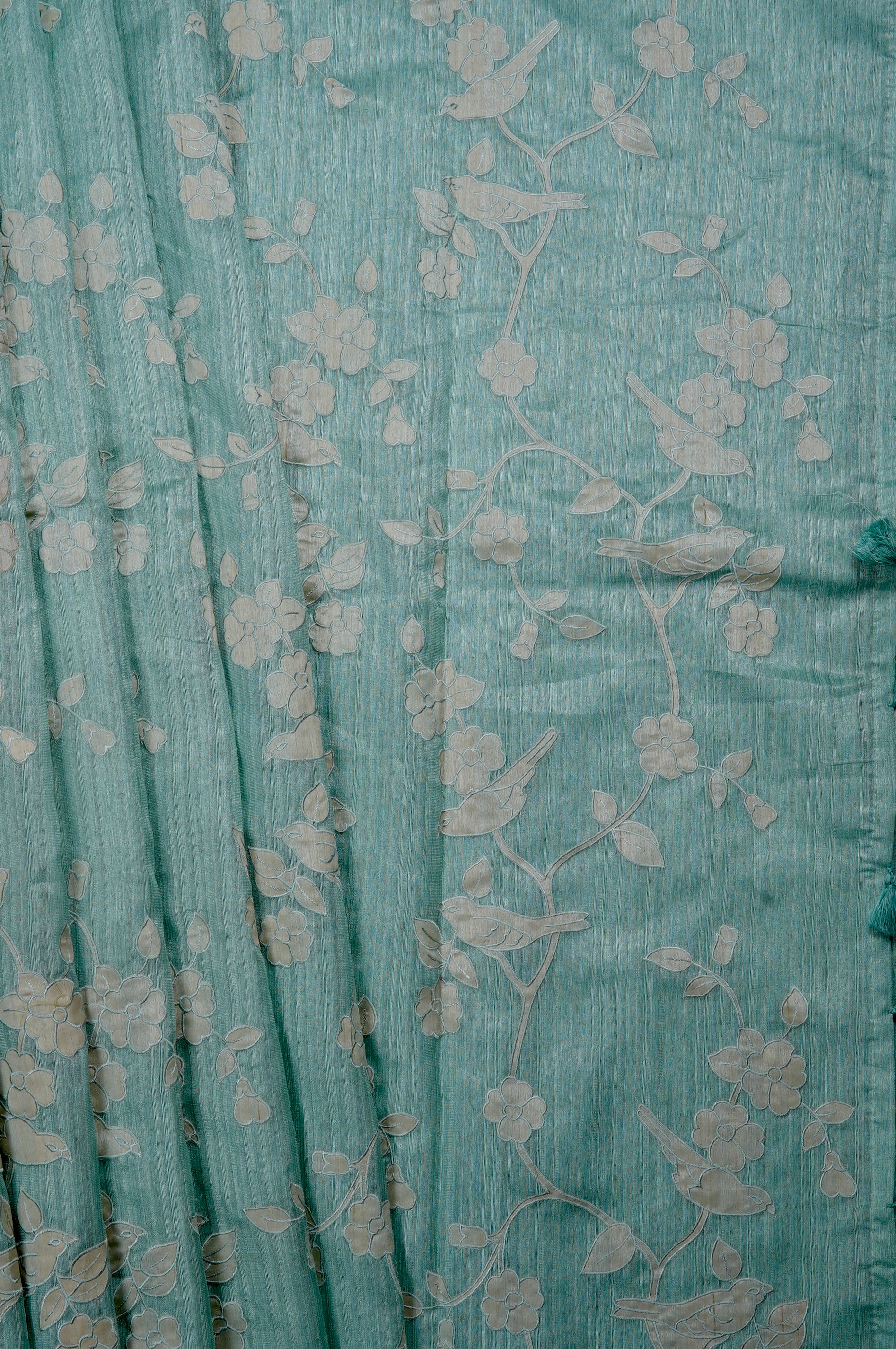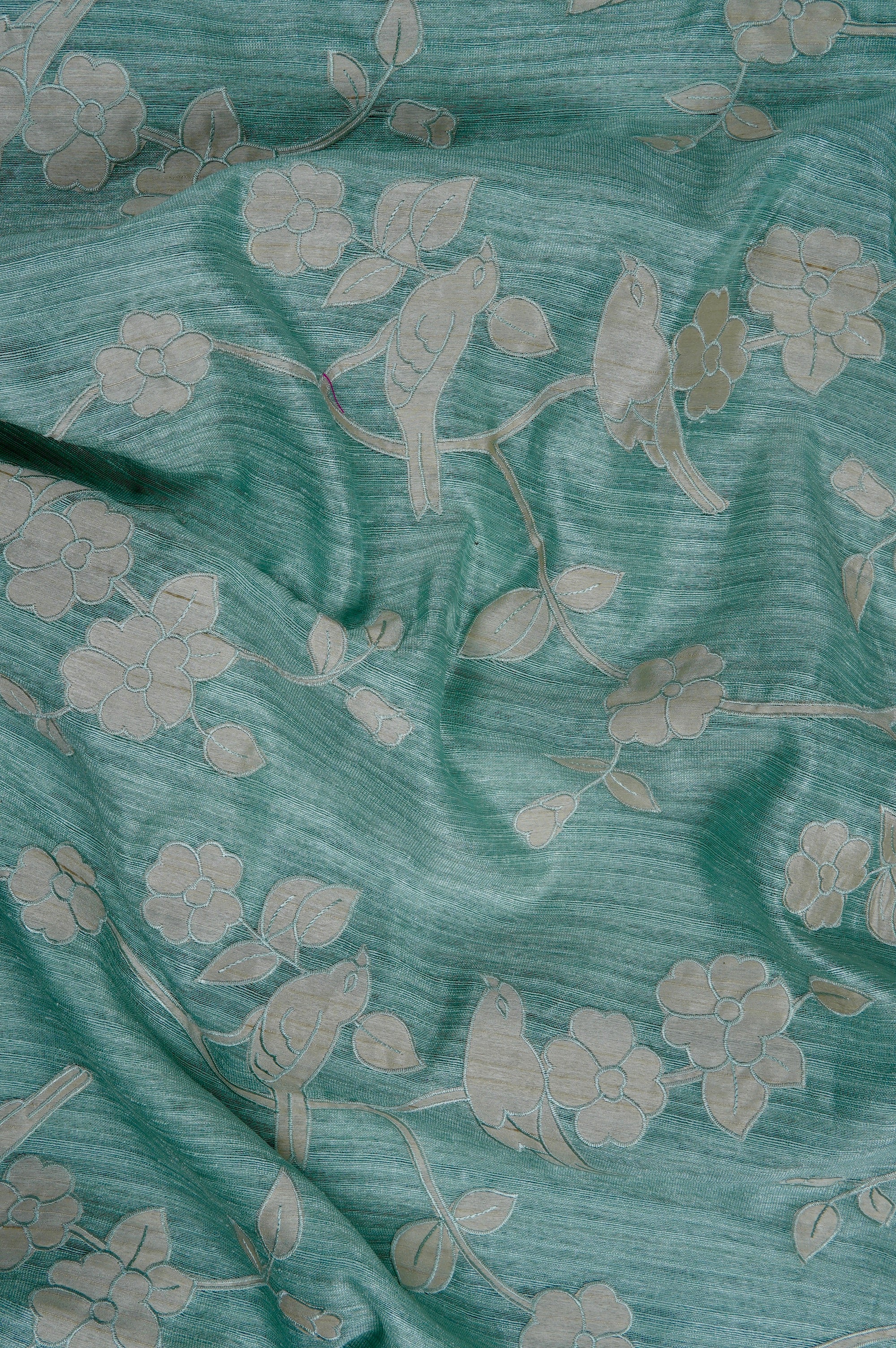 NextThis subtle icy blue semi tussar saree showcases beautiful pastel threads embroidered into a naturalistic landscape filled with trees and birds amidst small florals. Filled in off white, these embroidered motifs have a subtle blue border, merging it seamlessly with the body. The body transitions into the pallu, maintaining the soul of the saree.