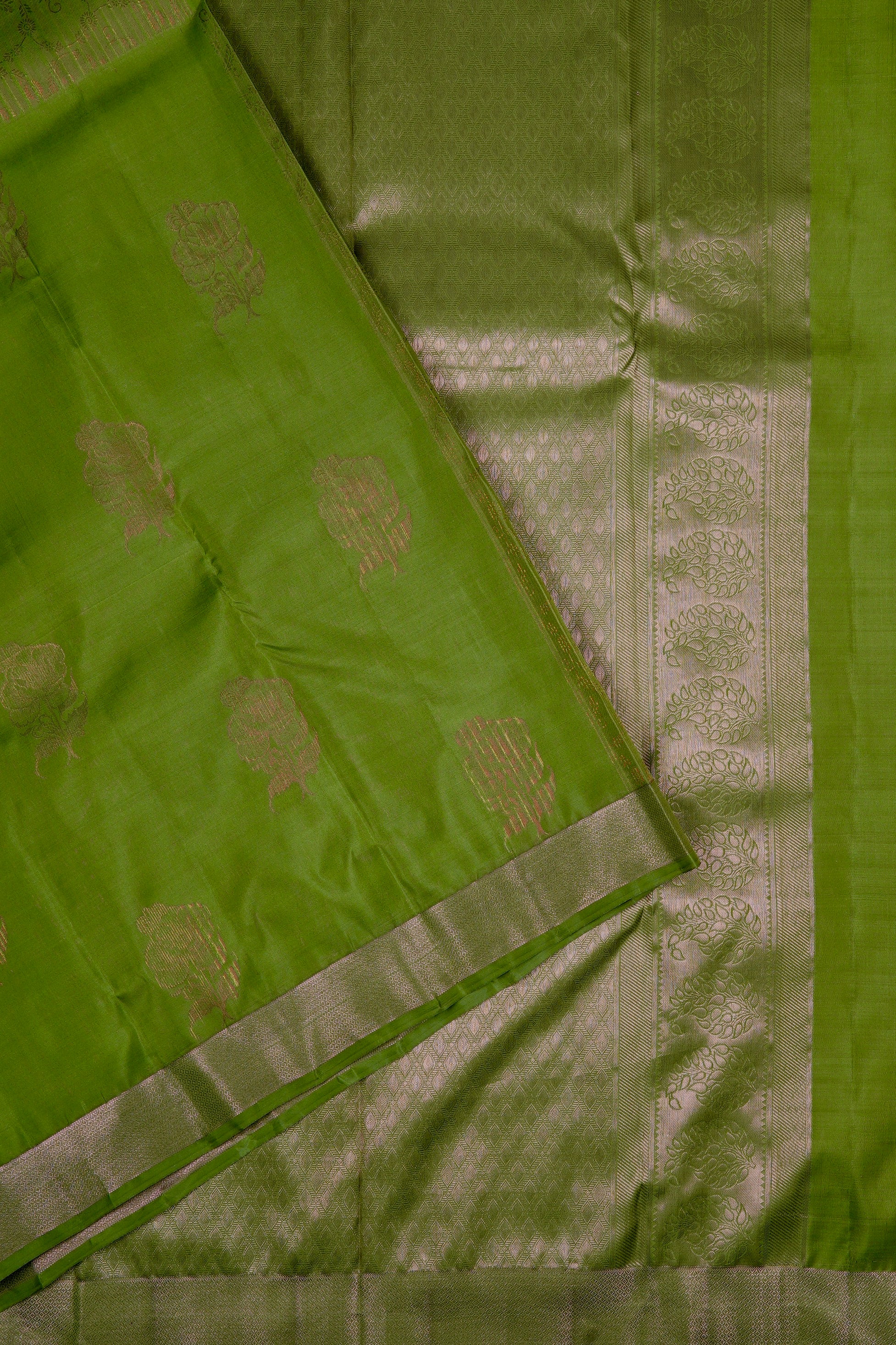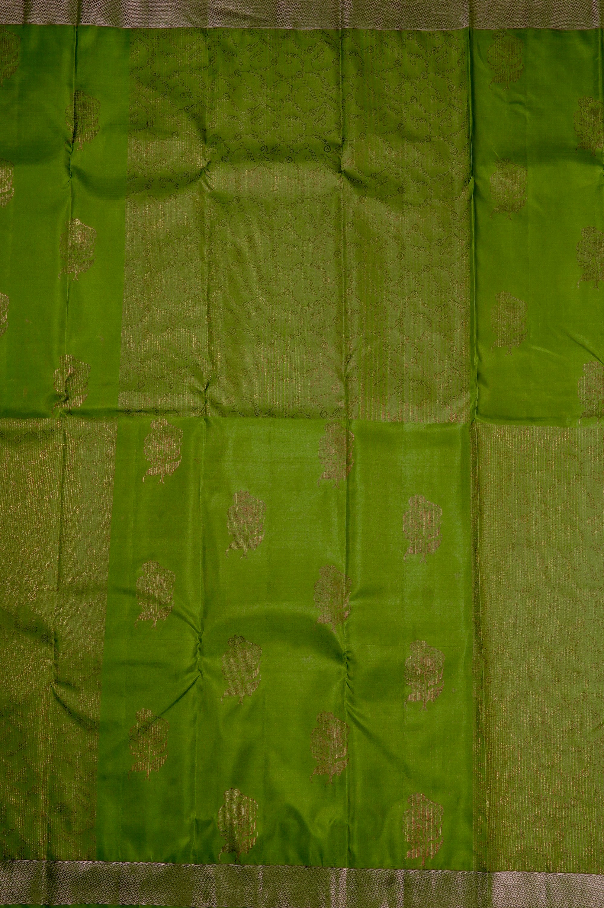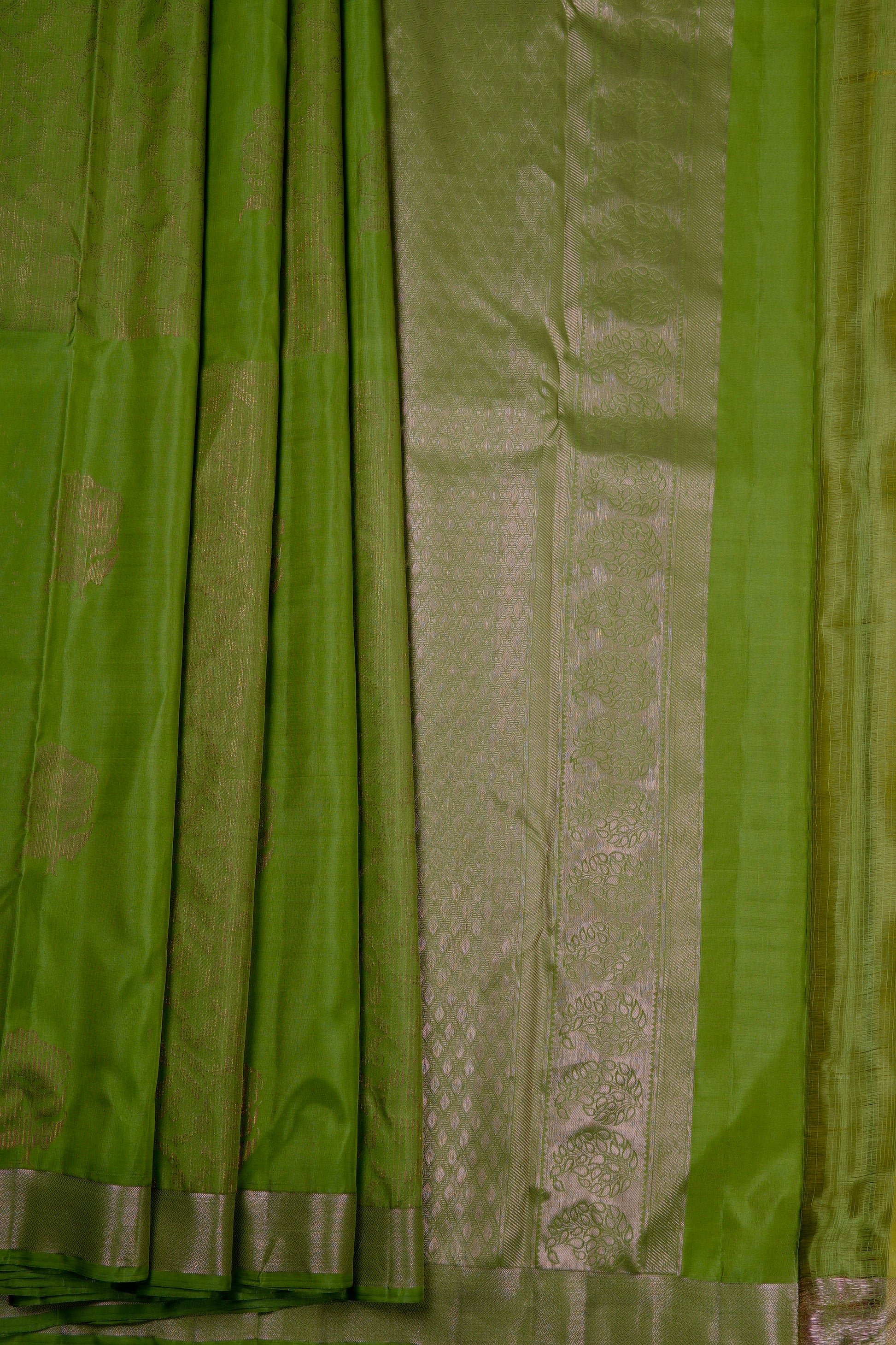Previous NextMud green silk saree with blocks of flower motifs and blocks of kodi motifs woven in zari alternating throughout the body, with a diamond grid pattern woven in zari as its border. The pallu has repeating leaf motifs with a horizontally stripes background, followed by a band of mango bhuttas formed by leaf elements in the negative spaces of zari. bound by two bands of diagonally striped green and gold. The saree has a main mast gold blouse with the same border.