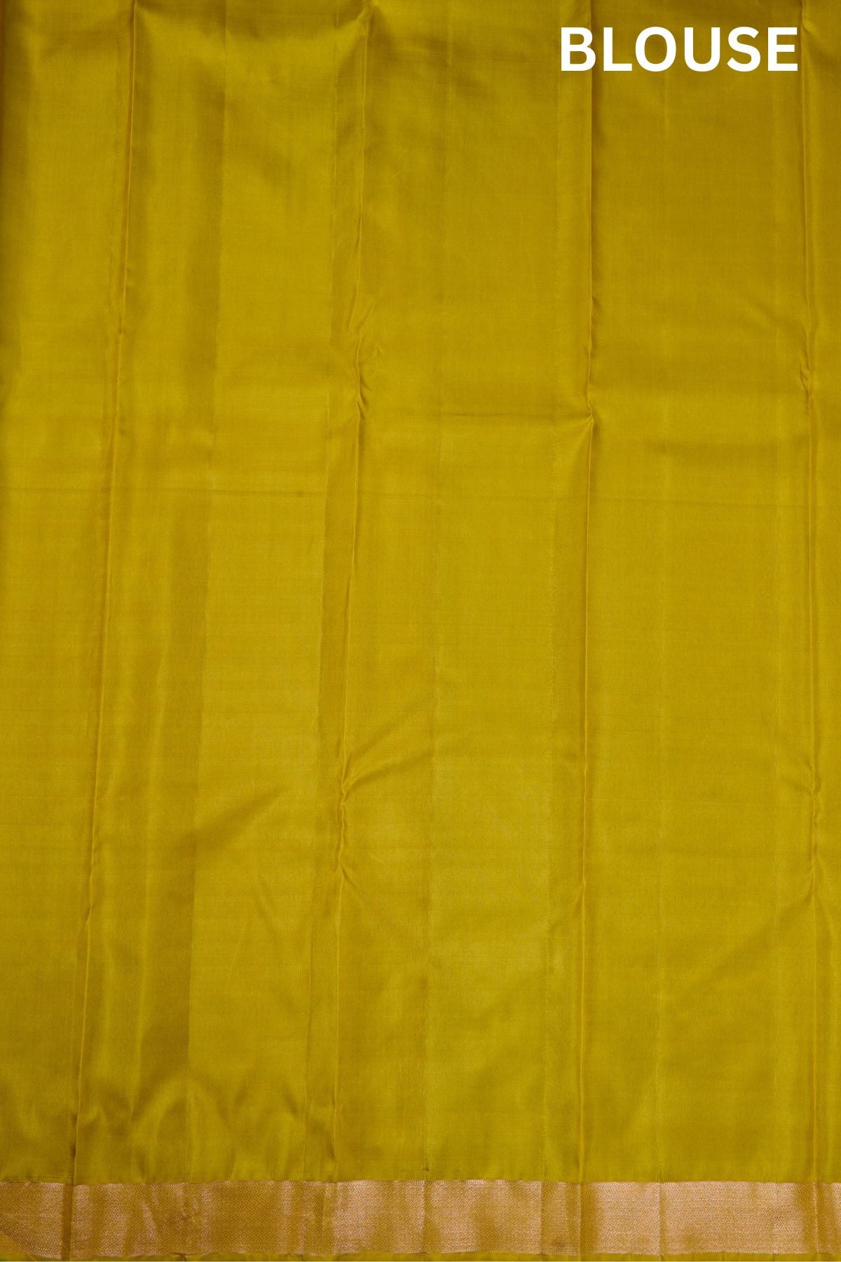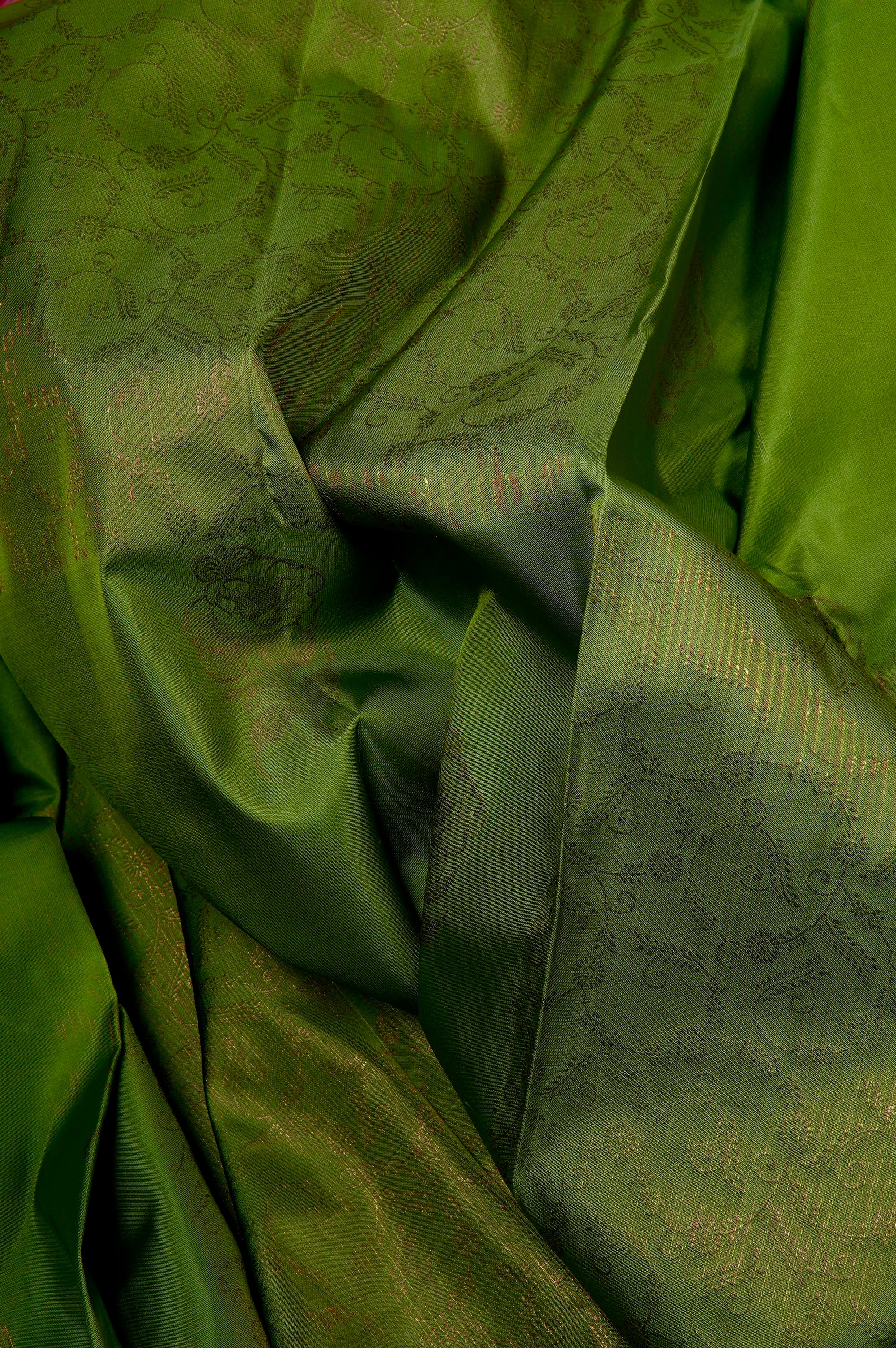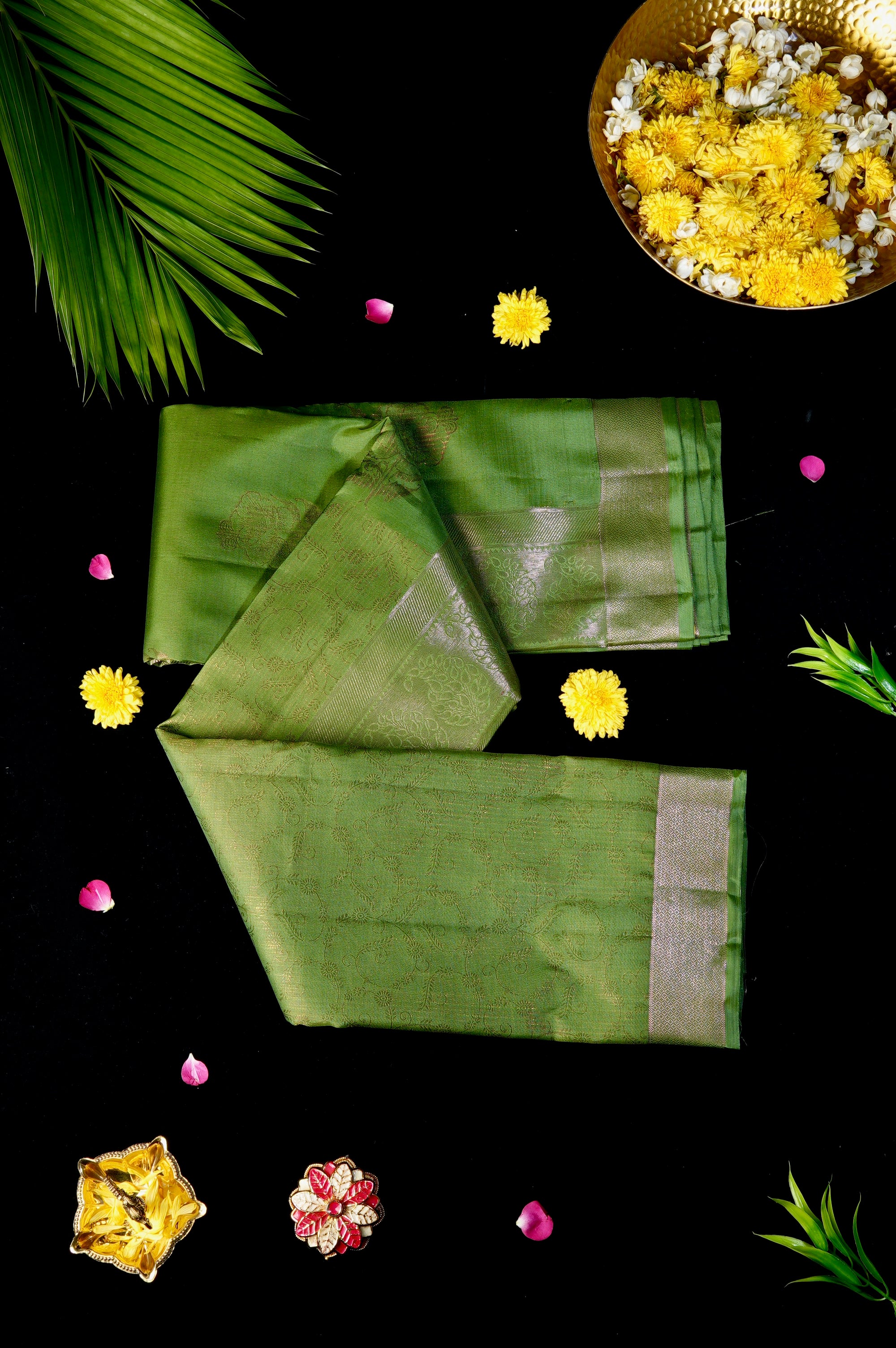 Previous NextMud green silk saree with blocks of flower motifs and blocks of kodi motifs woven in zari alternating throughout the body, with a diamond grid pattern woven in zari as its border. The pallu has repeating leaf motifs with a horizontally stripes background, followed by a band of mango bhuttas formed by leaf elements in the negative spaces of zari. bound by two bands of diagonally striped green and gold. The saree has a main mast gold blouse with the same border.